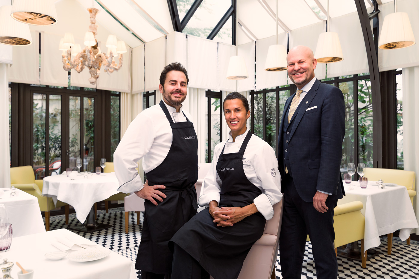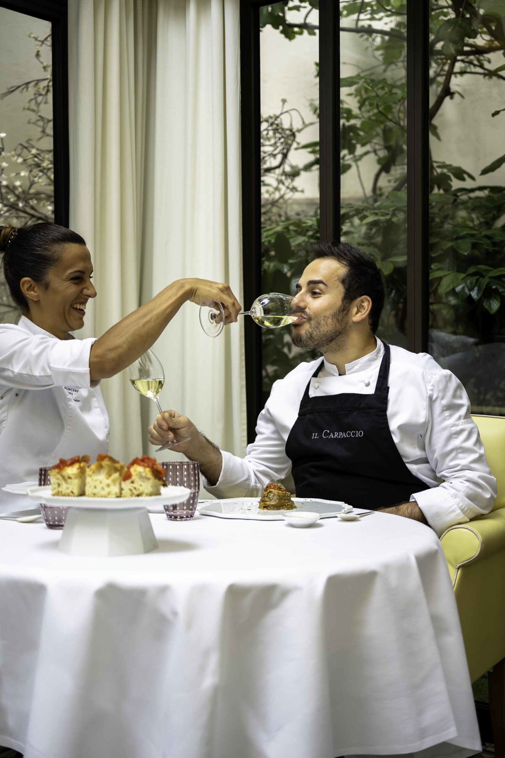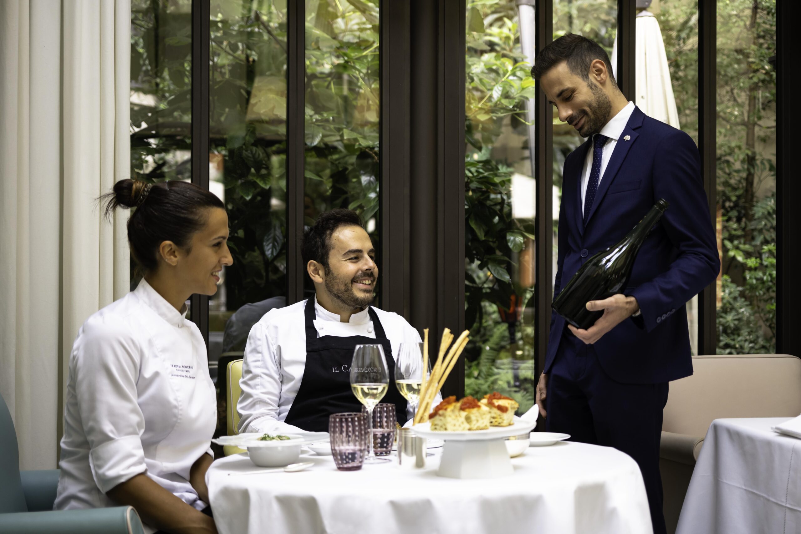 Le couple de chefs, épaulé par le Chef Pâtissier Quentin Lechat, souhaite transmettre leur univers dans le plus parisien des Palaces. La haute gastronomie est au rendez-vous, mais cela ne va pas sans la notion de convivialité. Les chefs Oliver Piras et Alessandra Del Favero officient aussi bien en cuisine qu’en salle, où ils régalent les convives en préparant « en live show » leurs plats. Le talentueux duo offre une expérience gastronomique de l’entrée jusqu’au dessert grâce au fabuleux Chef Pâtissier Quentin Lechat qui signe la carte des pâtisseries italiennes revisitées avec son ADN mêlant simplicité, gourmandise et élégance. Côté vins, Clément Emery, Directeur de la Mixologie et de la Sommellerie, a réuni les plus beaux terroirs de la péninsule italienne via de prestigieux domaines, tout comme de nouvelles étoiles montantes, des pépites transalpines hors des sentiers battus.