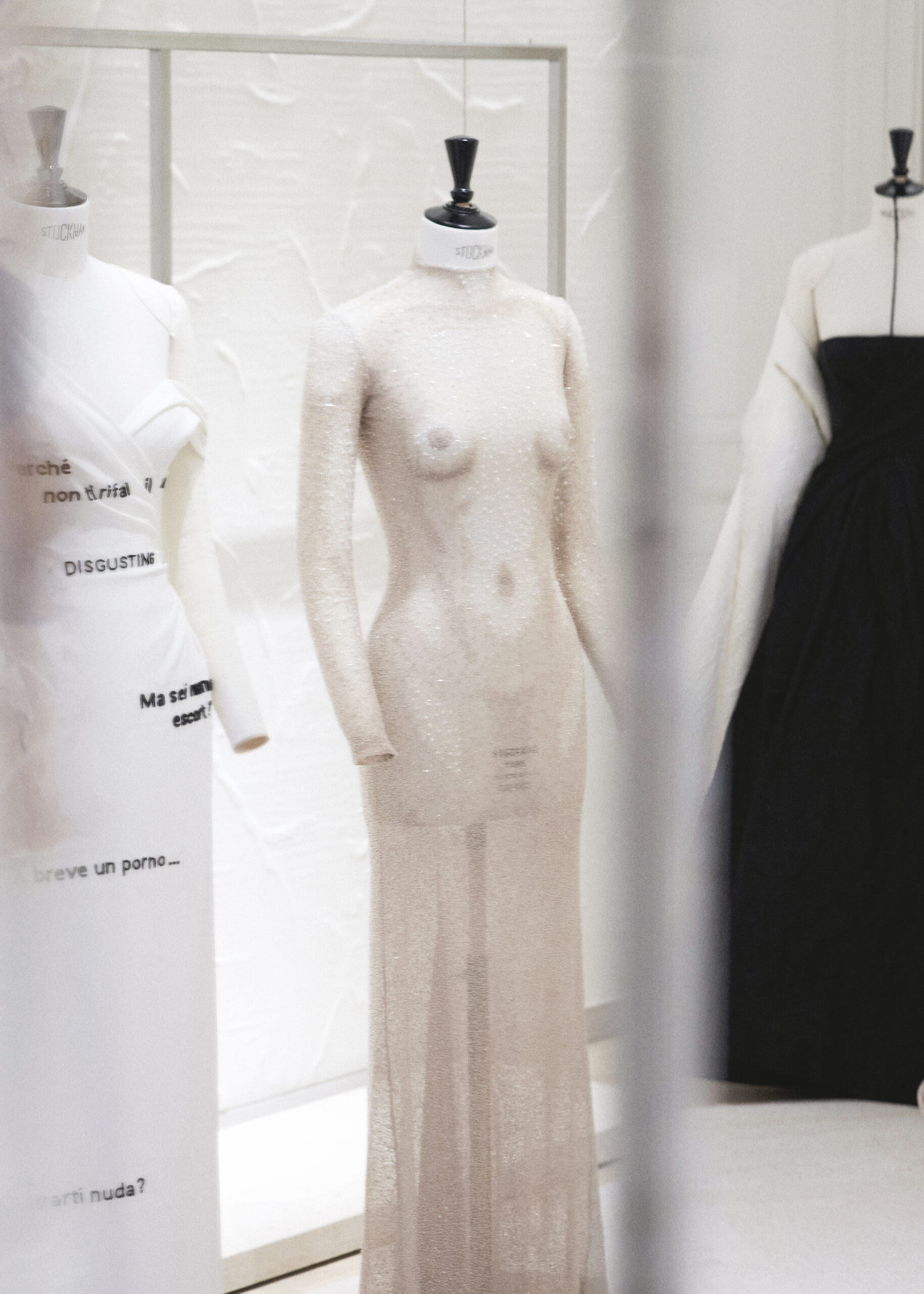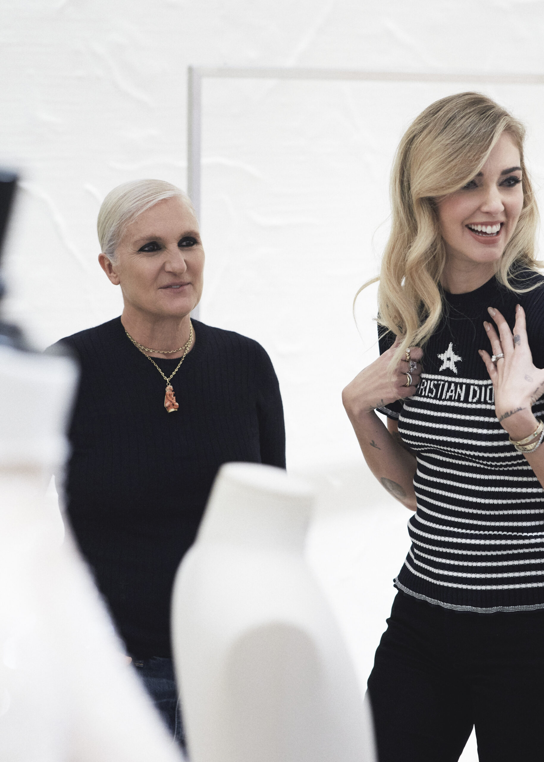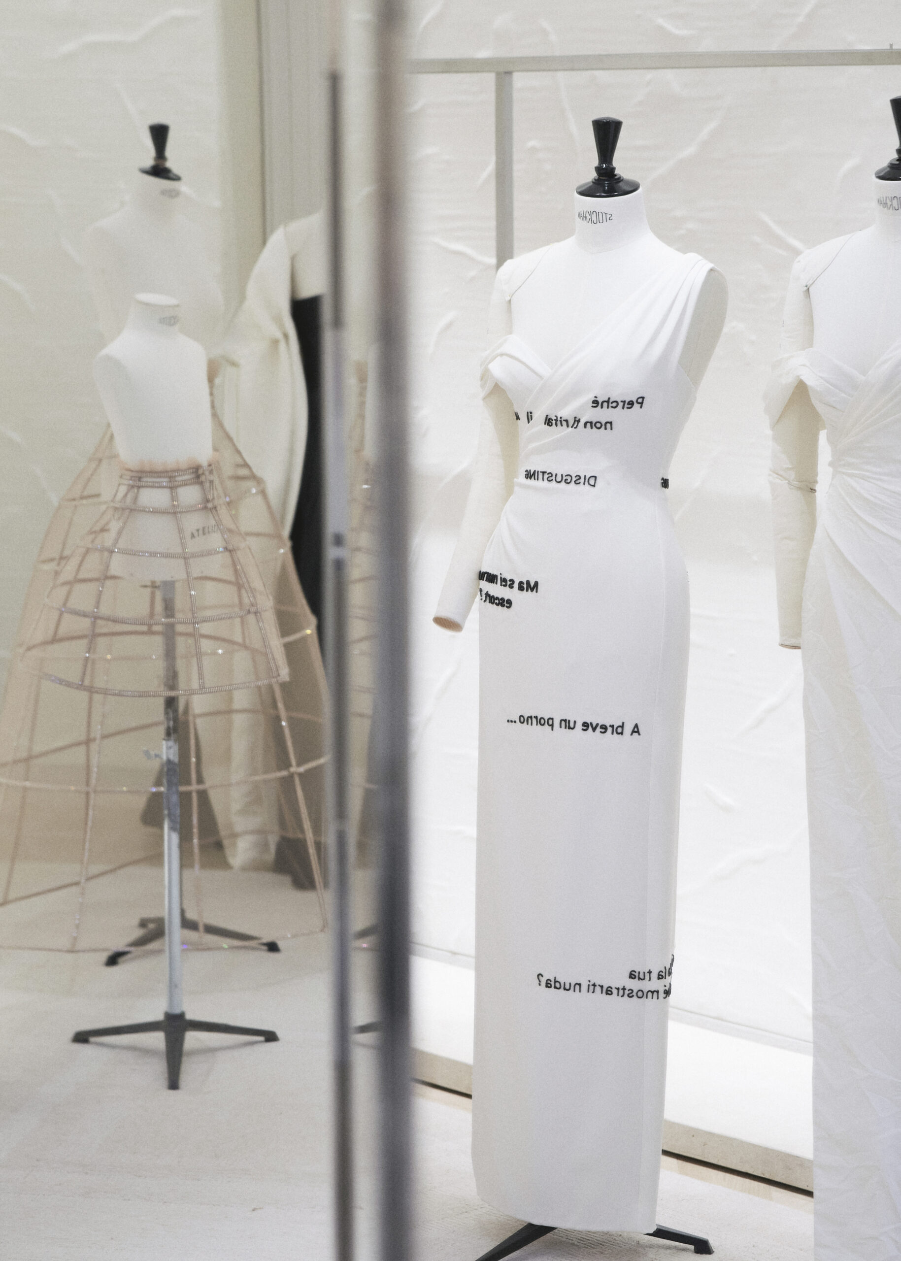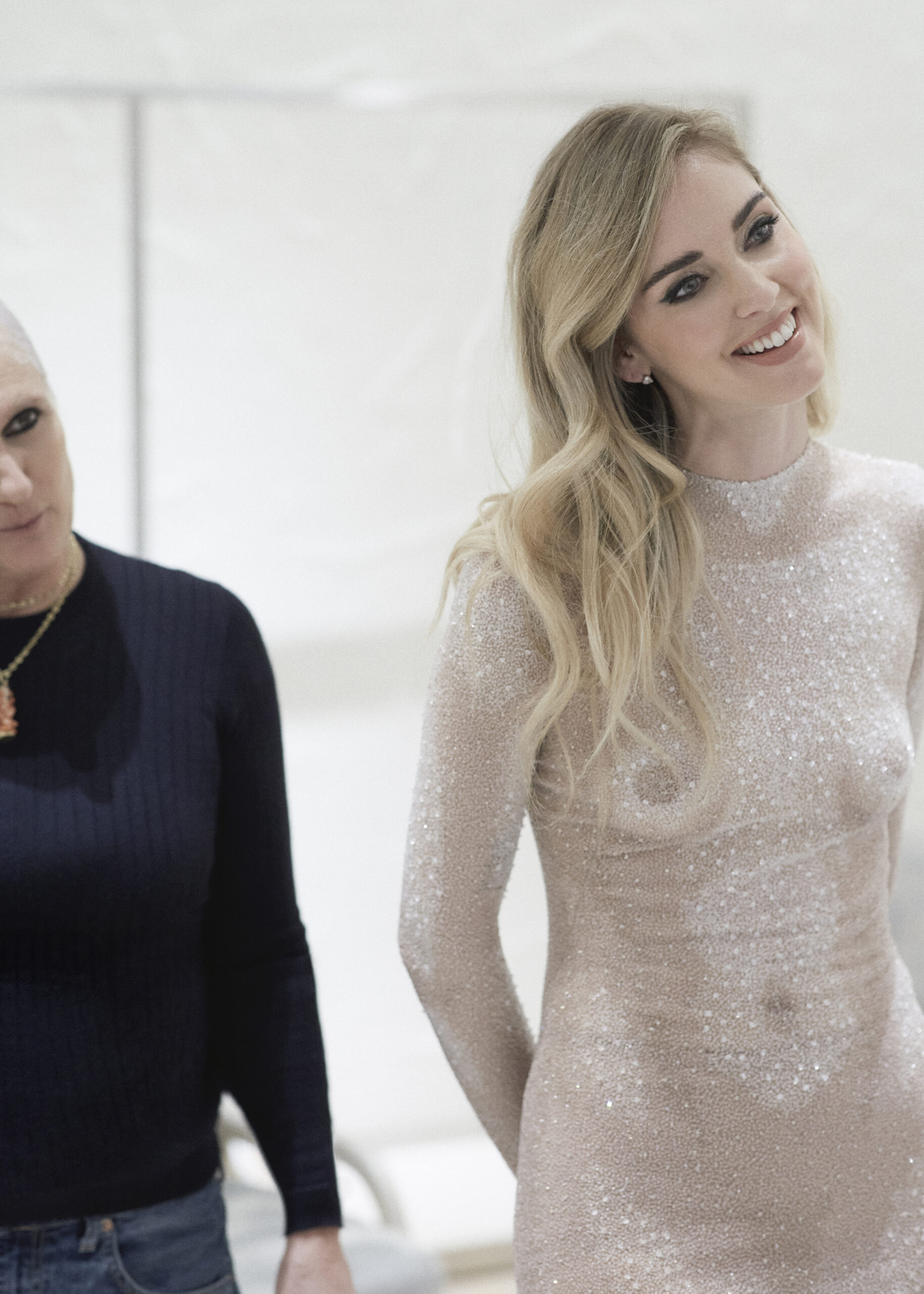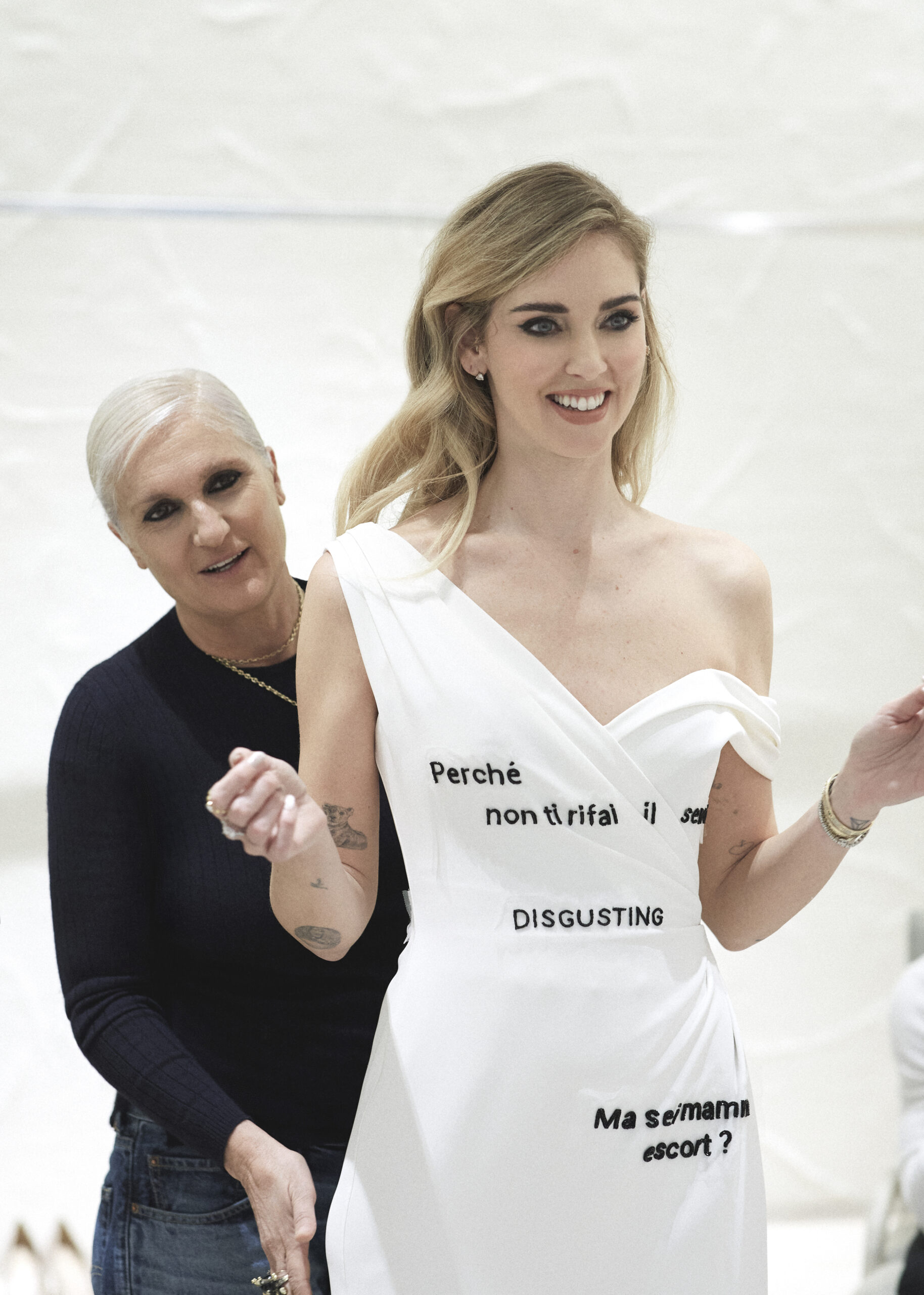 À l’occasion de la 73ème édition du festival de Sanremo – un événement consacré aux chansons italiennes – se déroulant du 7 au 11 février 2023 sur la Riviera ligure, Chiara Ferragni était vêtue de quatre créations Dior haute couture imaginées spécialement par Maria Grazia Chiuri. Telle une ode à la virtuosité des ateliers Dior, le premier modèle dévoile des lignes architecturales et une matière envoûtante froissée de façon asymétrique. Une étole ponctuée des mots « Pensati Libera », credo engagé repris par le collectif Claire Fontaine, complète le look. Sculptant en trompe-l’œil les courbes d’un corps, la seconde robe, en tulle de coton, est entièrement ornée de perles tandis que la troisième drapée dans du satin de soie blanc, est brodée des commentaires reçus par l’entrepreneuse mode sur les réseaux sociaux. Ultime surprise, la dernière silhouette est constituée d’une combinaison en jersey, subtile seconde peau, recouverte de strass topaze et agrémentée d’une jupe en tulle chair jouant avec les effets de transparence. Entre objets d’art et d’affirmation de soi, ces pièces d’exception se muent en un manifeste faisant rayonner la voix des femmes, une vision chère à la Directrice Artistique des collections féminines de Dior.