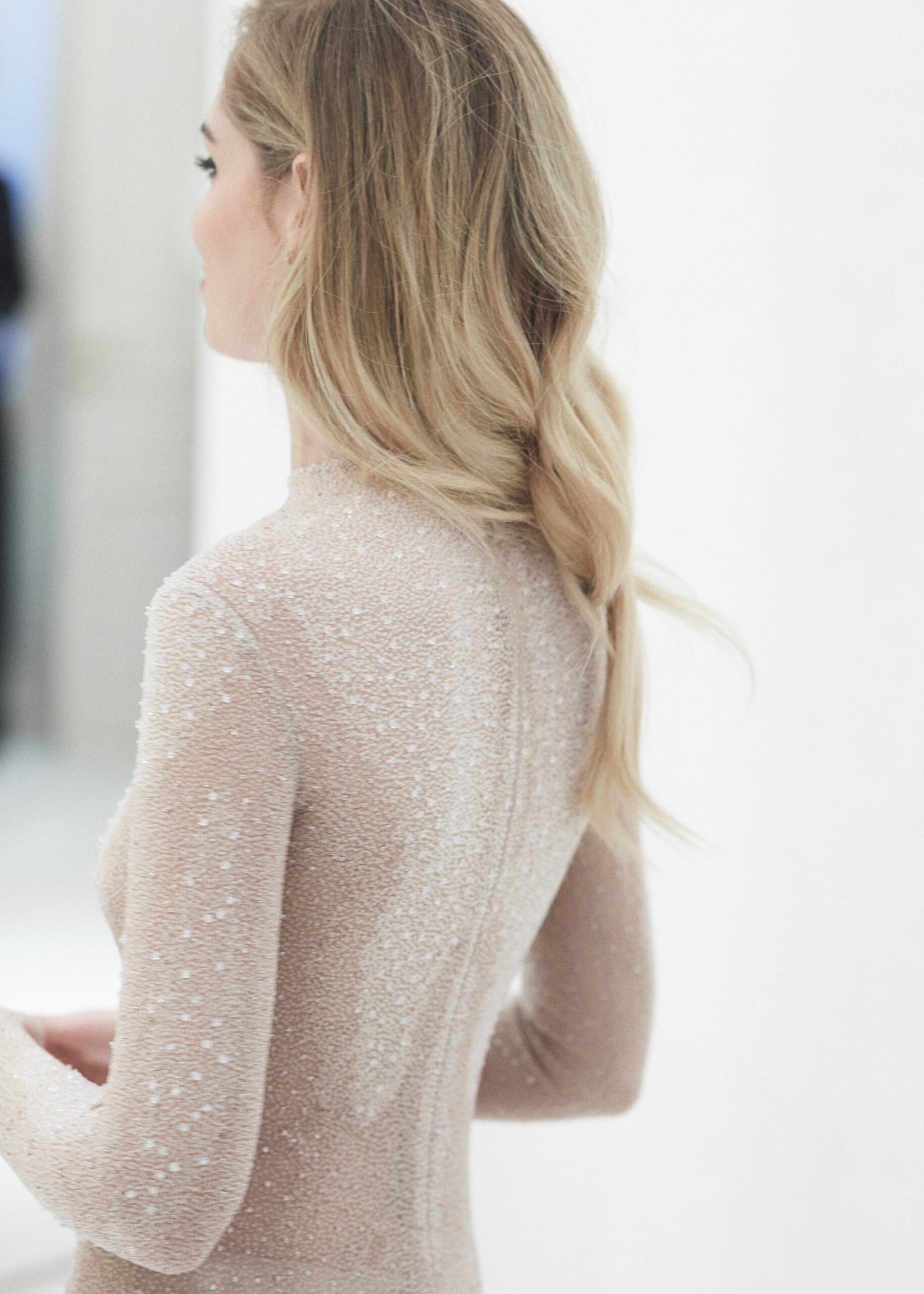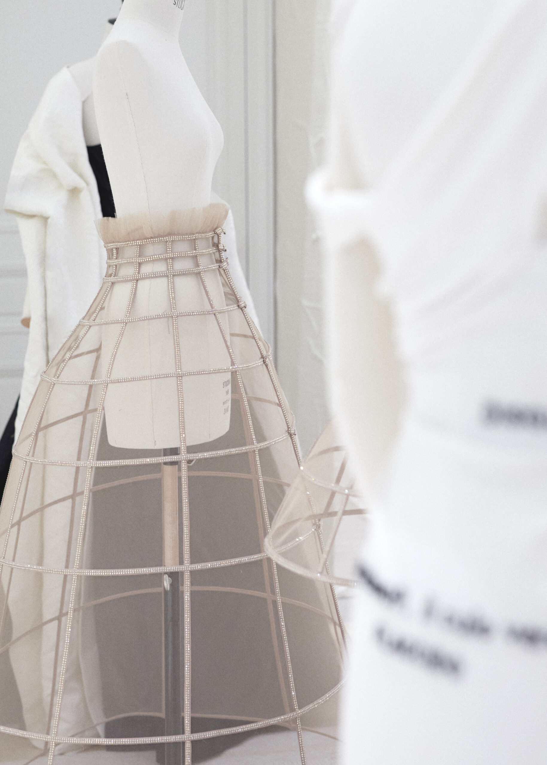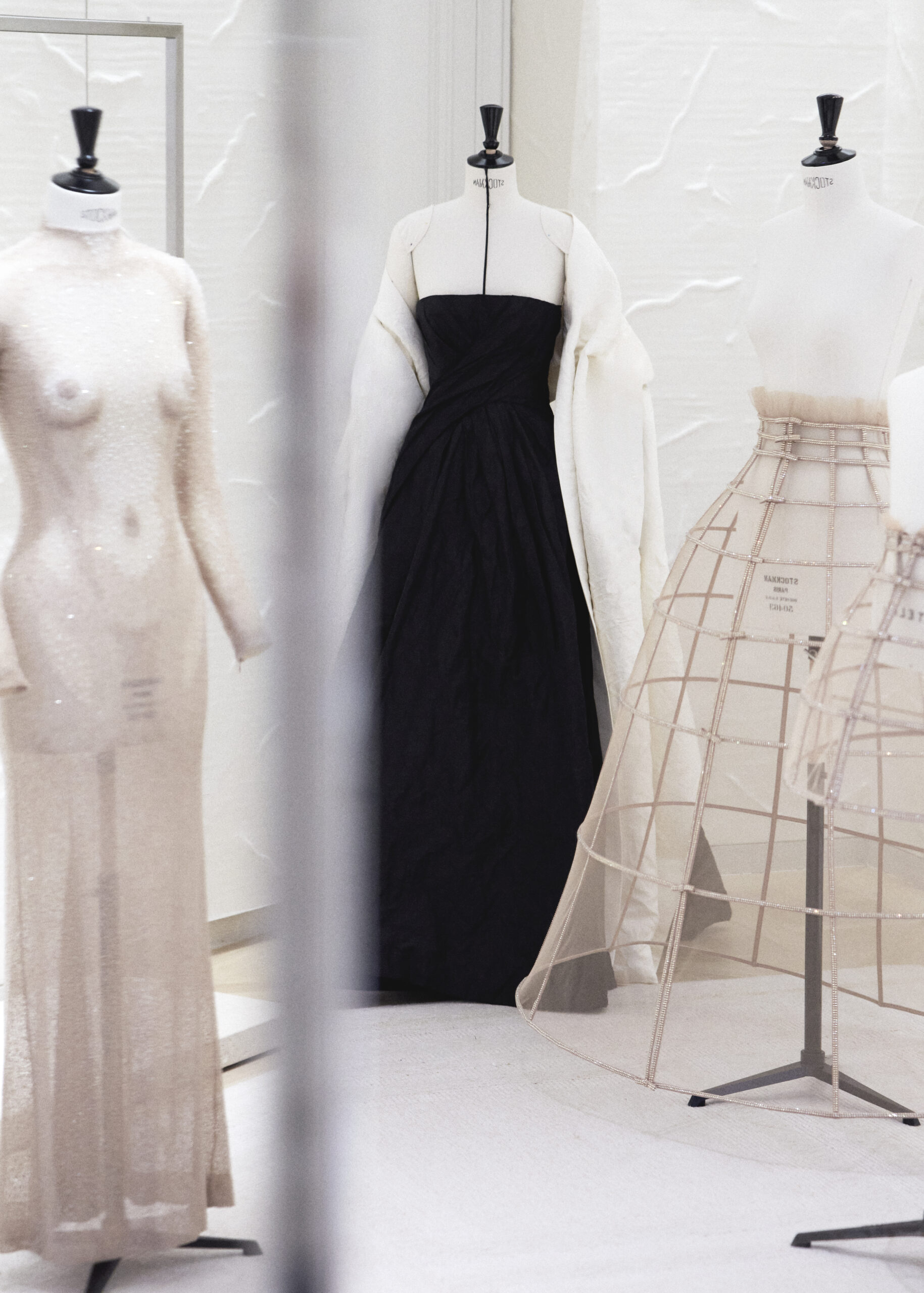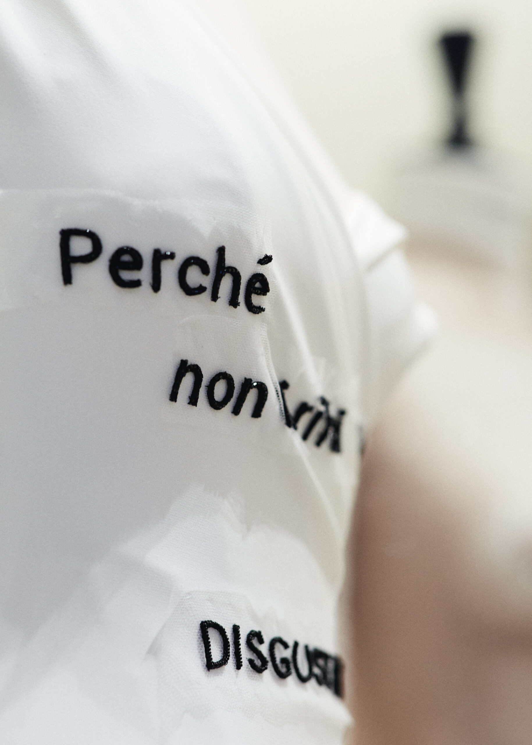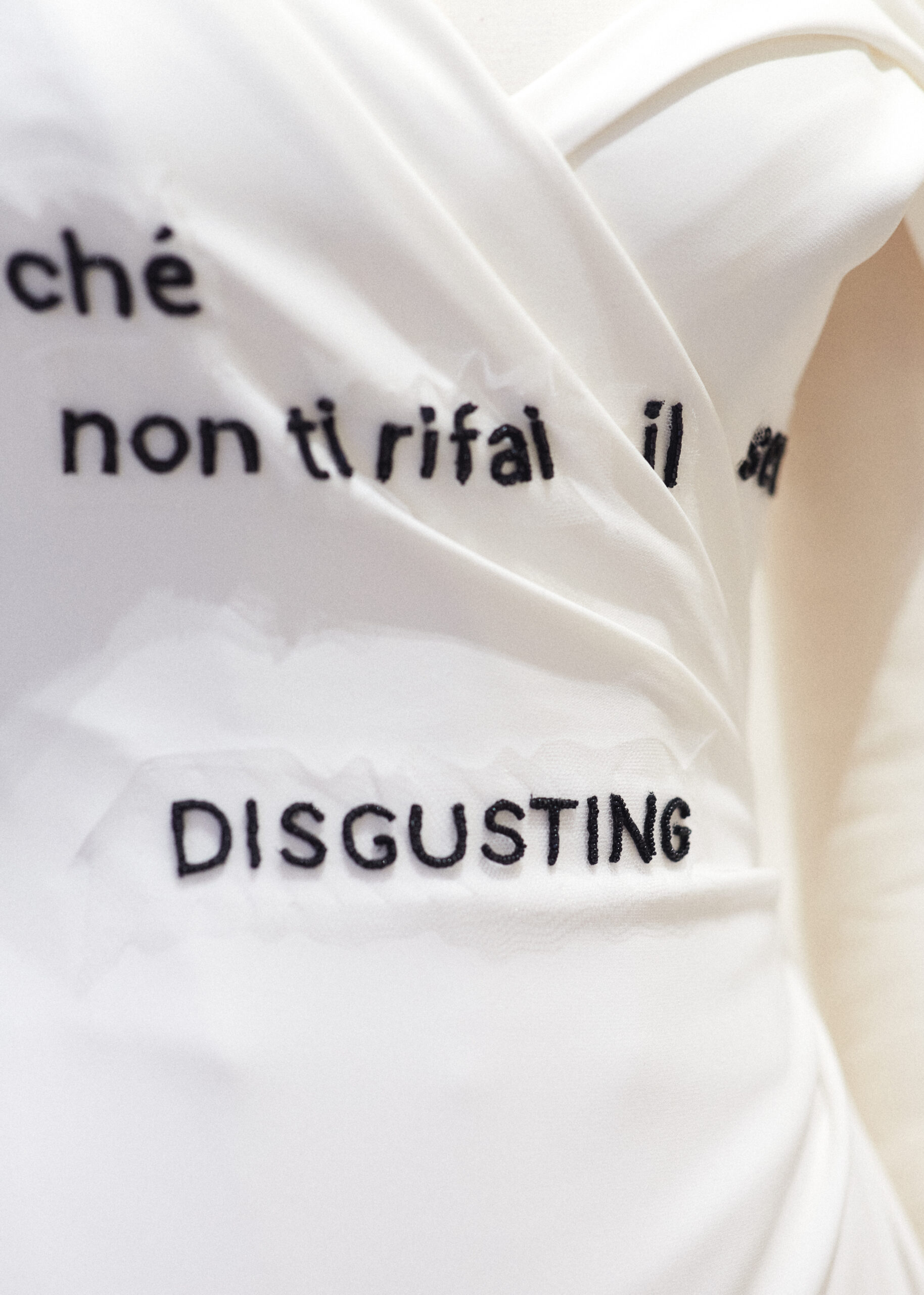 À l’occasion de la 73ème édition du festival de Sanremo – un événement consacré aux chansons italiennes – se déroulant du 7 au 11 février 2023 sur la Riviera ligure, Chiara Ferragni était vêtue de quatre créations Dior haute couture imaginées spécialement par Maria Grazia Chiuri. Telle une ode à la virtuosité des ateliers Dior, le premier modèle dévoile des lignes architecturales et une matière envoûtante froissée de façon asymétrique. Une étole ponctuée des mots « Pensati Libera », credo engagé repris par le collectif Claire Fontaine, complète le look. Sculptant en trompe-l’œil les courbes d’un corps, la seconde robe, en tulle de coton, est entièrement ornée de perles tandis que la troisième drapée dans du satin de soie blanc, est brodée des commentaires reçus par l’entrepreneuse mode sur les réseaux sociaux. Ultime surprise, la dernière silhouette est constituée d’une combinaison en jersey, subtile seconde peau, recouverte de strass topaze et agrémentée d’une jupe en tulle chair jouant avec les effets de transparence. Entre objets d’art et d’affirmation de soi, ces pièces d’exception se muent en un manifeste faisant rayonner la voix des femmes, une vision chère à la Directrice Artistique des collections féminines de Dior.