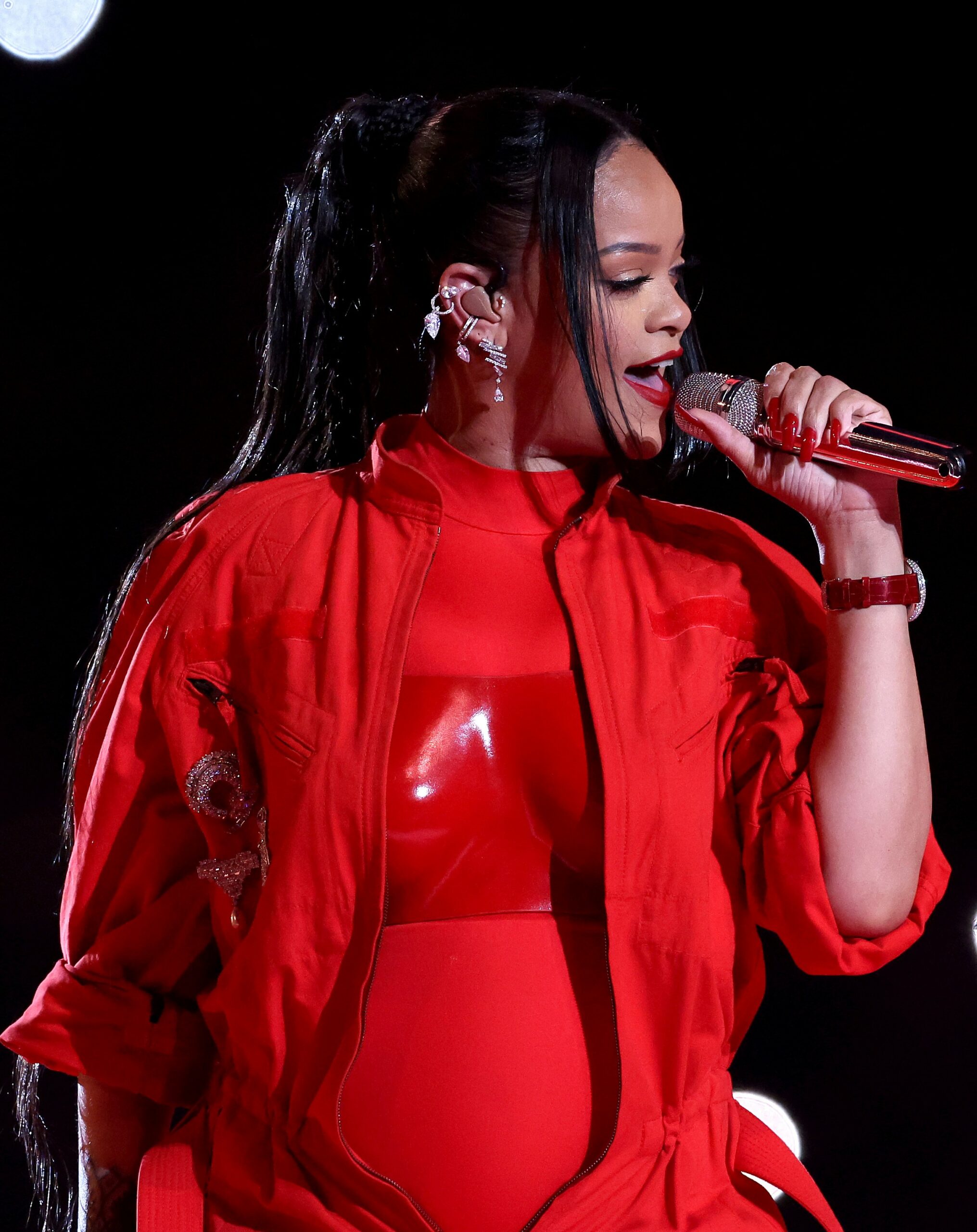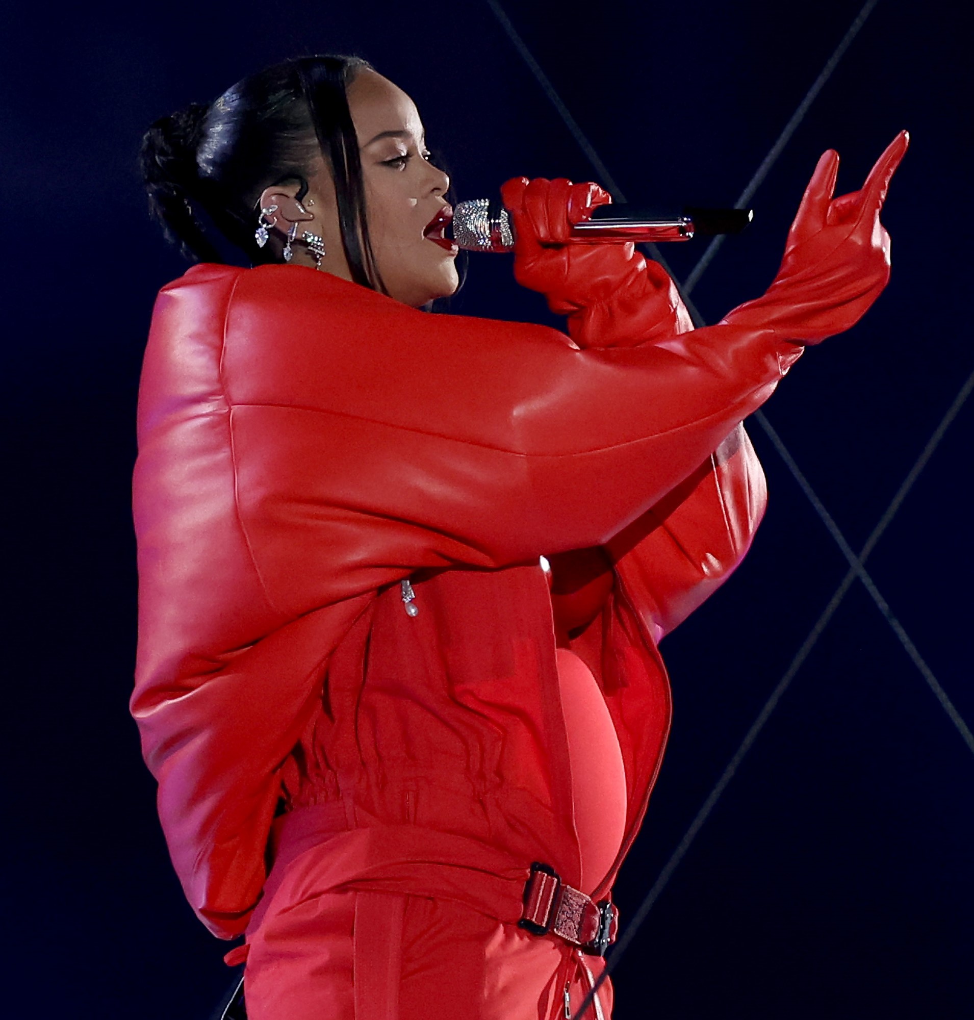 - GLENDALE, ARIZONA – FEBRUARY 12: Rihanna performs onstage during the Apple Music Super Bowl LVII Halftime Show at State Farm Stadium on February 12, 2023 in Glendale, Arizona. (Photo by Ezra Shaw/Getty Images)
