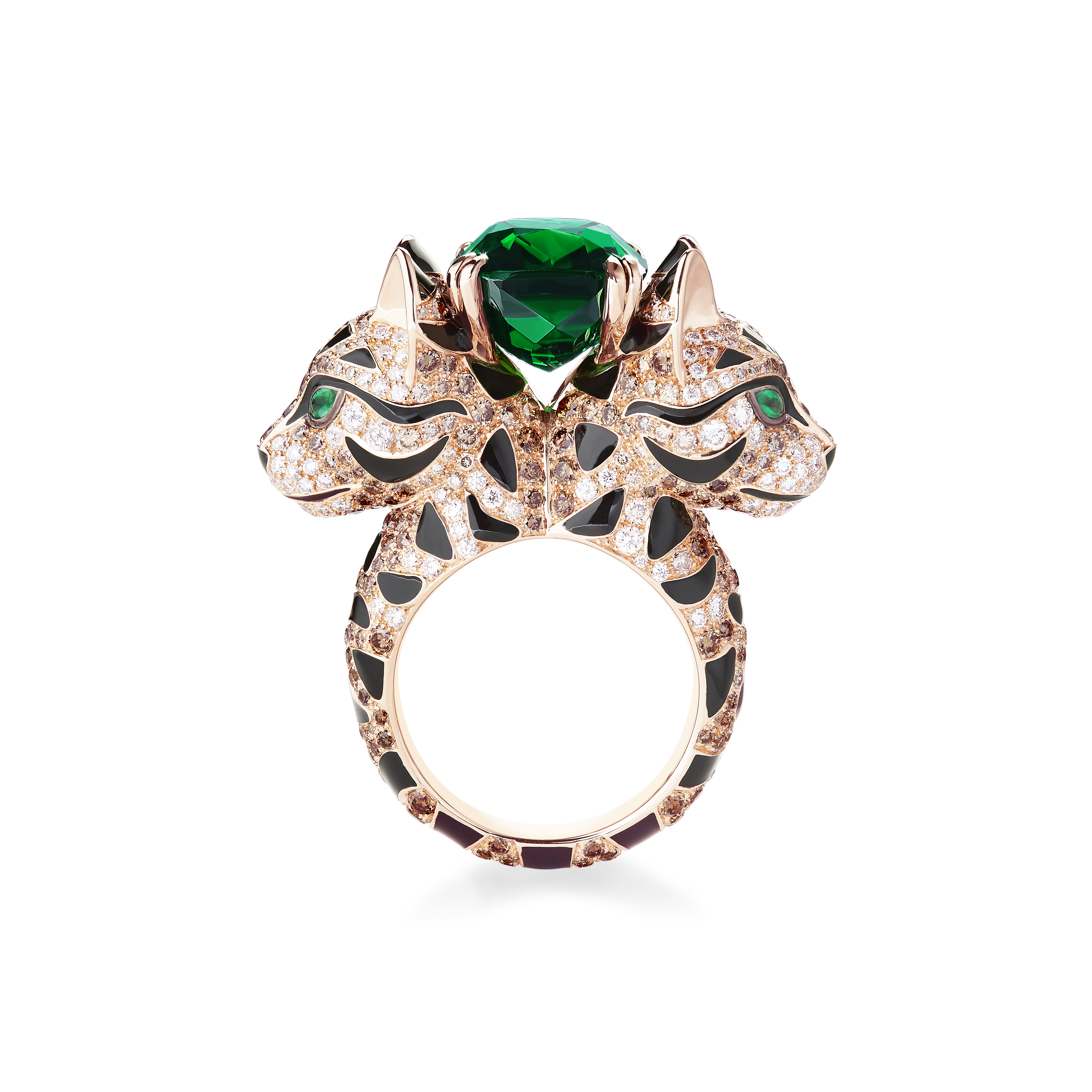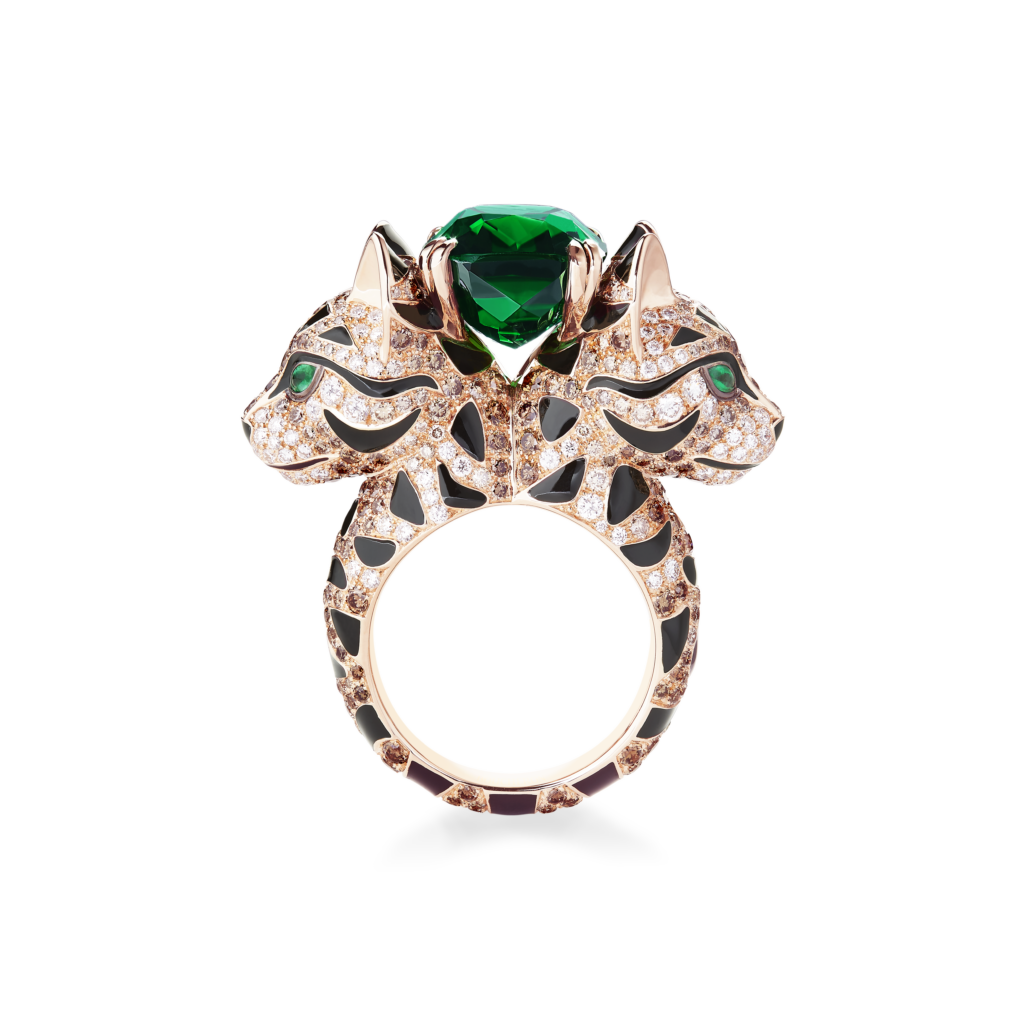 Clara Luciani était parée de la bague Fuzzy, le Chat Léopard, sertie d’une tourmaline verte taille coussin, de diamants et d’émeraudes, avec laque noir, sur or rose, de la bague Fuzzy, le Chat Léopard, sertie de diamants blancs et champagne, d’émeraudes navettes et de laque noire, sur or rose, ainsi que de la bague Serpent Bohème motif S, sertie de malachite, sur or jaune.