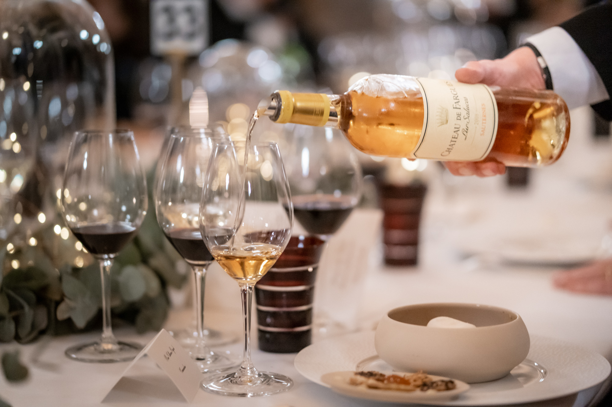 Les maîtres de chais de la Commanderie du Bontemps ont travaillé en étroite collaboration avec le traiteur sur les meilleurs accords à proposer aux convives. Ainsi le Château Carbonnieux blanc 2018 accompagnait l’entrée « Salade de homard, légumes croquants, vinaigrette soja gingembre, citron vert ». Puis, le Château Les Carmes Haut-Brion 2012 et le Château Léoville Poyferré 2008 sublimaient le « Filet de veau, chartreuse de chou vert au foie gras de canard ». Le Château Margaux 1986 se mariait à merveille avec le « Saint-Nectaire et compotée de coing ». Pour finir, le Château de Fargues 2008 accompagnait subtilement le dessert « Agrumes aux senteurs d’Orient, dattes, menthe et pignons de pin ».