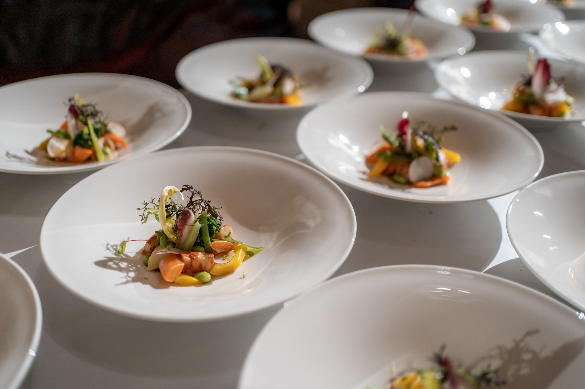 Les maîtres de chais de la Commanderie du Bontemps ont travaillé en étroite collaboration avec le traiteur sur les meilleurs accords à proposer aux convives. Ainsi le Château Carbonnieux blanc 2018 accompagnait l’entrée « Salade de homard, légumes croquants, vinaigrette soja gingembre, citron vert ». Puis, le Château Les Carmes Haut-Brion 2012 et le Château Léoville Poyferré 2008 sublimaient le « Filet de veau, chartreuse de chou vert au foie gras de canard ». Le Château Margaux 1986 se mariait à merveille avec le « Saint-Nectaire et compotée de coing ». Pour finir, le Château de Fargues 2008 accompagnait subtilement le dessert « Agrumes aux senteurs d’Orient, dattes, menthe et pignons de pin ».