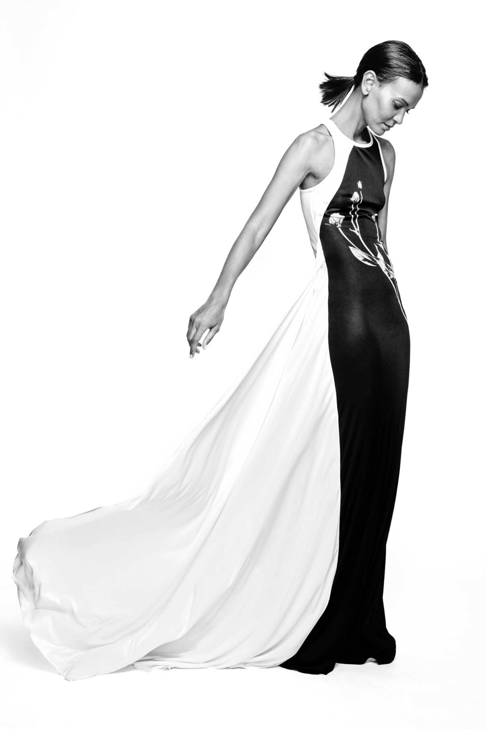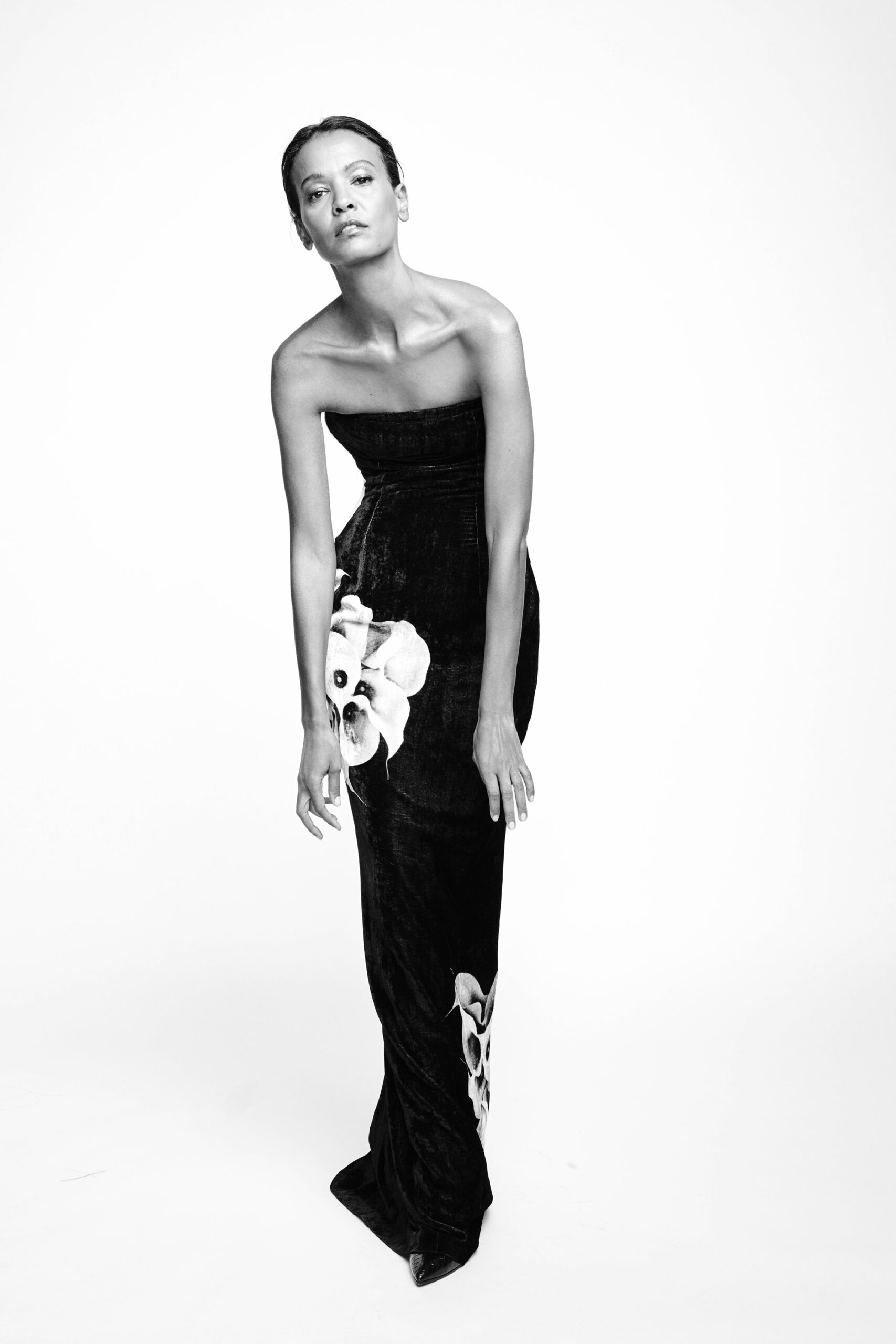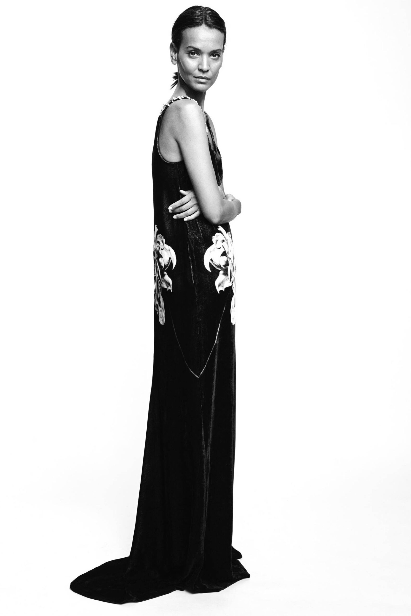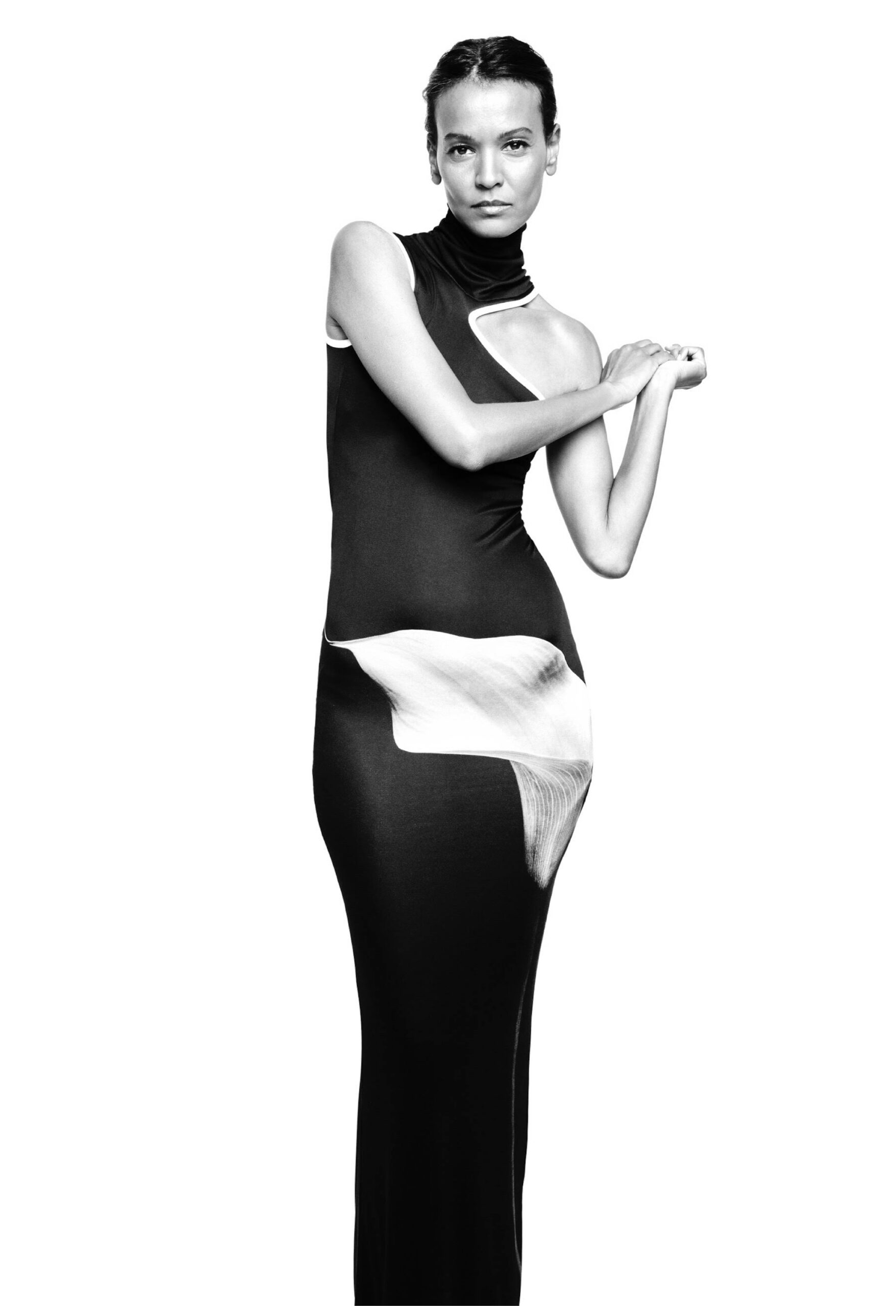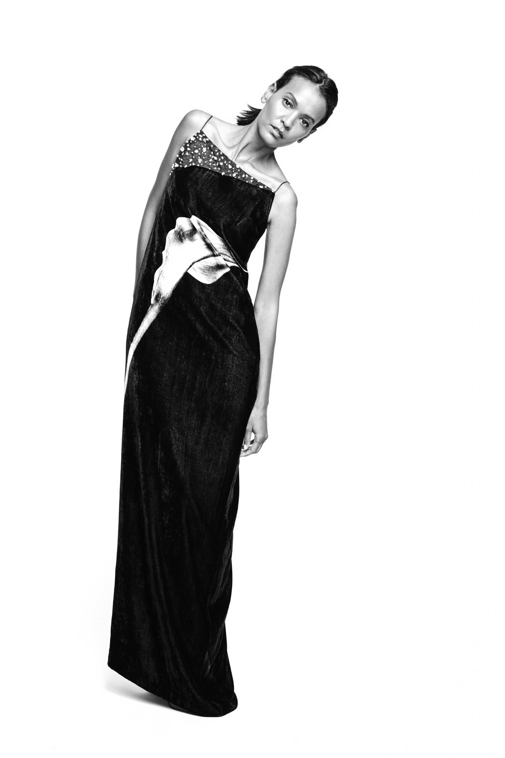 Offrant une vision audacieuse du minimalisme tout en enracinant sa fascination pour la nostalgie dans le présent, Didit Hediprasetyo présente une collection Couture qui rend hommage à la divinité intérieure de chaque femme dans toutes ses étapes d’épanouissement. Les fleurs – telles que les roses, les dahlias et les lys calla, entre autres – sont au centre de cette collection Couture et fleurissent tout au long de la collection sous forme d’imprimés digitaux magnifiés sur des robes fourreaux affleurant le sol, tout en épousant subtilement le corps et les courbes de celle qui les porte. Les références à la Belle Époque sont de facto omniprésentes et rehaussées d’une touche résolument contemporaine : l’inspiration éthérée des natures mortes de Man Ray et son héritage artistique distinct servent de fil conducteur à la collection et inspirent les coupes et les imprimés nonchalants, sophistiqués et élancés des robes du soir tout aussi sophistiquée que puissantes. La robe fourreau est le point de départ moderne de chacune des tenues Couture de cette collection, et pourtant elle est remise en question par des éléments traditionnels, comme le tissage Songket du nord de Sumatra, qui ajoutent une touche de tailoring à la douce fluidité des robes du soir. Les fleurs déclinées en imprimés numériques attirent particulièrement le regard lorsqu’elles sont déclinées sur une robe débardeur noire avec une traîne en jersey de soie blanche. La palette de couleurs, quant à elle, est aussi subtile que l’inspiration Belle Époque : des imprimés floraux blanc cassés sur des robes Couture noires forment un contraste saisissant tout en incitant à un dialogue poétique. Les tissus, quant à eux, le velours italien, le jersey de soie, la dentelle française et le cuir ajoutent une touche lumineuse aux robes de cocktail ; une luminosité qui met en valeur la beauté fragile et captivante des imprimés floraux et des délicates broderies de perles de verre. Le message est clair comme de l’eau de roche : tout en poursuivant sa quête de la célébration de la féminité à travers ses créations de couture contemporaines, Didit Hediprasetyo rend hommage à la vulnérabilité de la nature, exprimée par l’image sensuelle d’une rose naissante qui cherche chaleur et protection – comme nous tous.