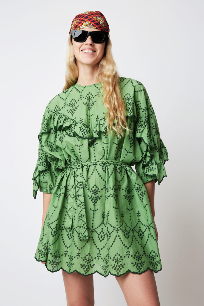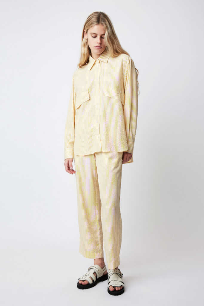 Rose acidulé & poudré, vanille, vert prairie, banane & jaune impérial se conjuguent avec les classiques bleu mer, denim, écru, olive, caramel et quelques touches de noir verni et pois technique.