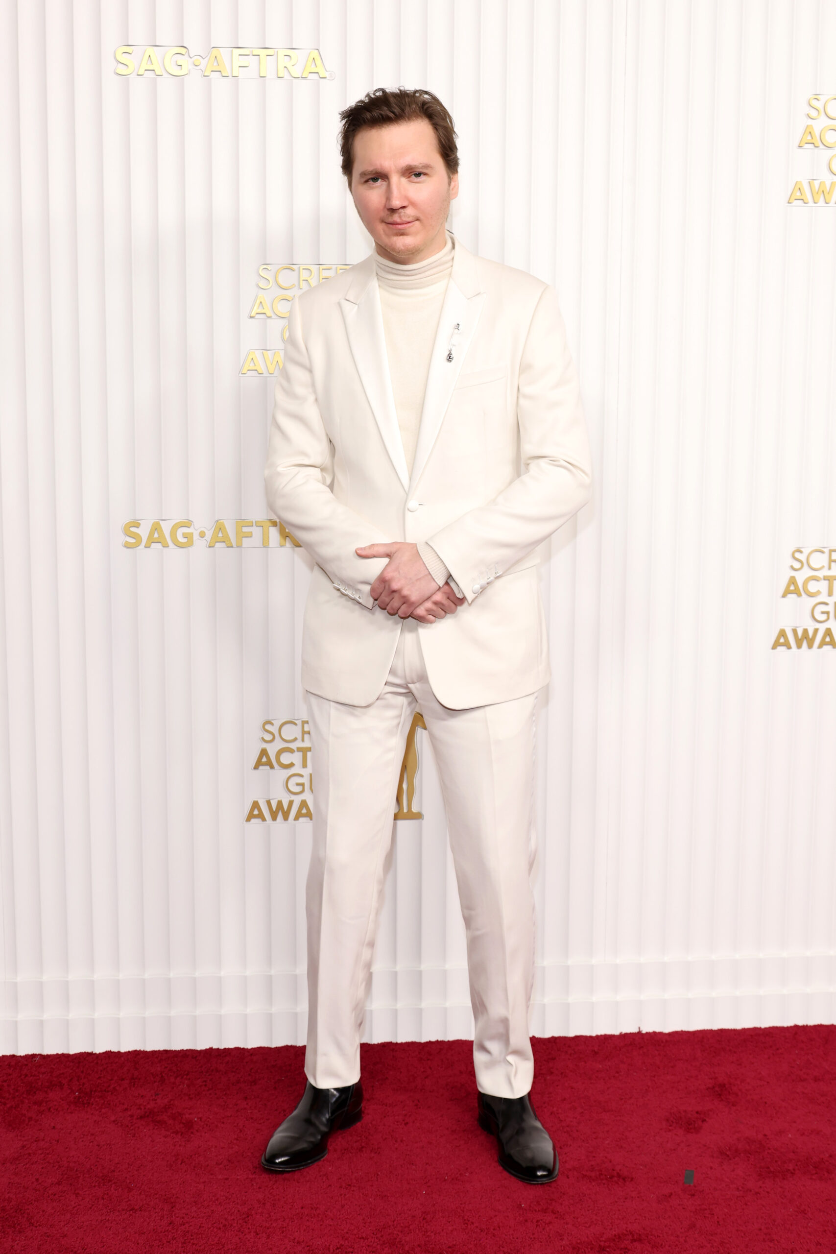 Paul Dano wore a Dior men’s collection off-white peak lapel tuxedo, an off-white cashmere mockneck knit, a silver brooch and black leather boots.