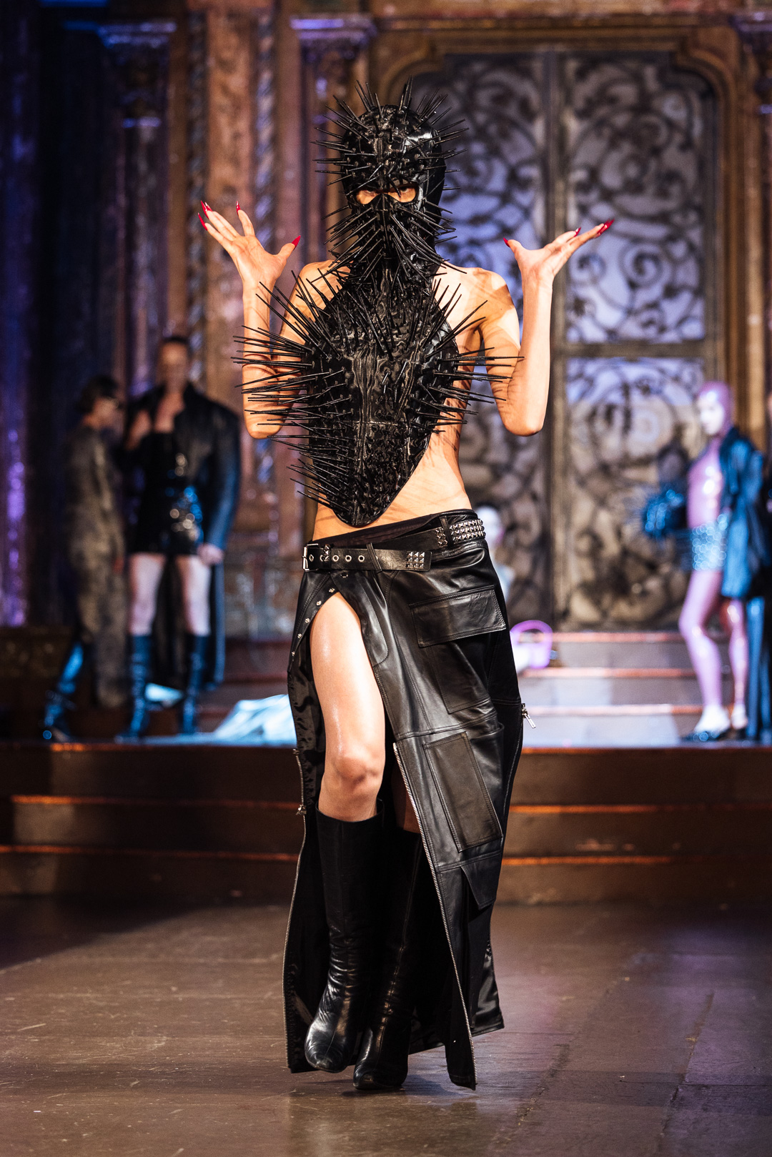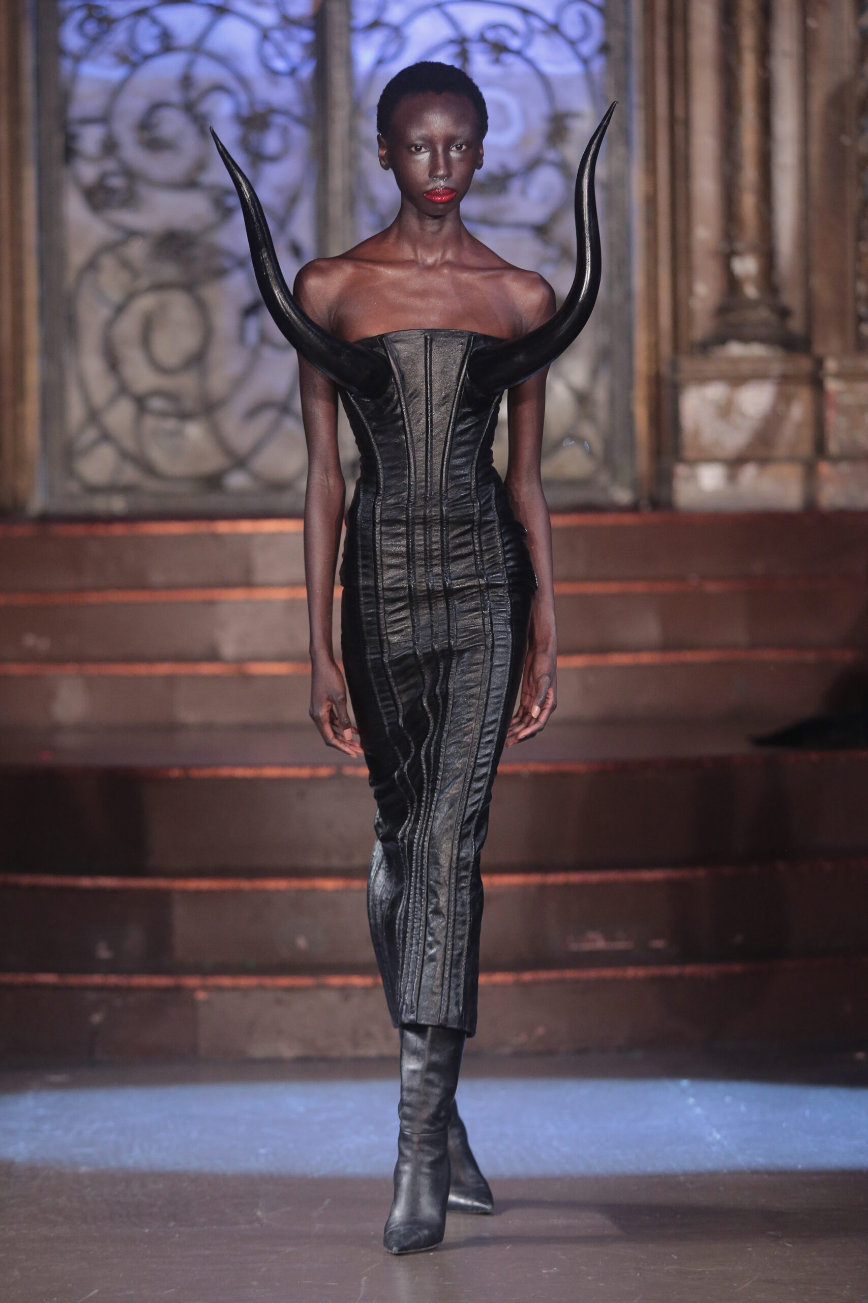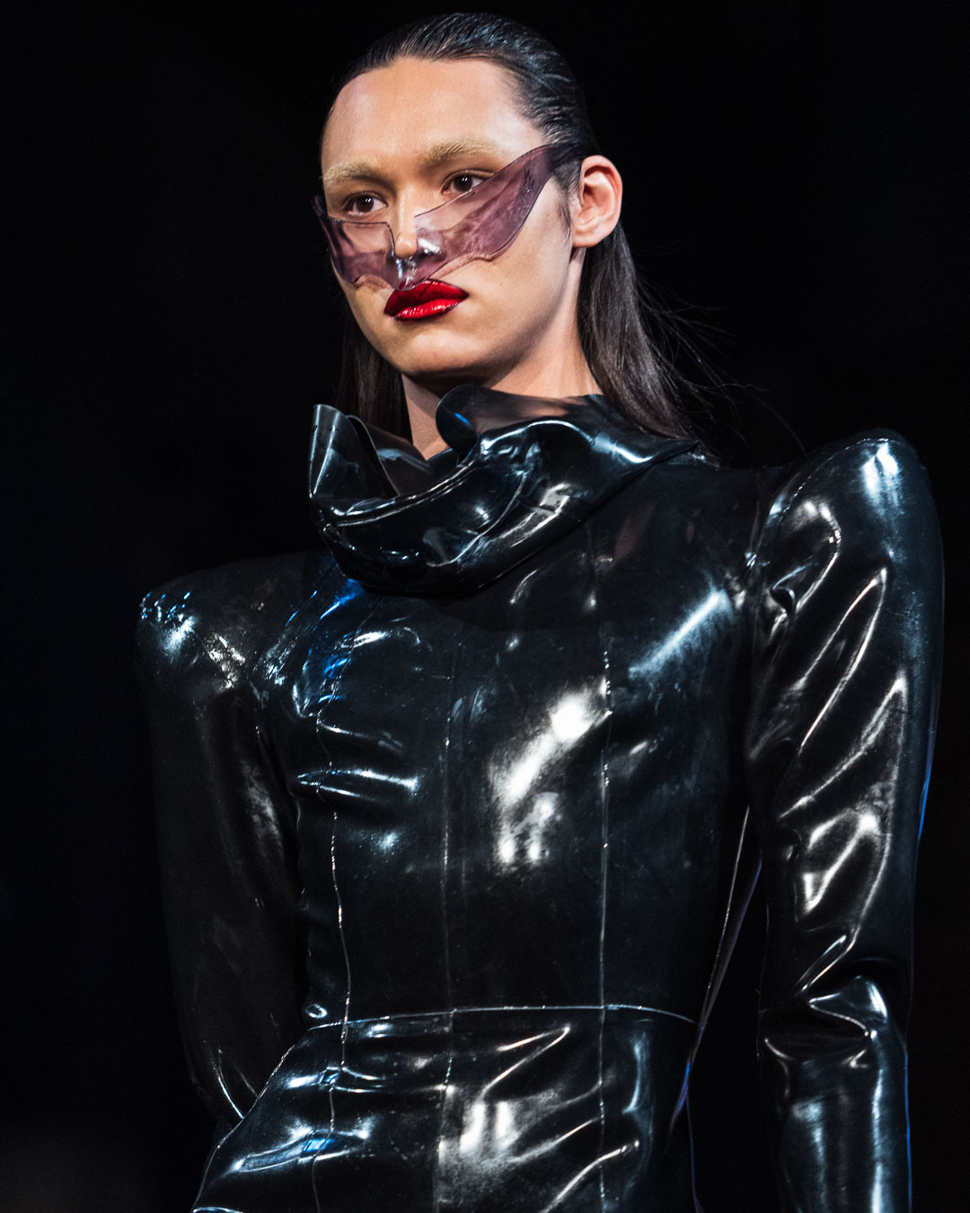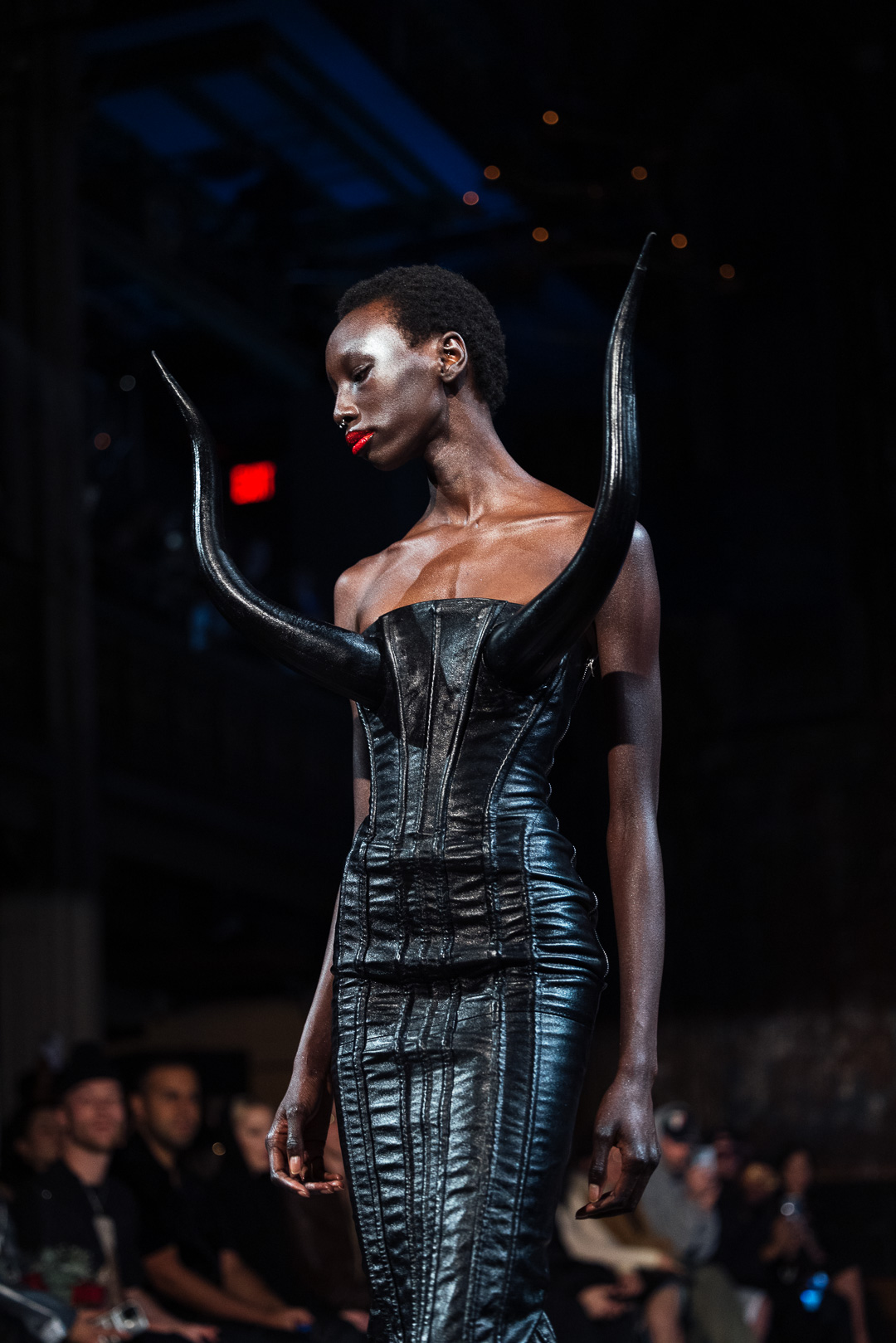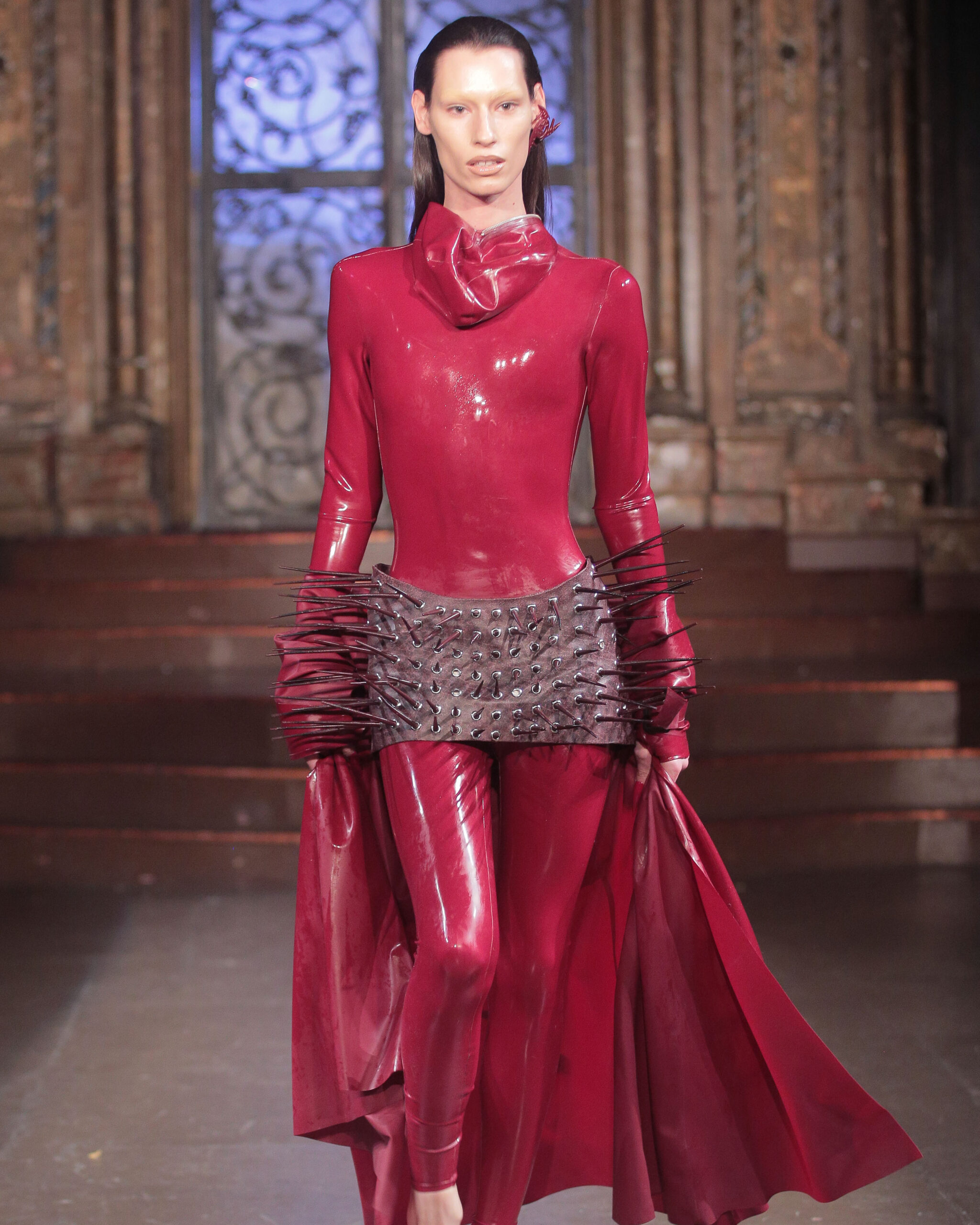 Le latex et le cuir sont présents tout au long de la collection avec des épaules pointues, de la corseterie et des traînes, avec de nombreux ourlets exagérés, dans une palette de couleurs de prune, d’argent métallique, de rouge sang et de noir profond. Le cuir gris dramatique et en détresse est imprimé sur du cuir végétal, en collaboration avec Kornit.