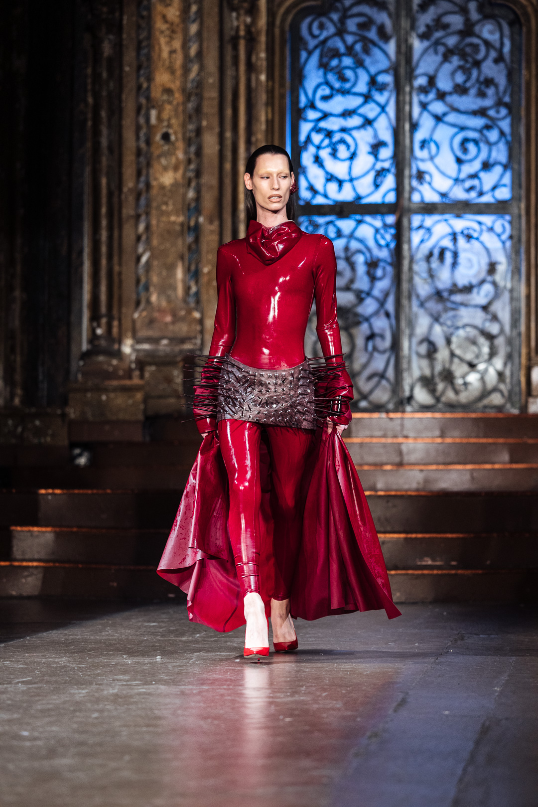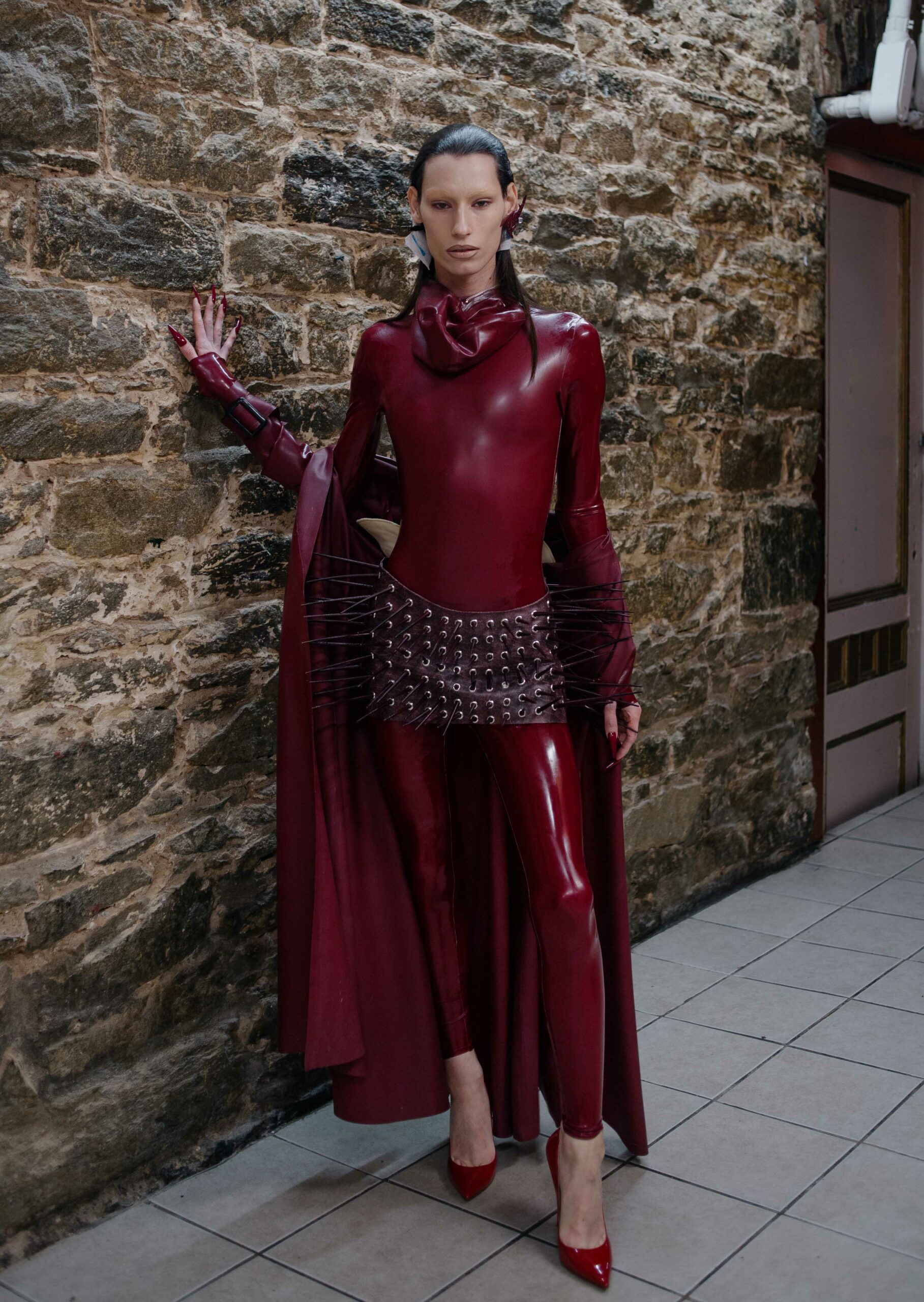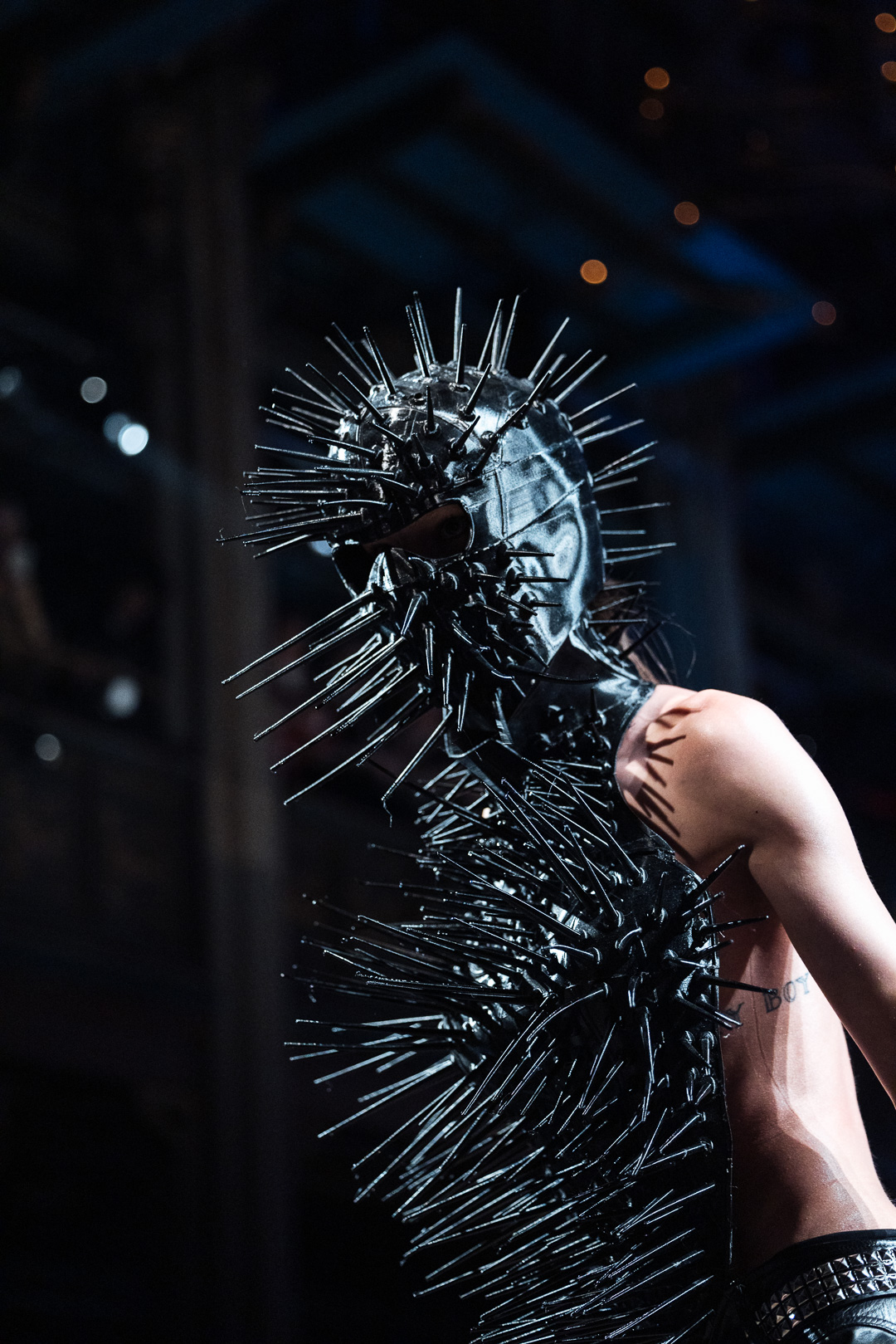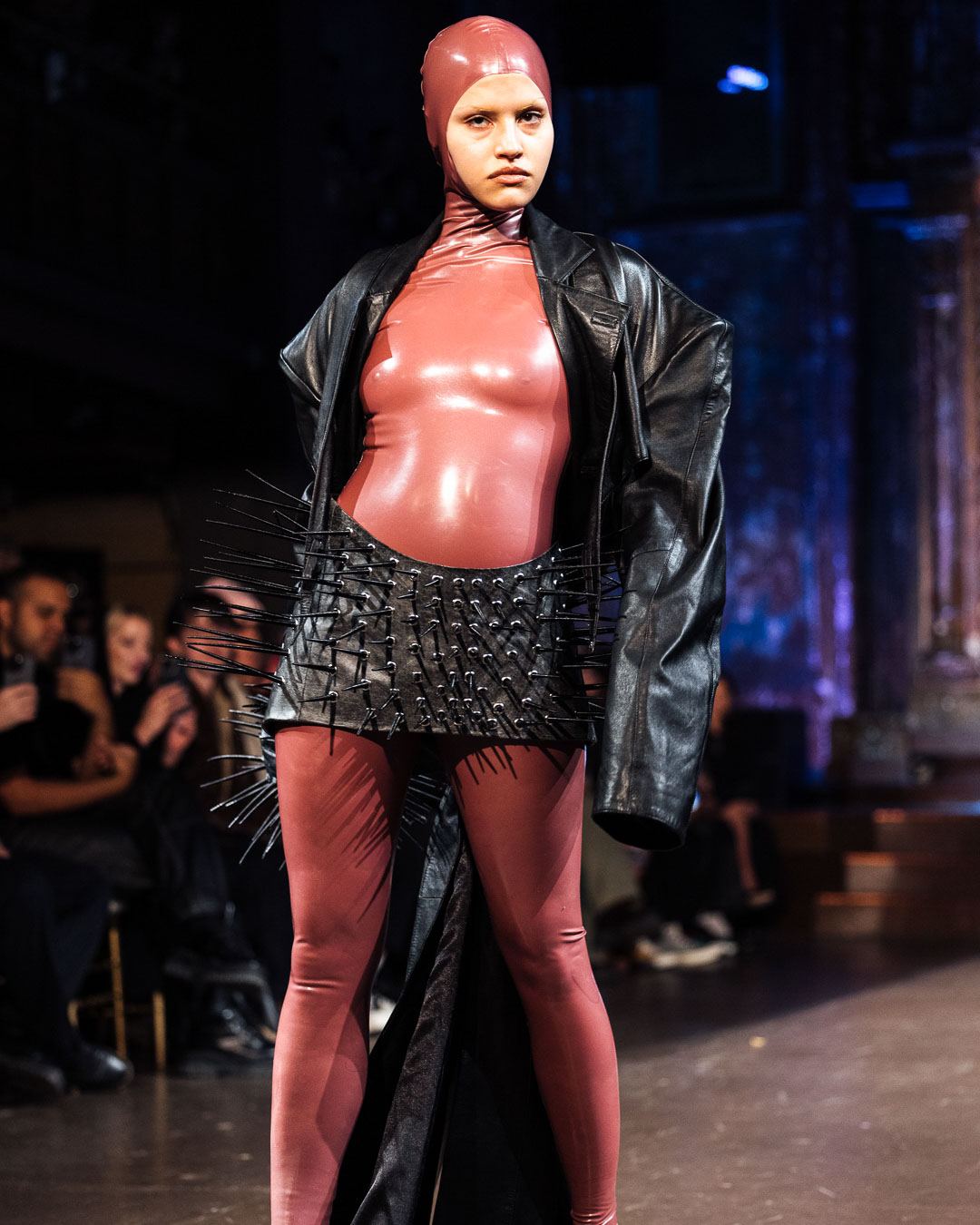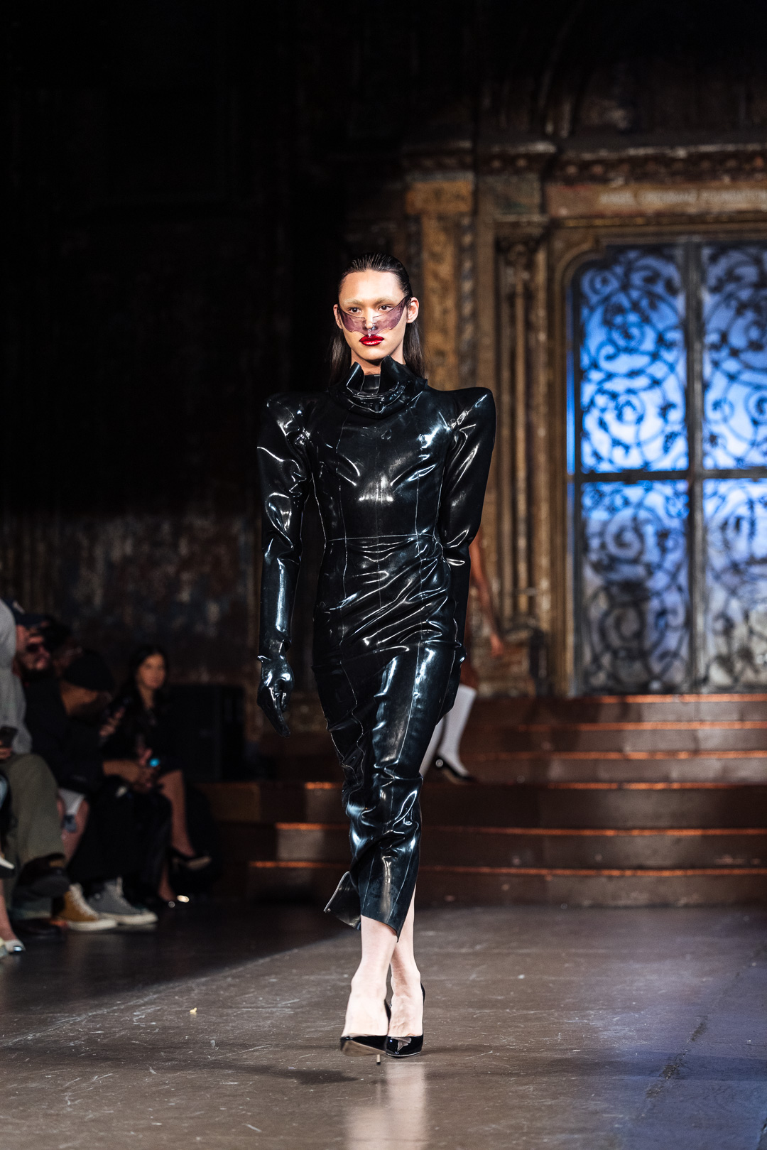 Le latex et le cuir sont présents tout au long de la collection avec des épaules pointues, de la corseterie et des traînes, avec de nombreux ourlets exagérés, dans une palette de couleurs de prune, d’argent métallique, de rouge sang et de noir profond. Le cuir gris dramatique et en détresse est imprimé sur du cuir végétal, en collaboration avec Kornit.