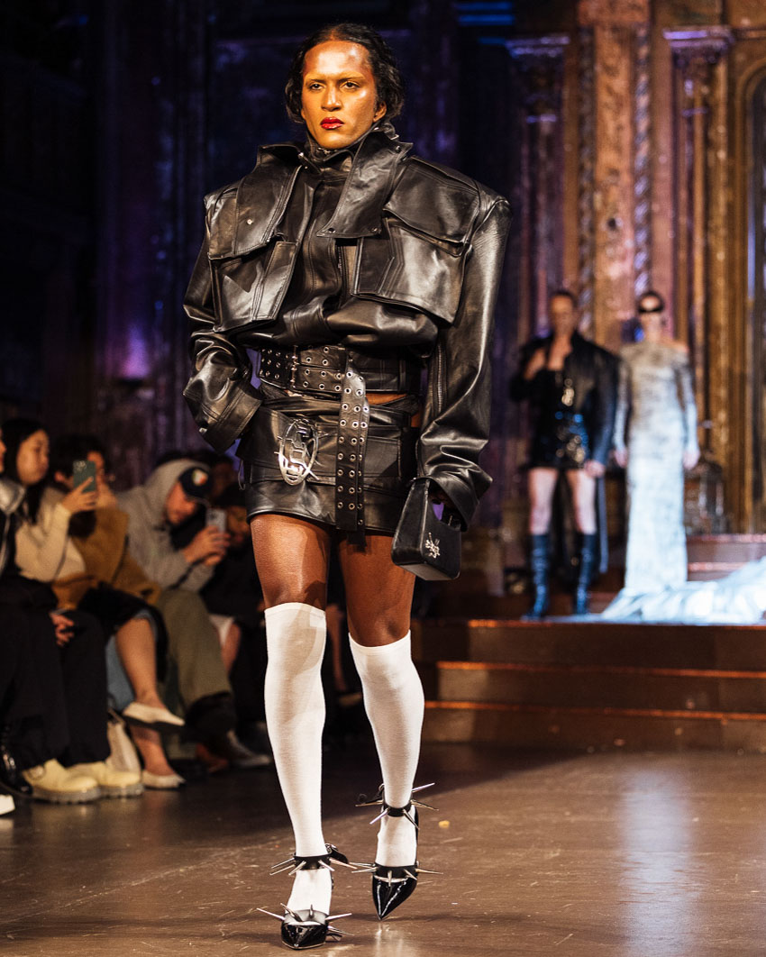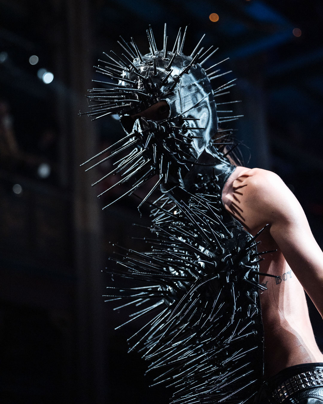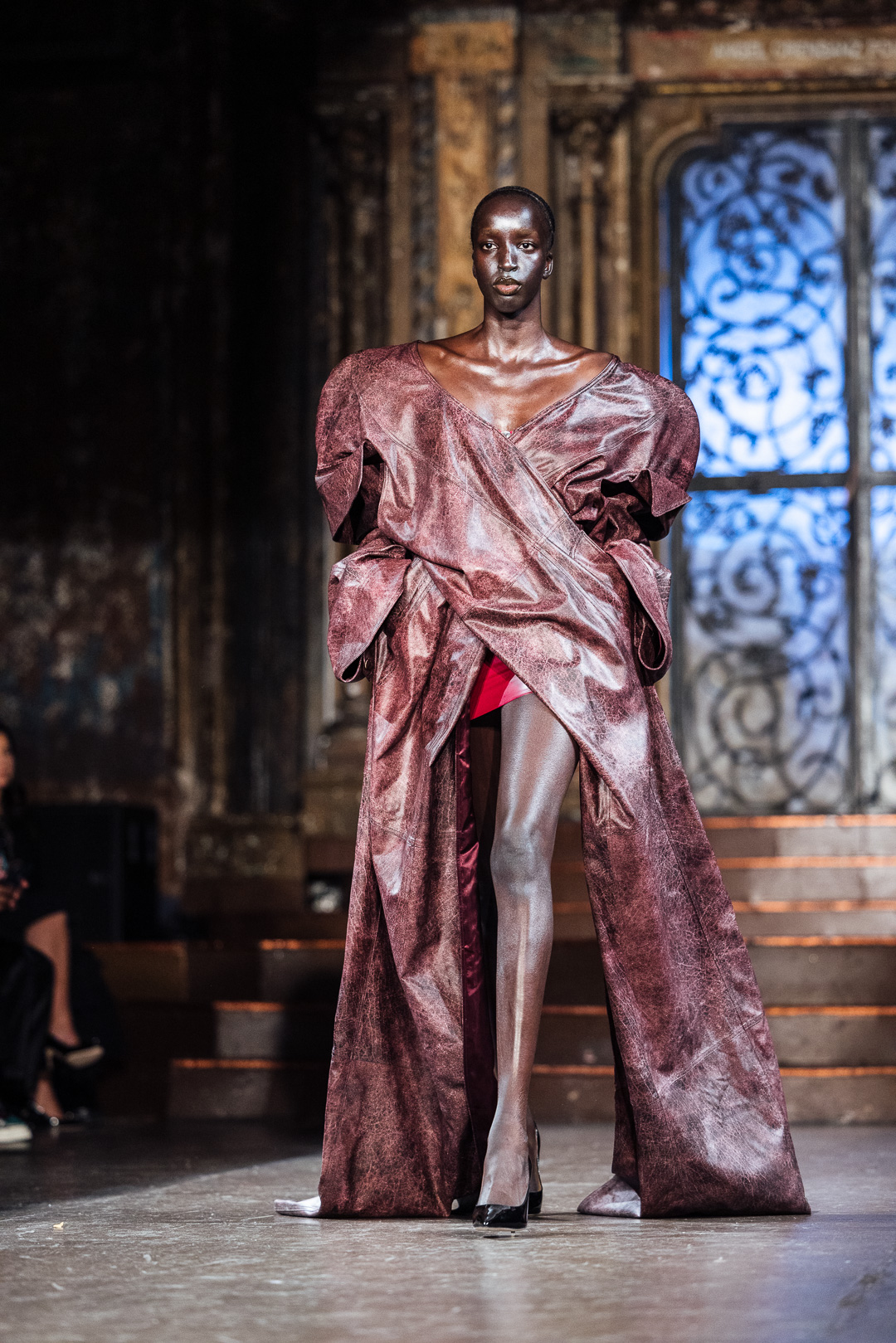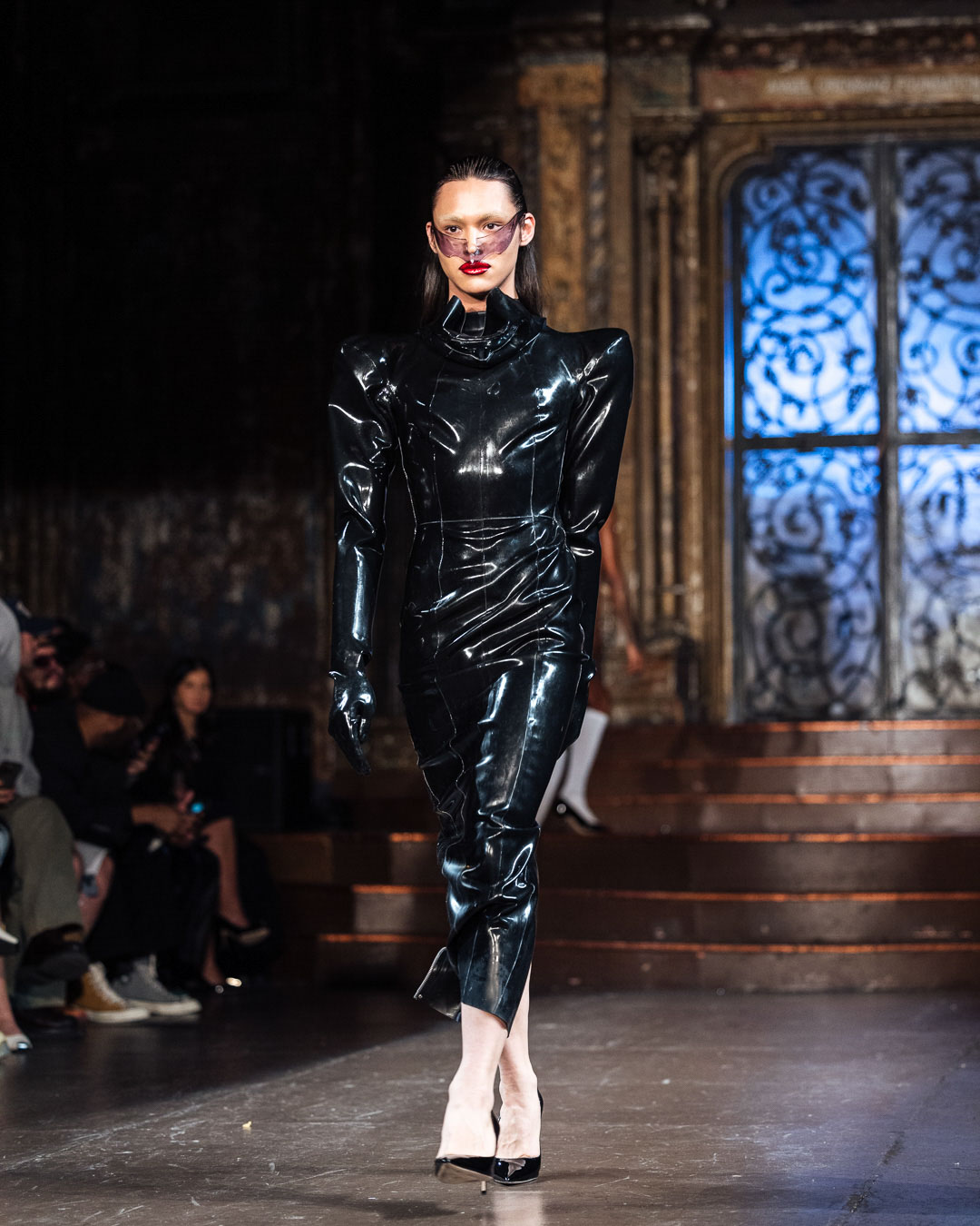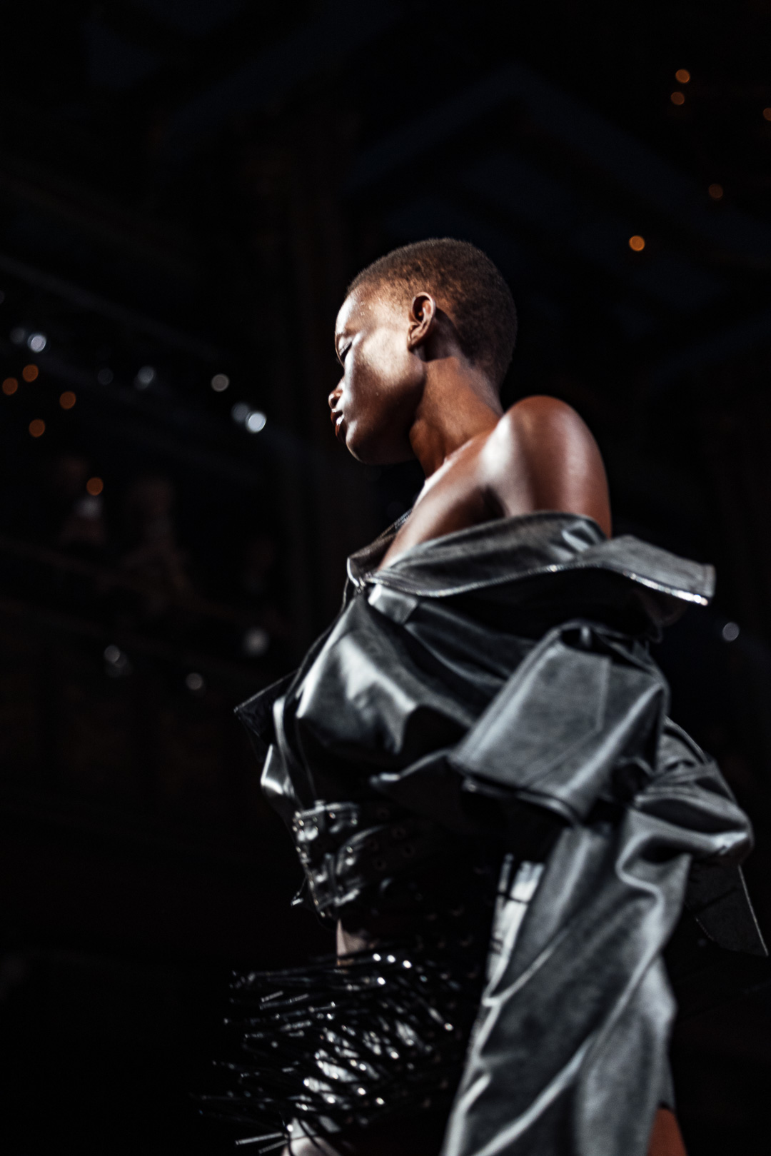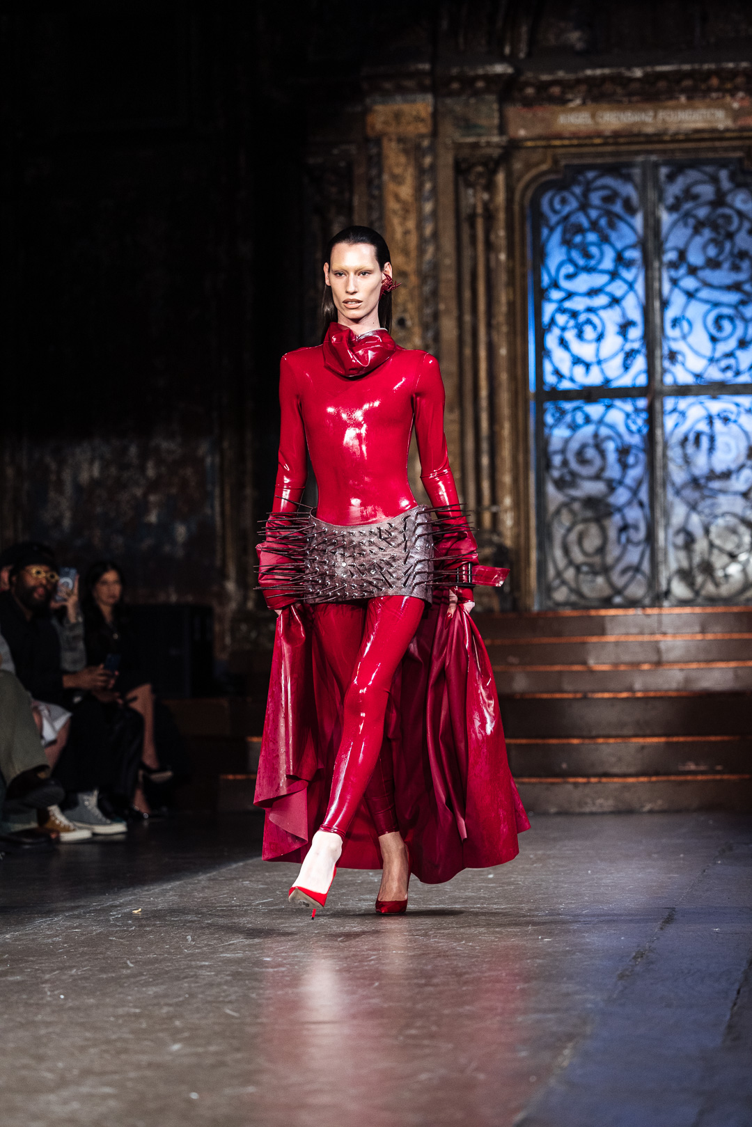 Le latex et le cuir sont présents tout au long de la collection avec des épaules pointues, de la corseterie et des traînes, avec de nombreux ourlets exagérés, dans une palette de couleurs de prune, d’argent métallique, de rouge sang et de noir profond. Le cuir gris dramatique et en détresse est imprimé sur du cuir végétal, en collaboration avec Kornit.
