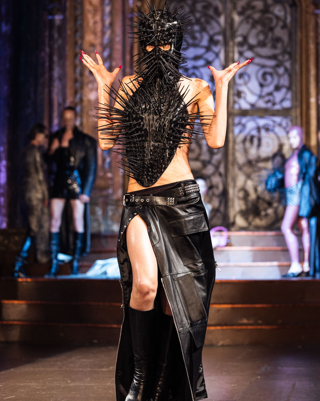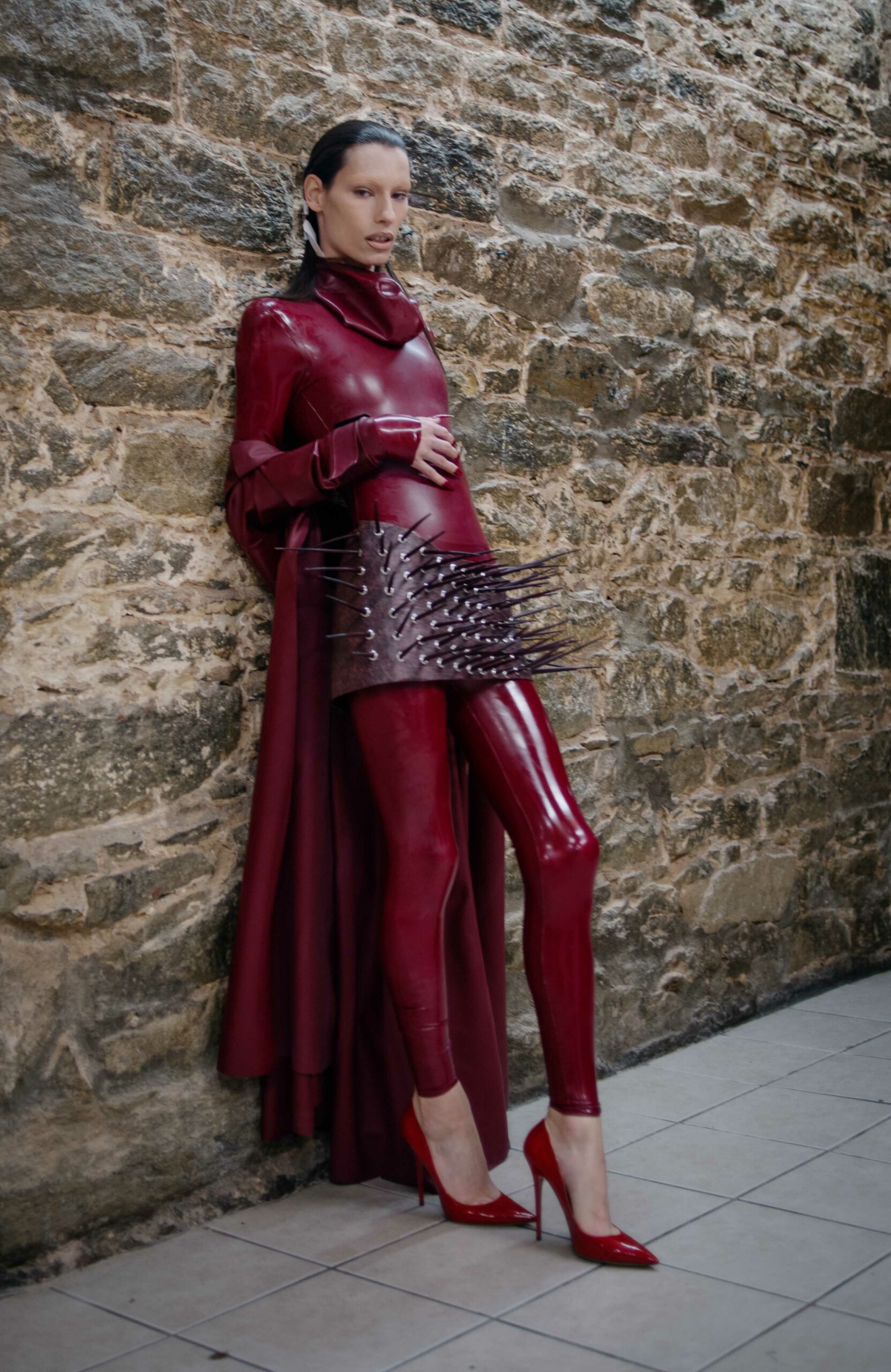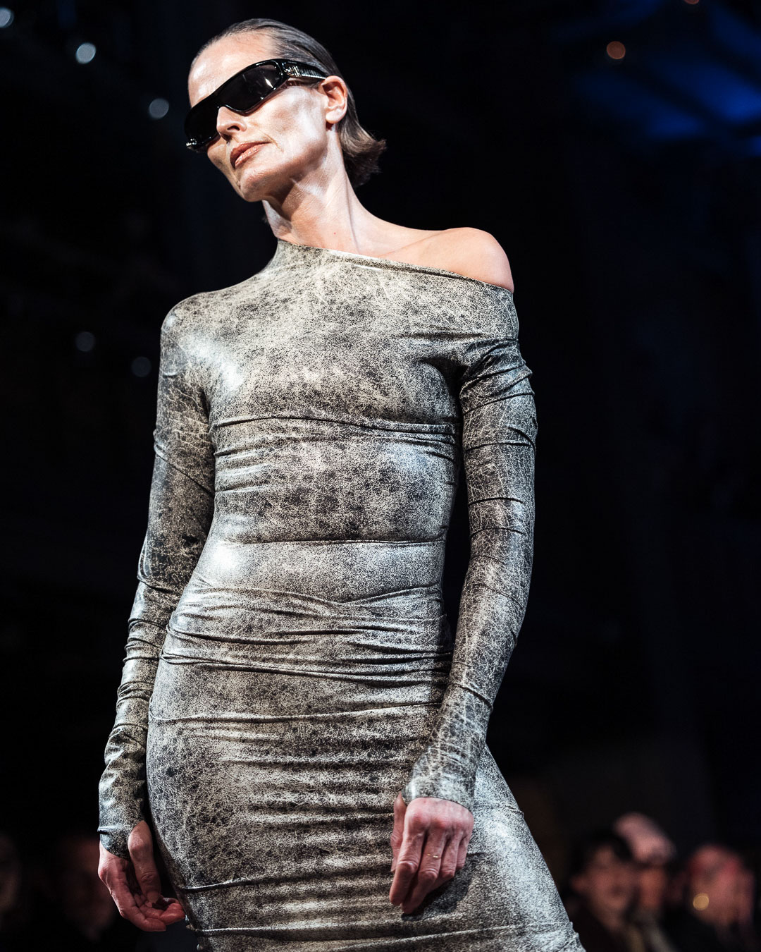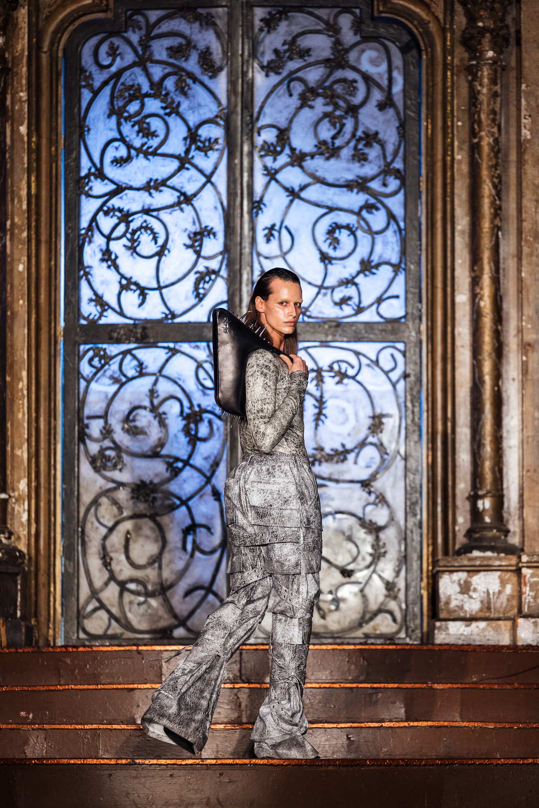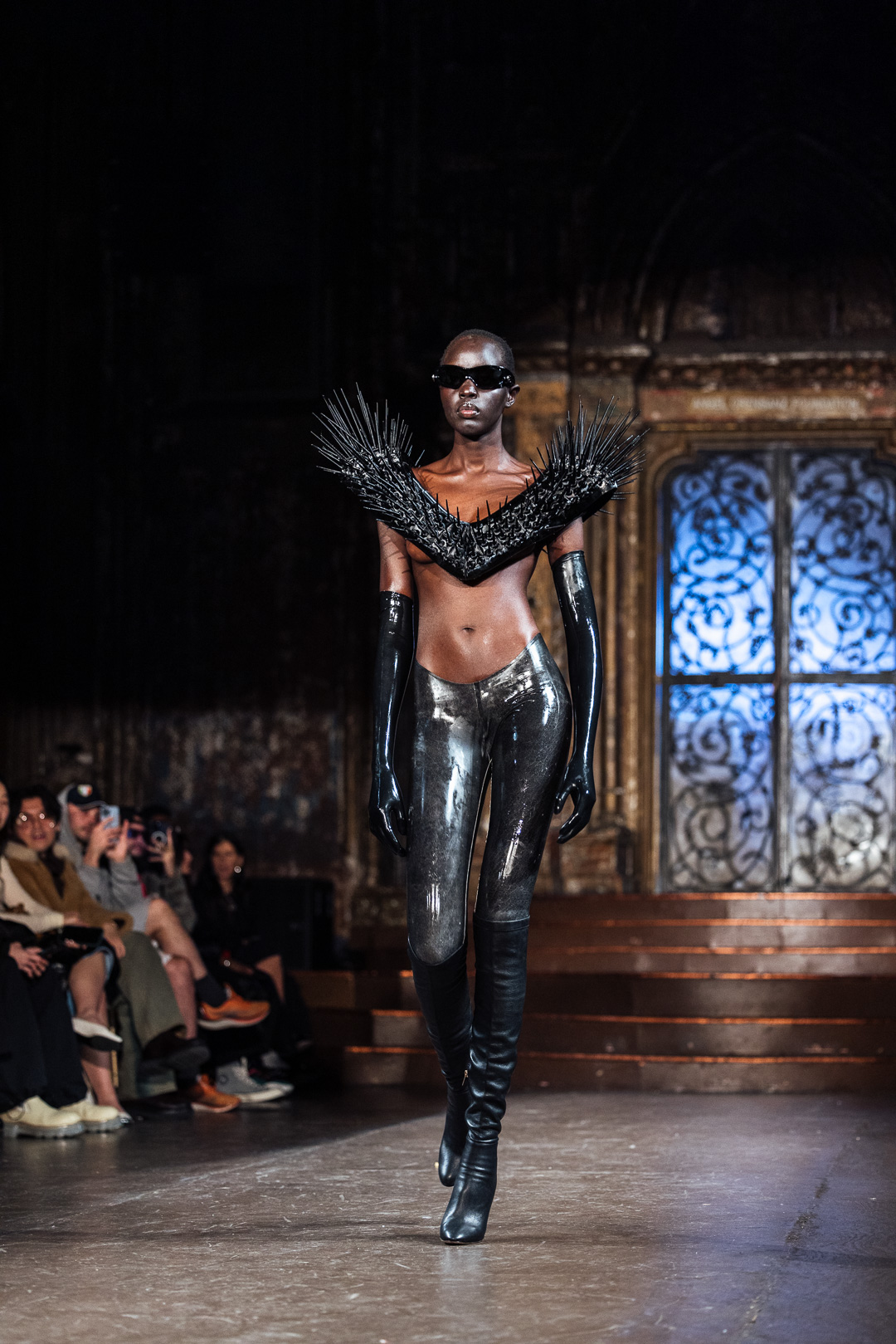 Le latex et le cuir sont présents tout au long de la collection avec des épaules pointues, de la corseterie et des traînes, avec de nombreux ourlets exagérés, dans une palette de couleurs de prune, d’argent métallique, de rouge sang et de noir profond. Le cuir gris dramatique et en détresse est imprimé sur du cuir végétal, en collaboration avec Kornit.