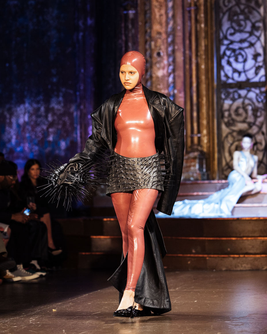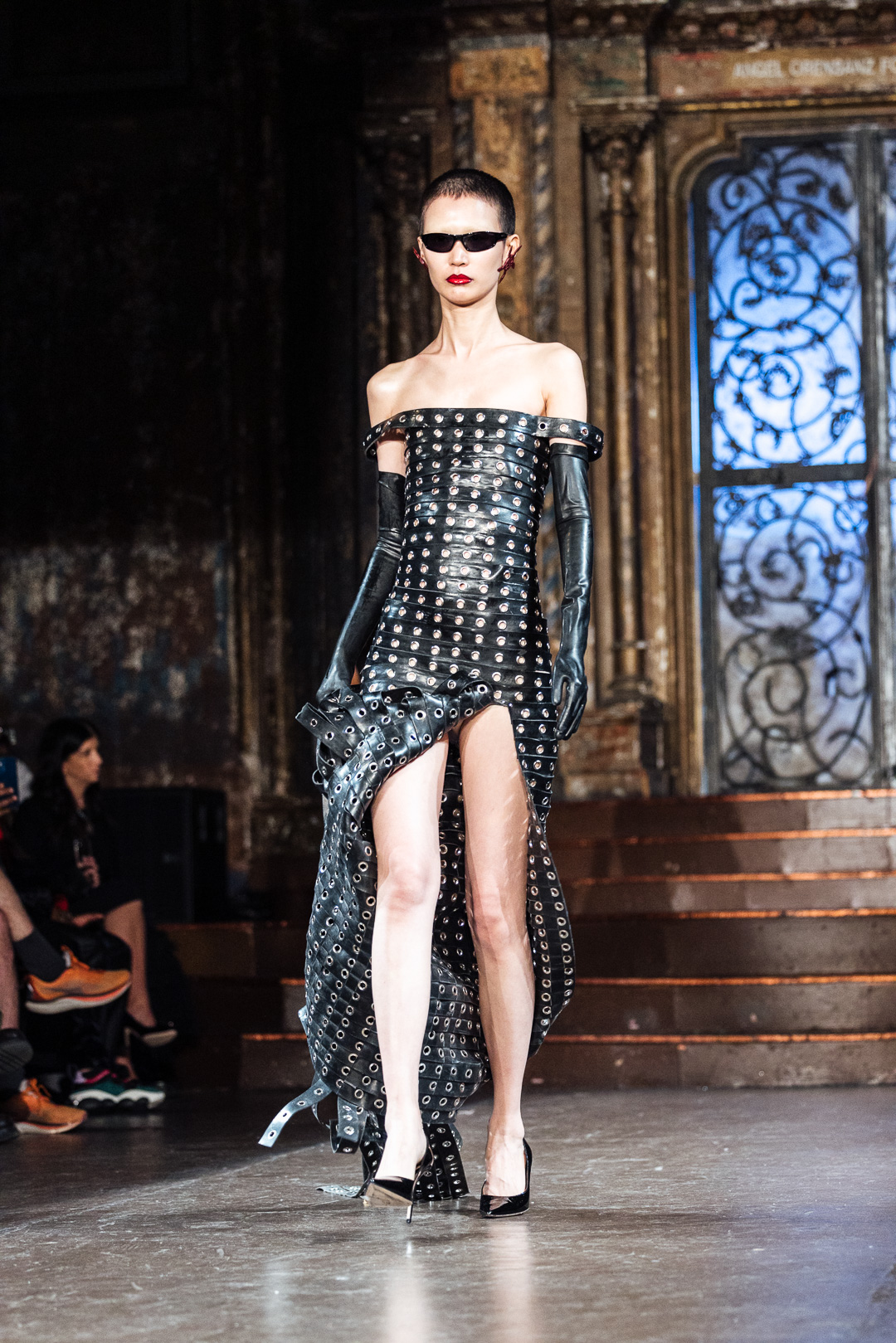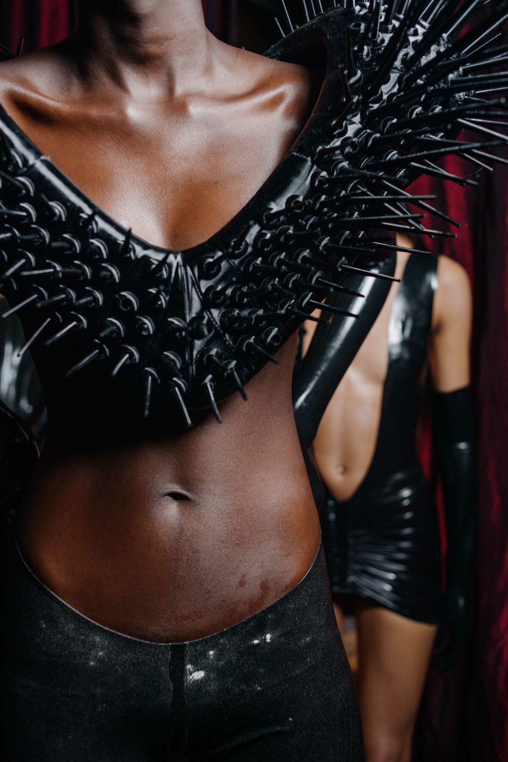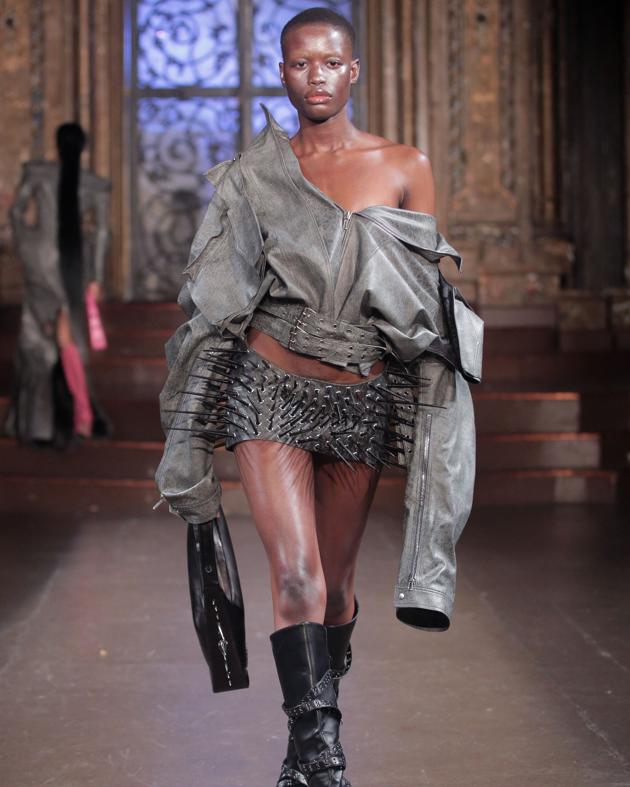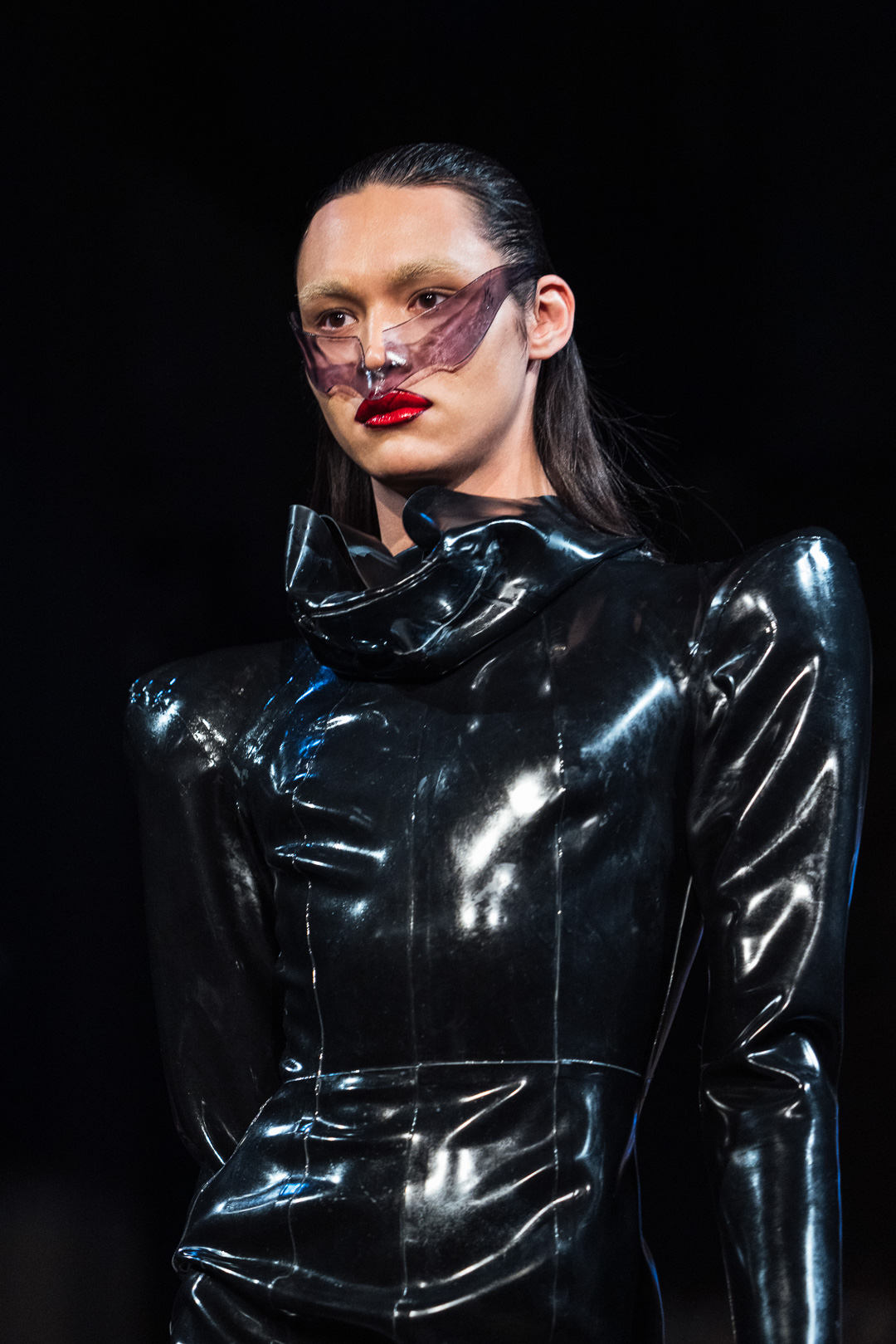 Le latex et le cuir sont présents tout au long de la collection avec des épaules pointues, de la corseterie et des traînes, avec de nombreux ourlets exagérés, dans une palette de couleurs de prune, d’argent métallique, de rouge sang et de noir profond. Le cuir gris dramatique et en détresse est imprimé sur du cuir végétal, en collaboration avec Kornit.