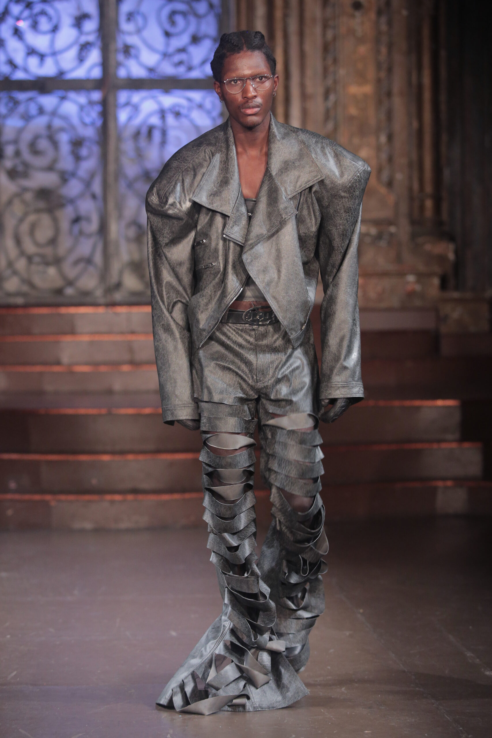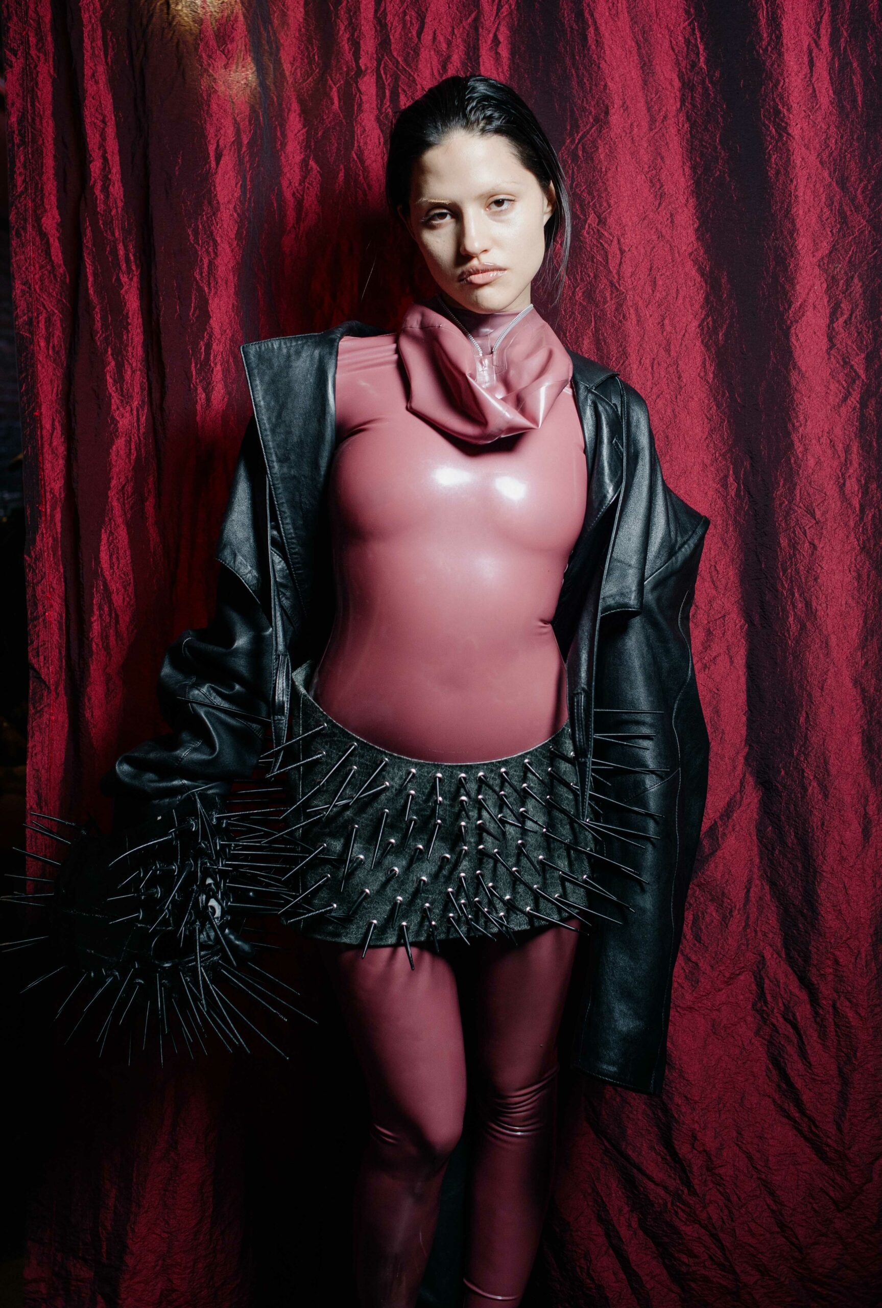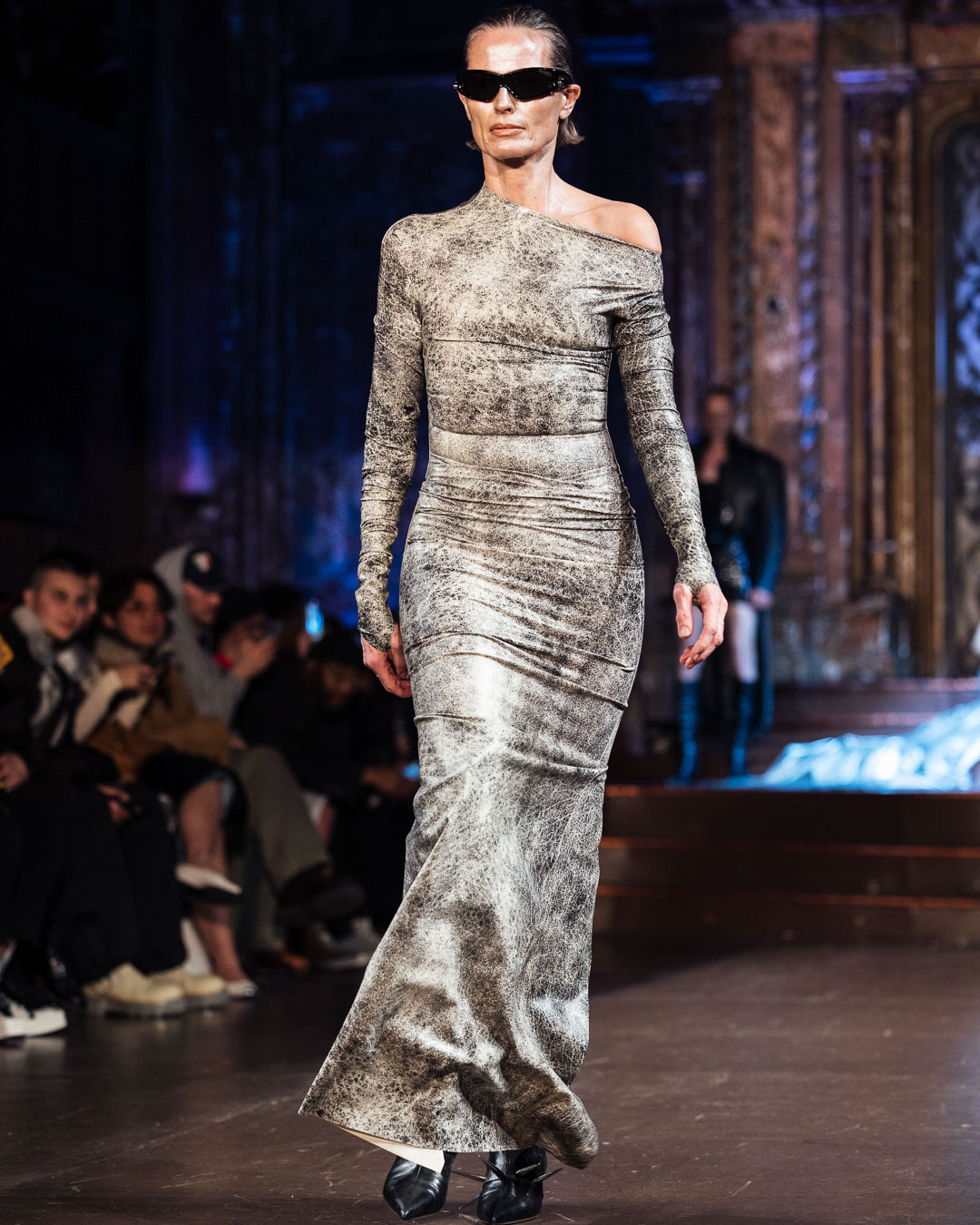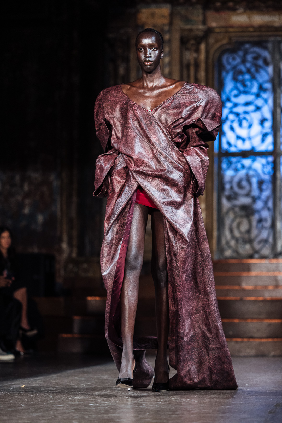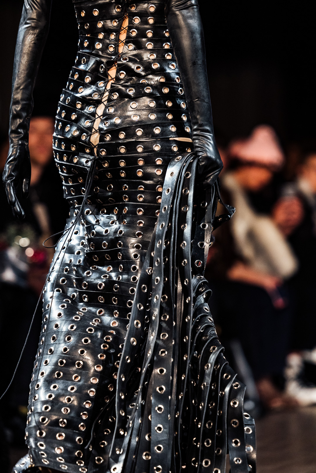 Le latex et le cuir sont présents tout au long de la collection avec des épaules pointues, de la corseterie et des traînes, avec de nombreux ourlets exagérés, dans une palette de couleurs de prune, d’argent métallique, de rouge sang et de noir profond. Le cuir gris dramatique et en détresse est imprimé sur du cuir végétal, en collaboration avec Kornit.