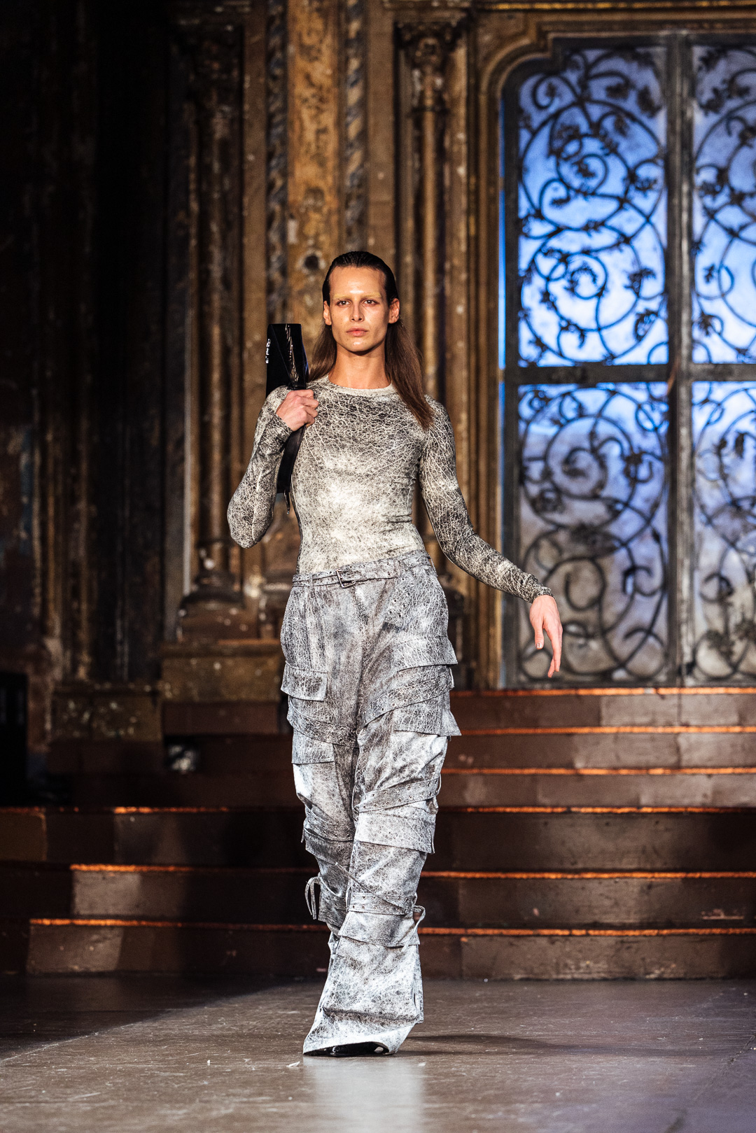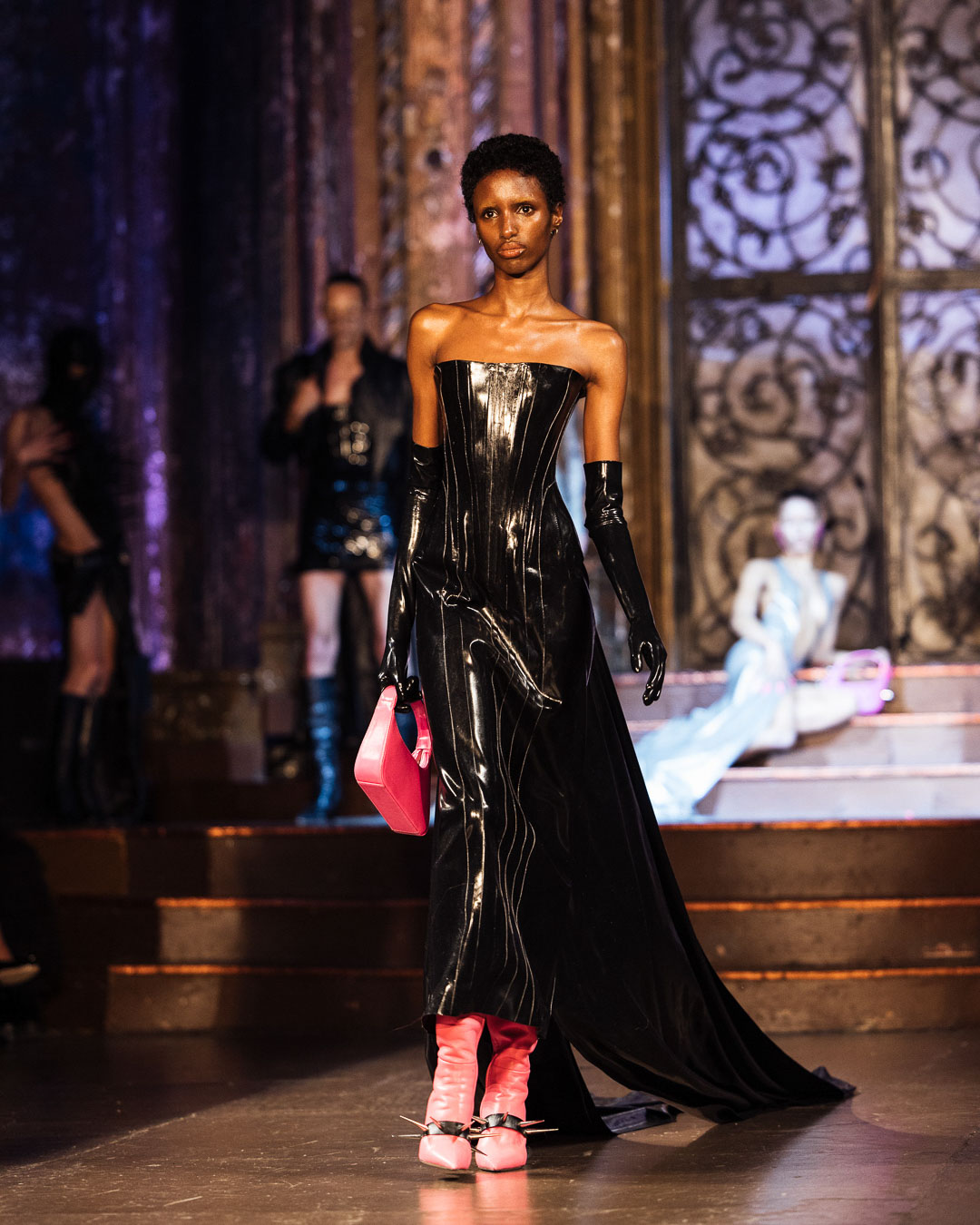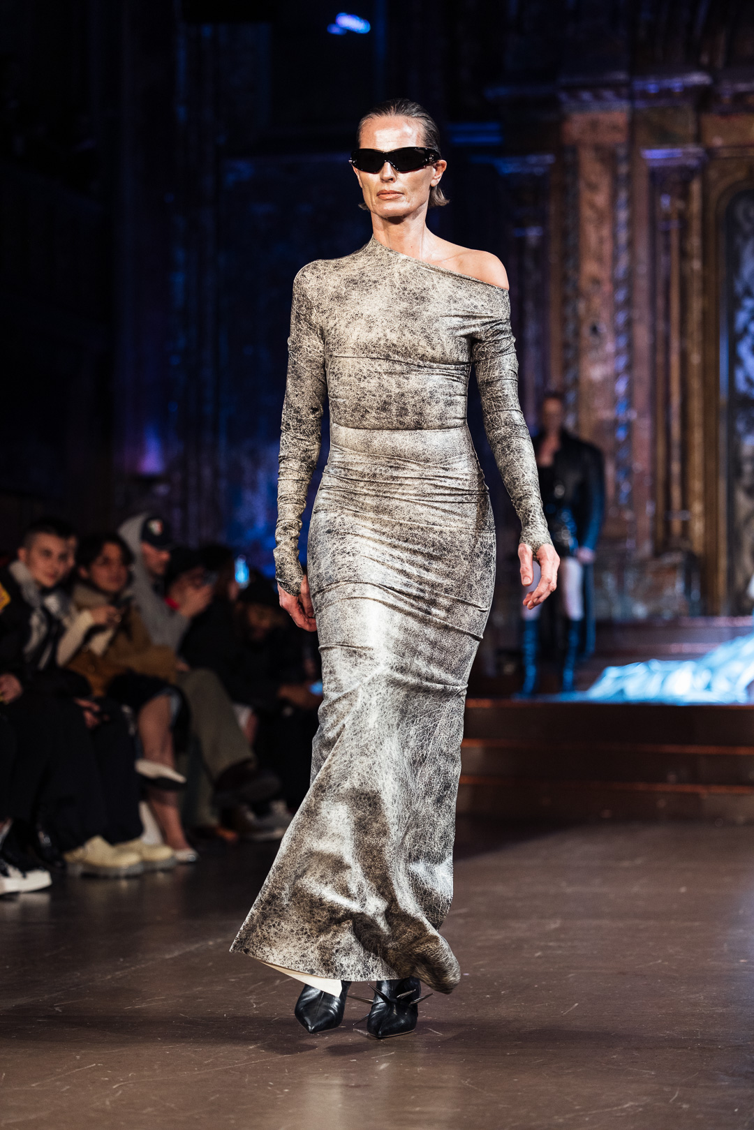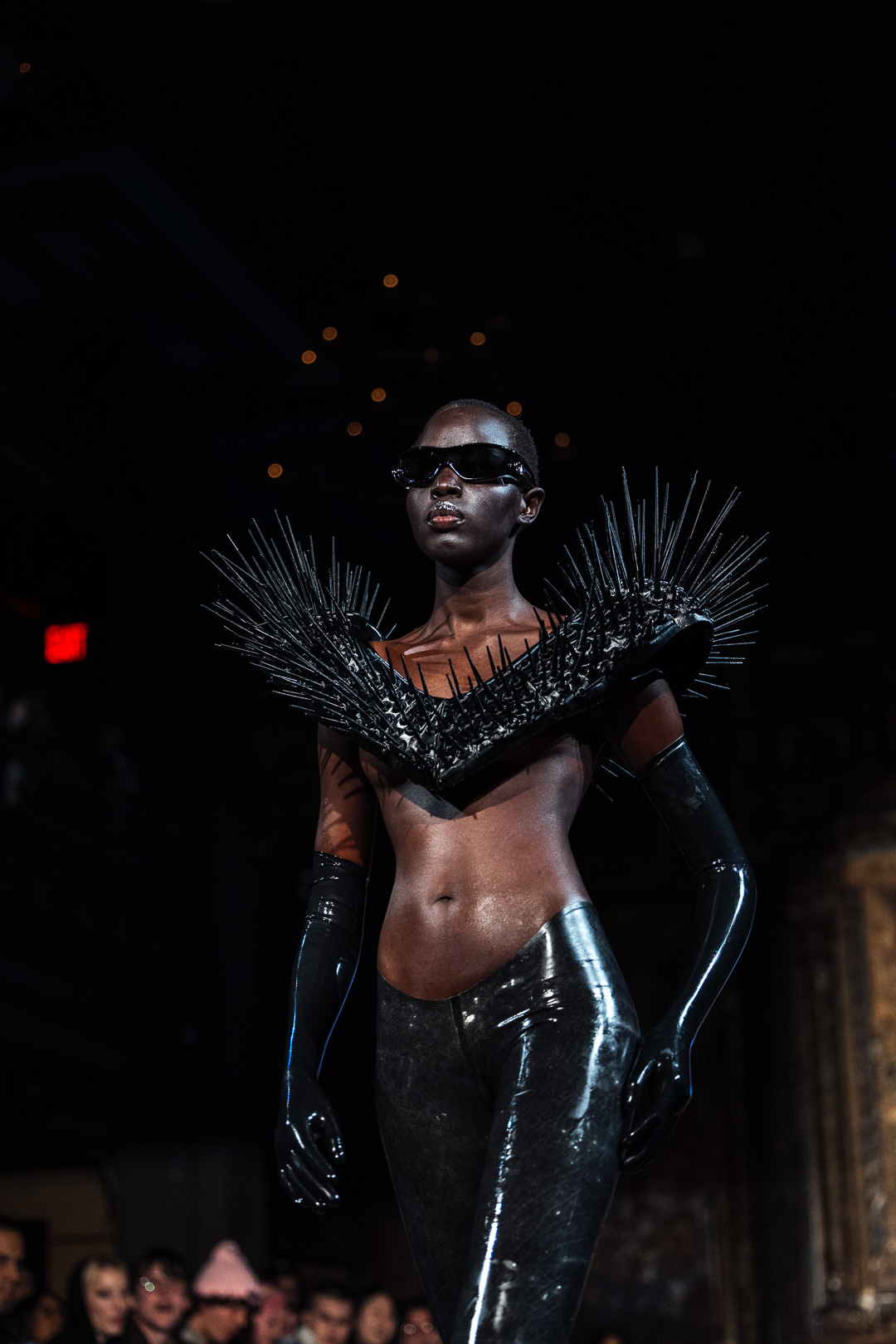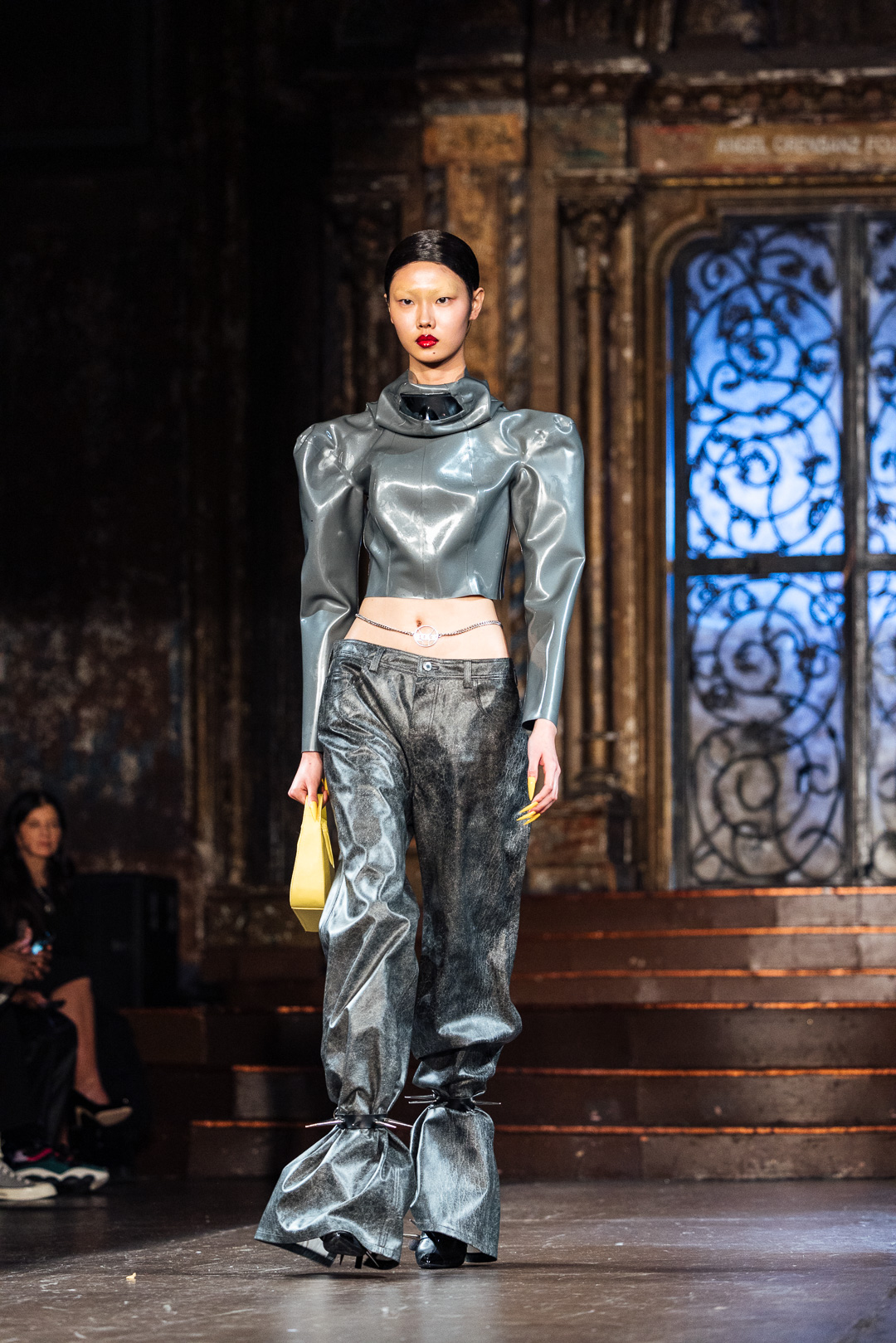Le latex et le cuir sont présents tout au long de la collection avec des épaules pointues, de la corseterie et des traînes, avec de nombreux ourlets exagérés, dans une palette de couleurs de prune, d’argent métallique, de rouge sang et de noir profond. Le cuir gris dramatique et en détresse est imprimé sur du cuir végétal, en collaboration avec Kornit.
