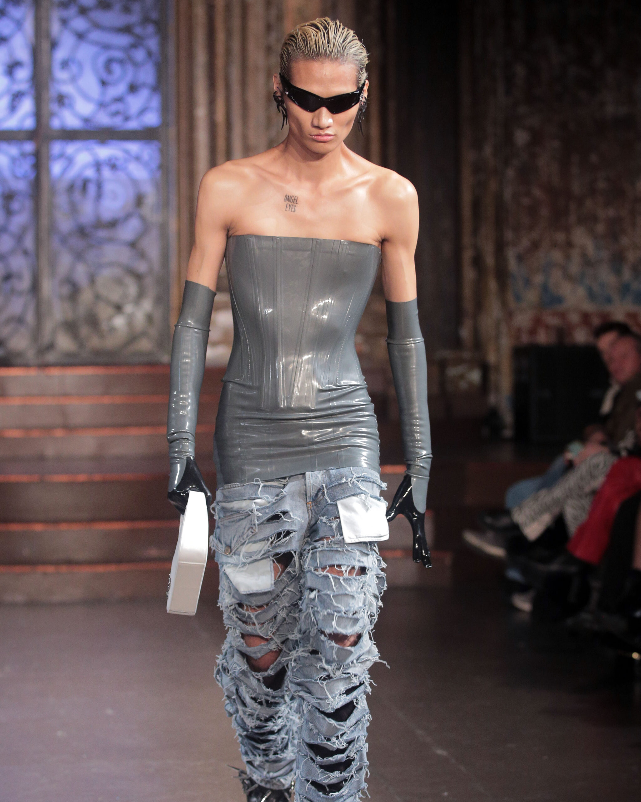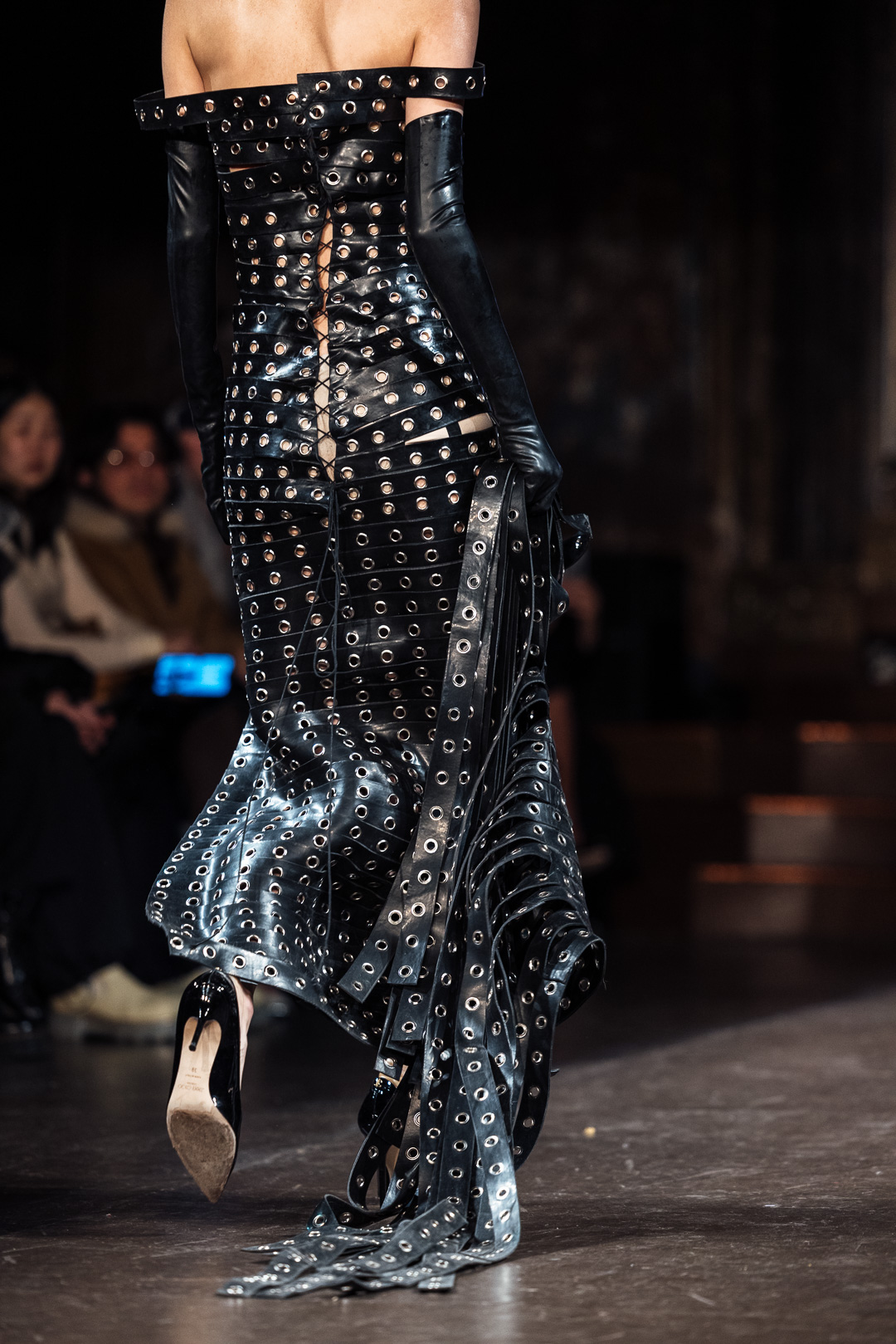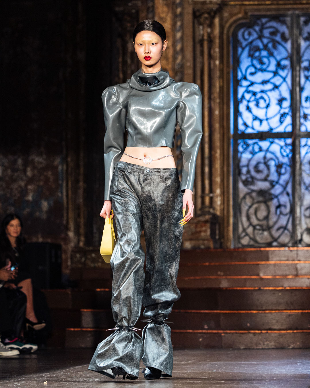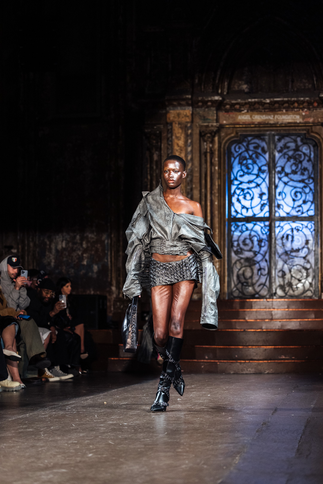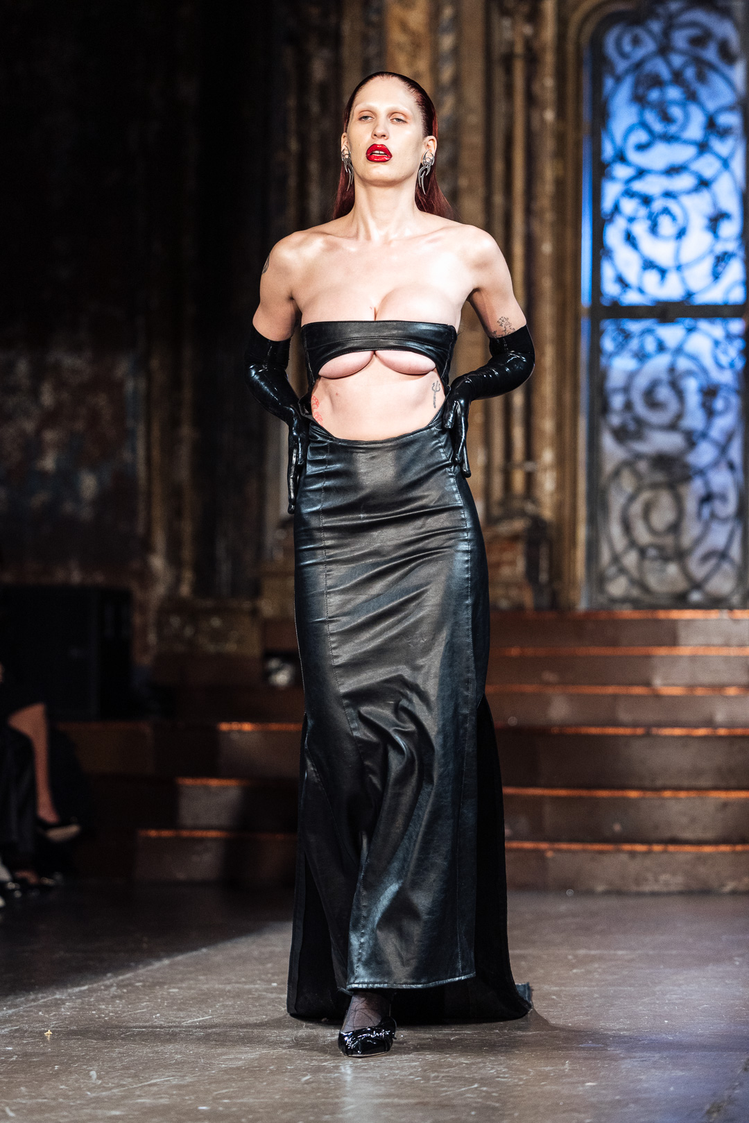 Le latex et le cuir sont présents tout au long de la collection avec des épaules pointues, de la corseterie et des traînes, avec de nombreux ourlets exagérés, dans une palette de couleurs de prune, d’argent métallique, de rouge sang et de noir profond. Le cuir gris dramatique et en détresse est imprimé sur du cuir végétal, en collaboration avec Kornit.