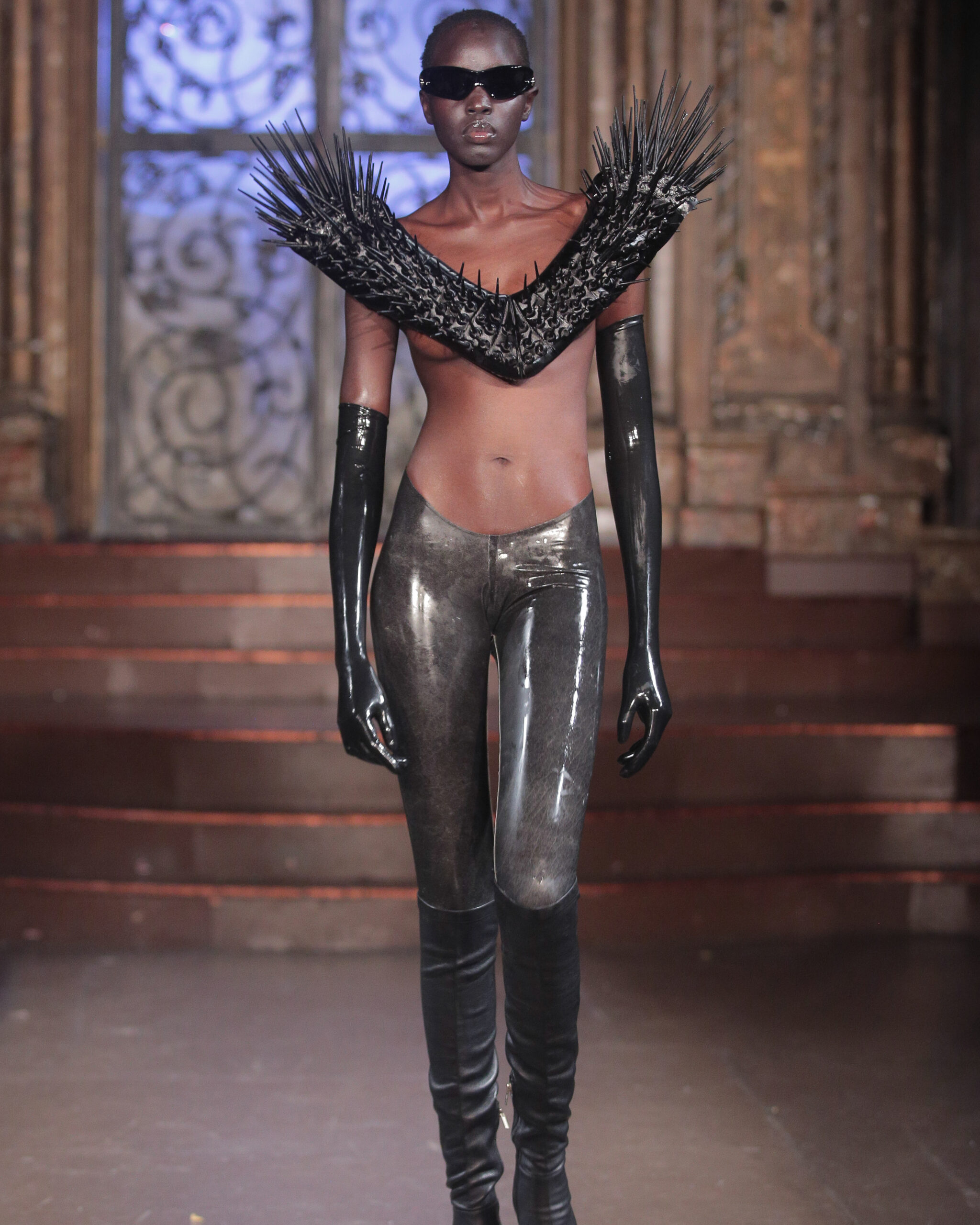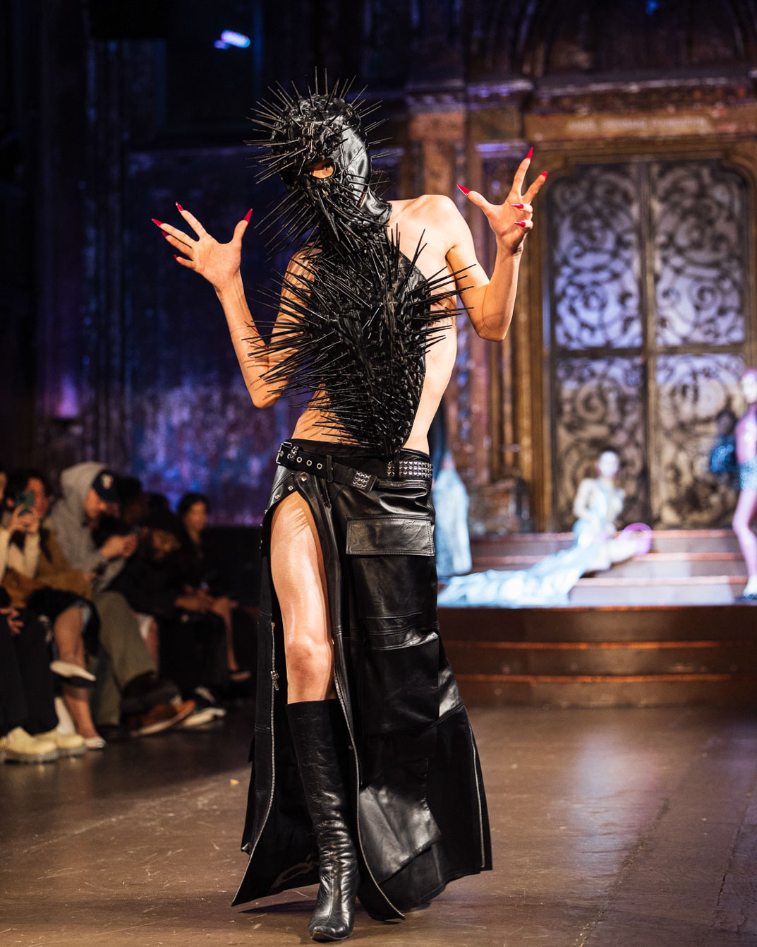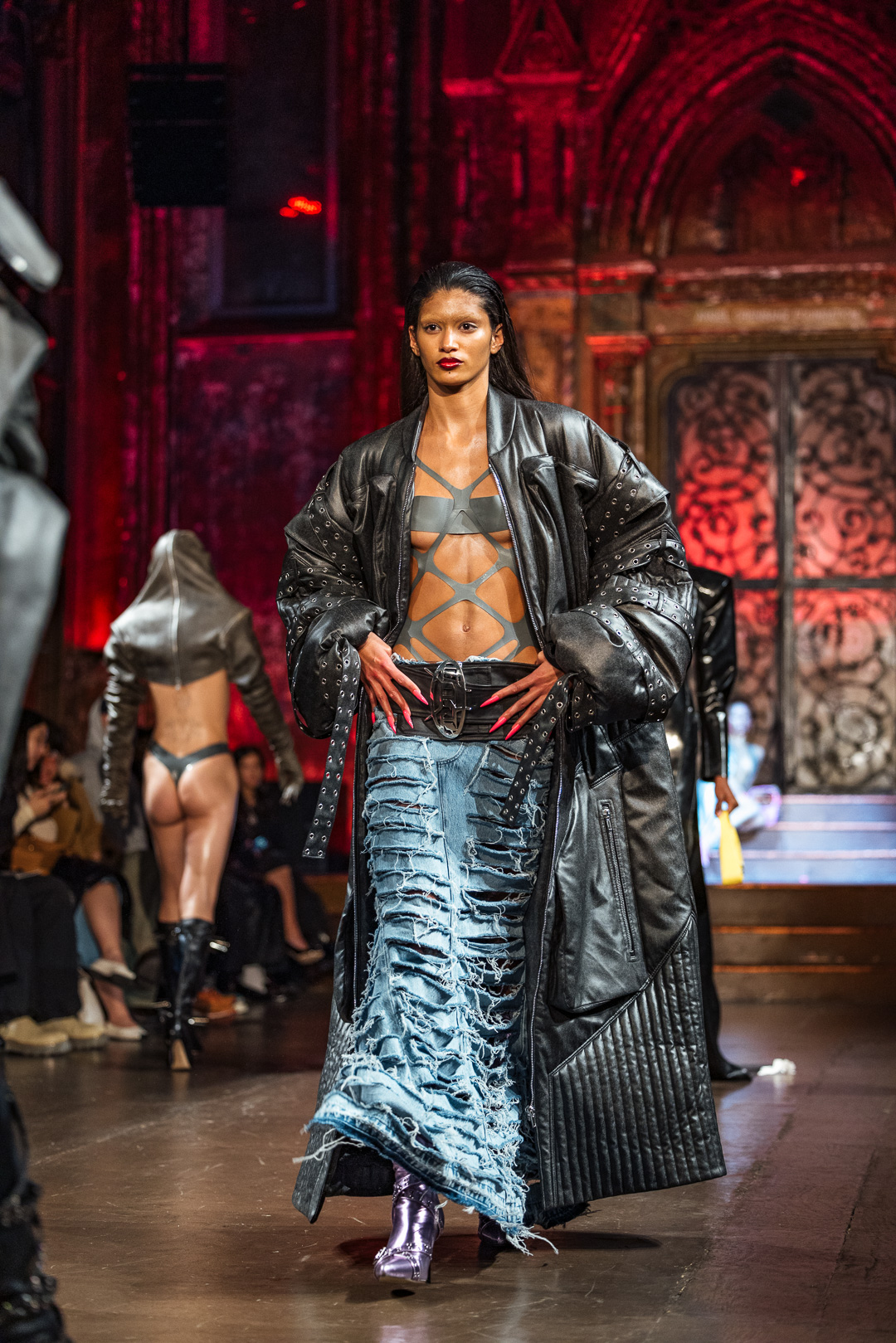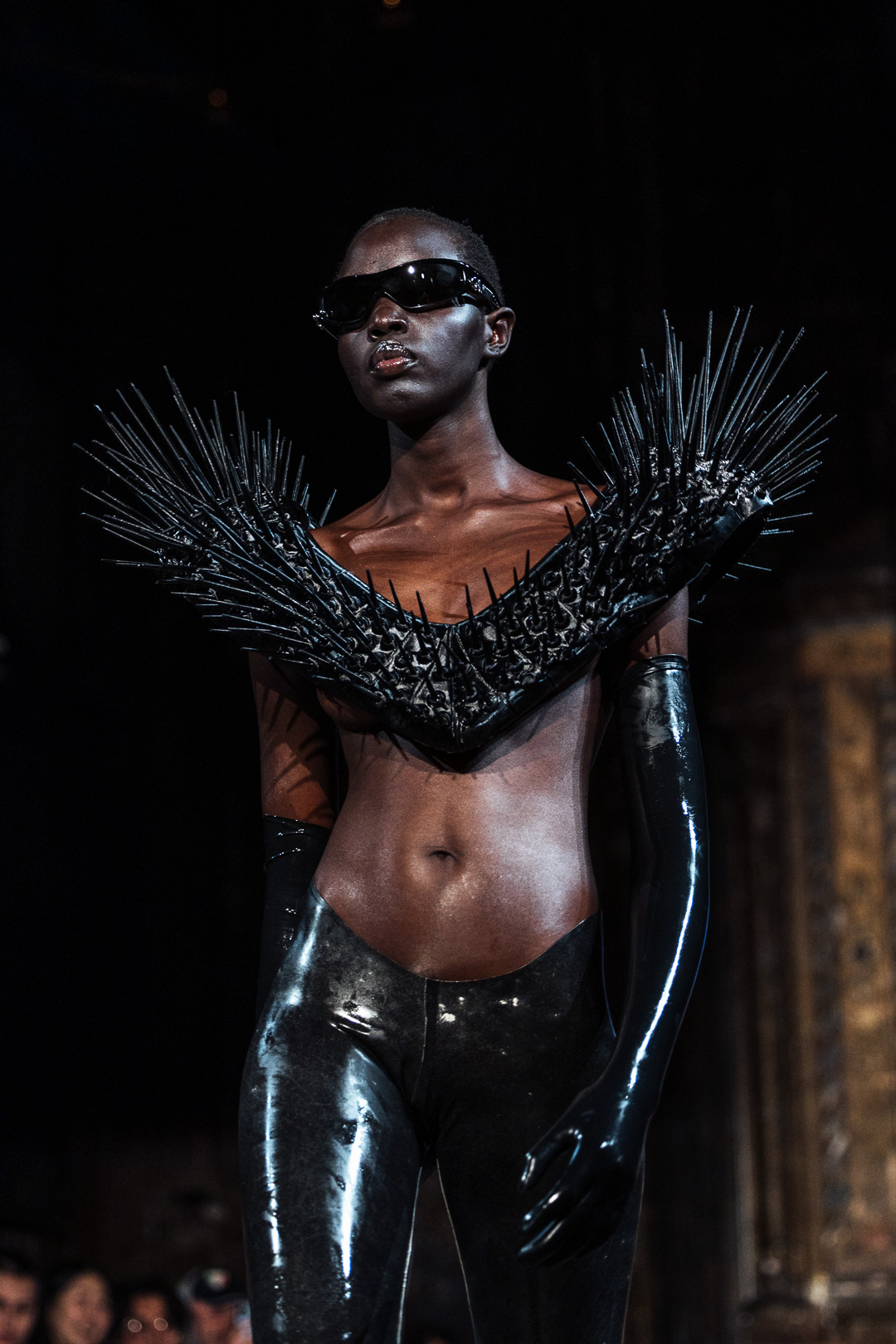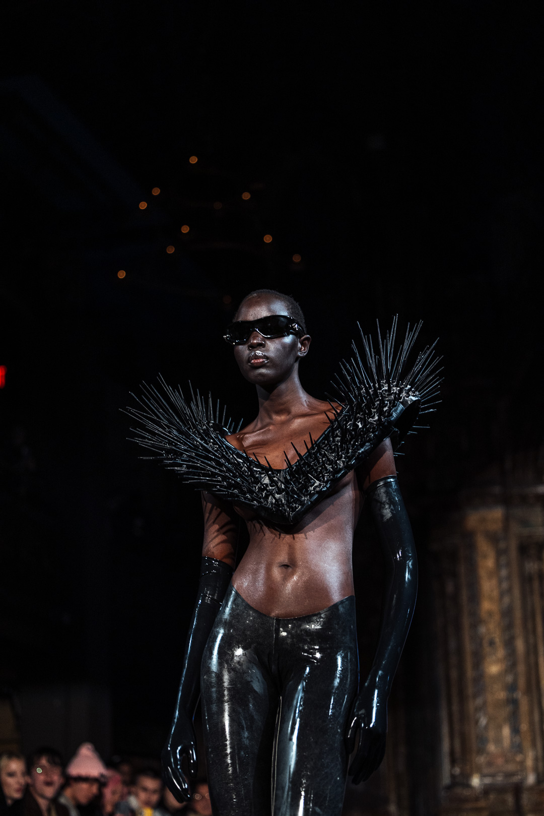 Le latex et le cuir sont présents tout au long de la collection avec des épaules pointues, de la corseterie et des traînes, avec de nombreux ourlets exagérés, dans une palette de couleurs de prune, d’argent métallique, de rouge sang et de noir profond. Le cuir gris dramatique et en détresse est imprimé sur du cuir végétal, en collaboration avec Kornit.