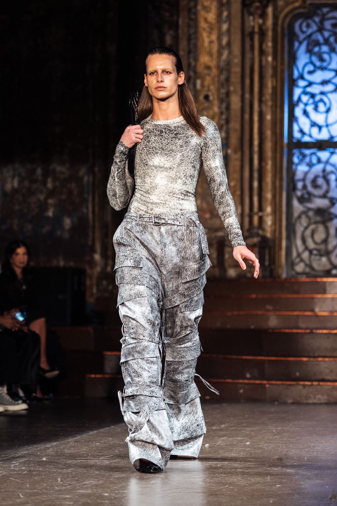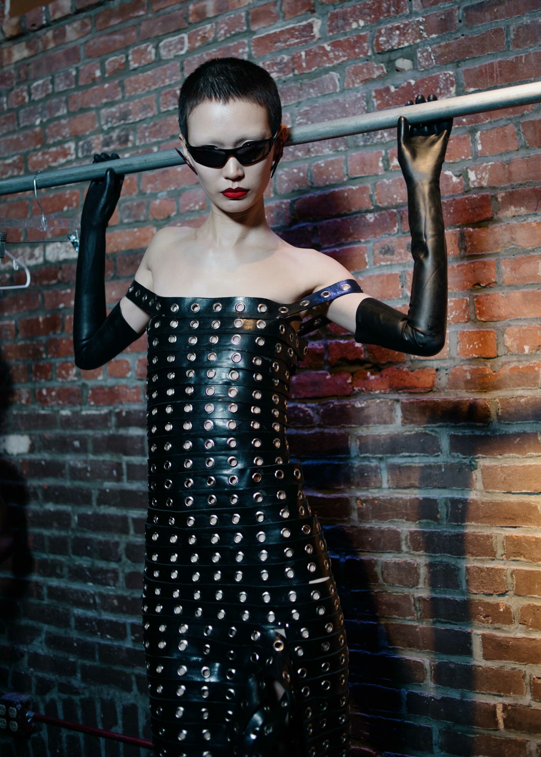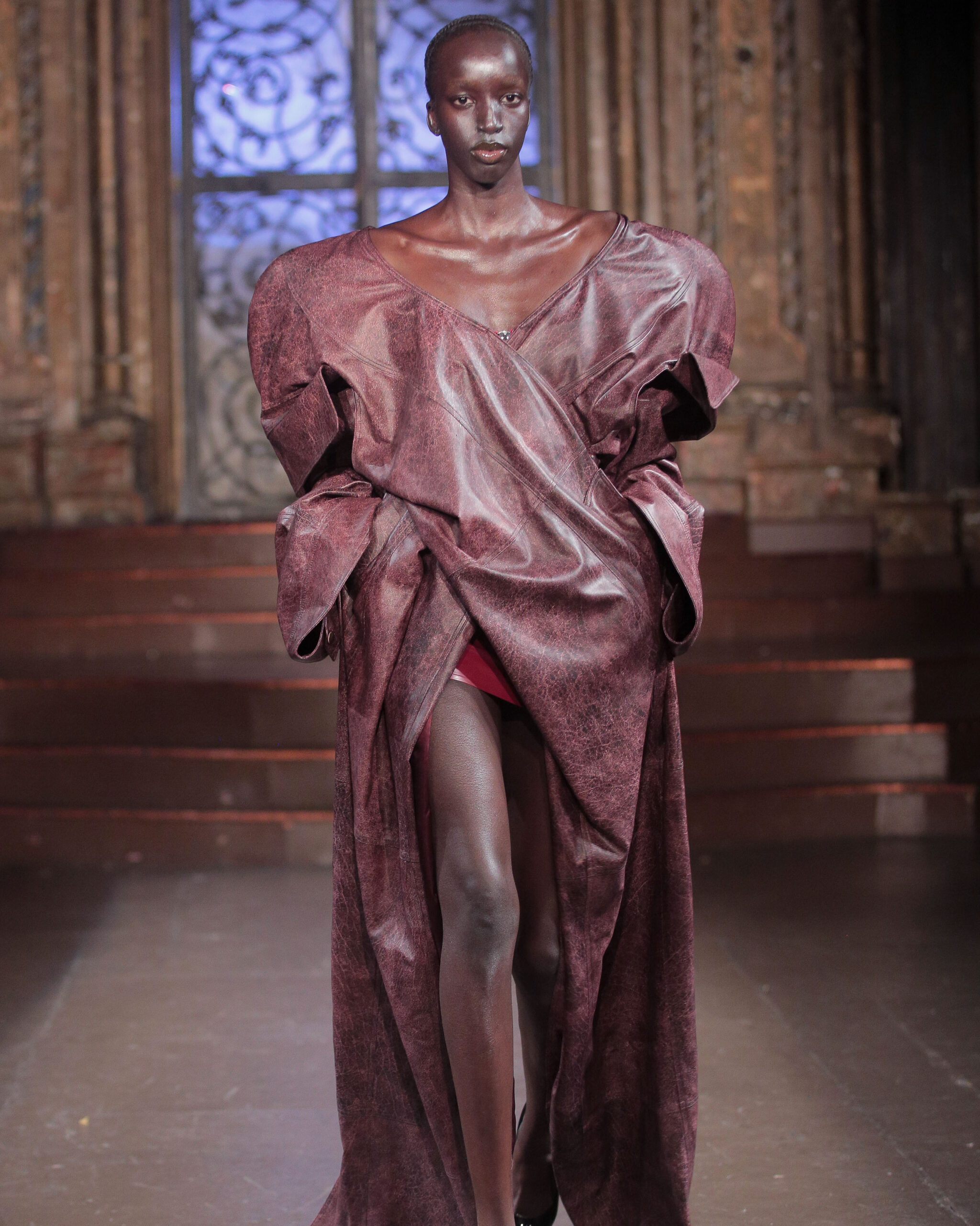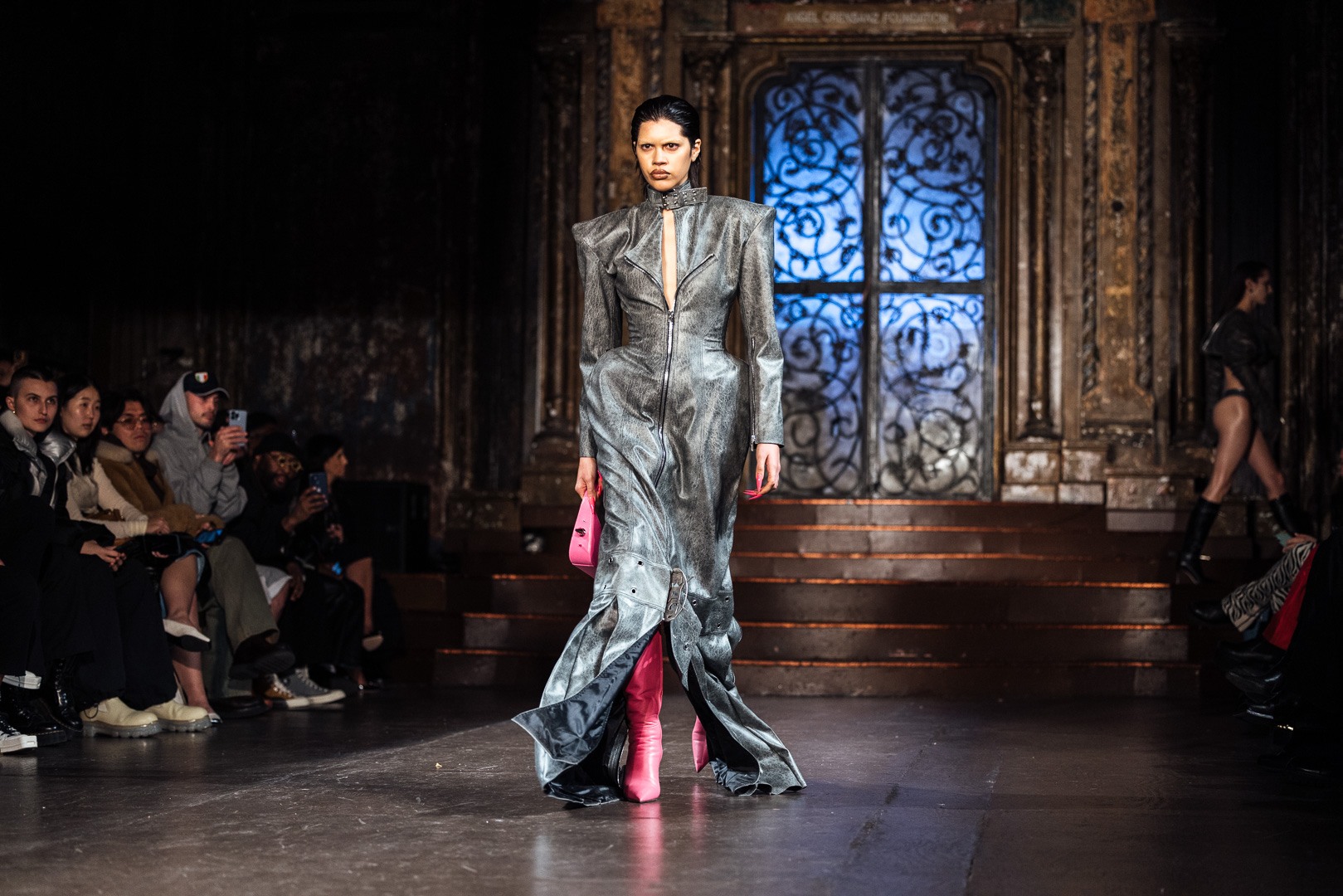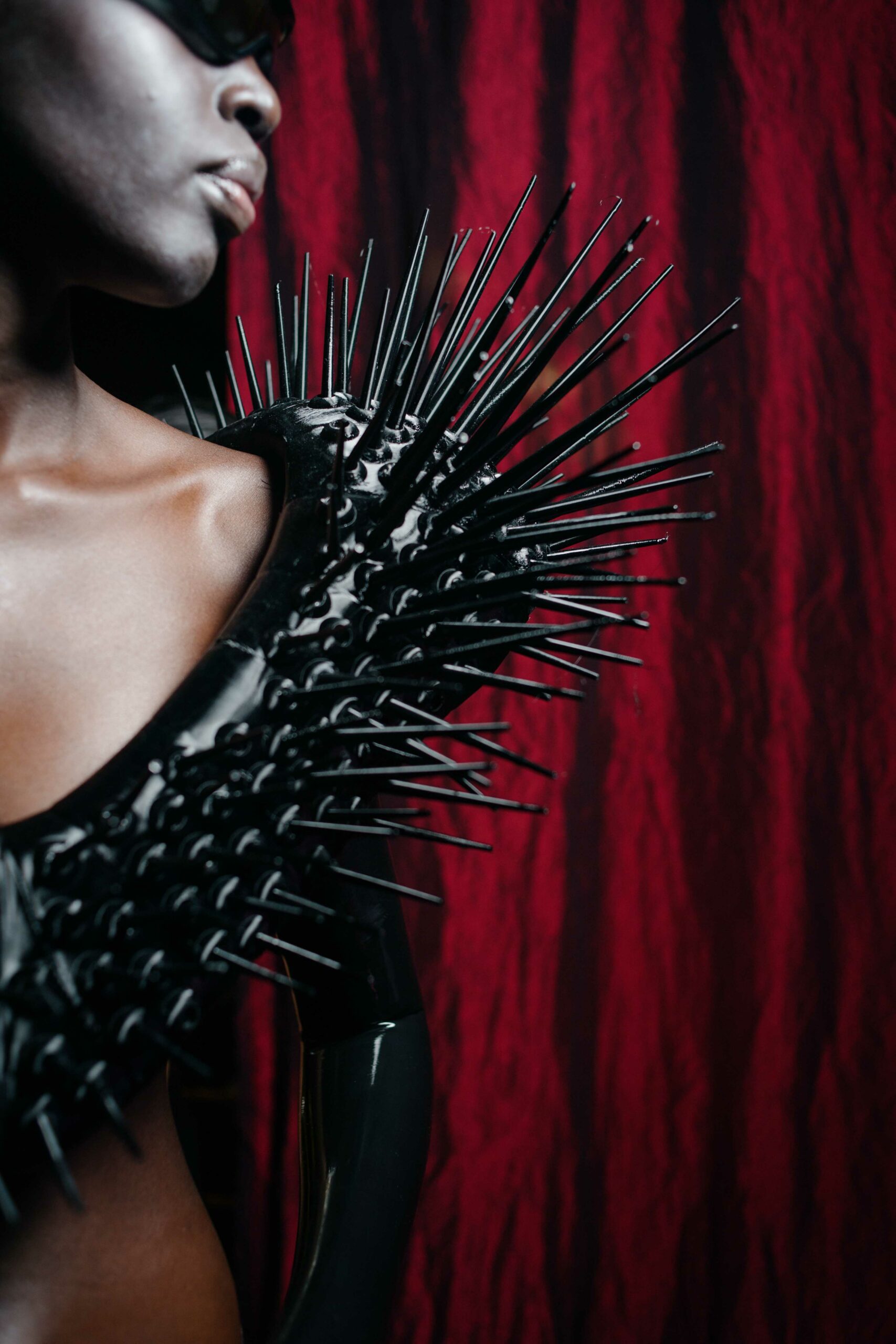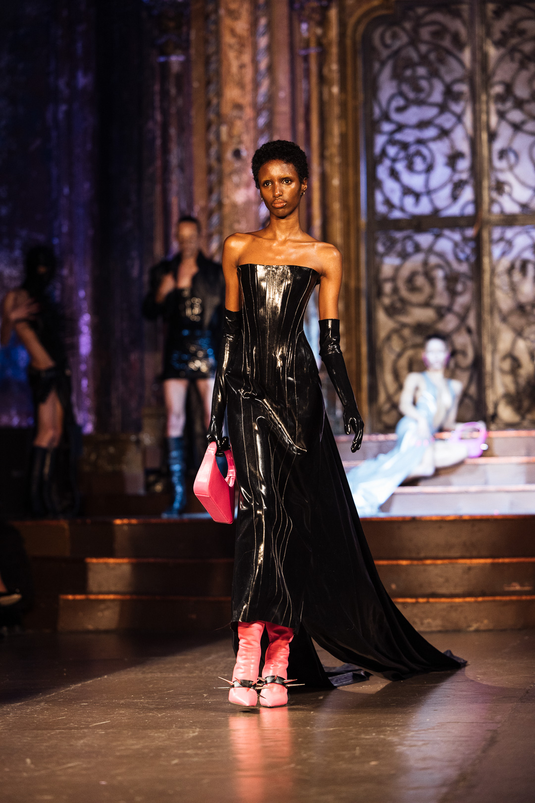 Le latex et le cuir sont présents tout au long de la collection avec des épaules pointues, de la corseterie et des traînes, avec de nombreux ourlets exagérés, dans une palette de couleurs de prune, d’argent métallique, de rouge sang et de noir profond. Le cuir gris dramatique et en détresse est imprimé sur du cuir végétal, en collaboration avec Kornit.