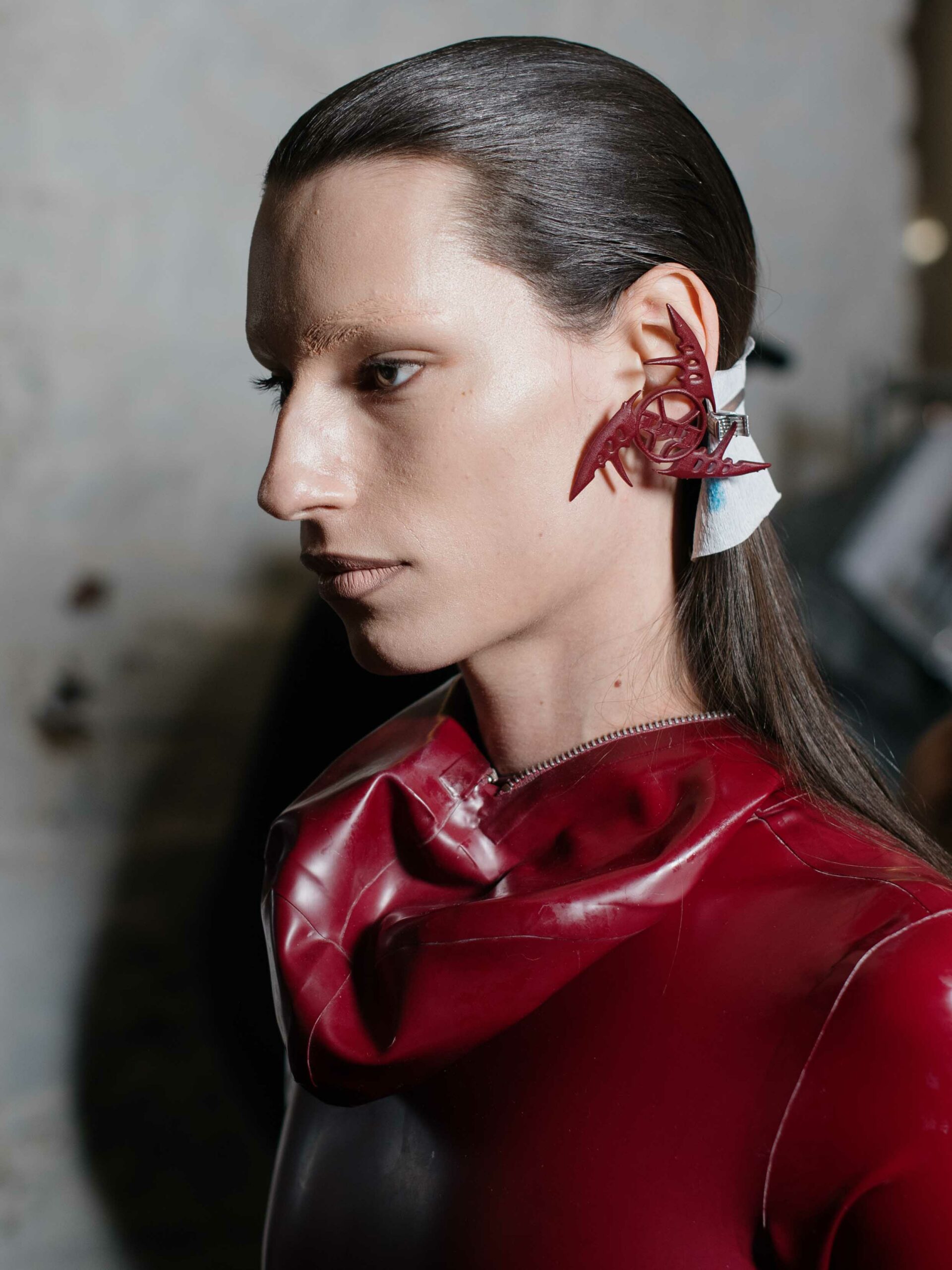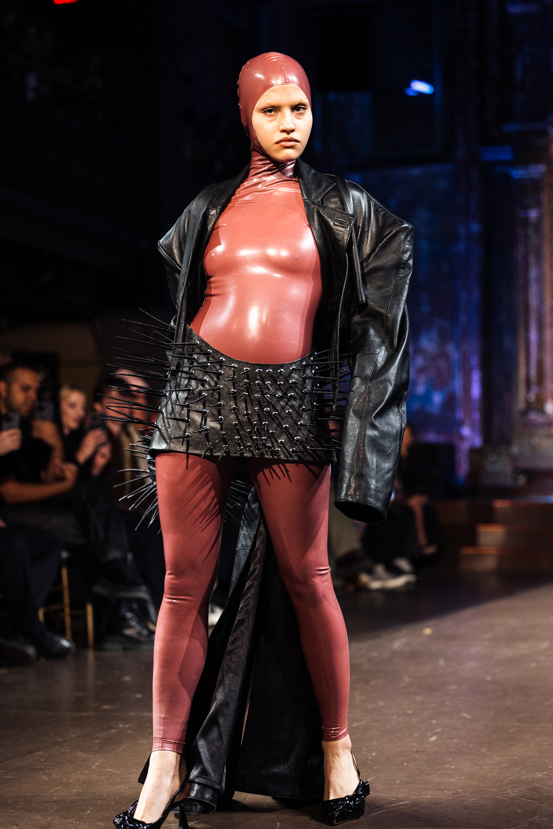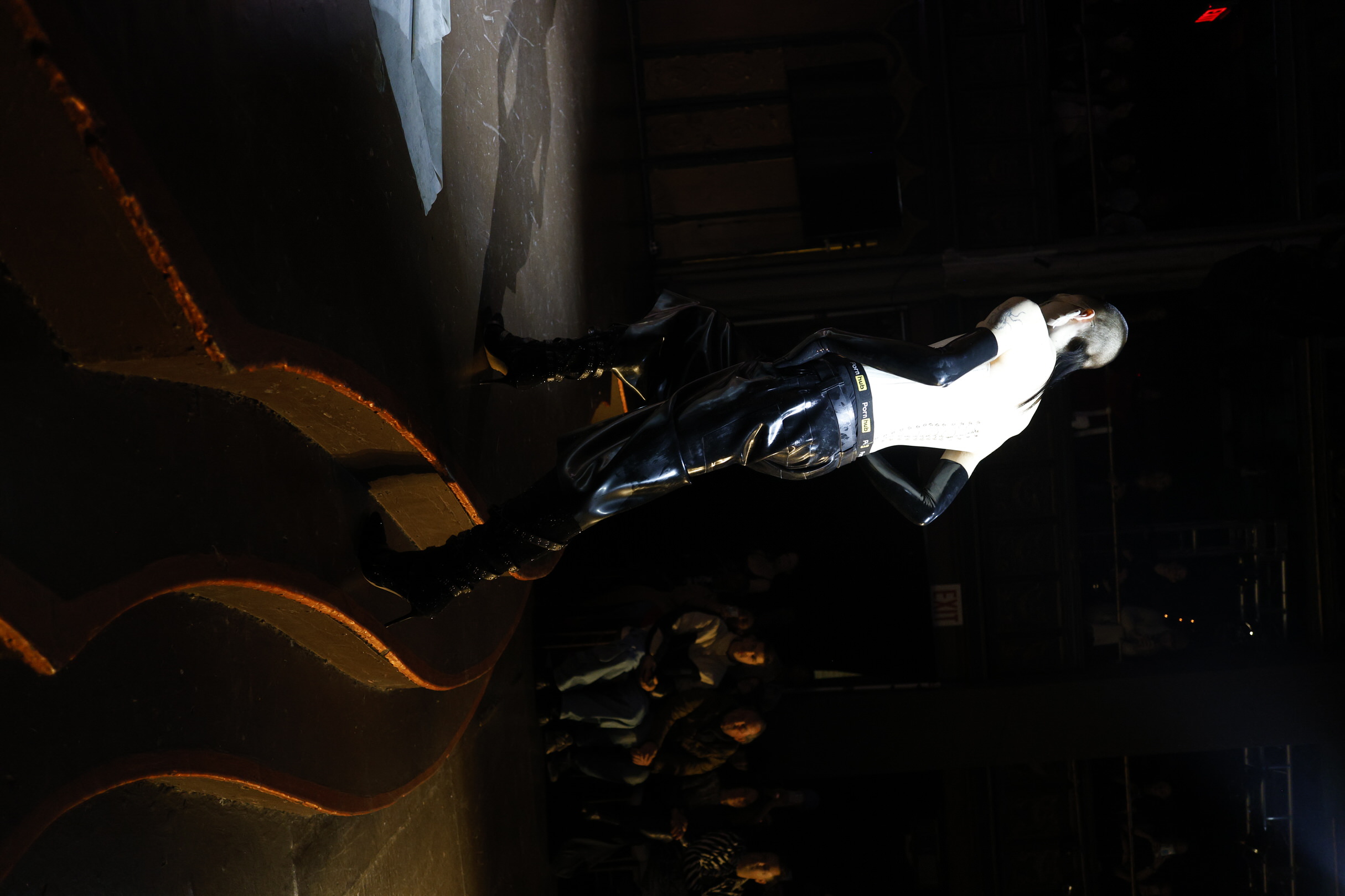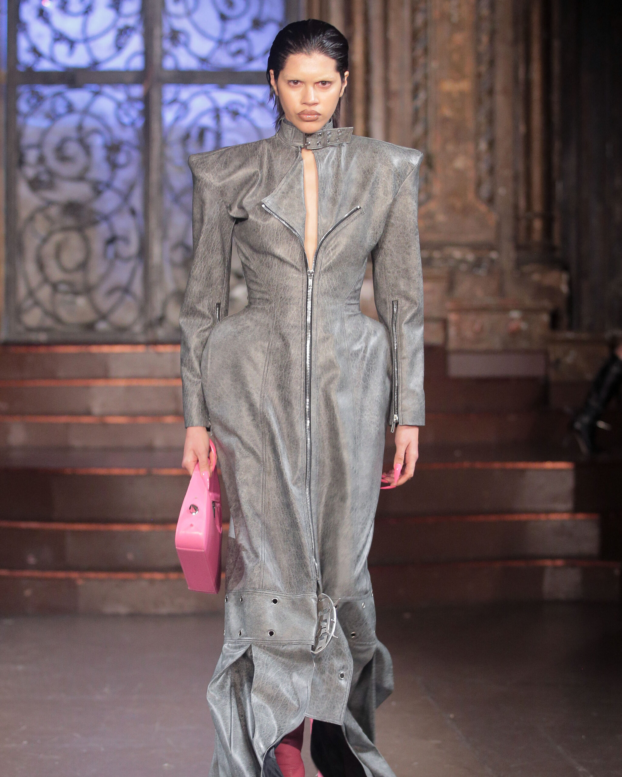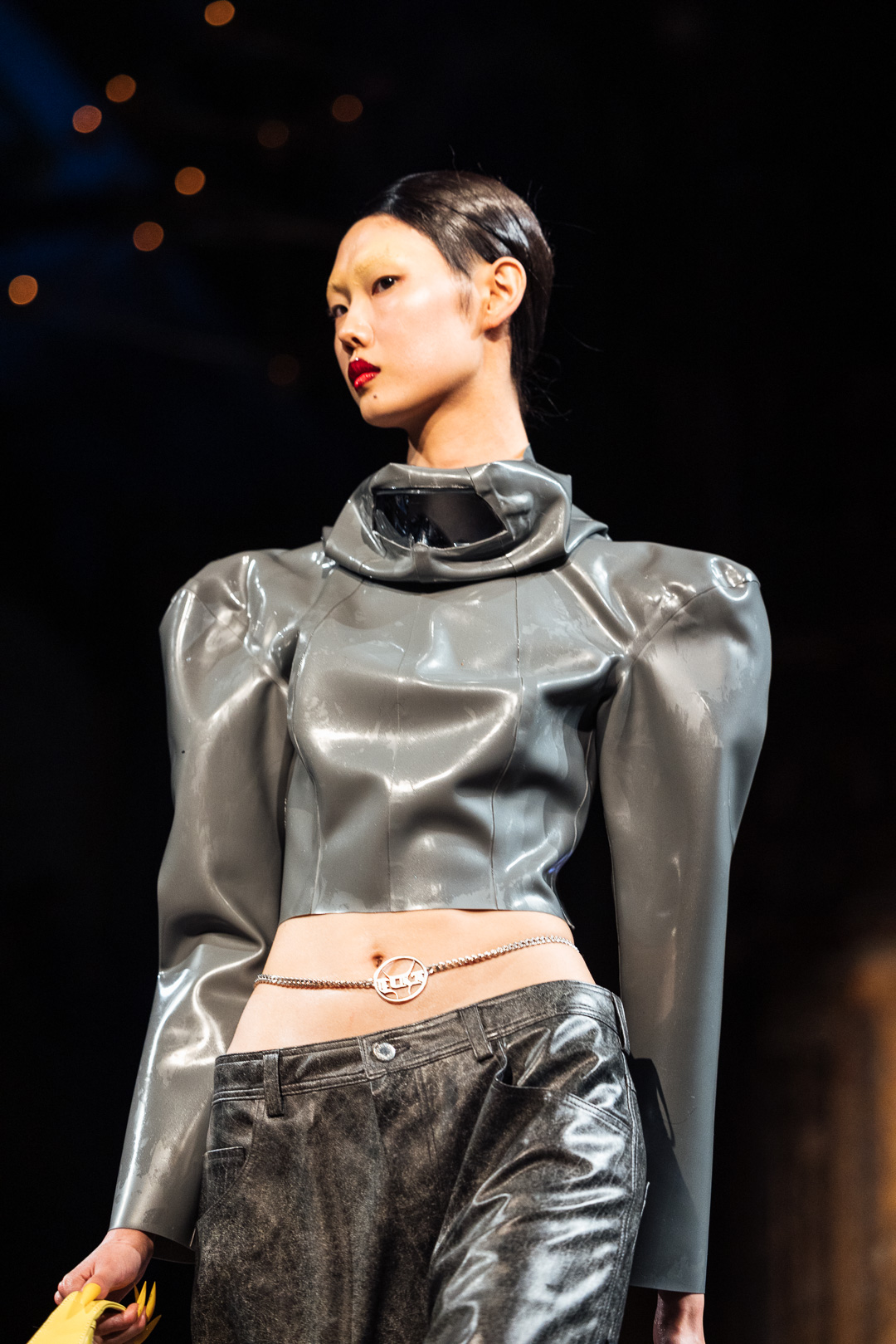 Le latex et le cuir sont présents tout au long de la collection avec des épaules pointues, de la corseterie et des traînes, avec de nombreux ourlets exagérés, dans une palette de couleurs de prune, d’argent métallique, de rouge sang et de noir profond. Le cuir gris dramatique et en détresse est imprimé sur du cuir végétal, en collaboration avec Kornit.