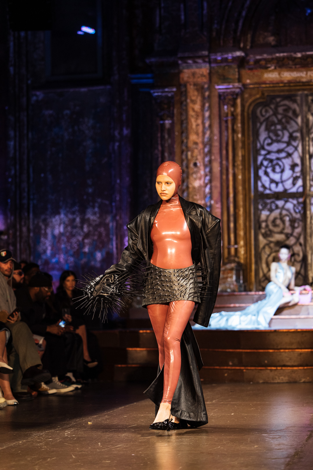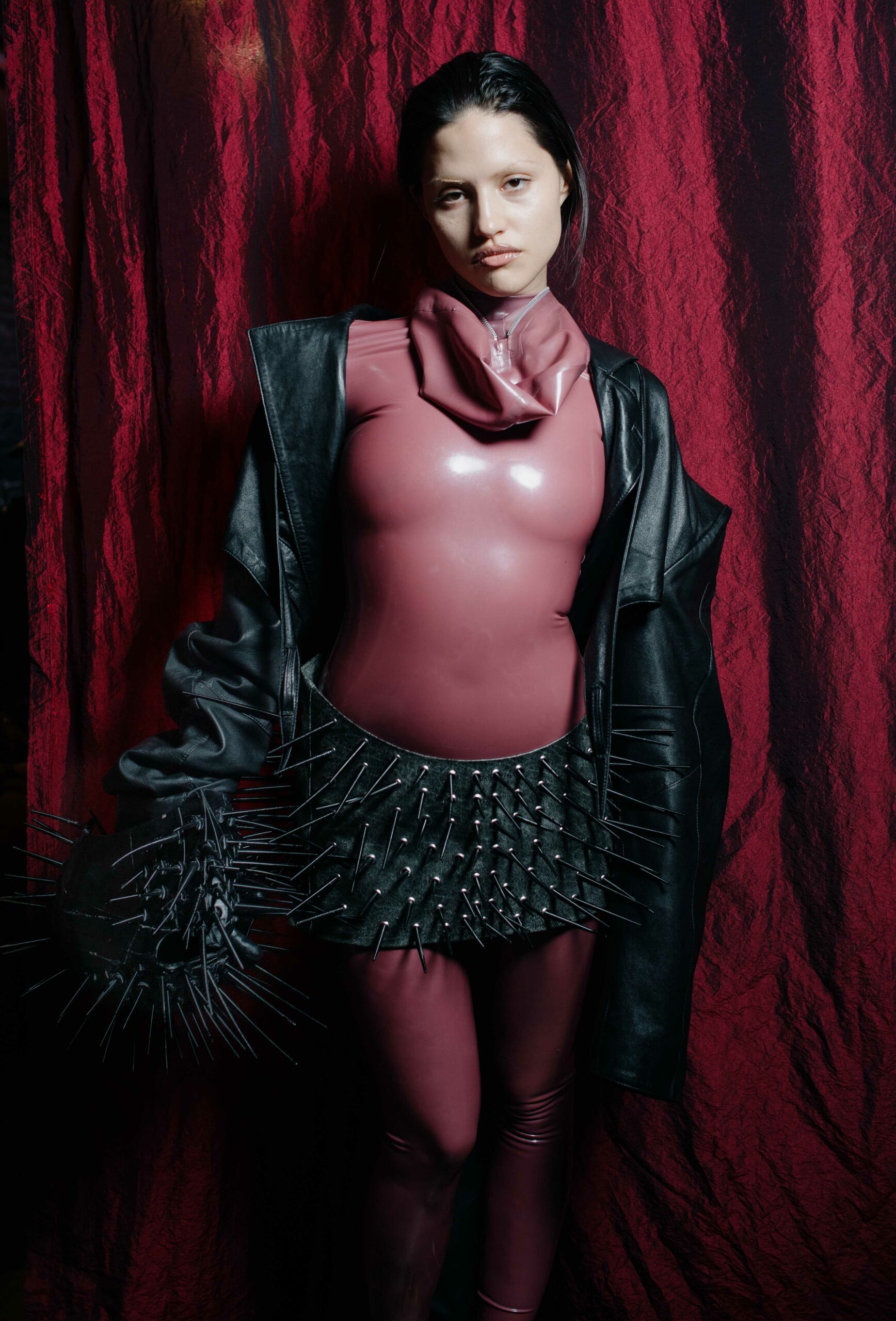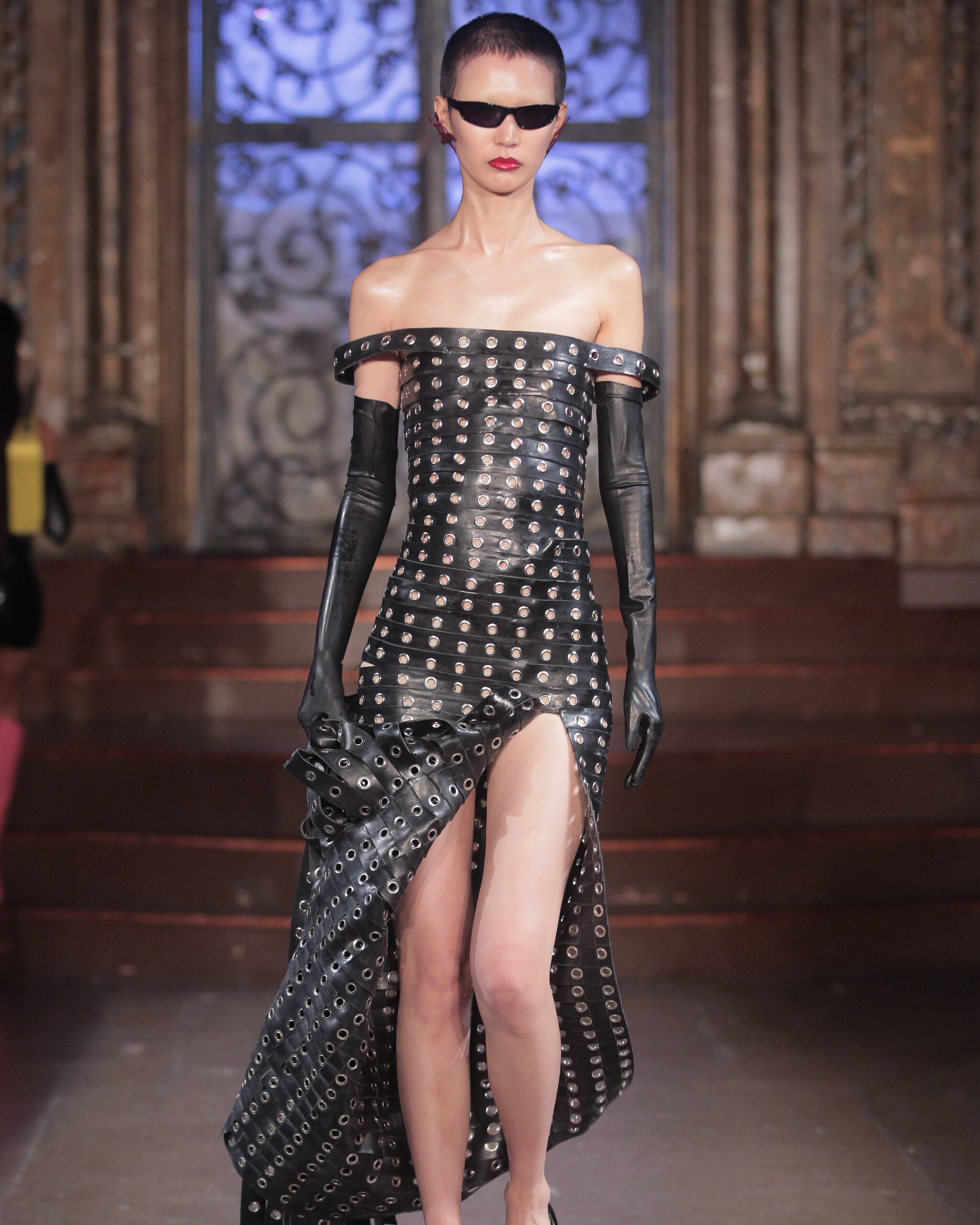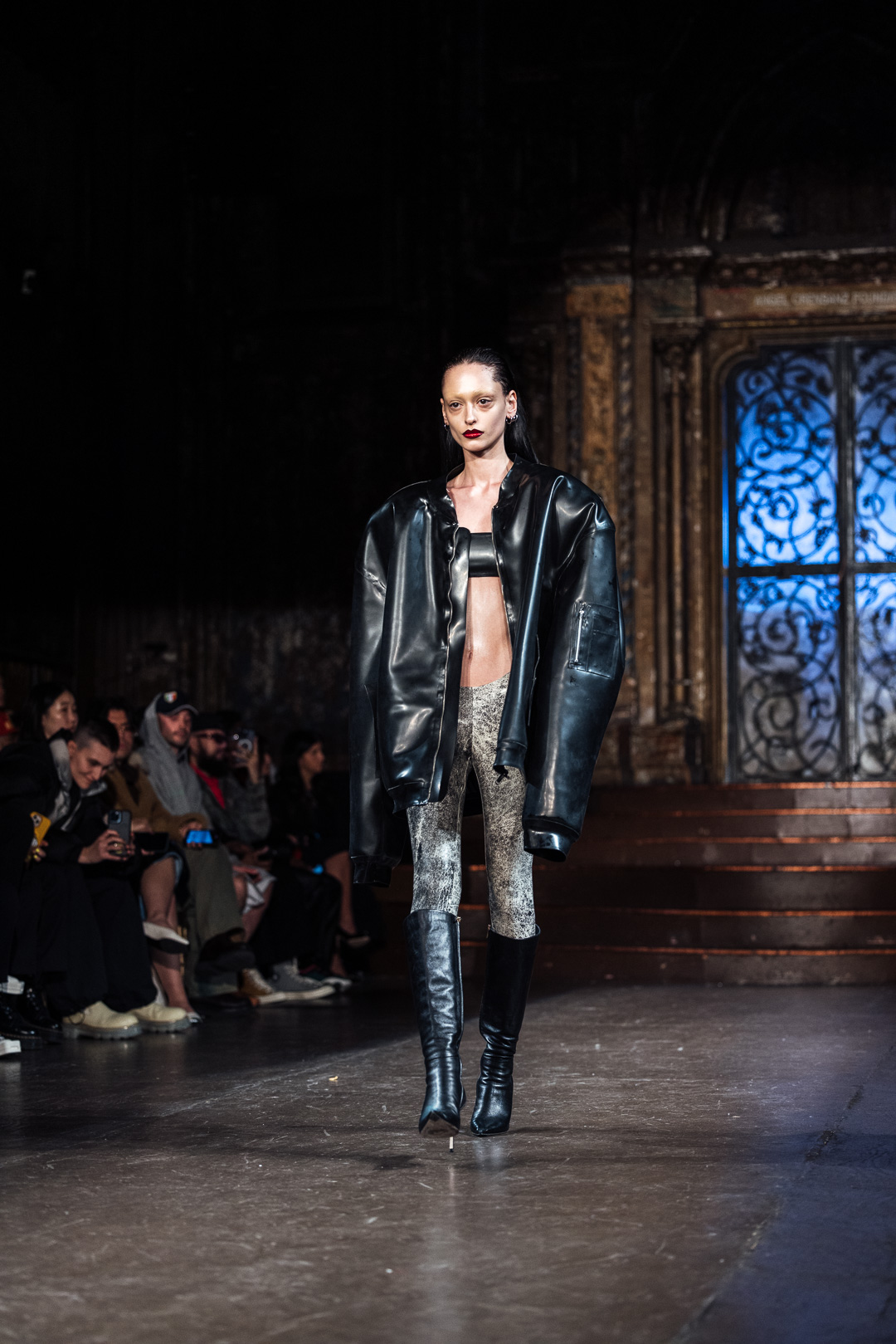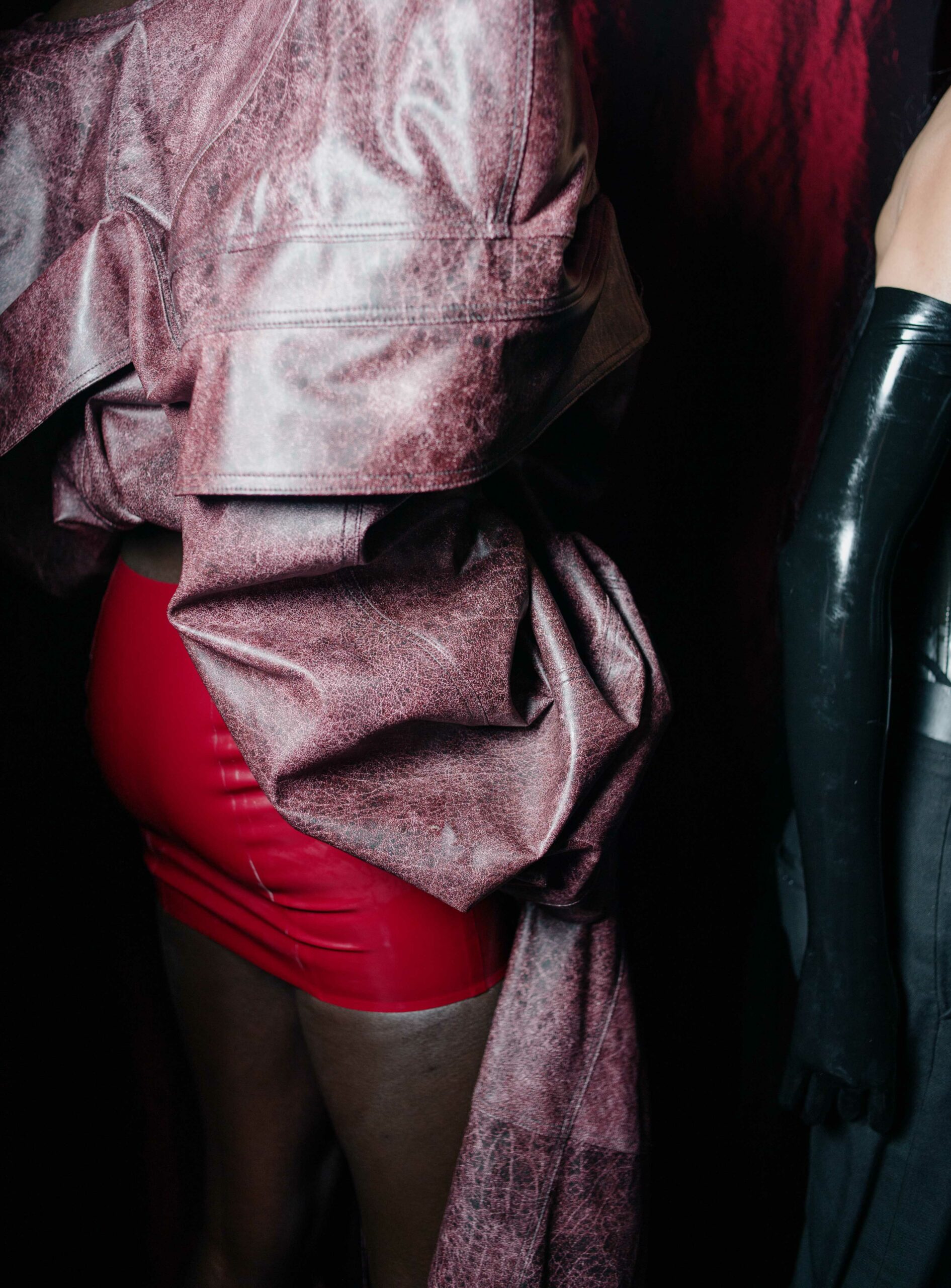 Le latex et le cuir sont présents tout au long de la collection avec des épaules pointues, de la corseterie et des traînes, avec de nombreux ourlets exagérés, dans une palette de couleurs de prune, d’argent métallique, de rouge sang et de noir profond. Le cuir gris dramatique et en détresse est imprimé sur du cuir végétal, en collaboration avec Kornit.