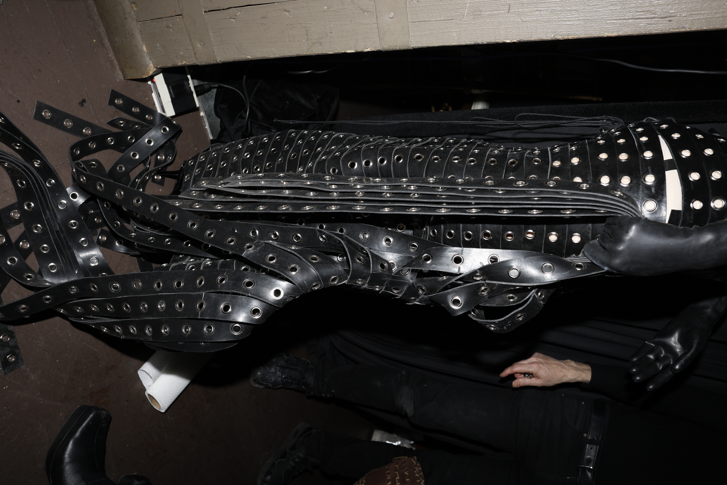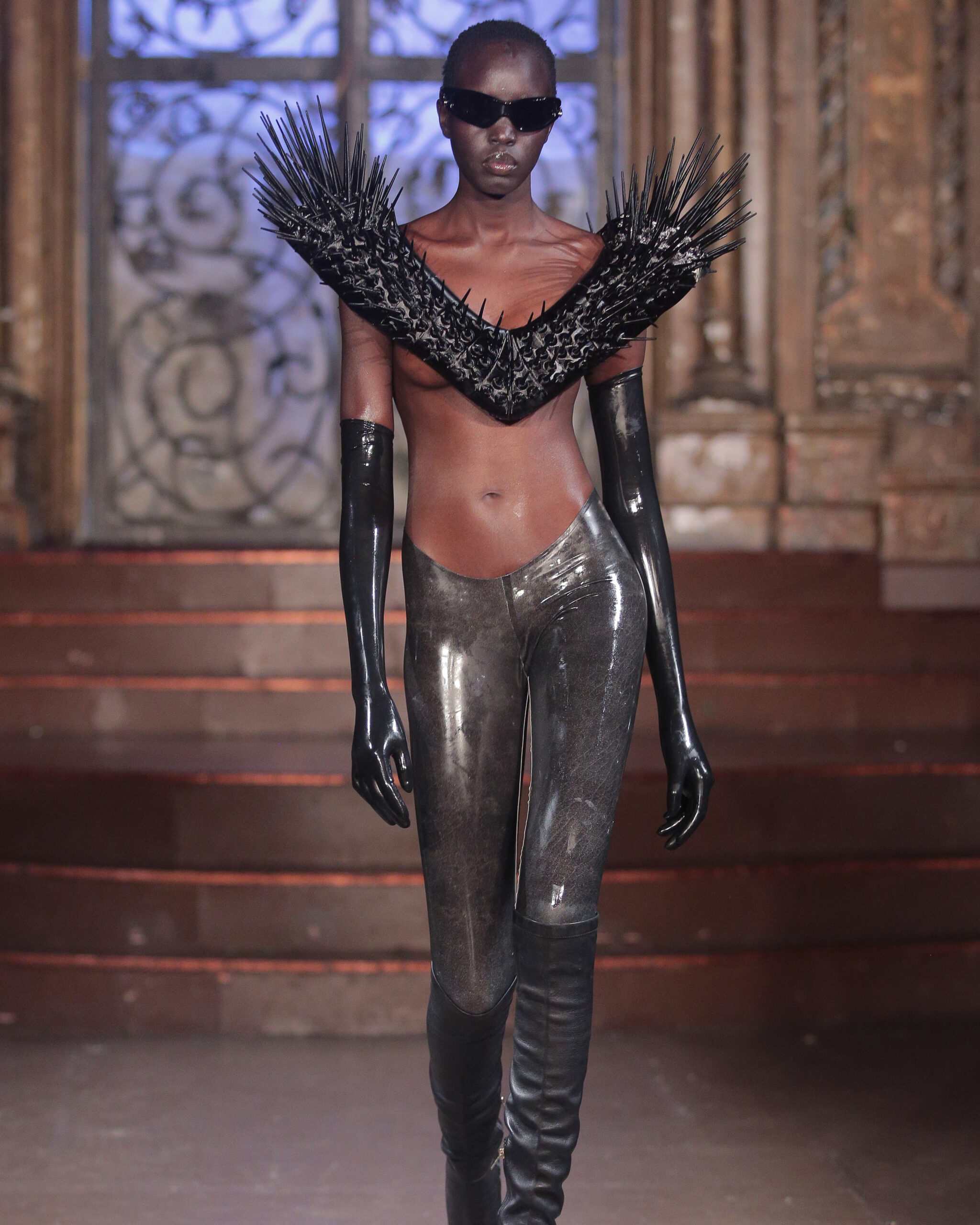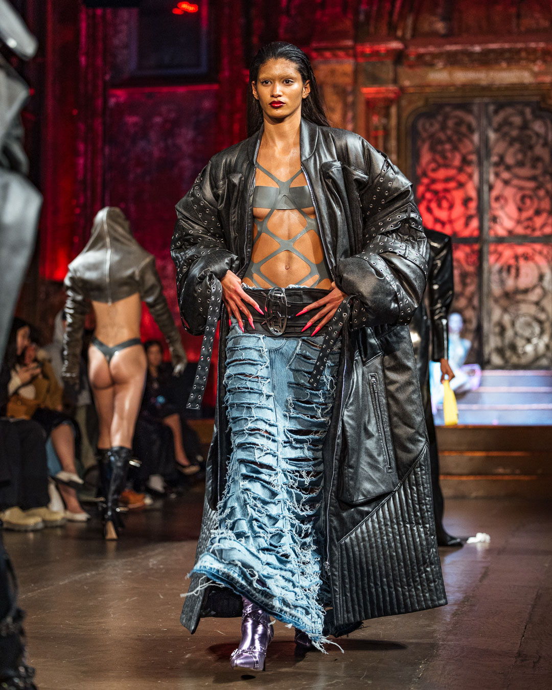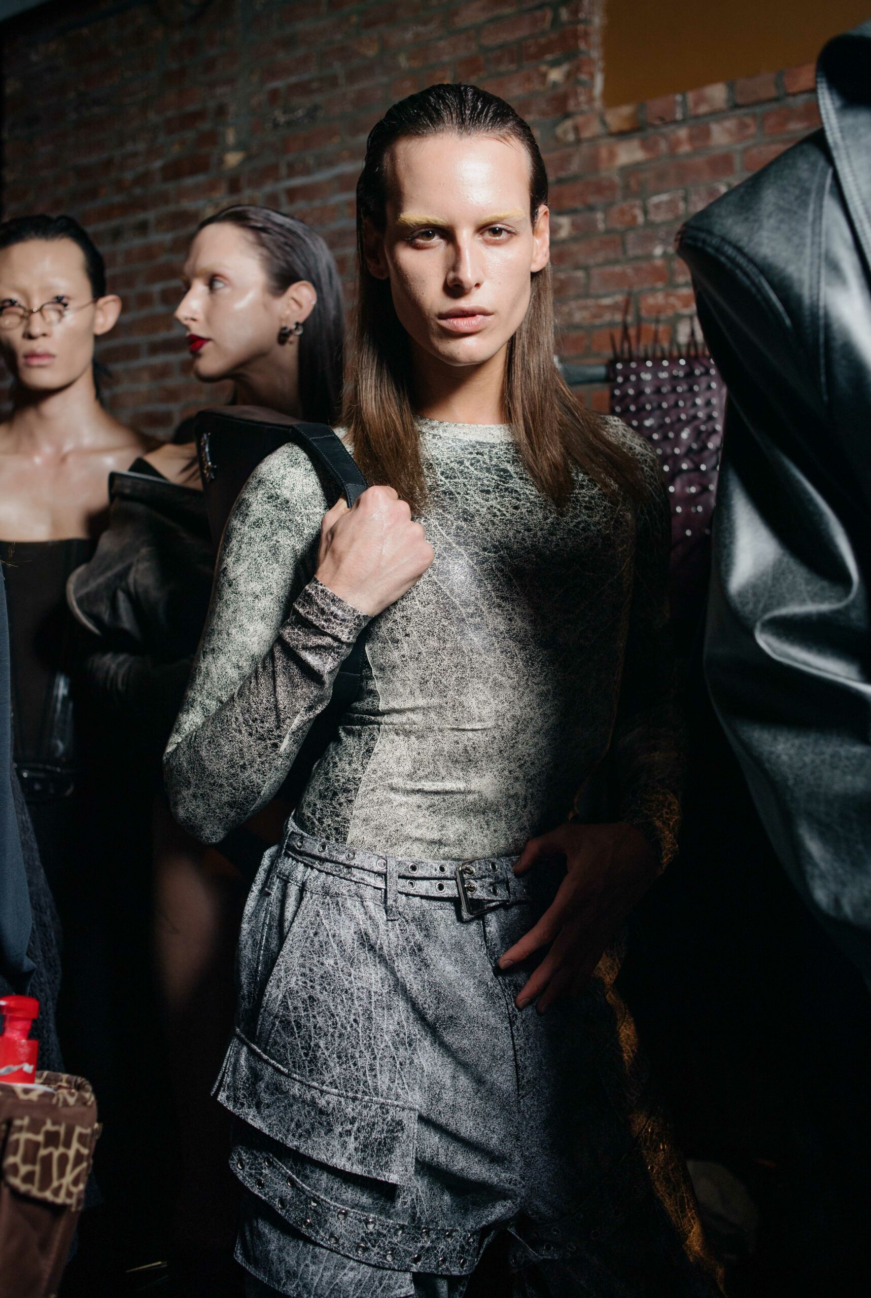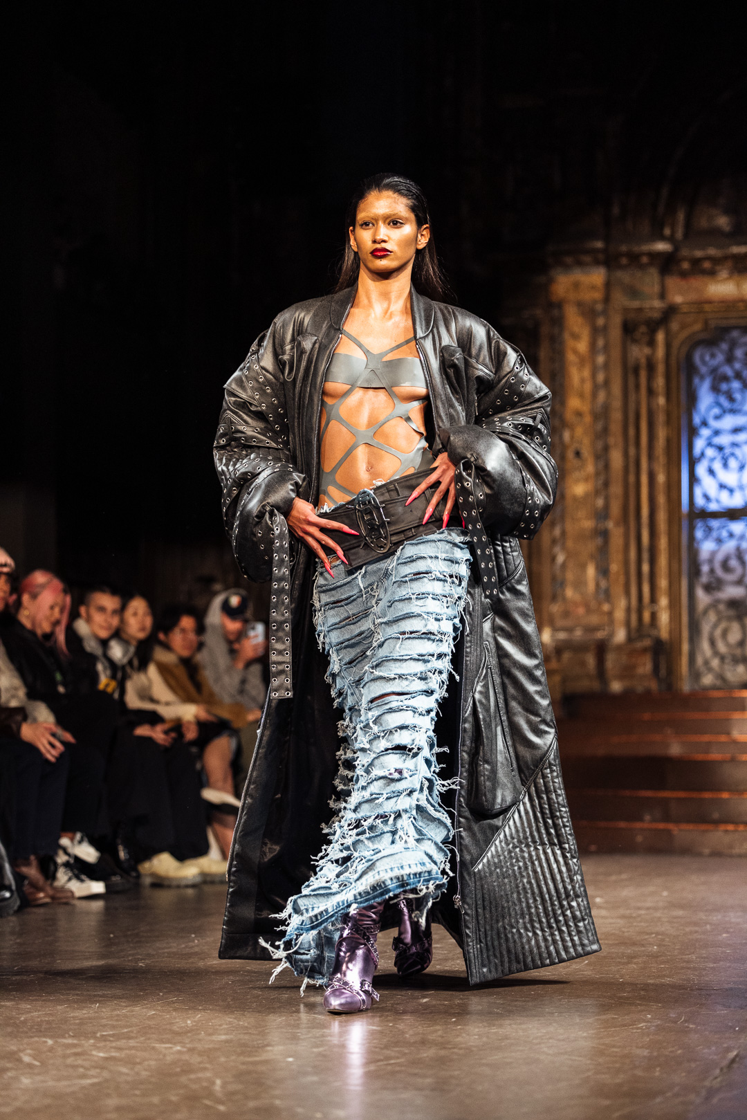 Le latex et le cuir sont présents tout au long de la collection avec des épaules pointues, de la corseterie et des traînes, avec de nombreux ourlets exagérés, dans une palette de couleurs de prune, d’argent métallique, de rouge sang et de noir profond. Le cuir gris dramatique et en détresse est imprimé sur du cuir végétal, en collaboration avec Kornit.
