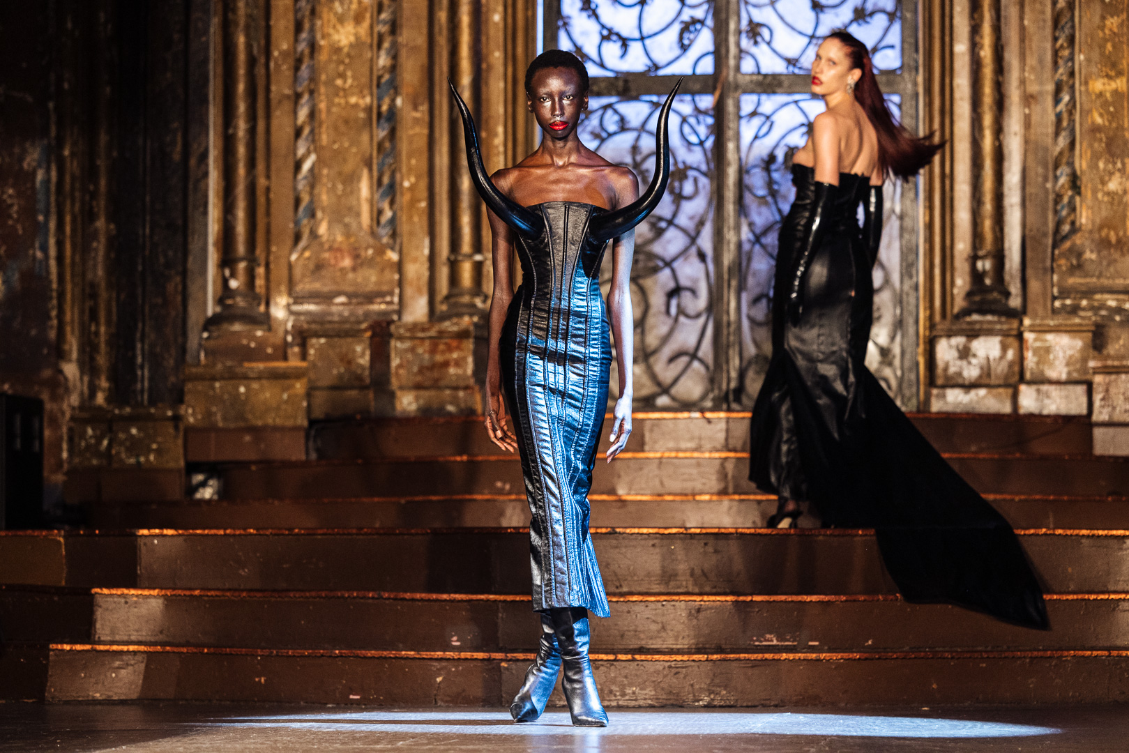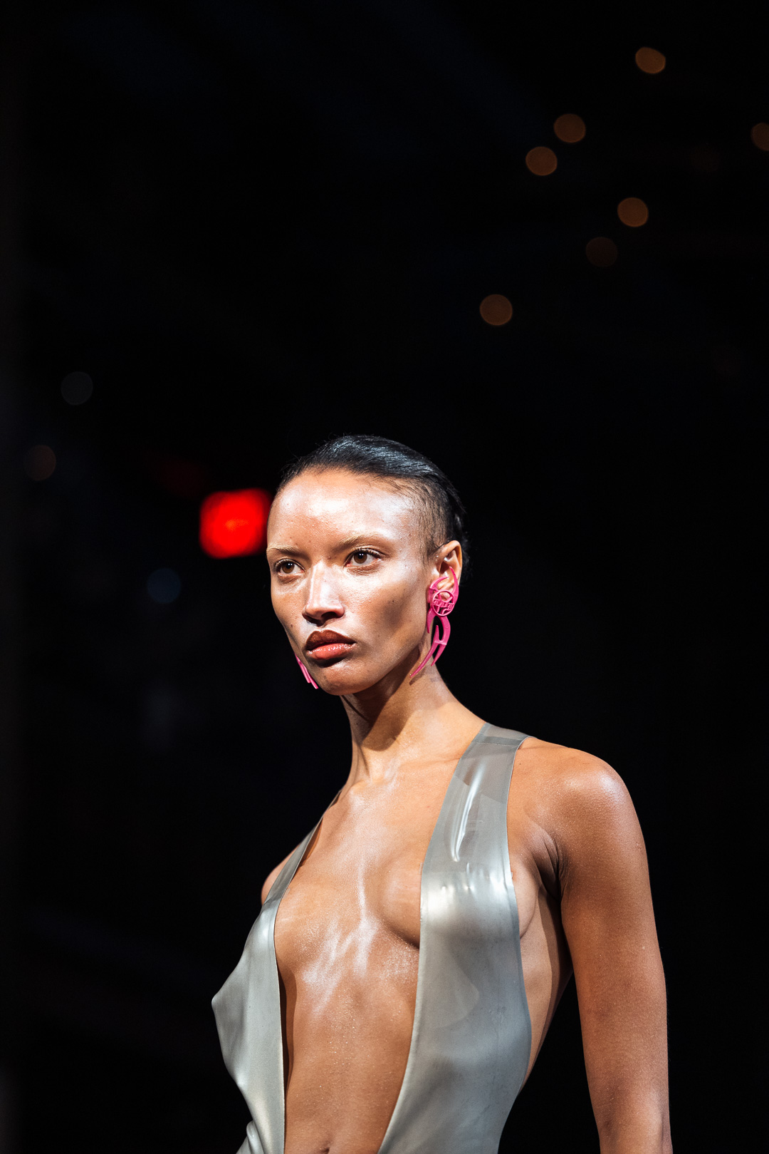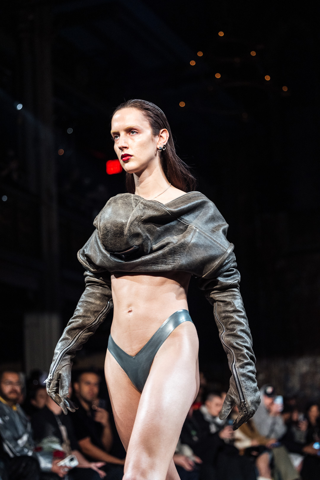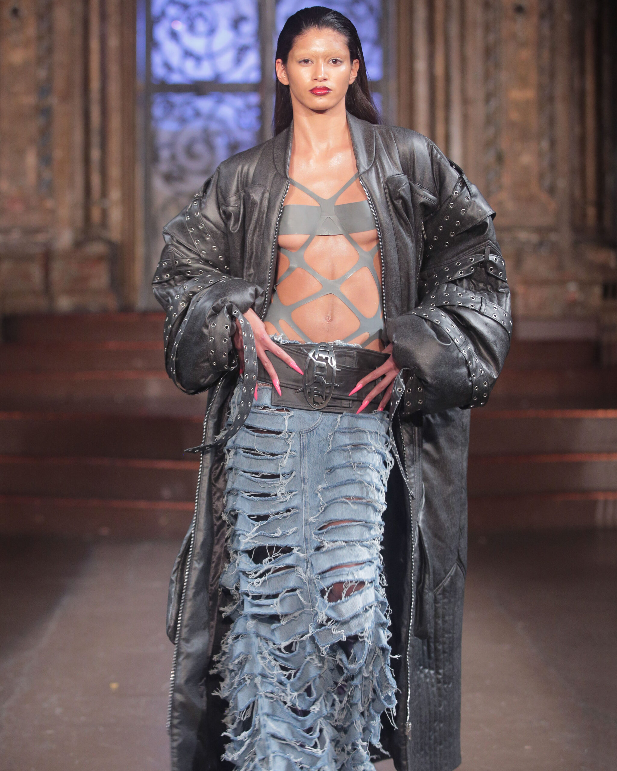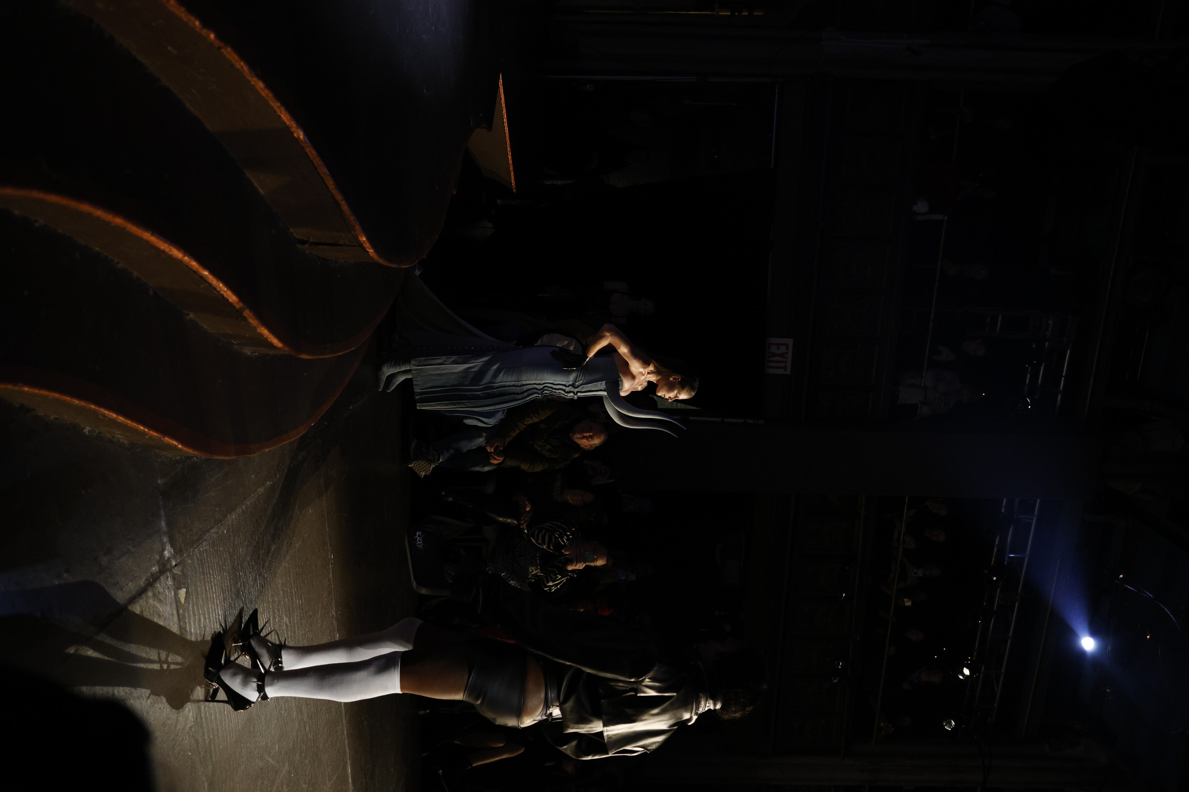 Le latex et le cuir sont présents tout au long de la collection avec des épaules pointues, de la corseterie et des traînes, avec de nombreux ourlets exagérés, dans une palette de couleurs de prune, d’argent métallique, de rouge sang et de noir profond. Le cuir gris dramatique et en détresse est imprimé sur du cuir végétal, en collaboration avec Kornit.