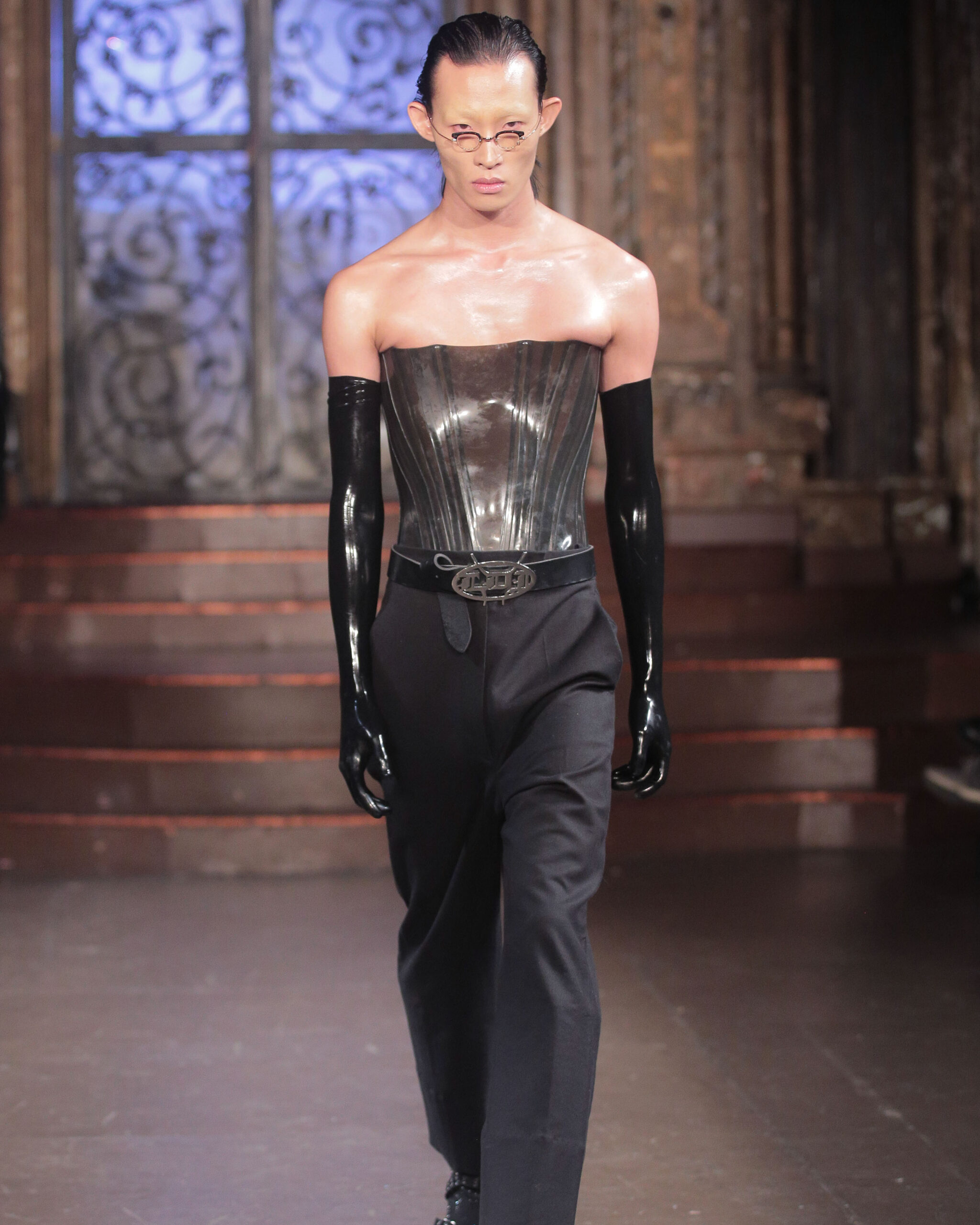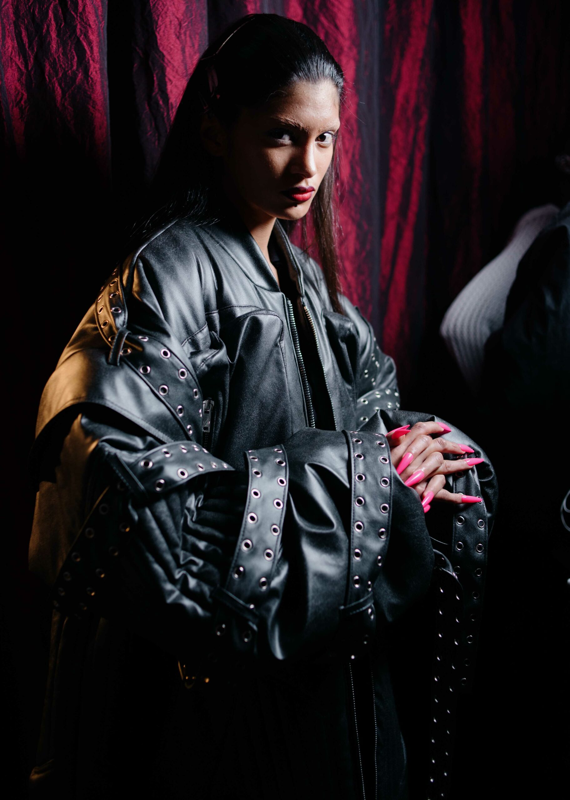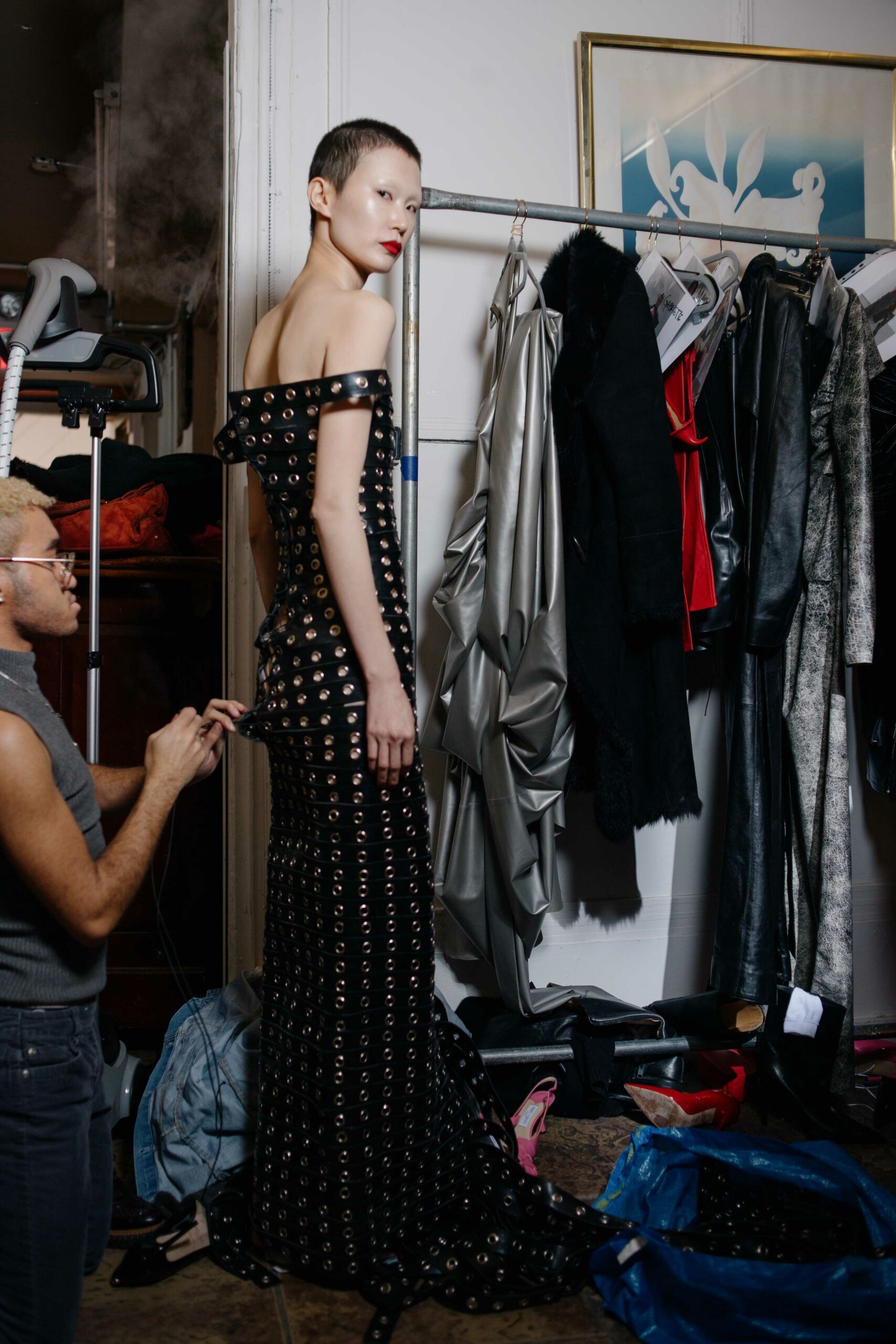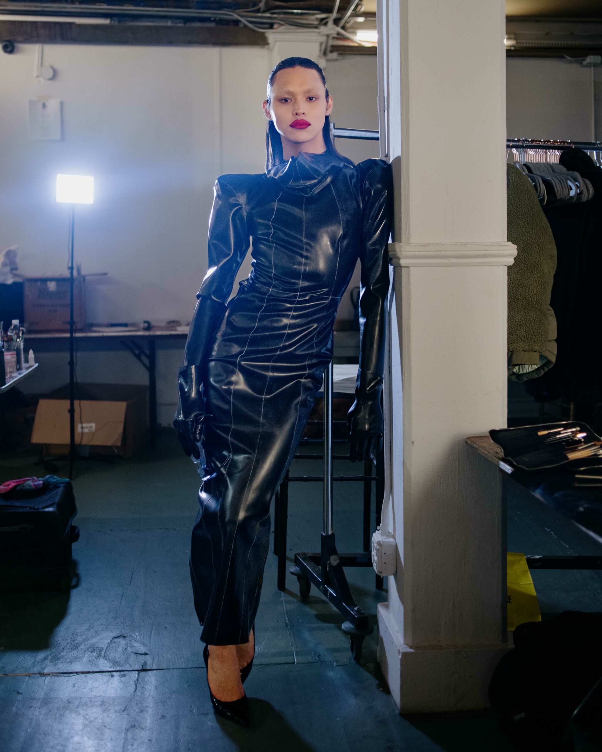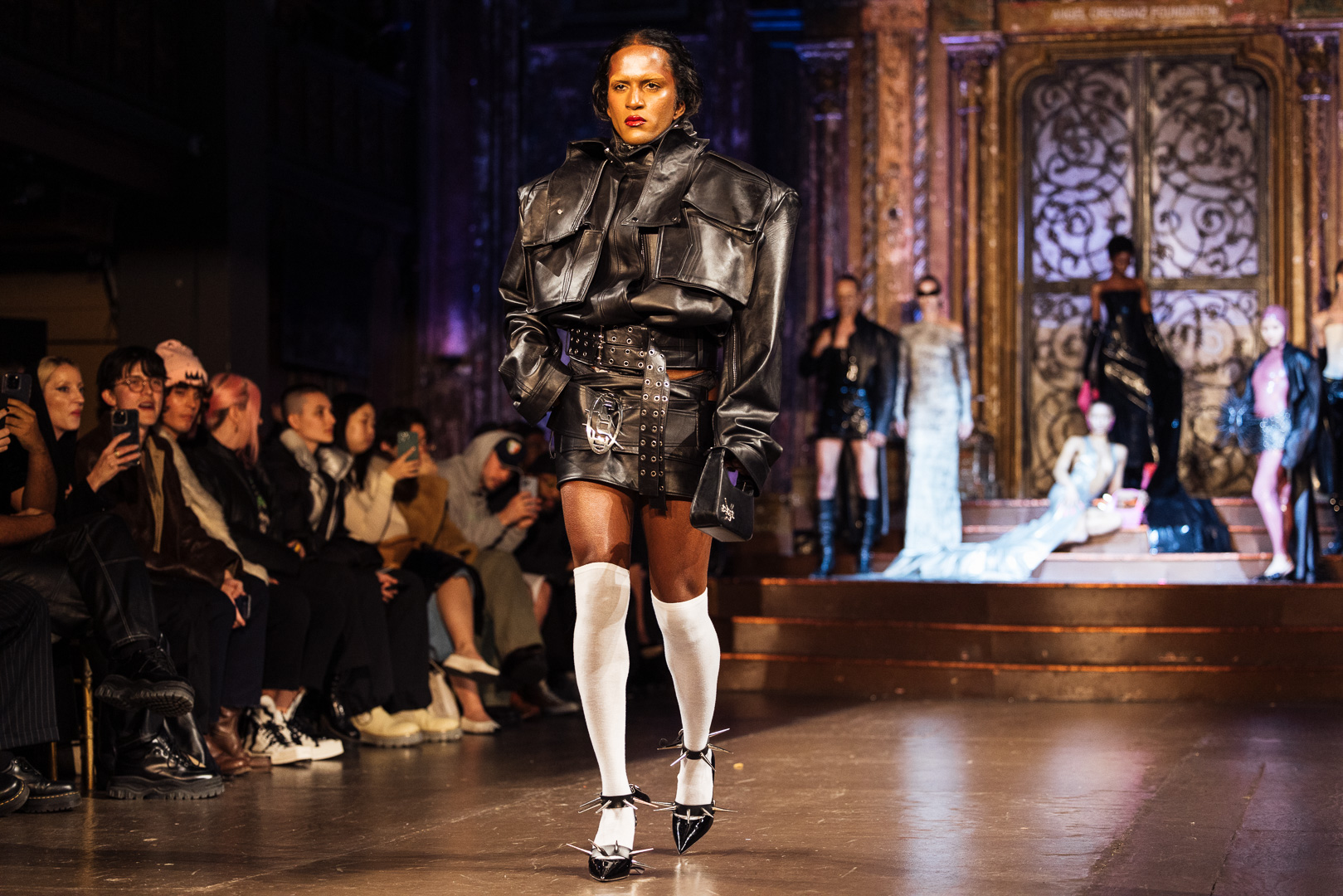 Le latex et le cuir sont présents tout au long de la collection avec des épaules pointues, de la corseterie et des traînes, avec de nombreux ourlets exagérés, dans une palette de couleurs de prune, d’argent métallique, de rouge sang et de noir profond. Le cuir gris dramatique et en détresse est imprimé sur du cuir végétal, en collaboration avec Kornit.