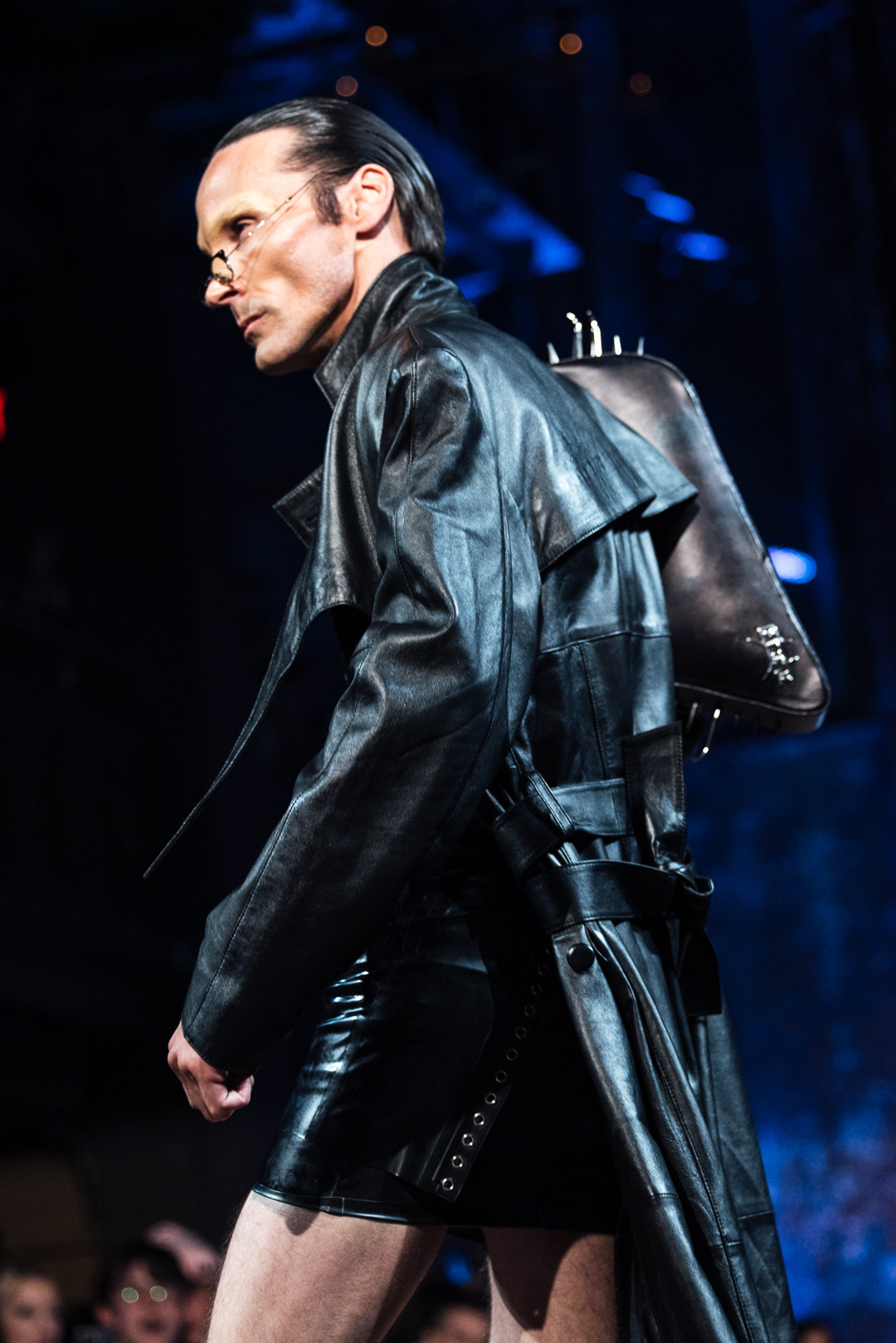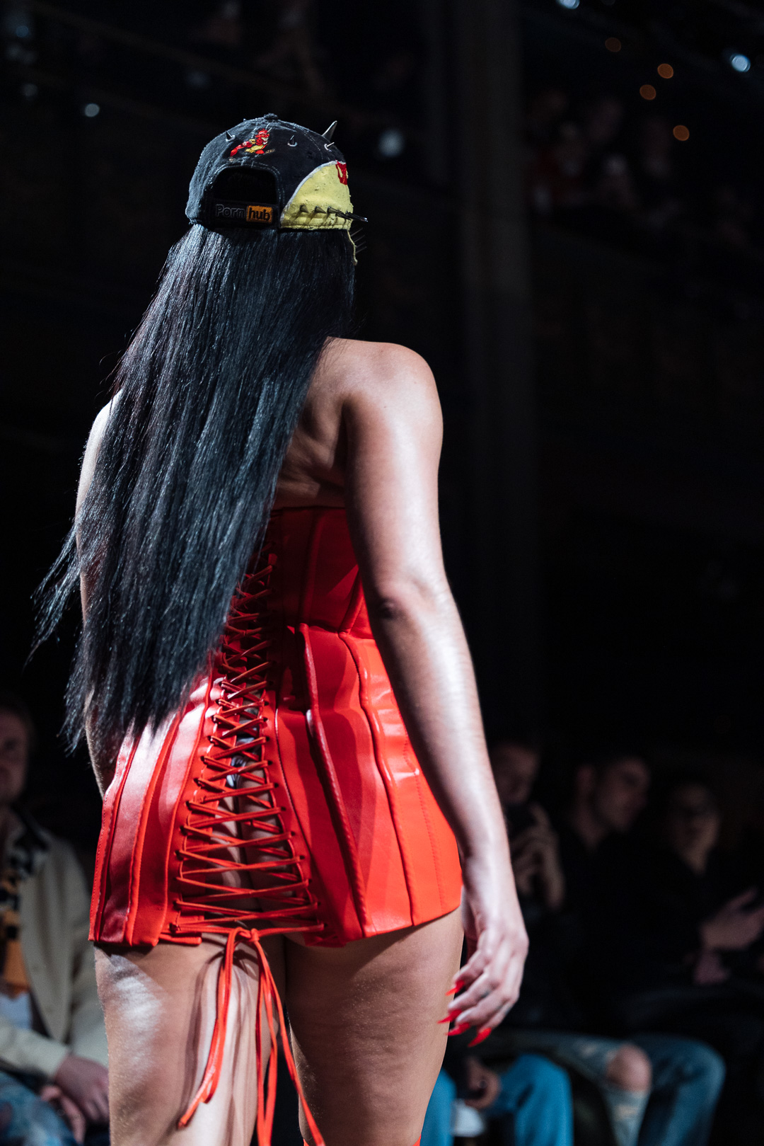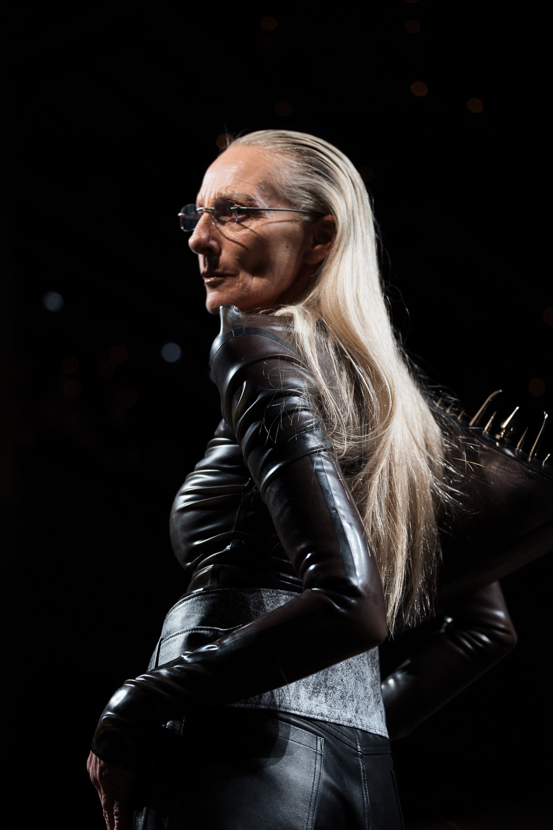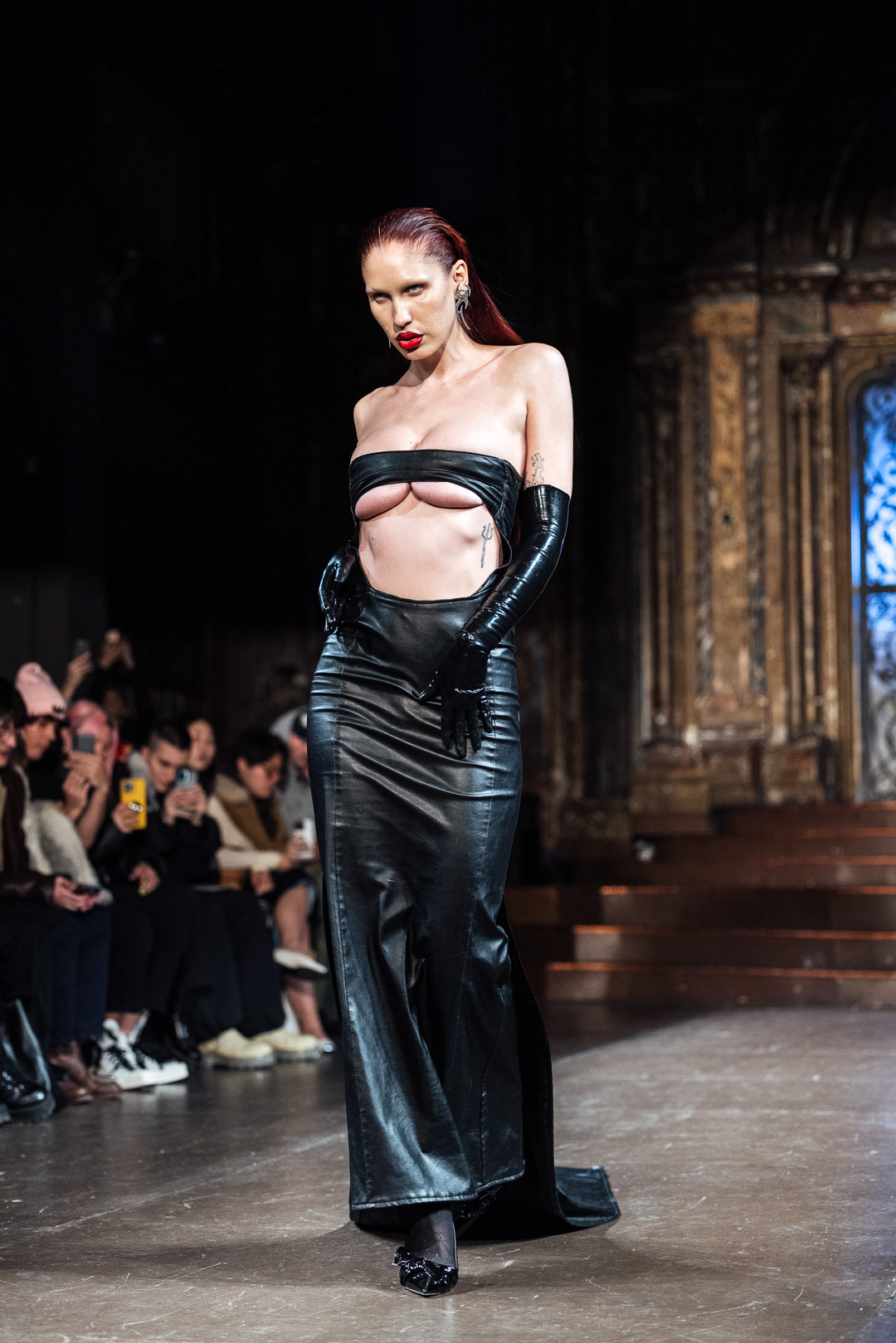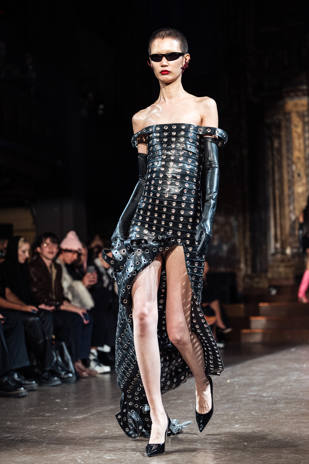 Le latex et le cuir sont présents tout au long de la collection avec des épaules pointues, de la corseterie et des traînes, avec de nombreux ourlets exagérés, dans une palette de couleurs de prune, d’argent métallique, de rouge sang et de noir profond. Le cuir gris dramatique et en détresse est imprimé sur du cuir végétal, en collaboration avec Kornit.
