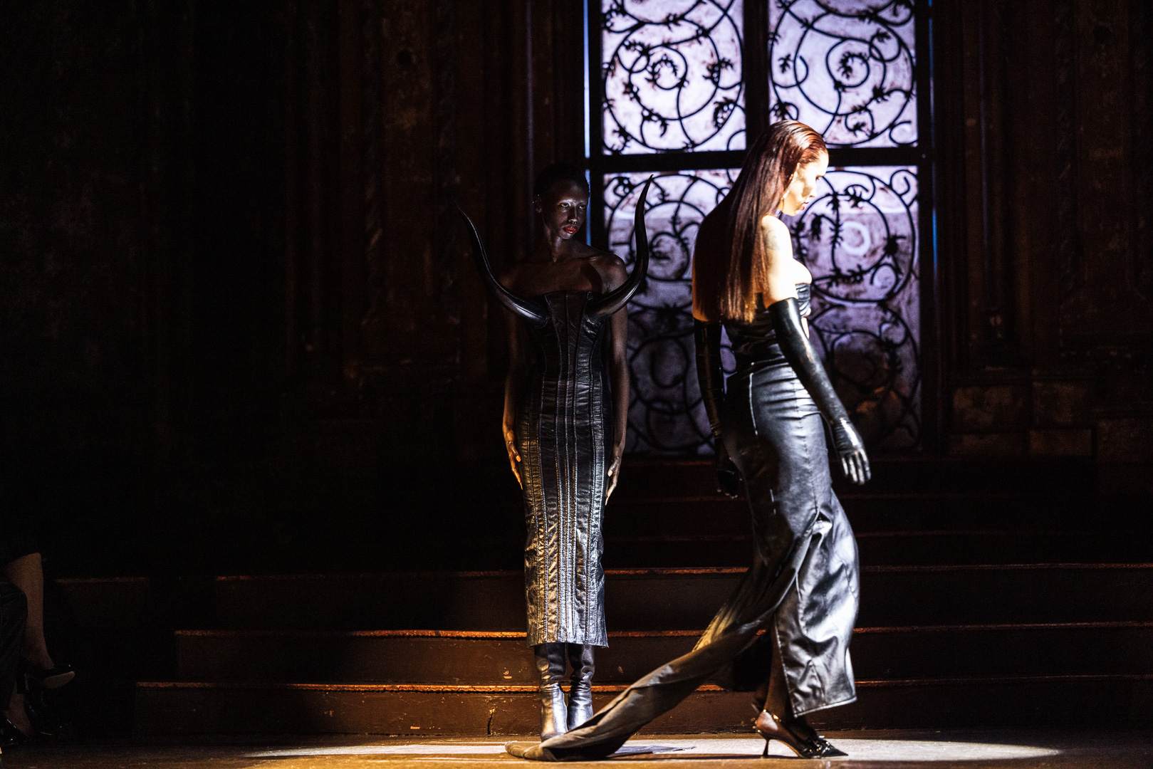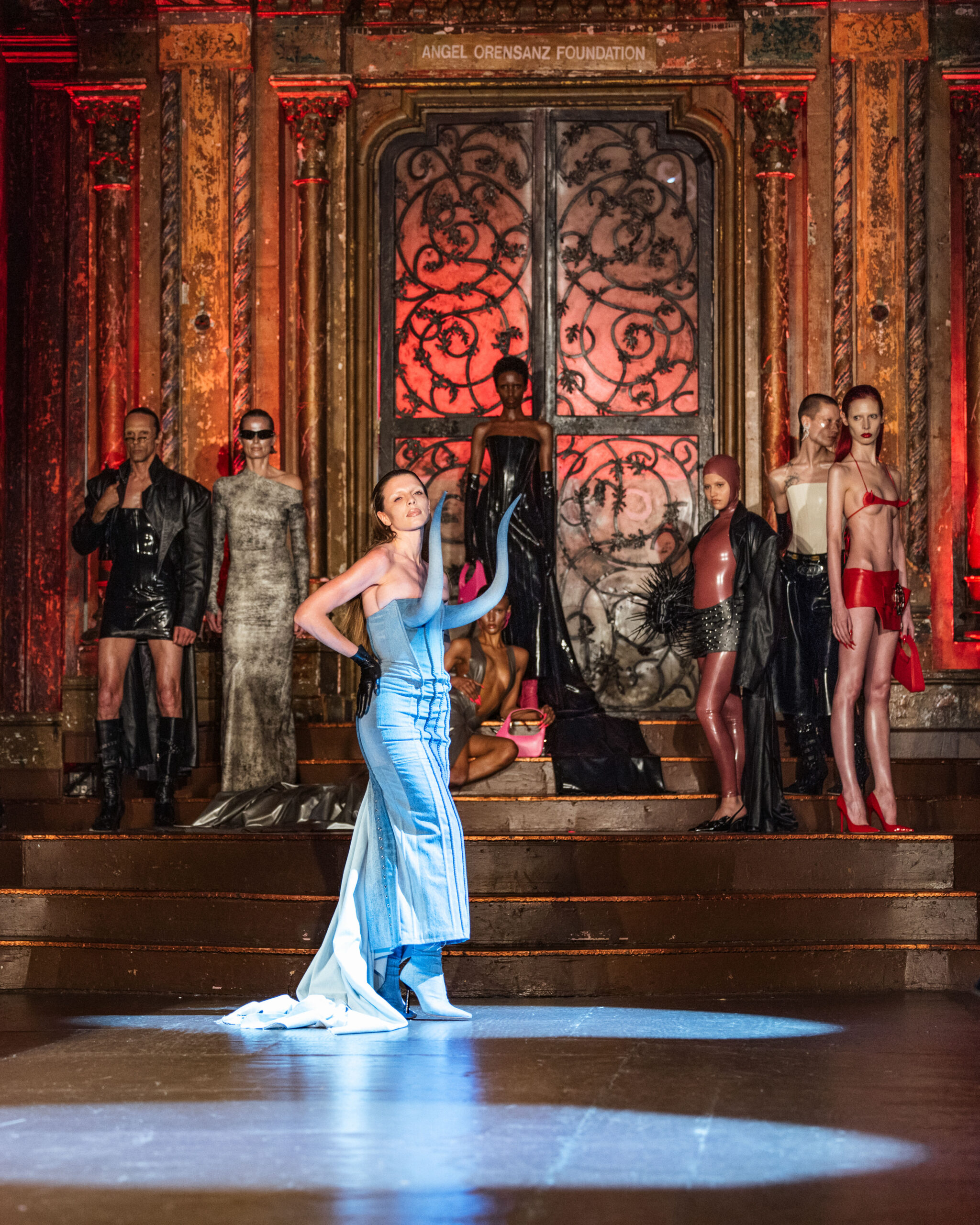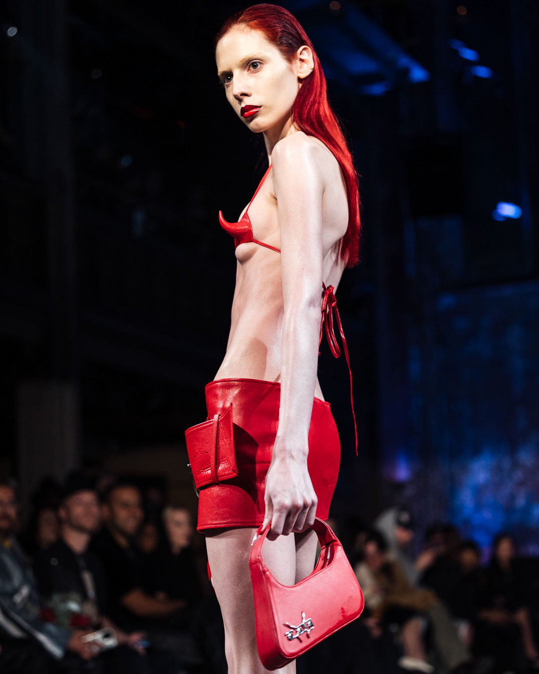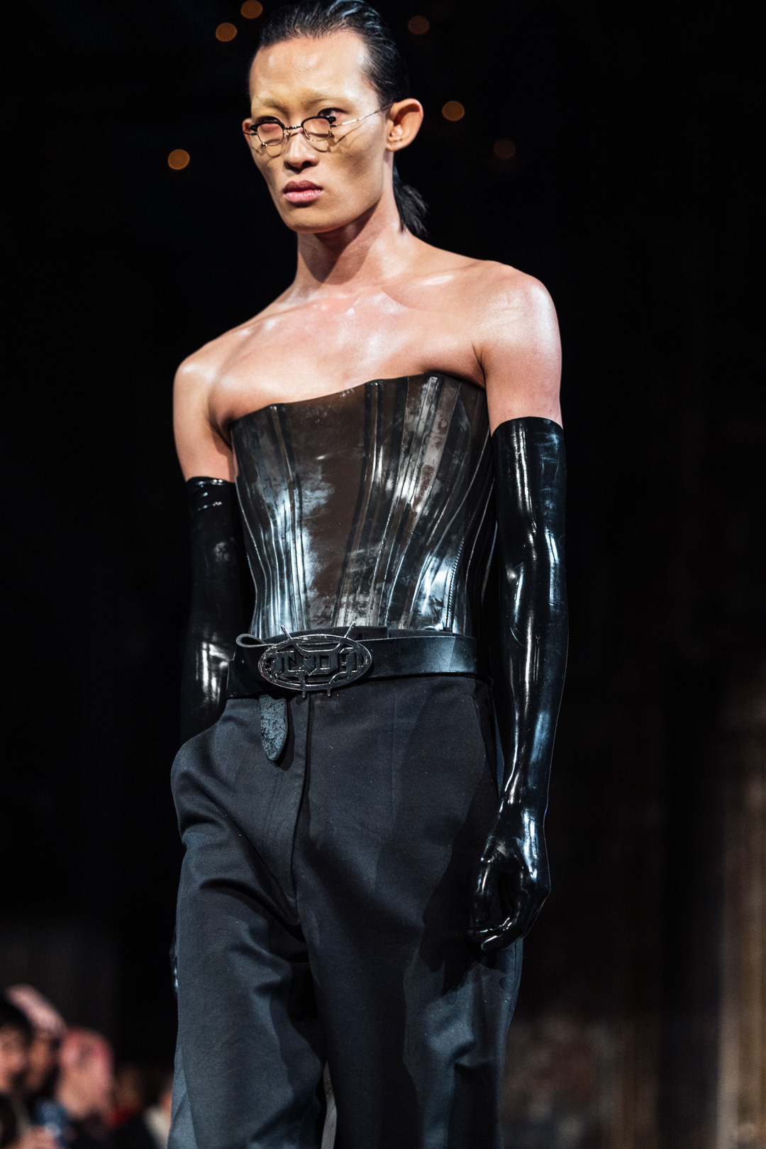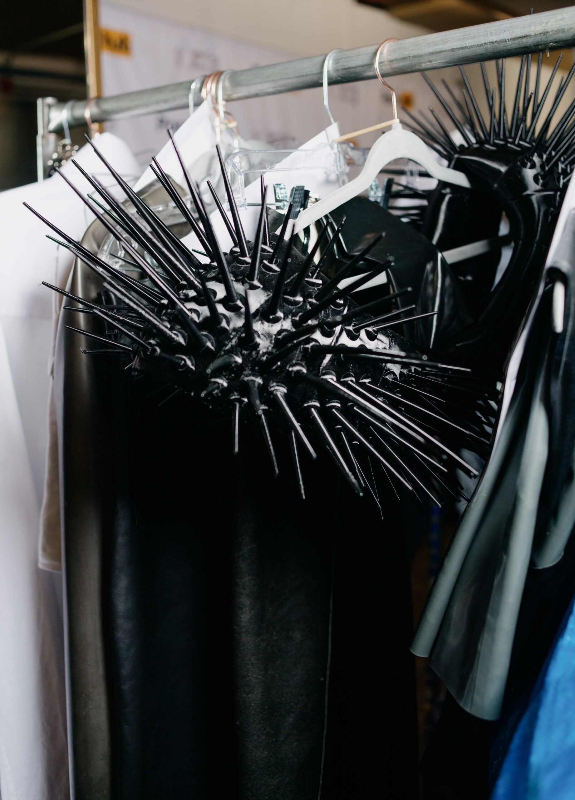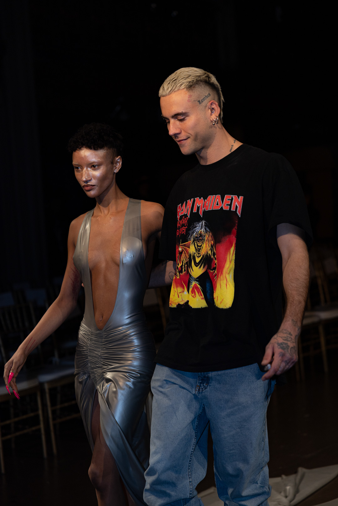 Le latex et le cuir sont présents tout au long de la collection avec des épaules pointues, de la corseterie et des traînes, avec de nombreux ourlets exagérés, dans une palette de couleurs de prune, d’argent métallique, de rouge sang et de noir profond. Le cuir gris dramatique et en détresse est imprimé sur du cuir végétal, en collaboration avec Kornit.