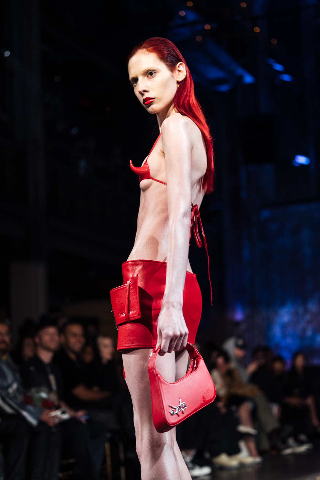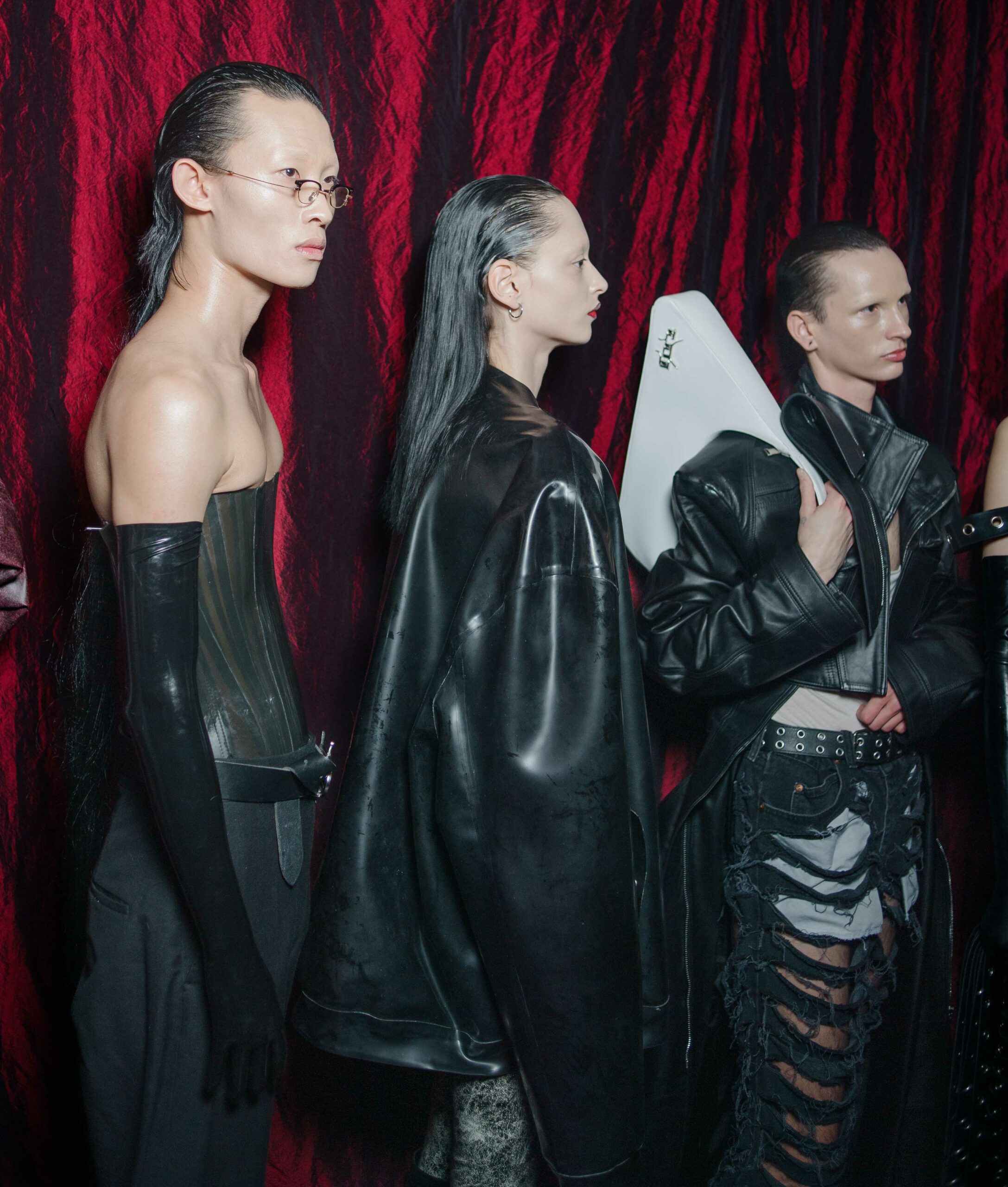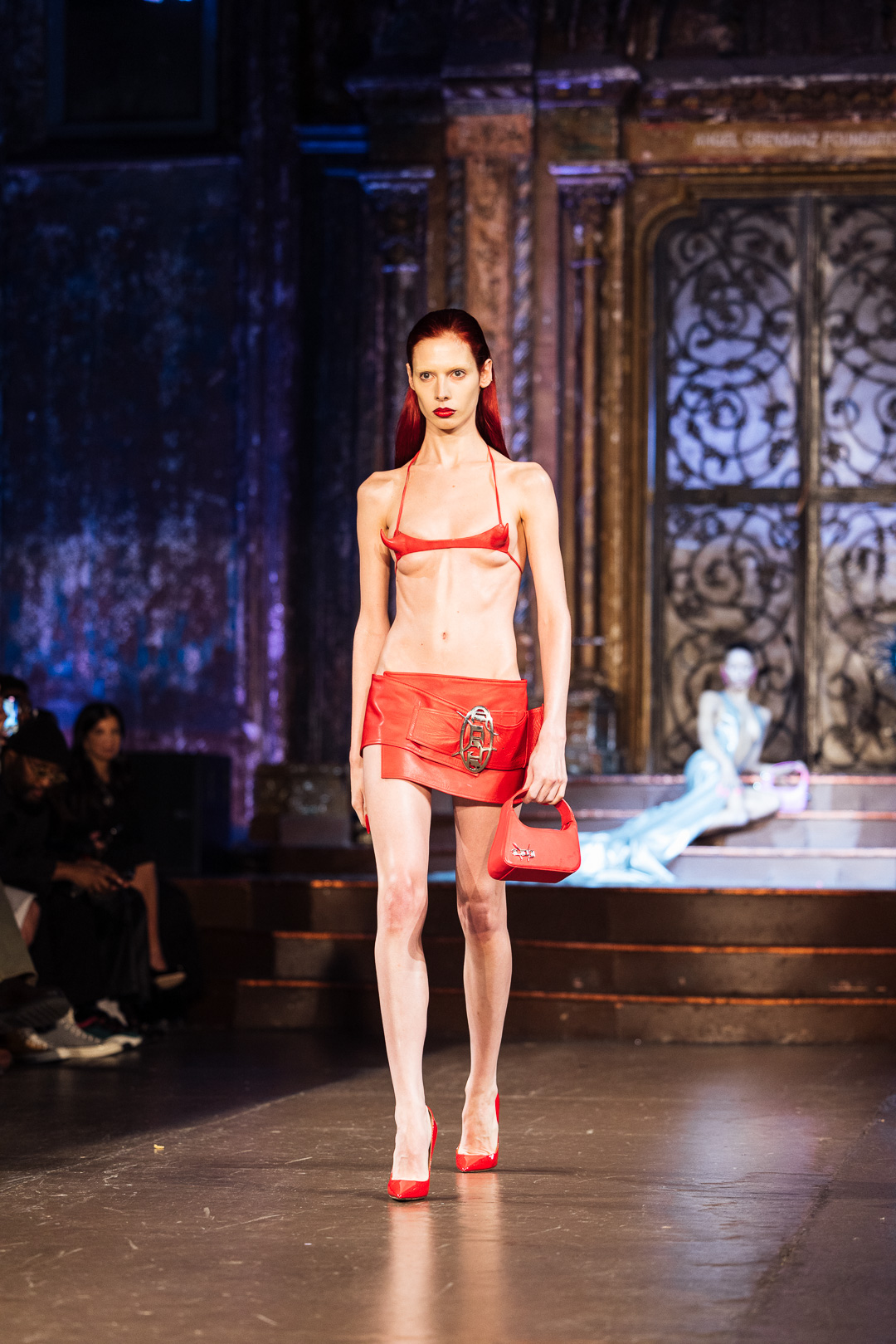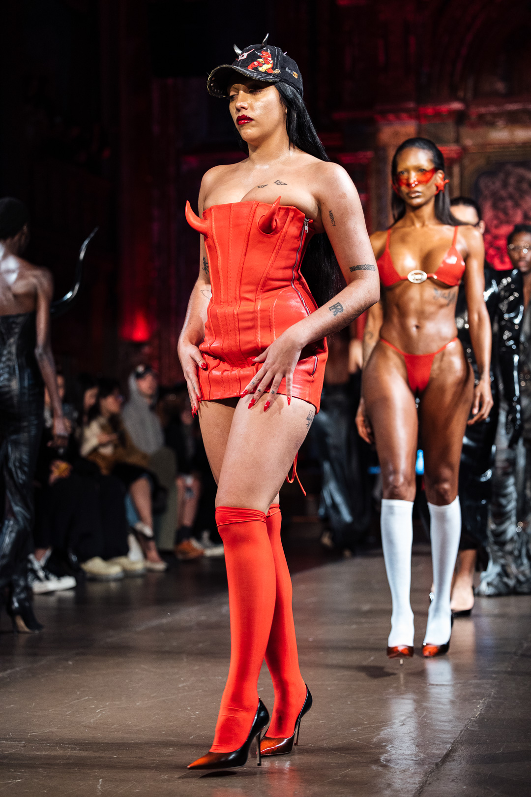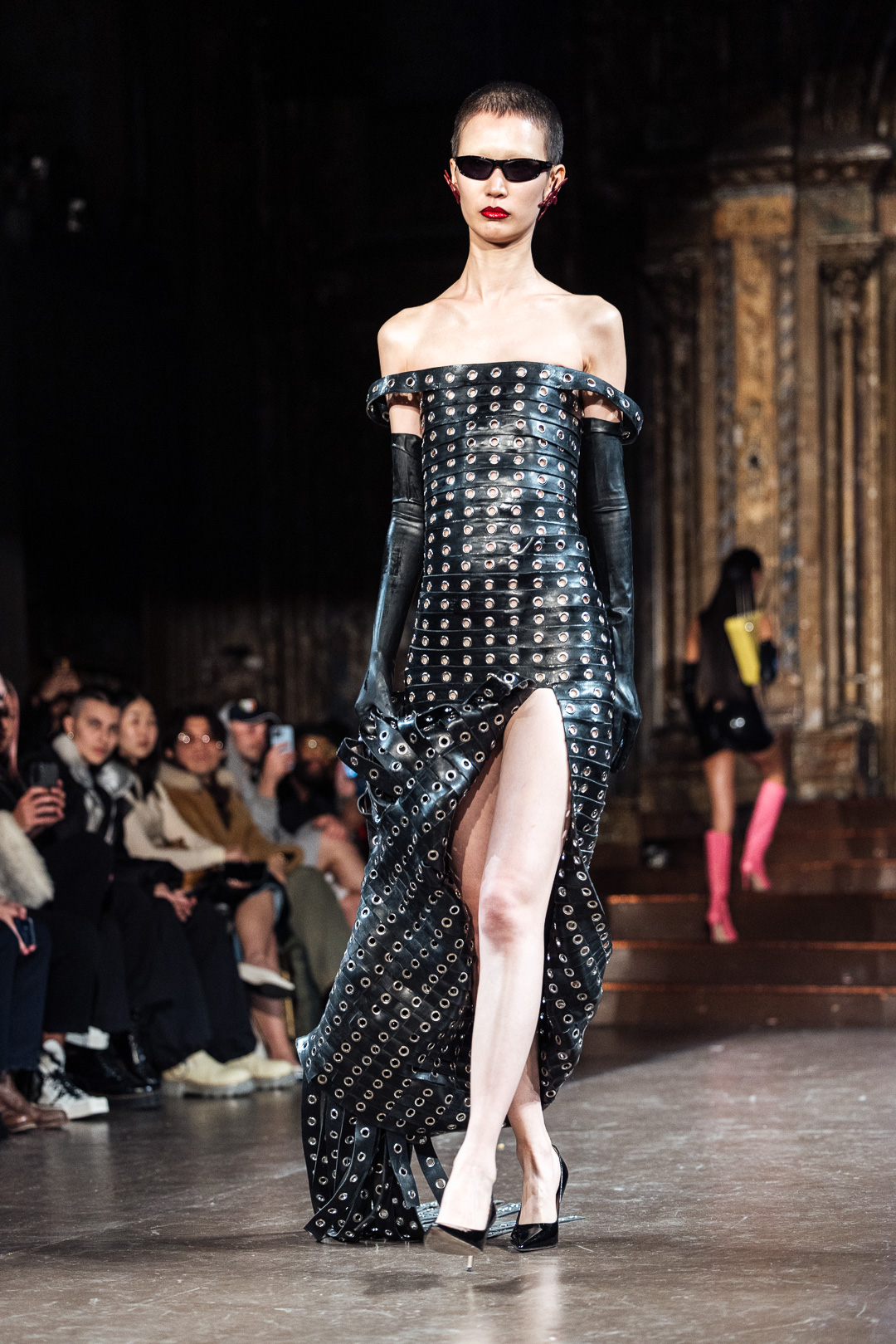 Le latex et le cuir sont présents tout au long de la collection avec des épaules pointues, de la corseterie et des traînes, avec de nombreux ourlets exagérés, dans une palette de couleurs de prune, d’argent métallique, de rouge sang et de noir profond. Le cuir gris dramatique et en détresse est imprimé sur du cuir végétal, en collaboration avec Kornit.