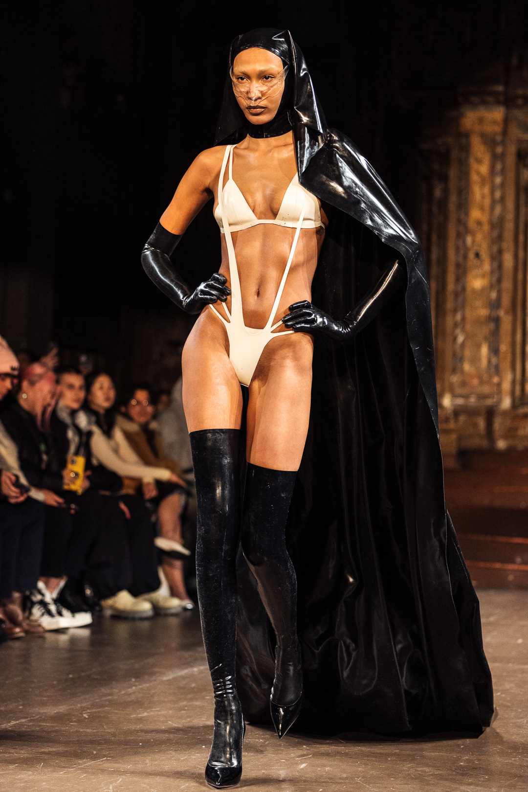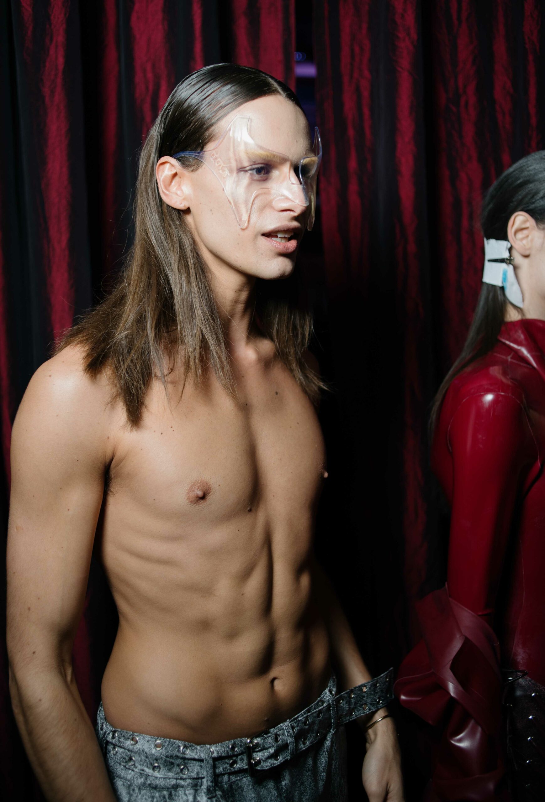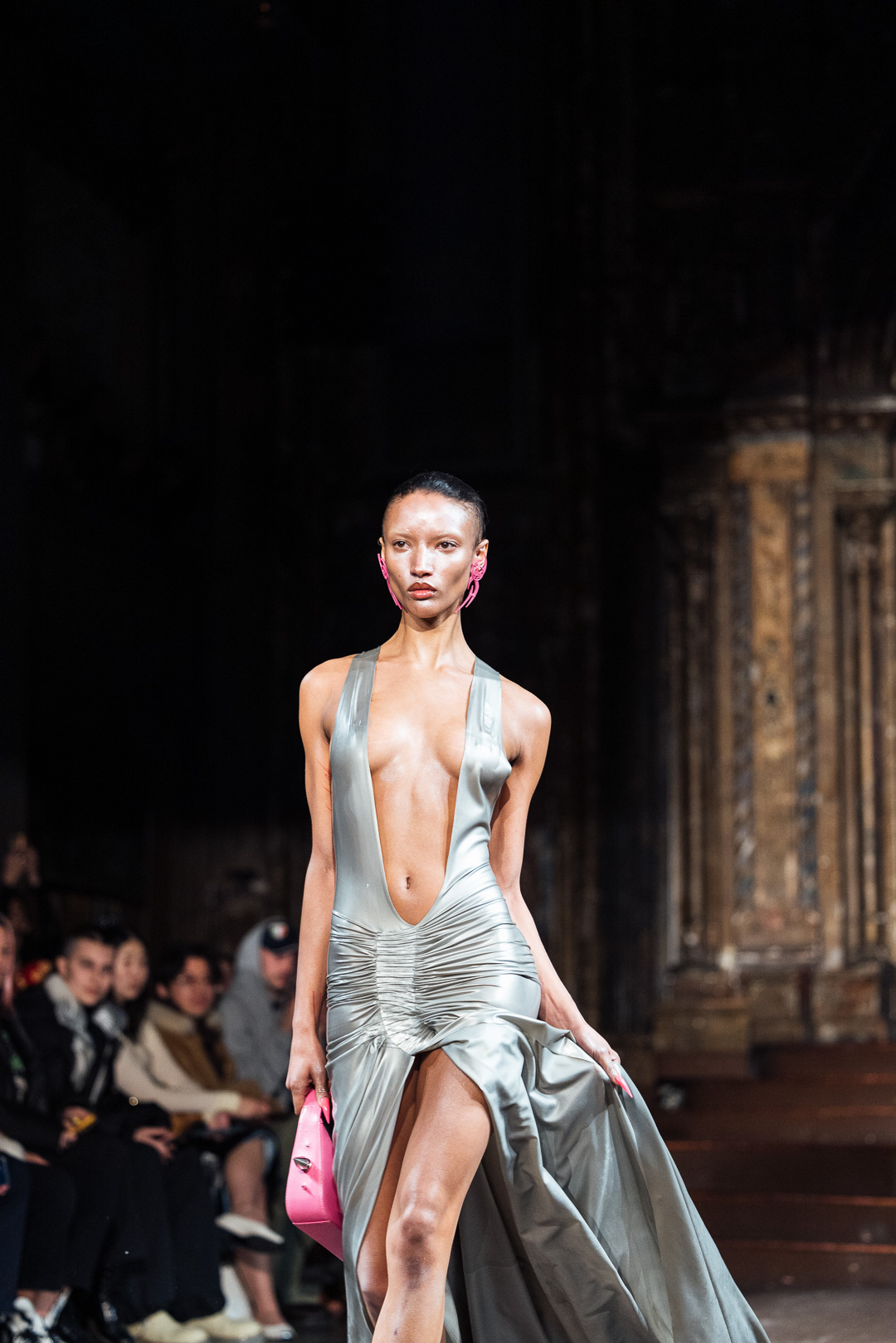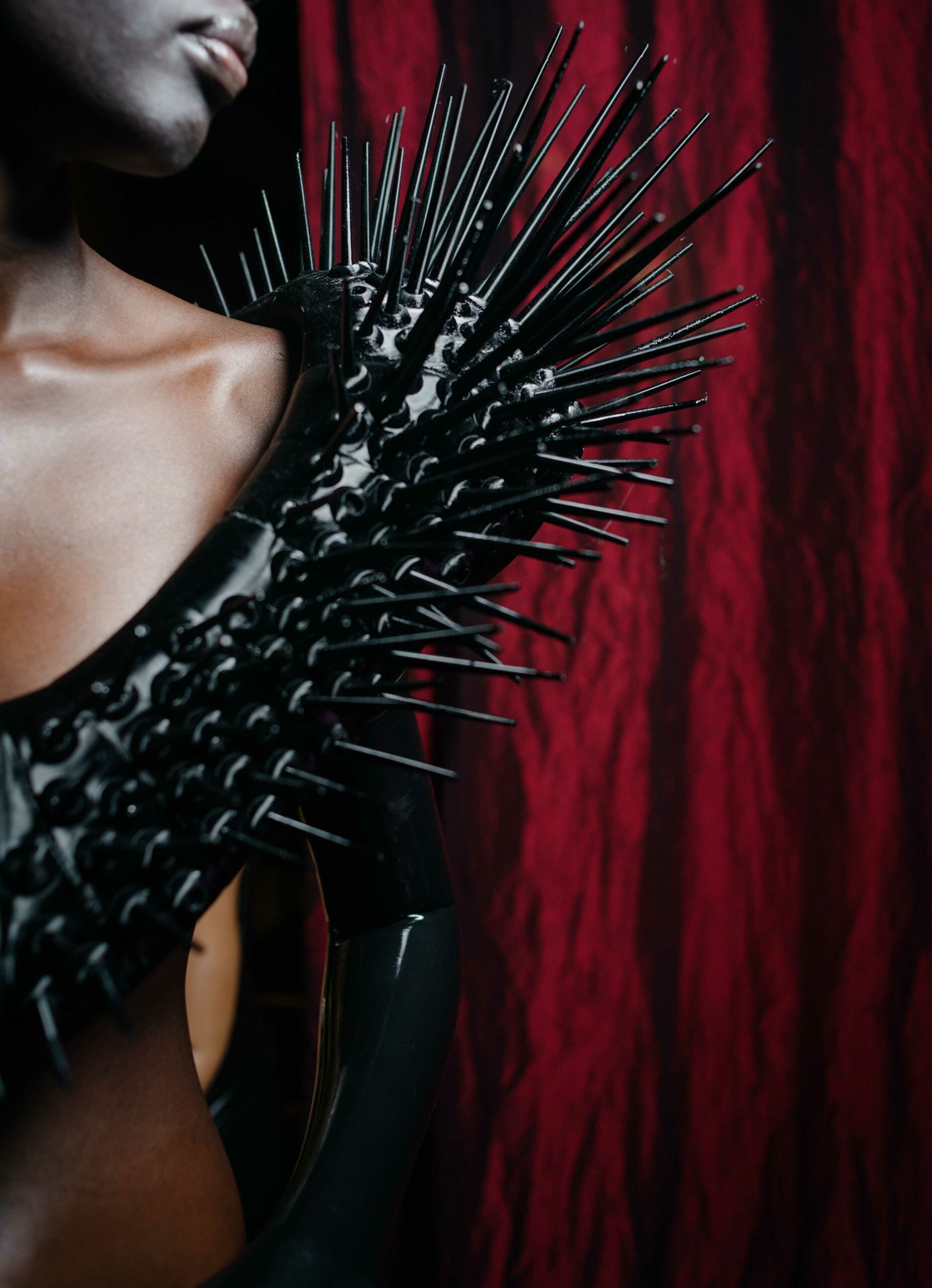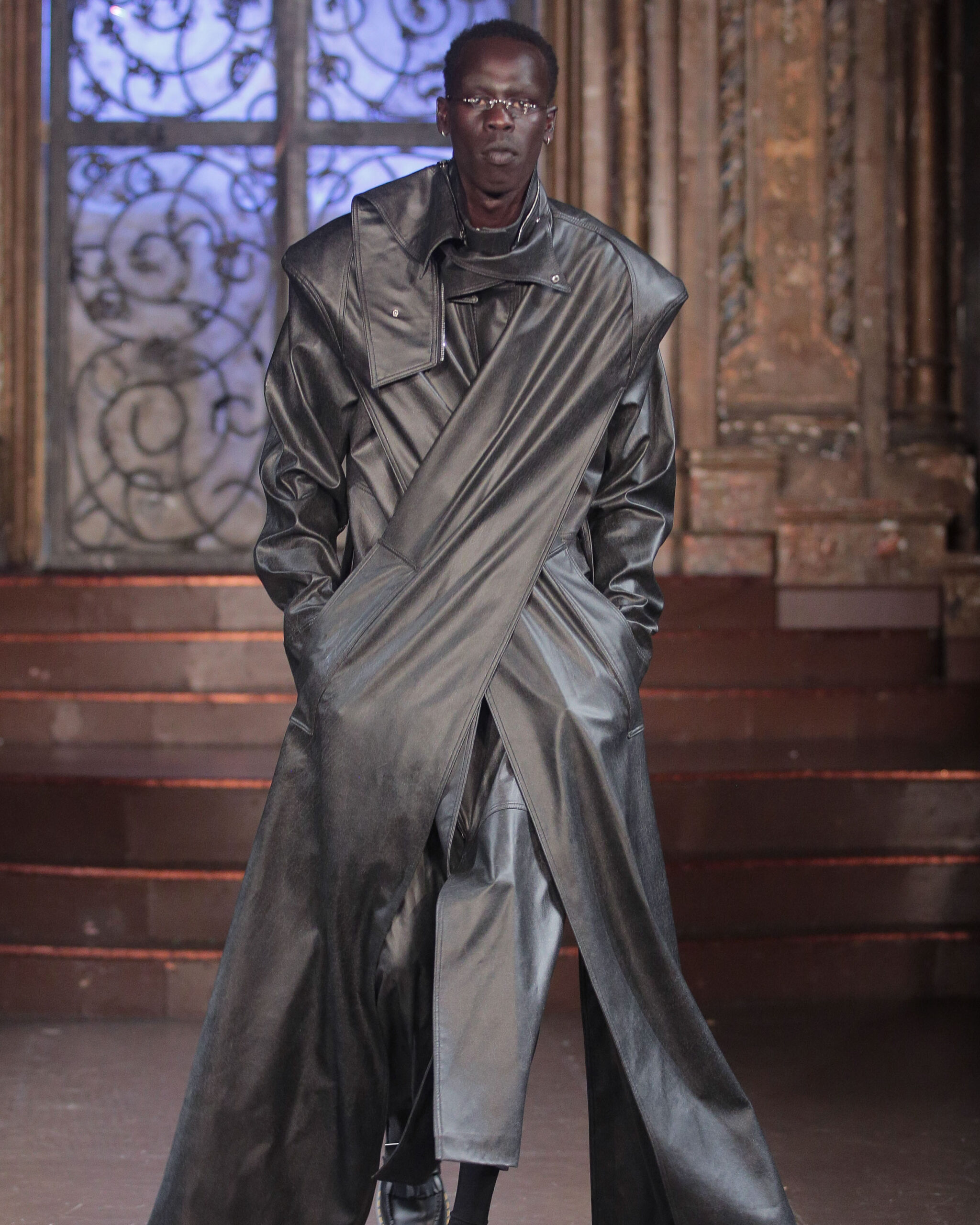 Le latex et le cuir sont présents tout au long de la collection avec des épaules pointues, de la corseterie et des traînes, avec de nombreux ourlets exagérés, dans une palette de couleurs de prune, d’argent métallique, de rouge sang et de noir profond. Le cuir gris dramatique et en détresse est imprimé sur du cuir végétal, en collaboration avec Kornit.