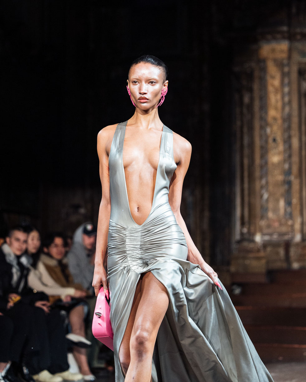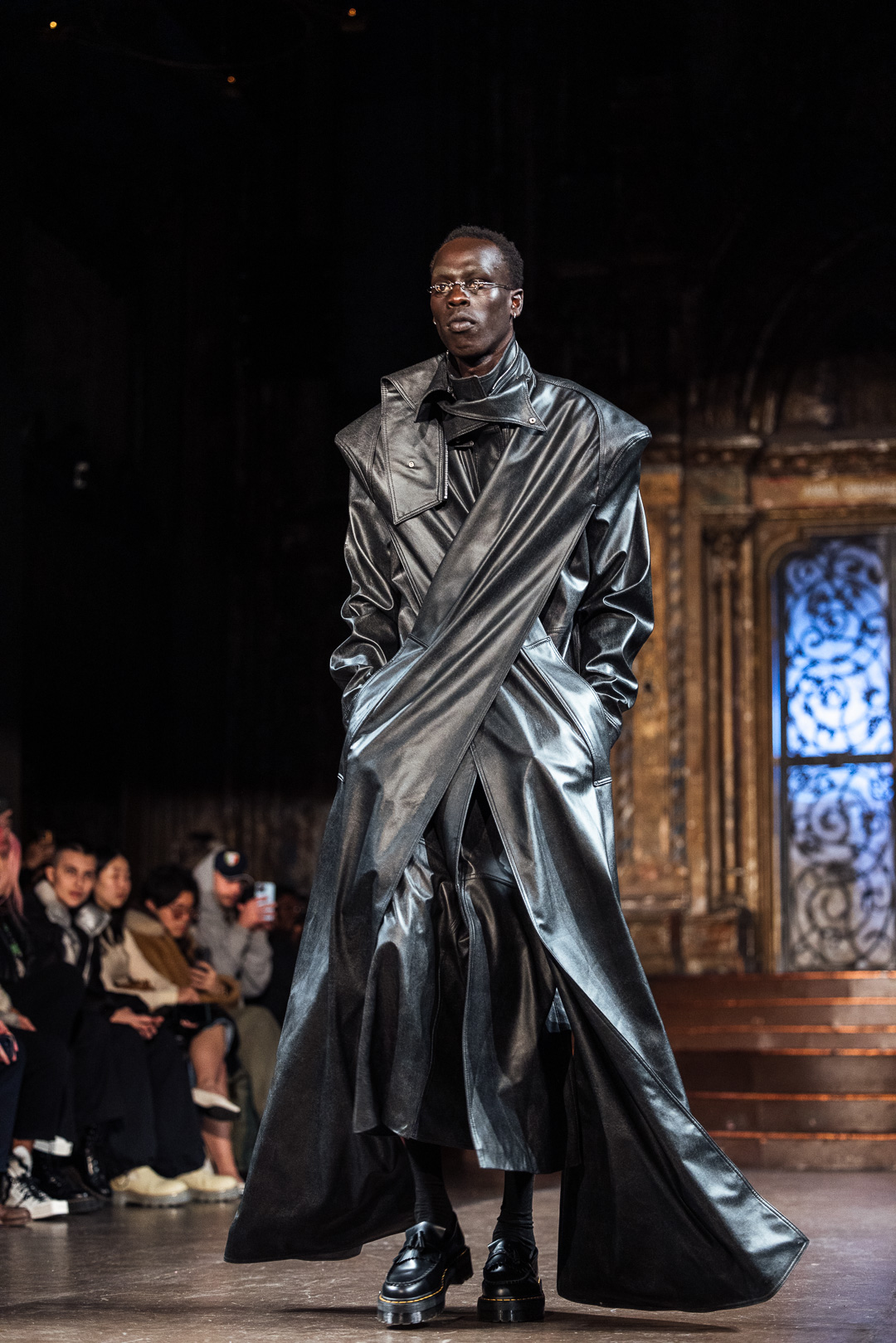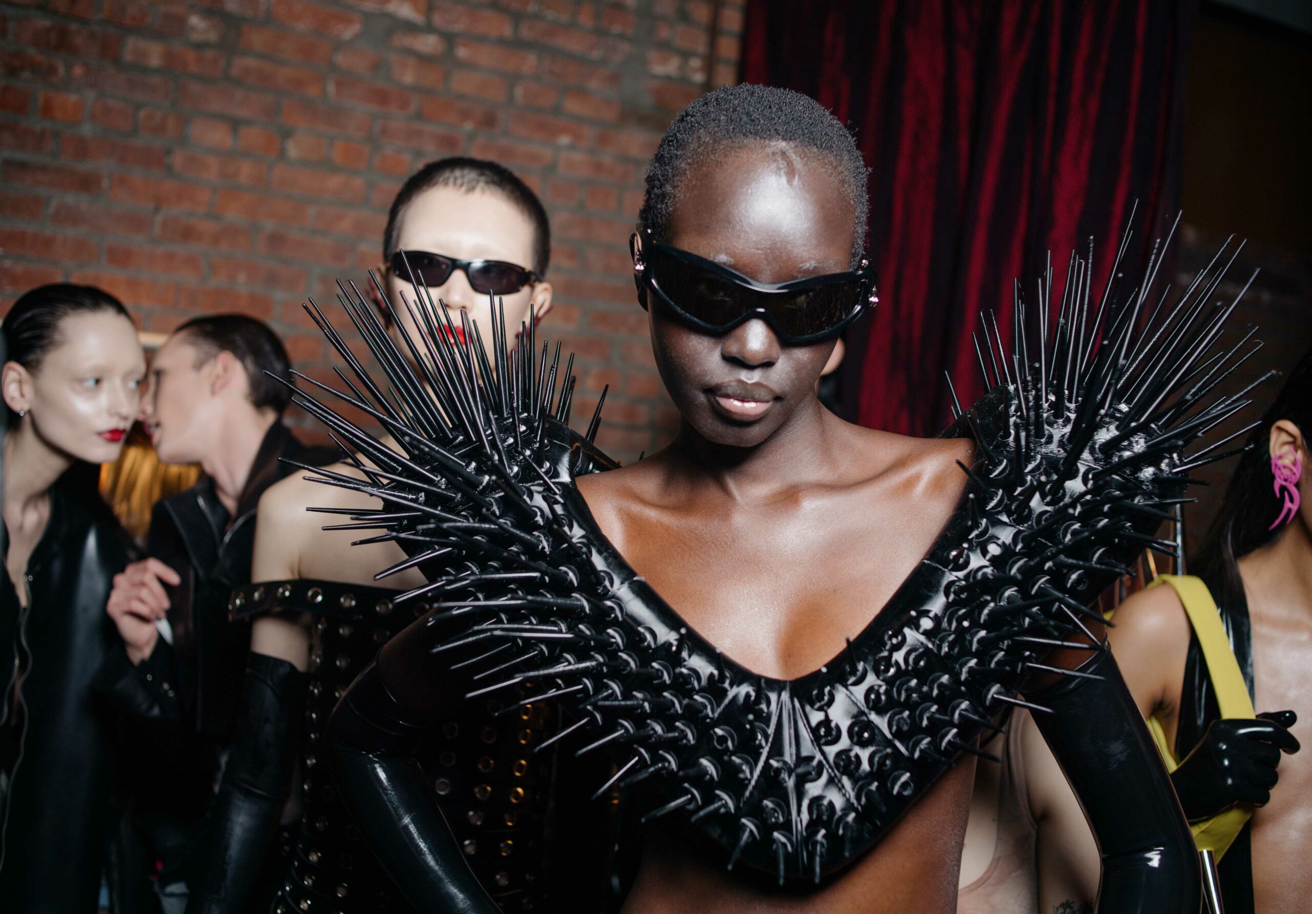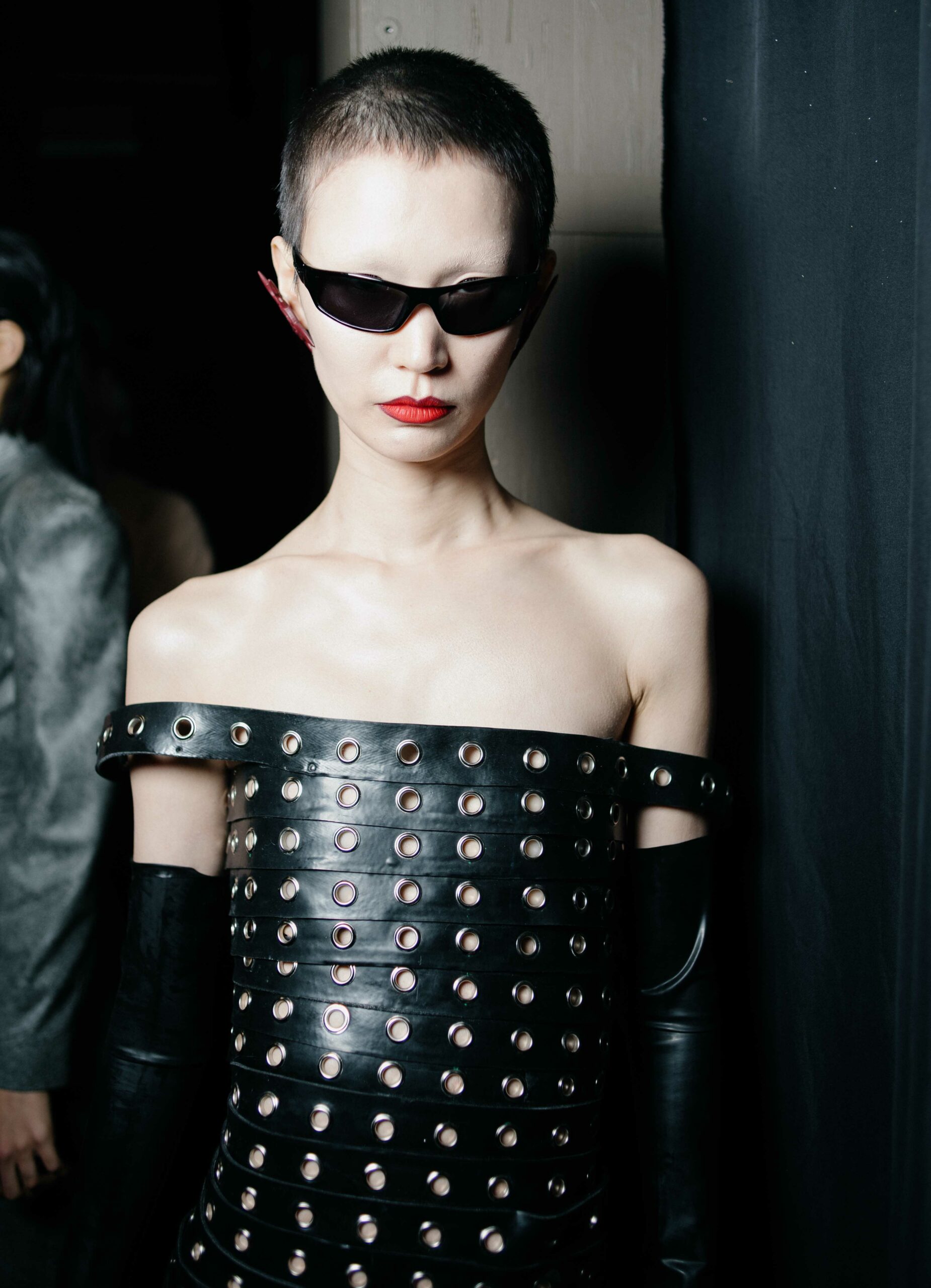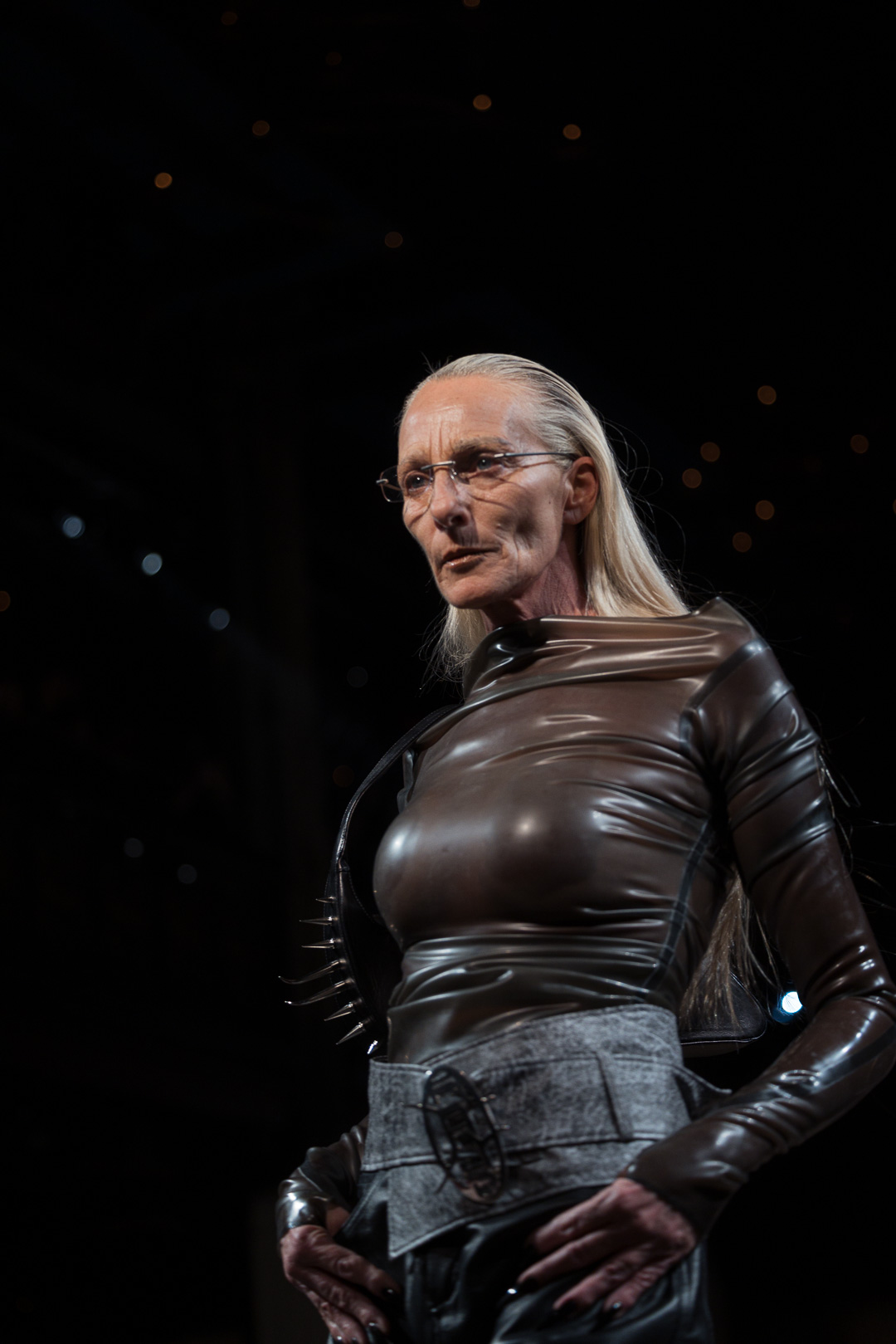 Le latex et le cuir sont présents tout au long de la collection avec des épaules pointues, de la corseterie et des traînes, avec de nombreux ourlets exagérés, dans une palette de couleurs de prune, d’argent métallique, de rouge sang et de noir profond. Le cuir gris dramatique et en détresse est imprimé sur du cuir végétal, en collaboration avec Kornit.