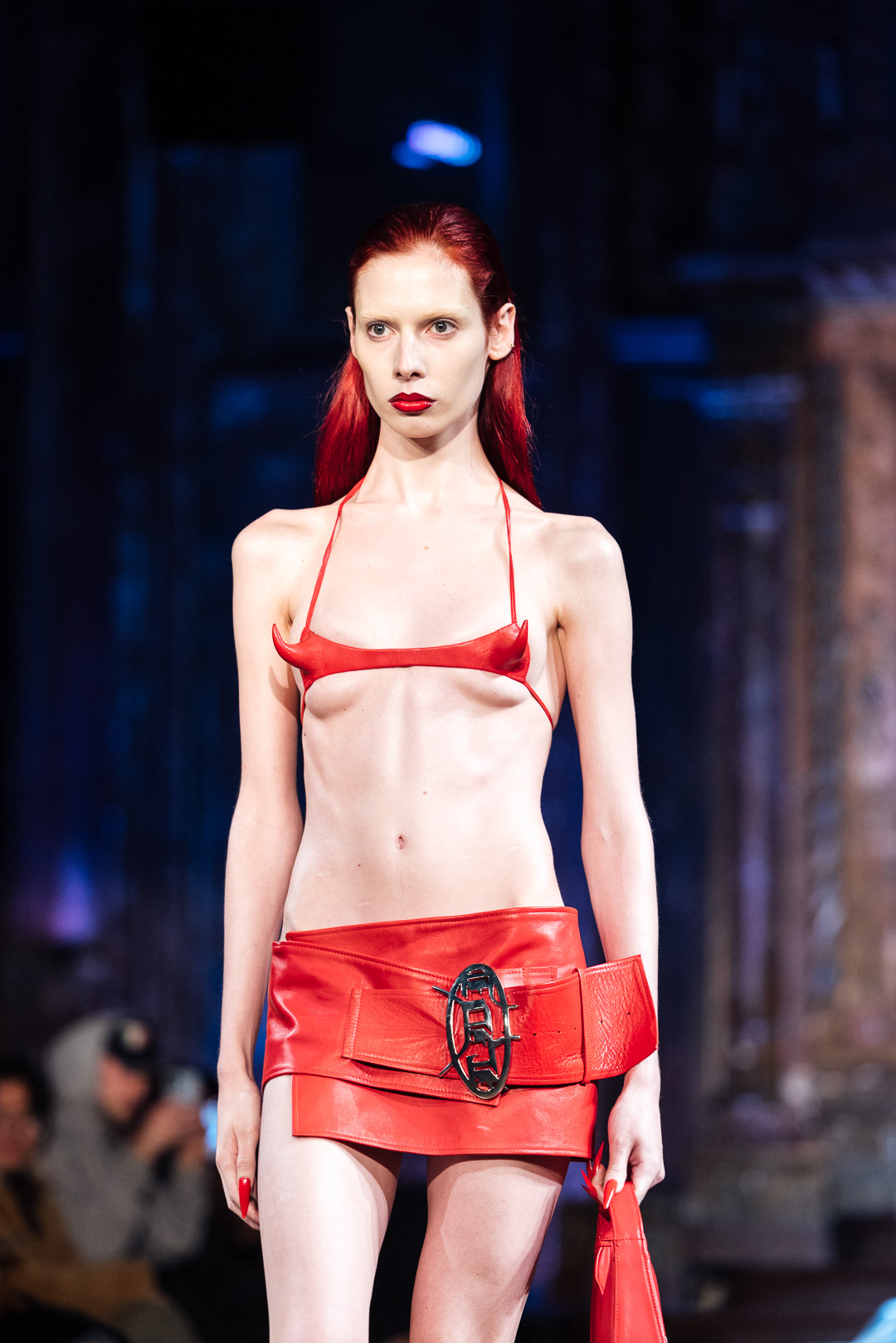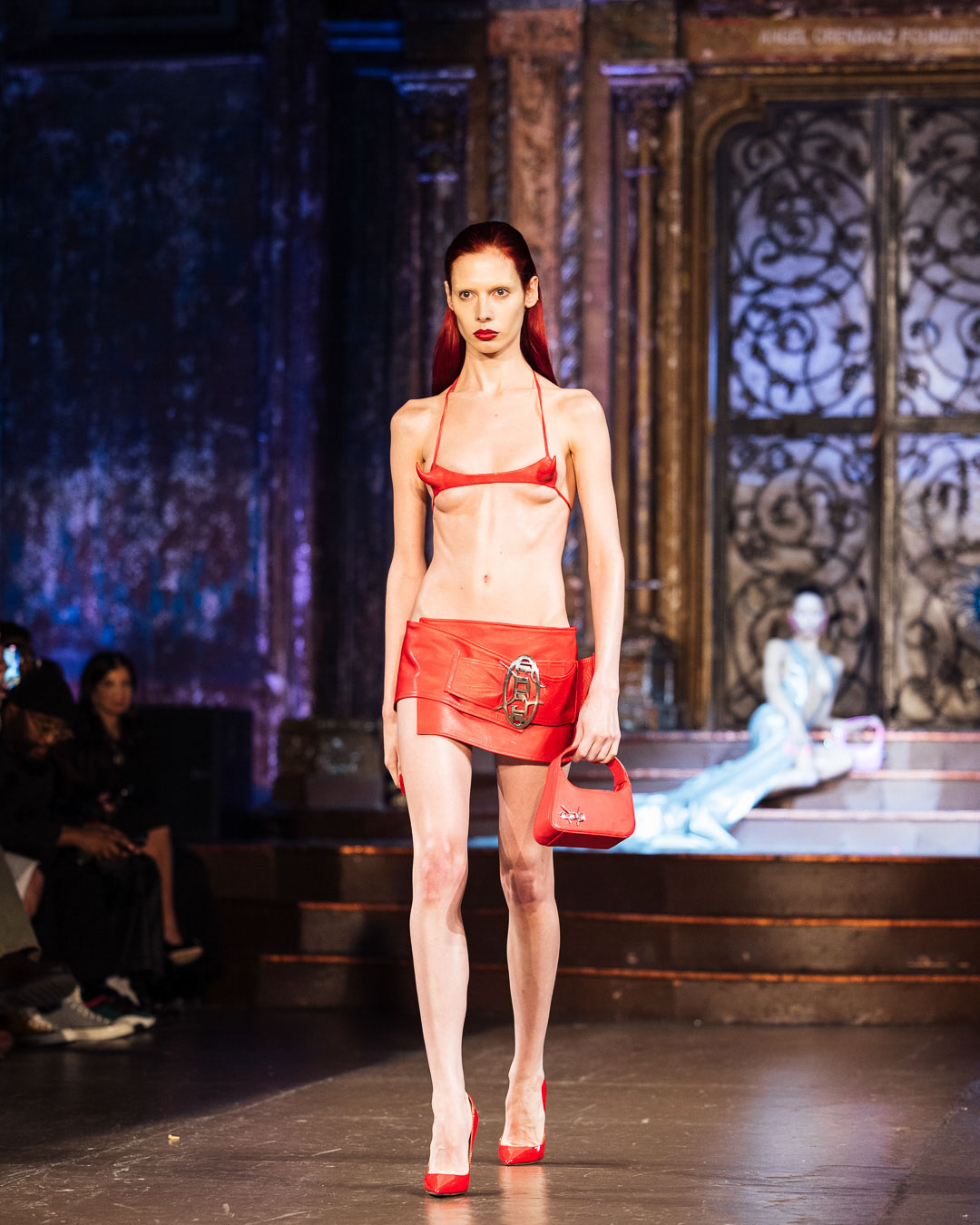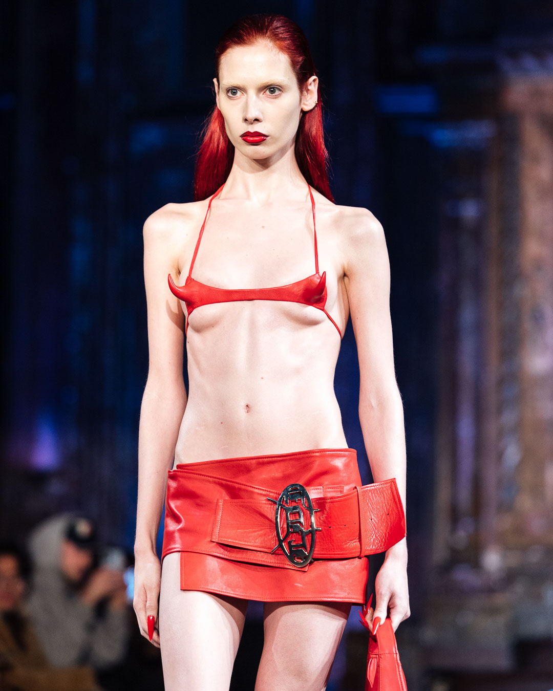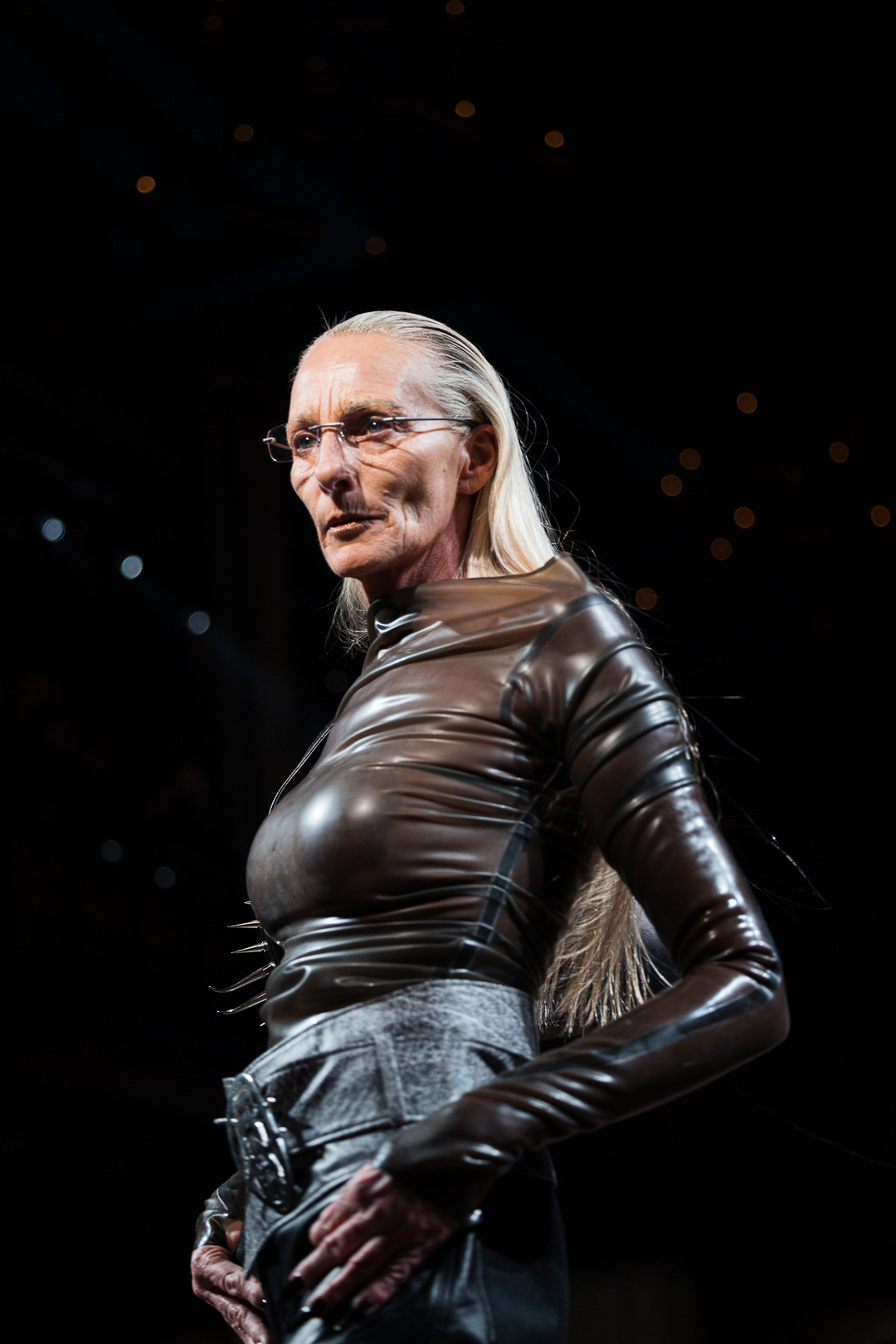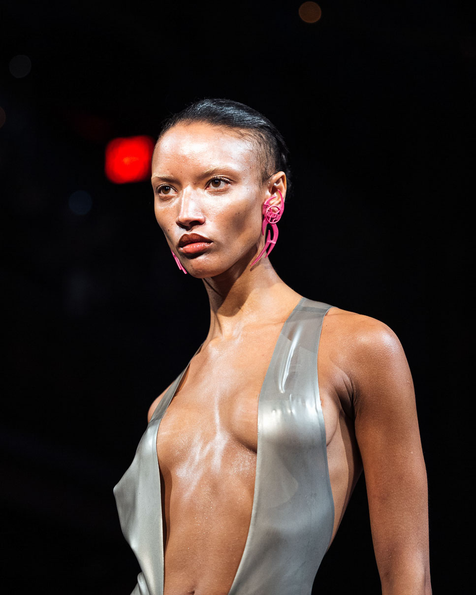 Le latex et le cuir sont présents tout au long de la collection avec des épaules pointues, de la corseterie et des traînes, avec de nombreux ourlets exagérés, dans une palette de couleurs de prune, d’argent métallique, de rouge sang et de noir profond. Le cuir gris dramatique et en détresse est imprimé sur du cuir végétal, en collaboration avec Kornit.