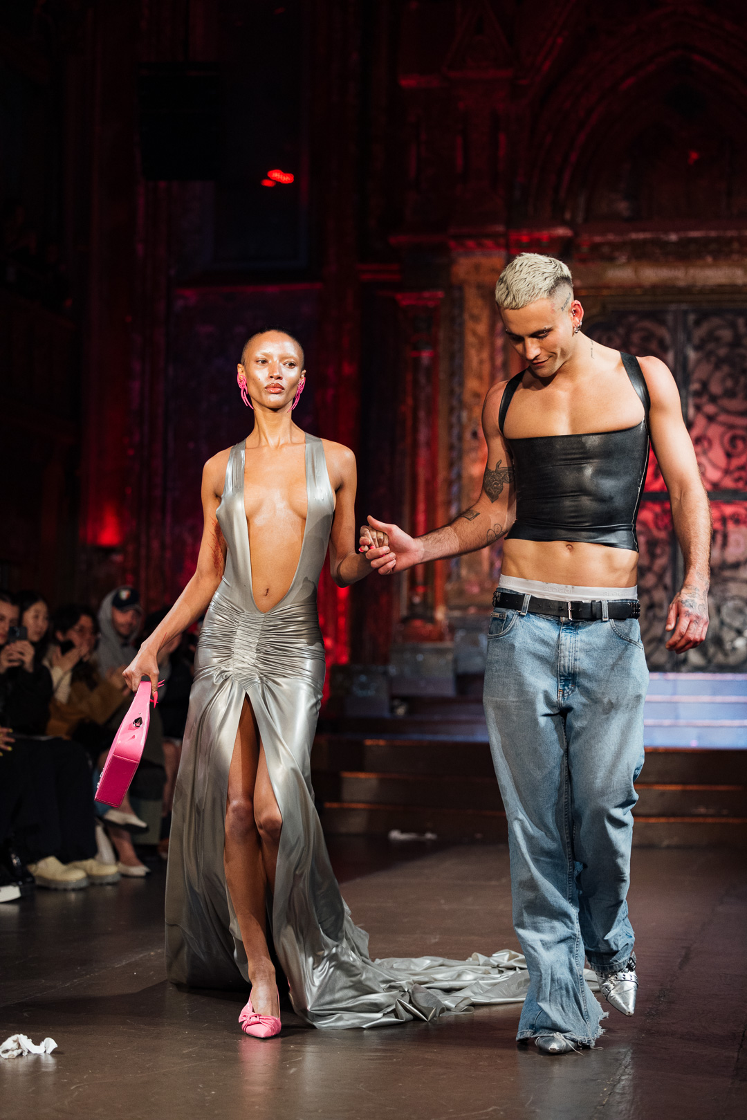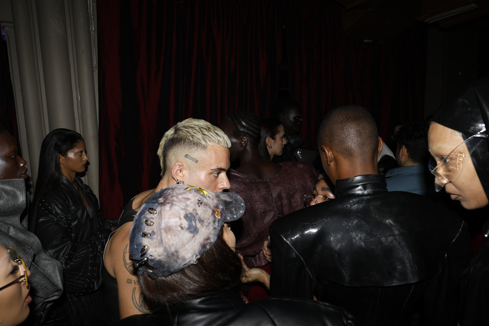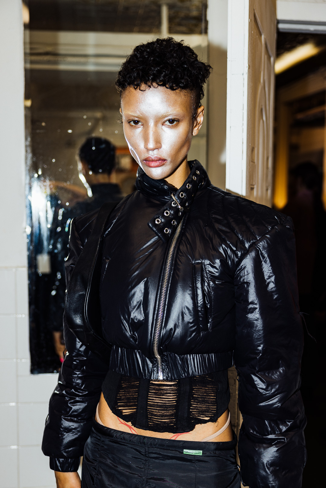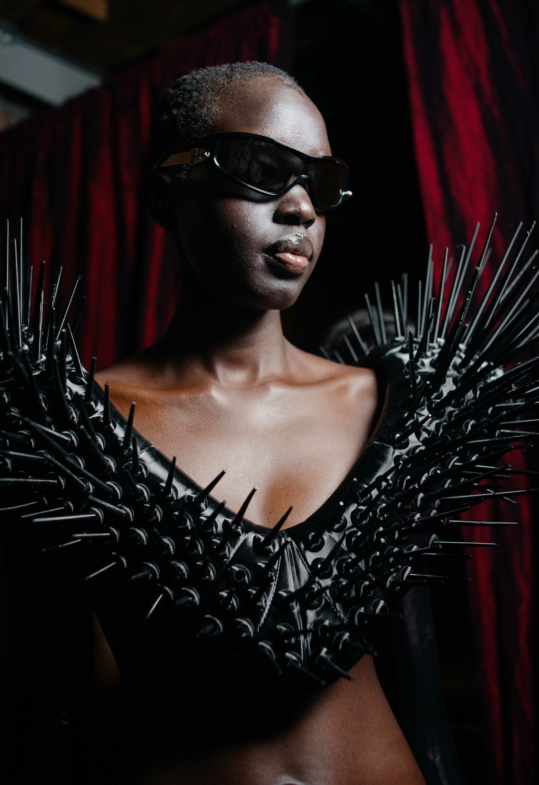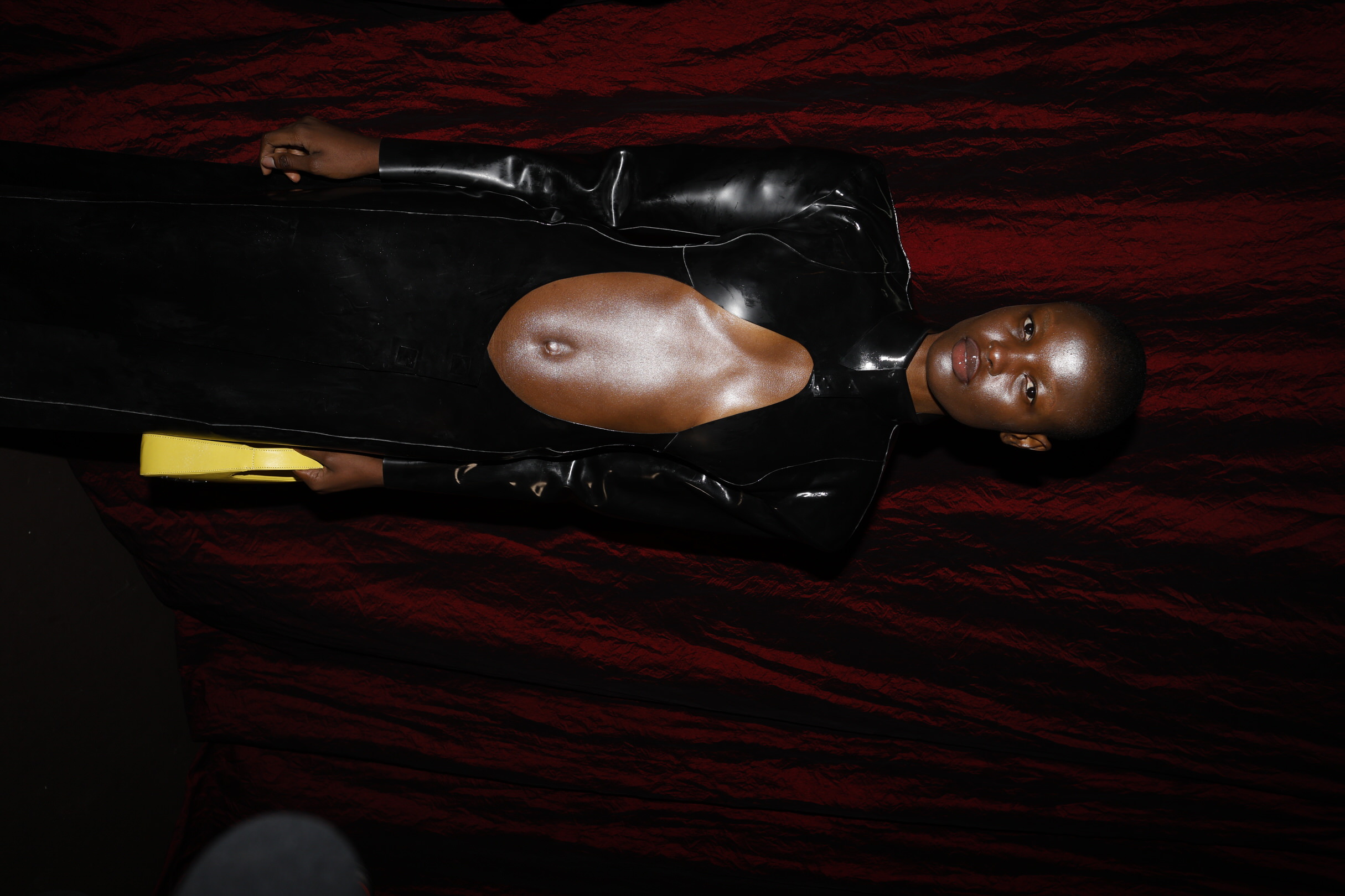 Le latex et le cuir sont présents tout au long de la collection avec des épaules pointues, de la corseterie et des traînes, avec de nombreux ourlets exagérés, dans une palette de couleurs de prune, d’argent métallique, de rouge sang et de noir profond. Le cuir gris dramatique et en détresse est imprimé sur du cuir végétal, en collaboration avec Kornit.
