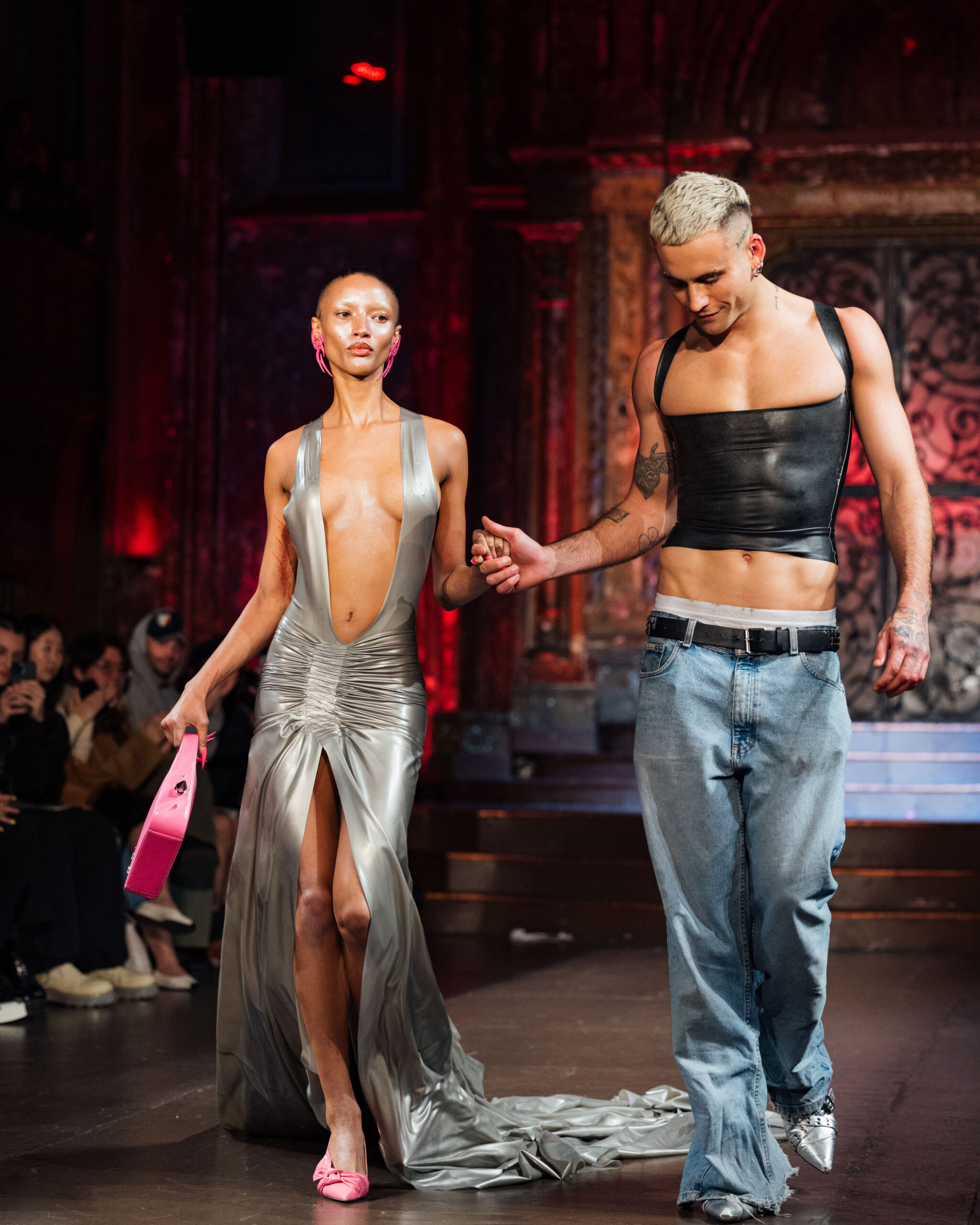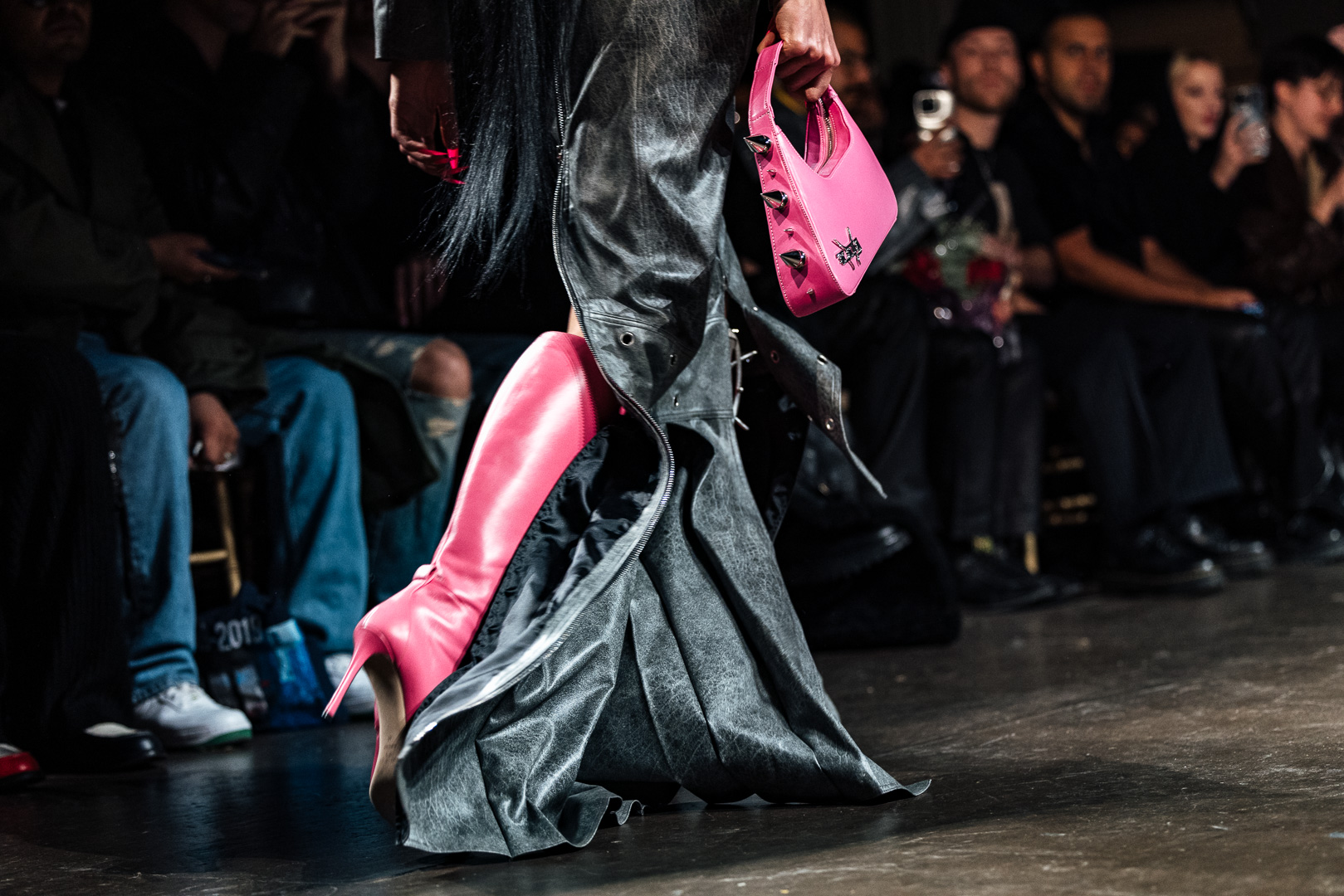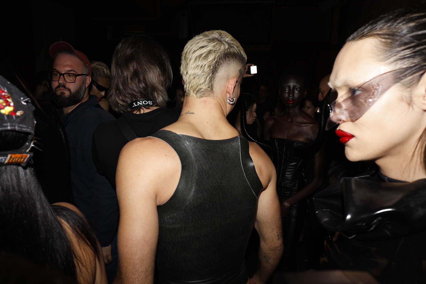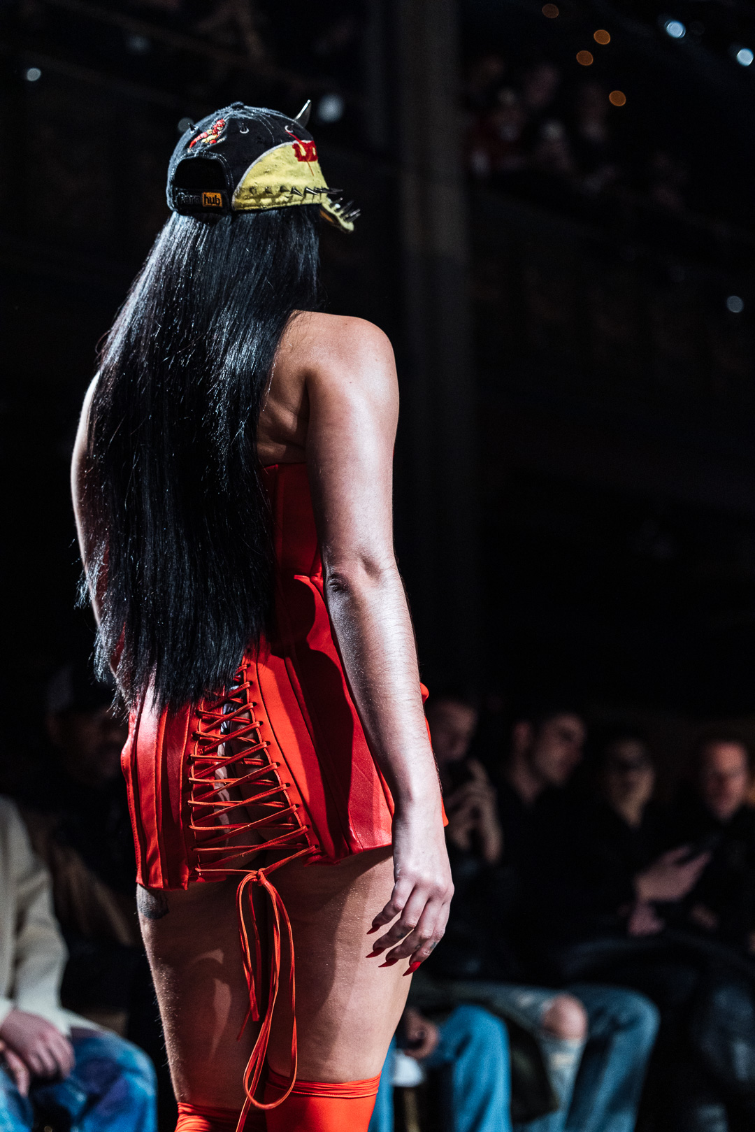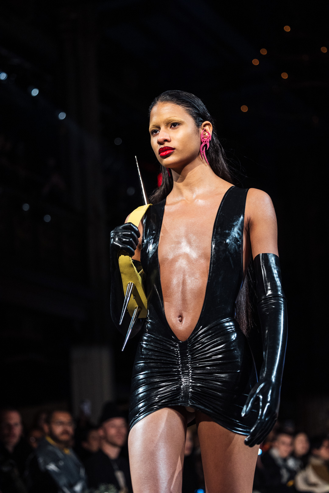 Le latex et le cuir sont présents tout au long de la collection avec des épaules pointues, de la corseterie et des traînes, avec de nombreux ourlets exagérés, dans une palette de couleurs de prune, d’argent métallique, de rouge sang et de noir profond. Le cuir gris dramatique et en détresse est imprimé sur du cuir végétal, en collaboration avec Kornit.