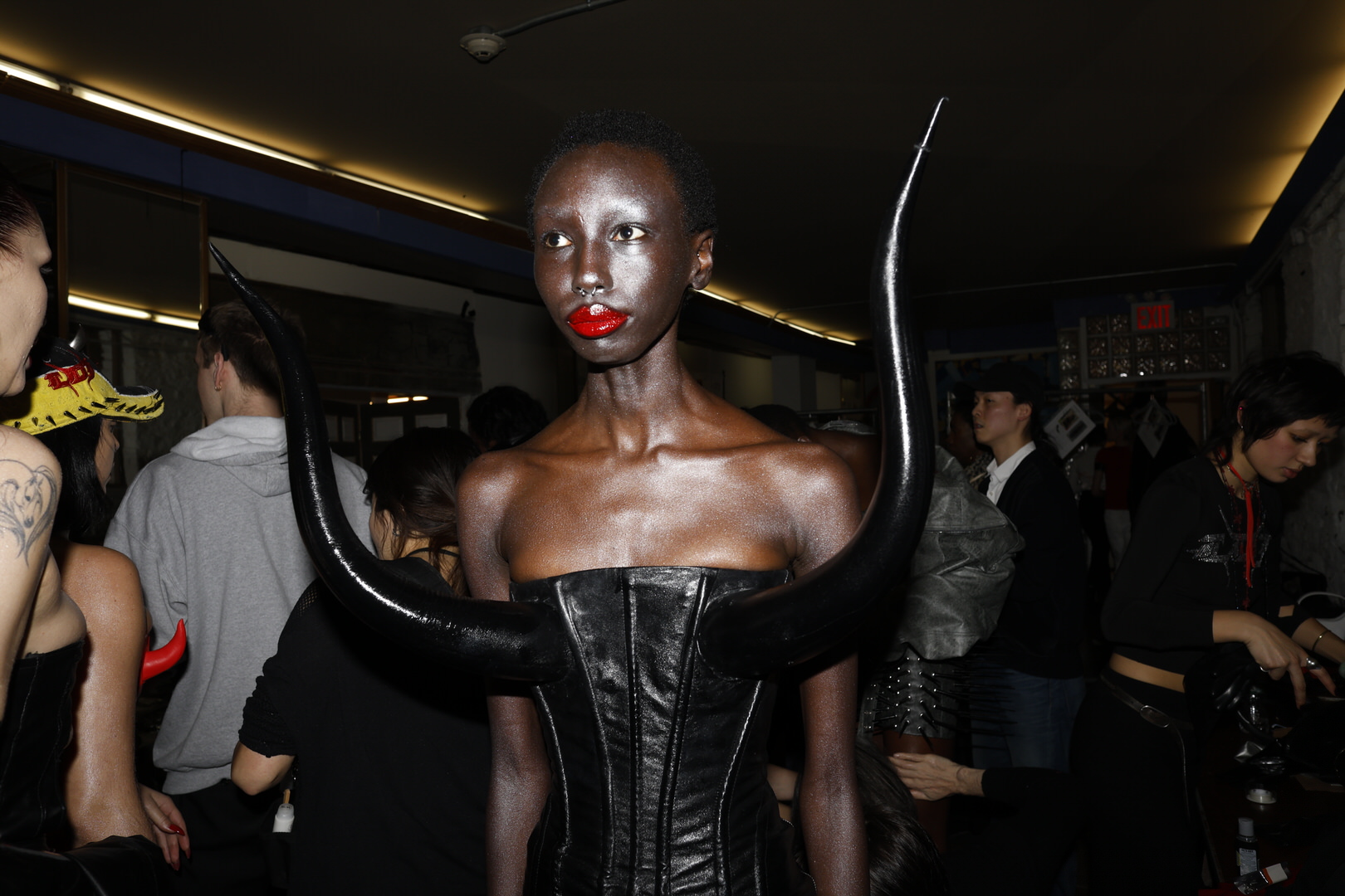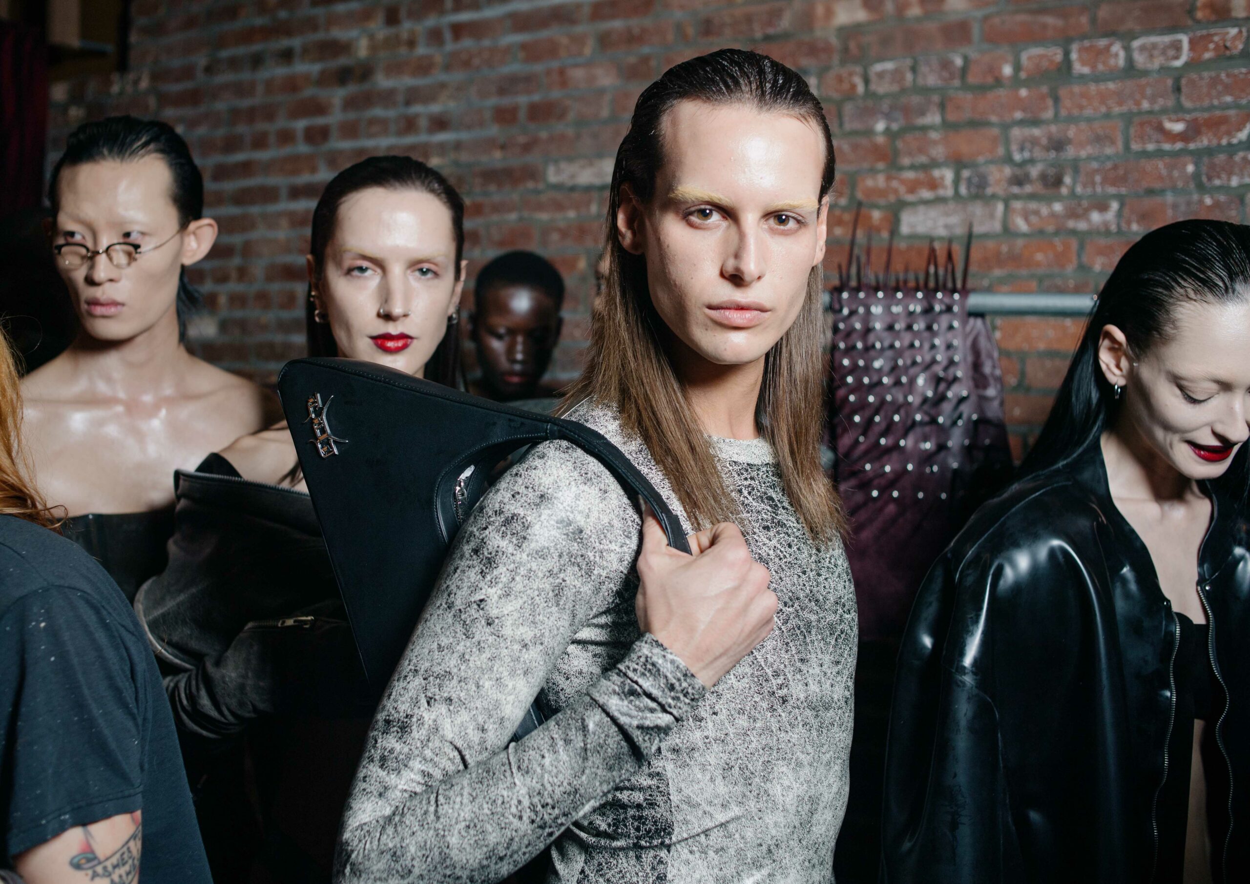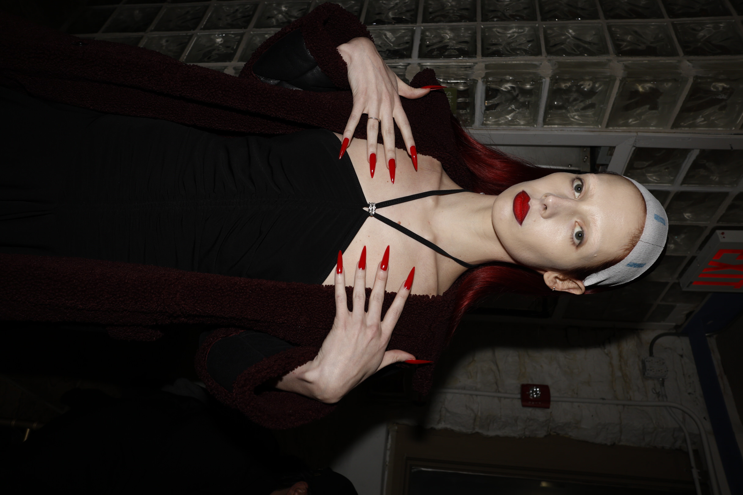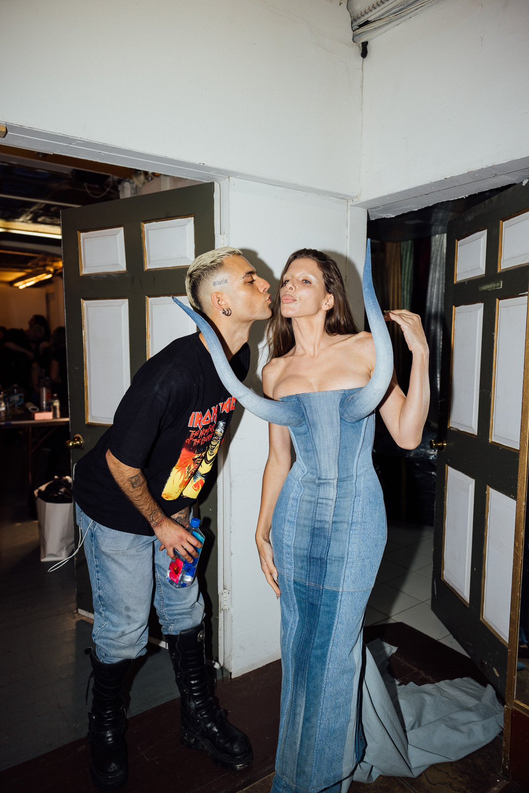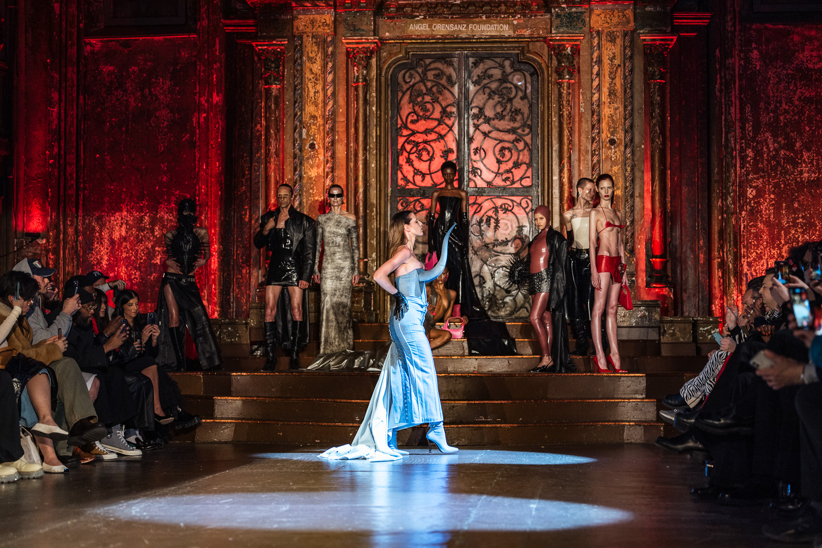 Le latex et le cuir sont présents tout au long de la collection avec des épaules pointues, de la corseterie et des traînes, avec de nombreux ourlets exagérés, dans une palette de couleurs de prune, d’argent métallique, de rouge sang et de noir profond. Le cuir gris dramatique et en détresse est imprimé sur du cuir végétal, en collaboration avec Kornit.