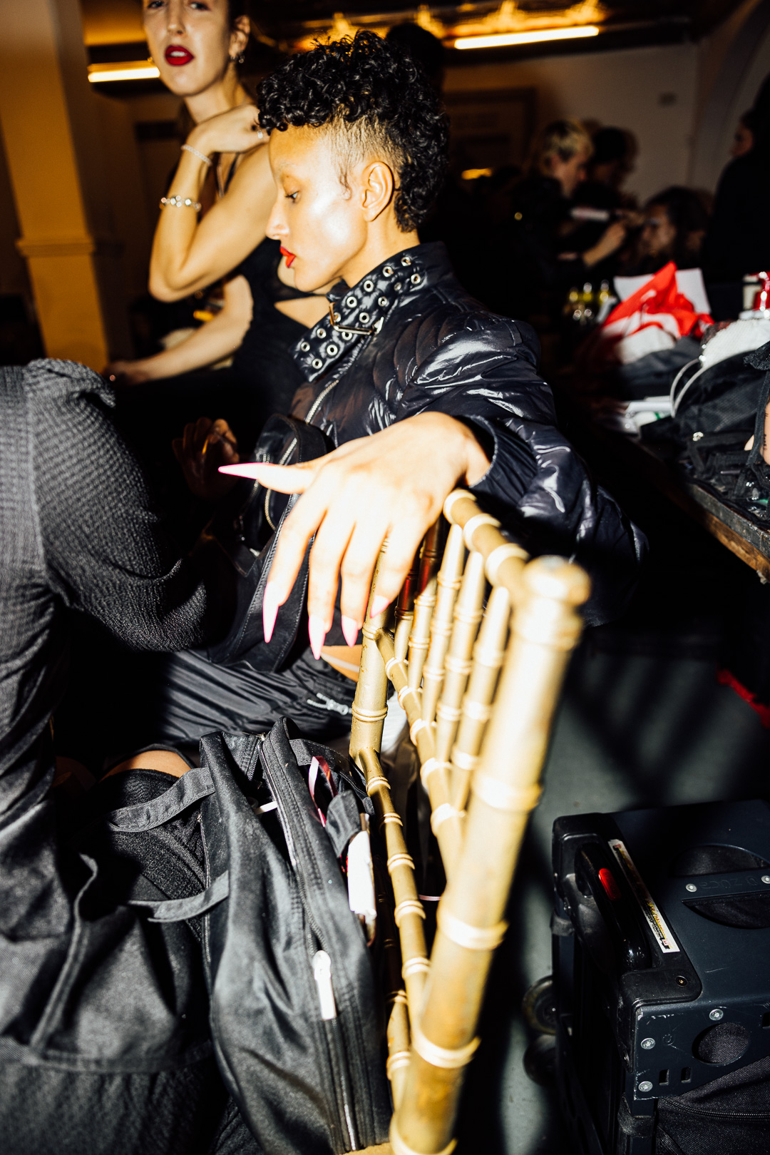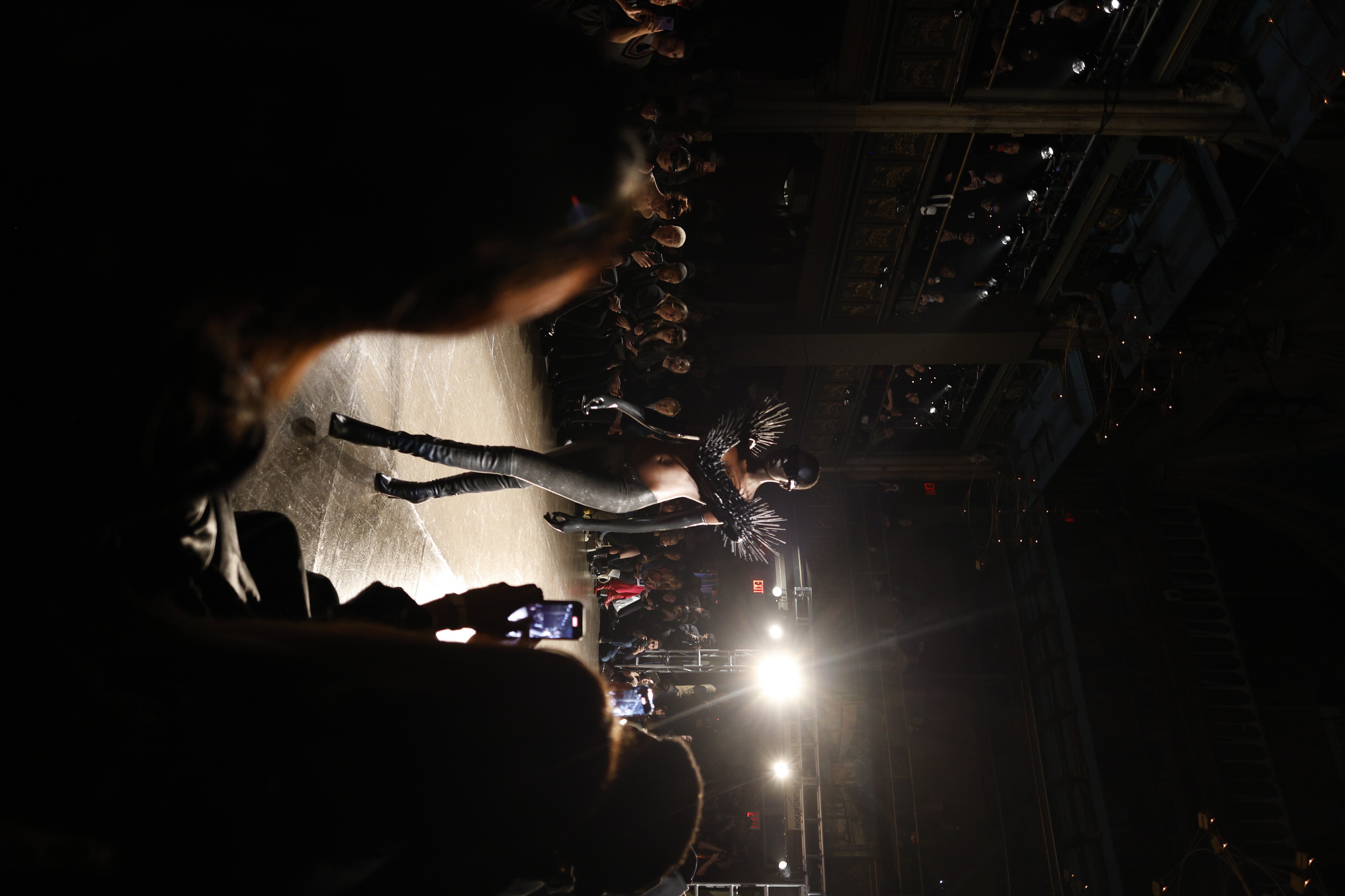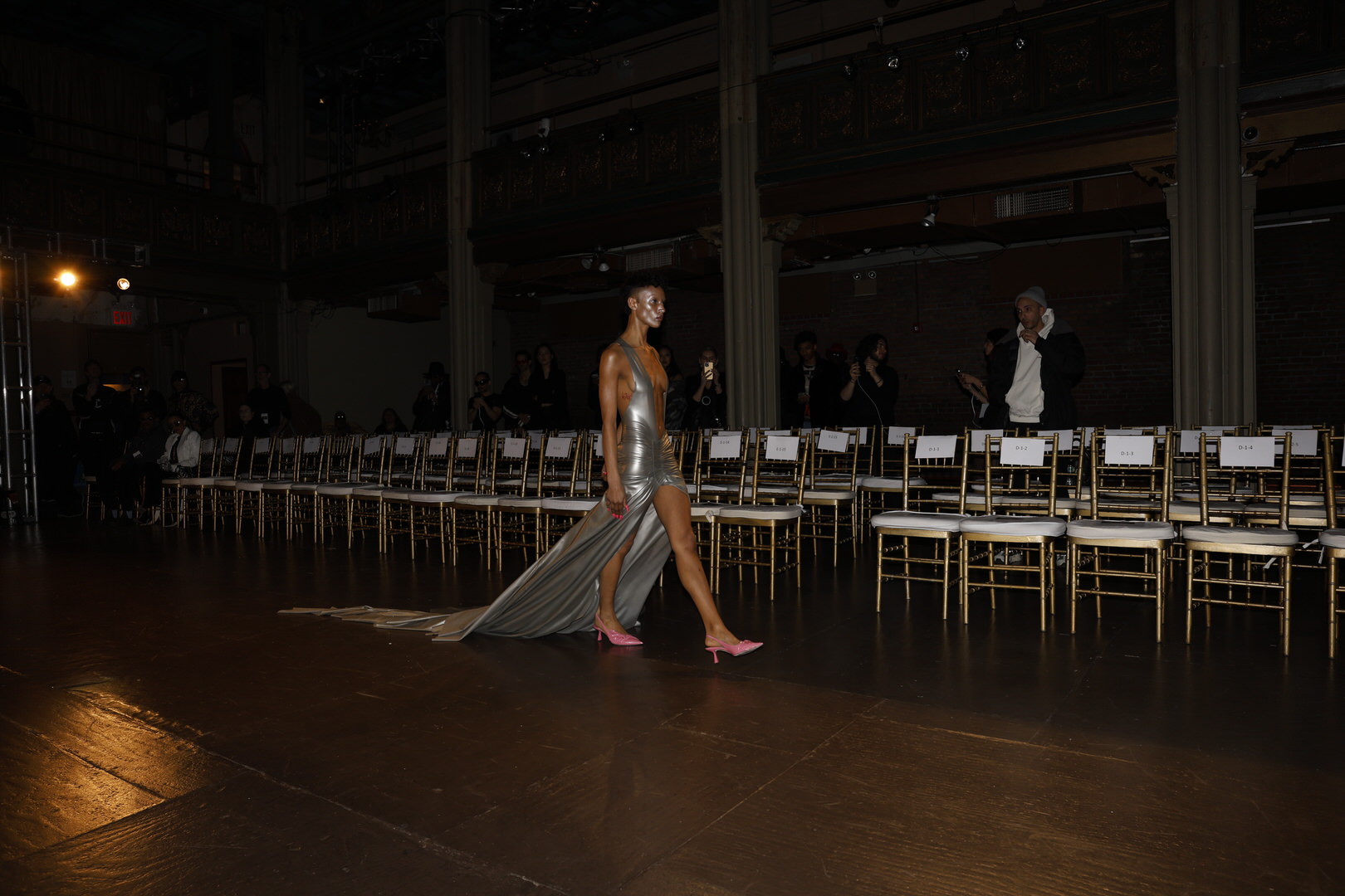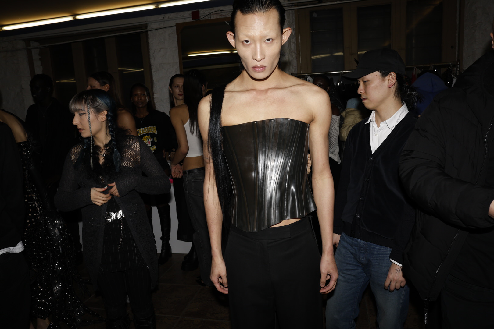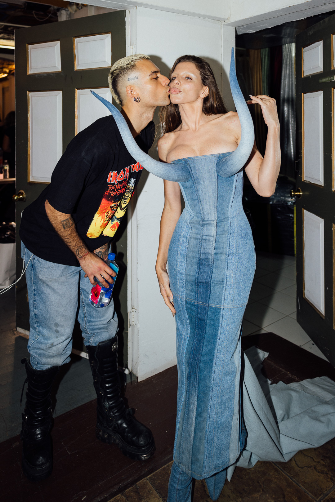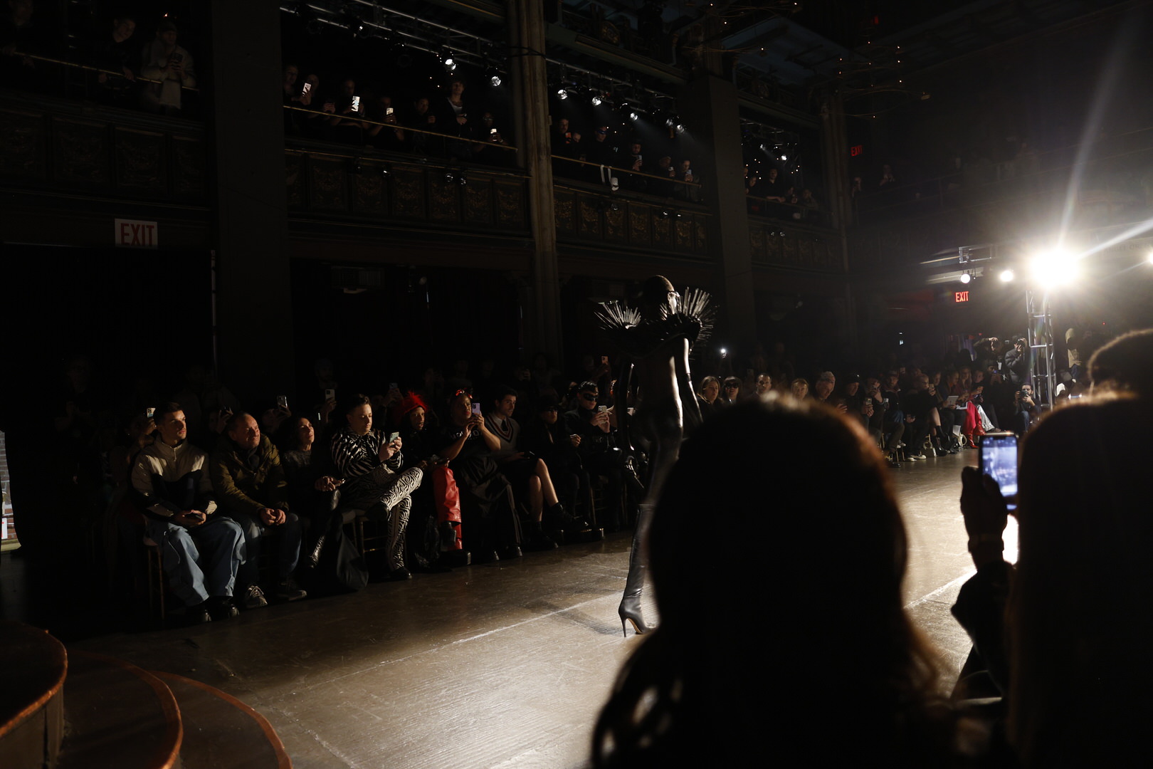 Le latex et le cuir sont présents tout au long de la collection avec des épaules pointues, de la corseterie et des traînes, avec de nombreux ourlets exagérés, dans une palette de couleurs de prune, d’argent métallique, de rouge sang et de noir profond. Le cuir gris dramatique et en détresse est imprimé sur du cuir végétal, en collaboration avec Kornit.