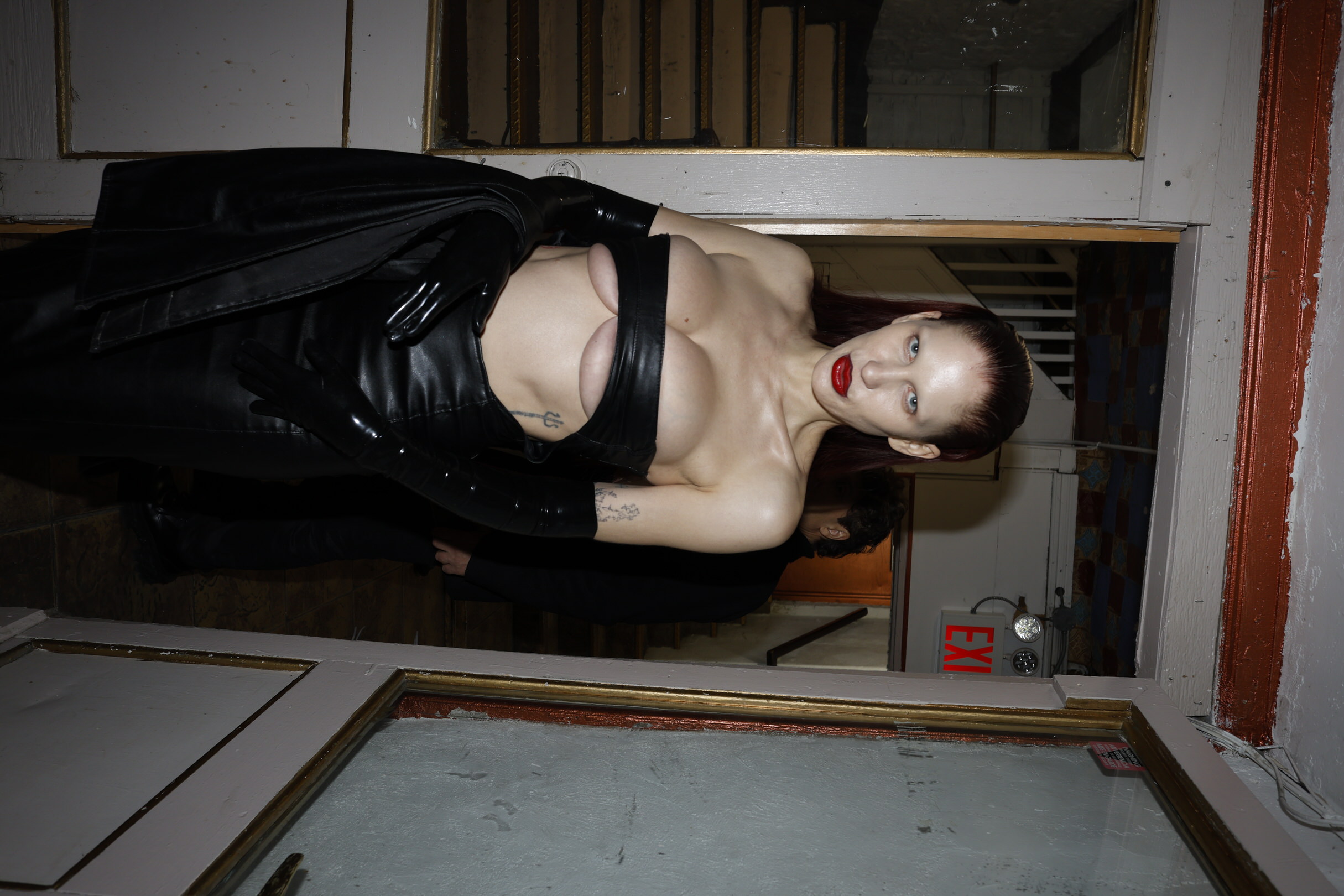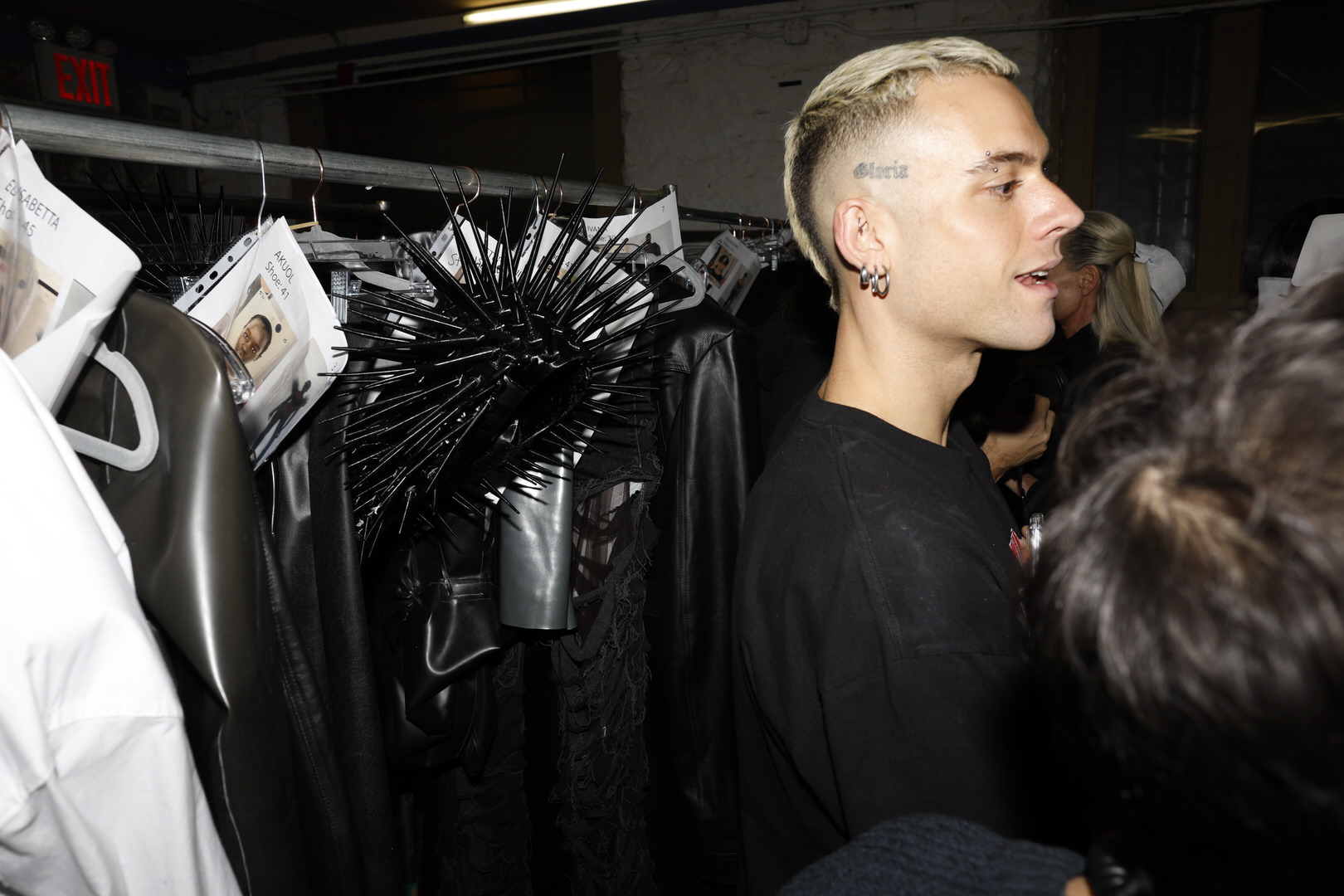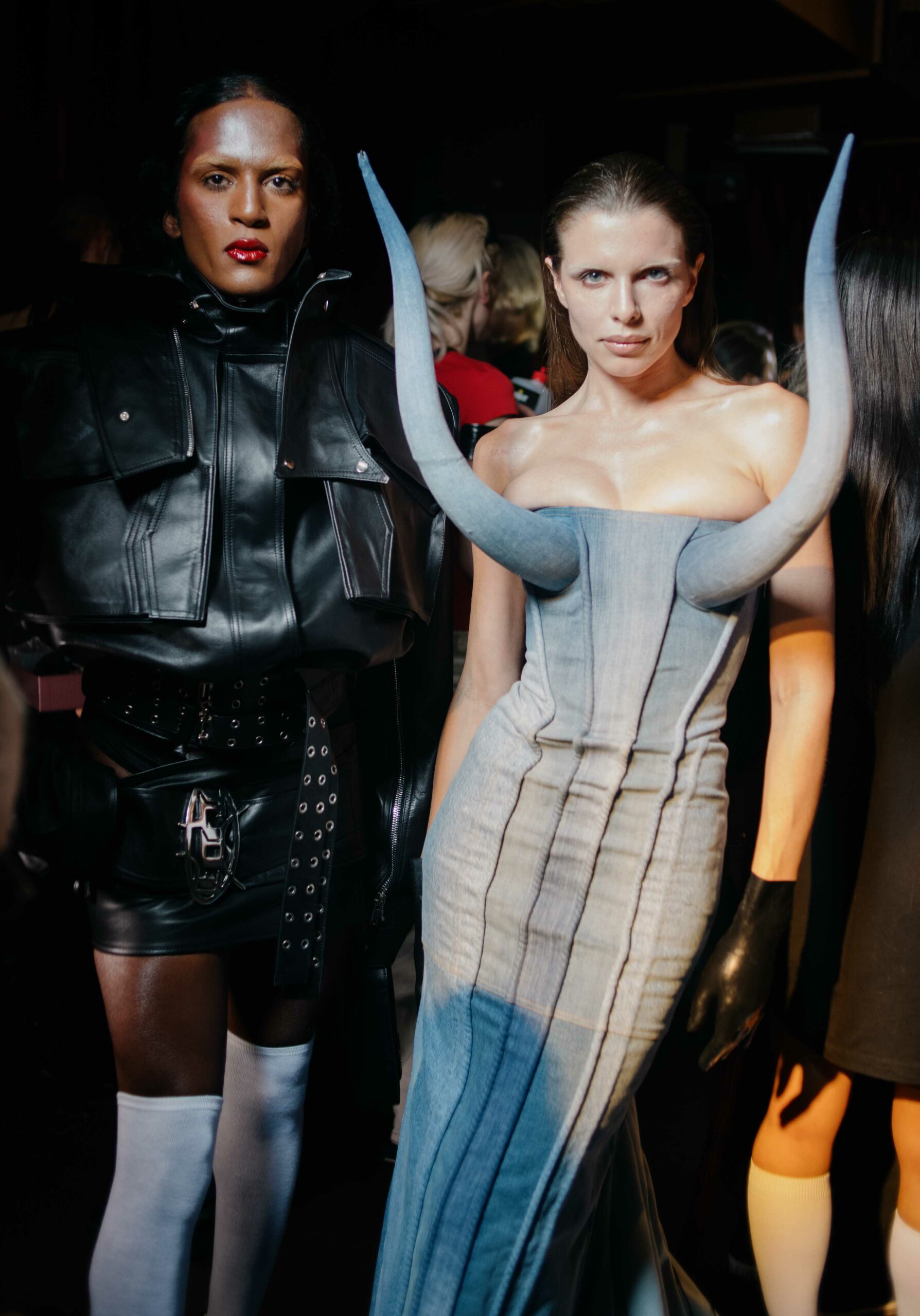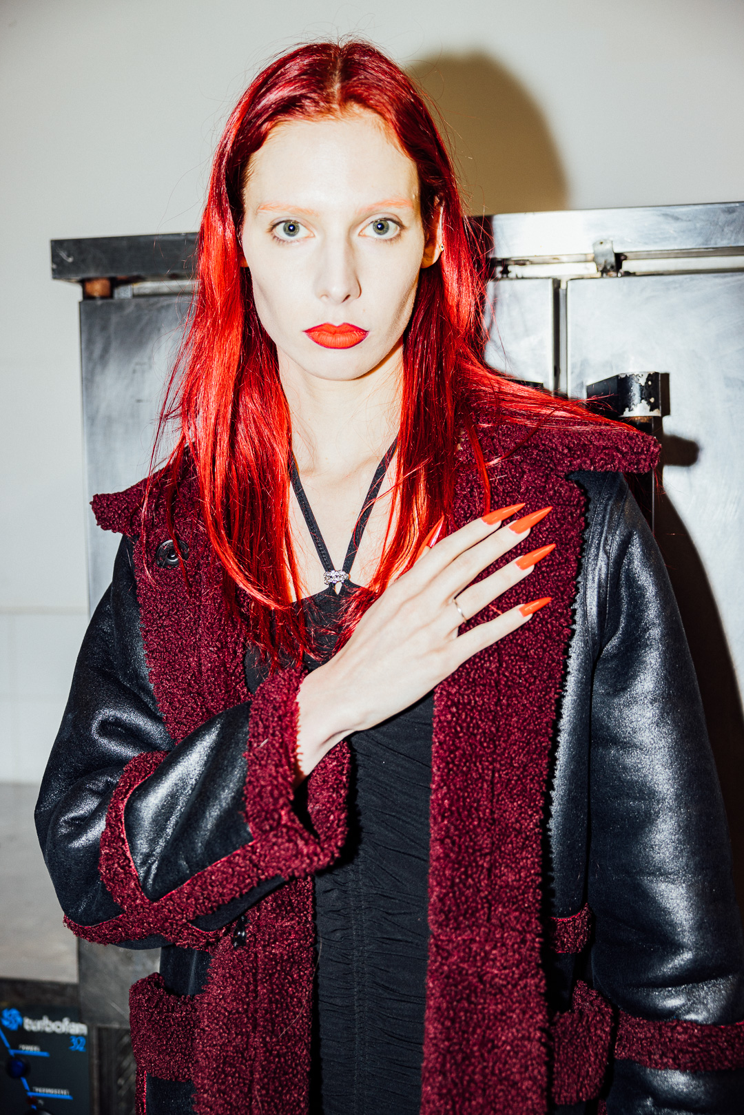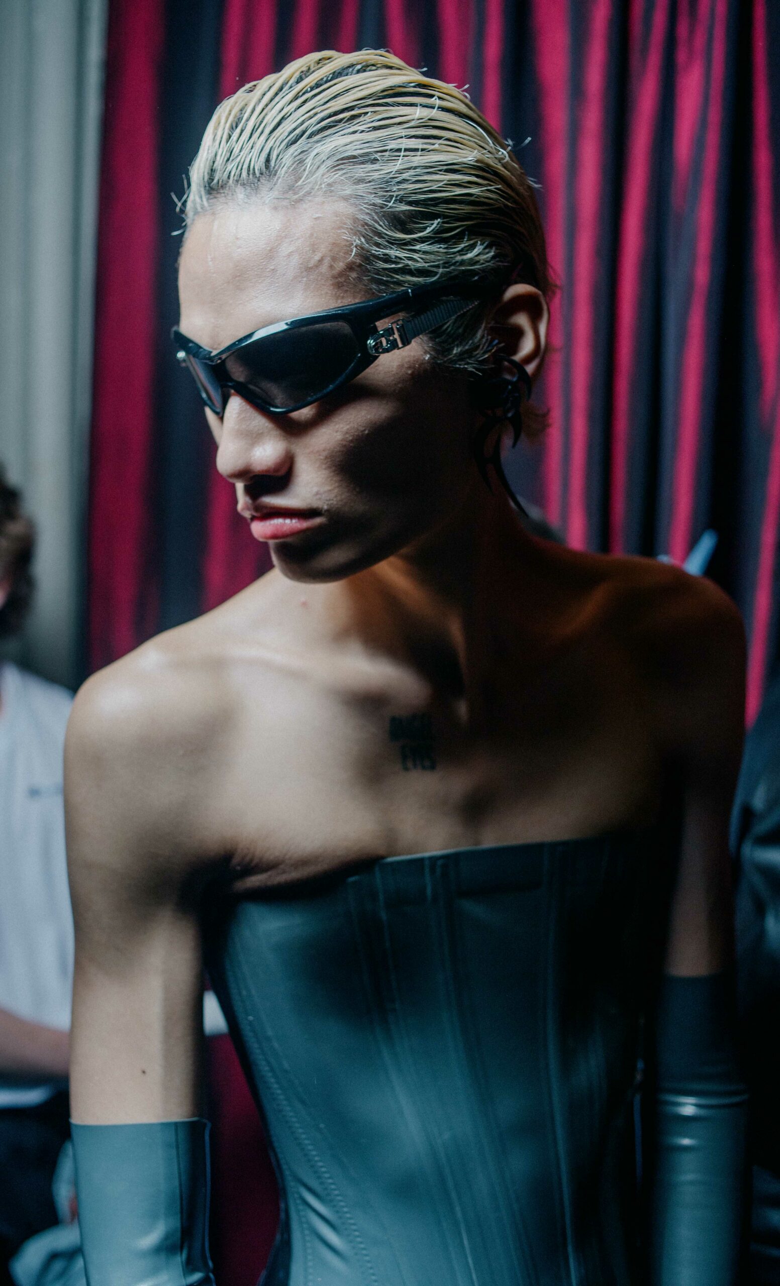 Le latex et le cuir sont présents tout au long de la collection avec des épaules pointues, de la corseterie et des traînes, avec de nombreux ourlets exagérés, dans une palette de couleurs de prune, d’argent métallique, de rouge sang et de noir profond. Le cuir gris dramatique et en détresse est imprimé sur du cuir végétal, en collaboration avec Kornit.