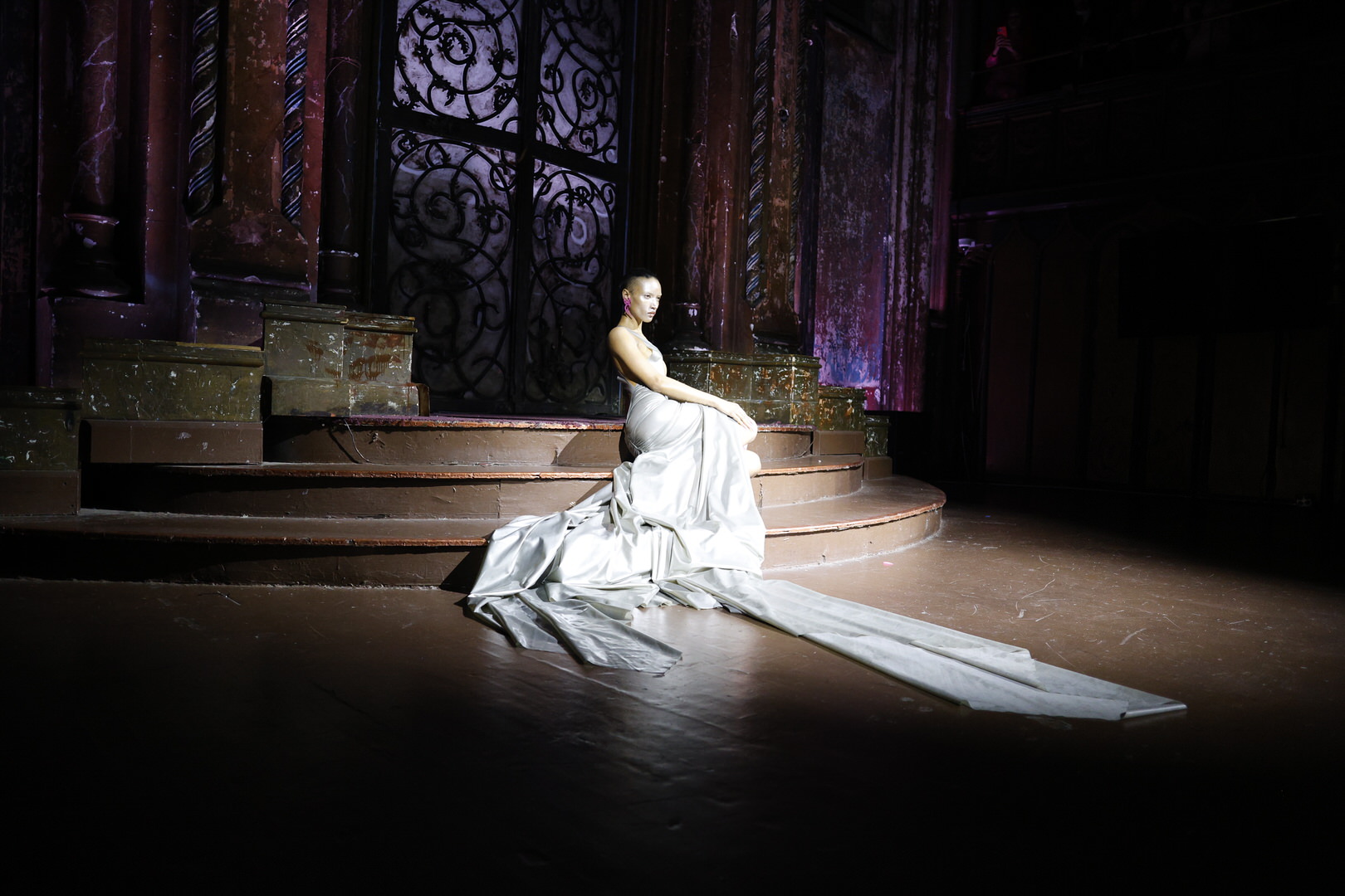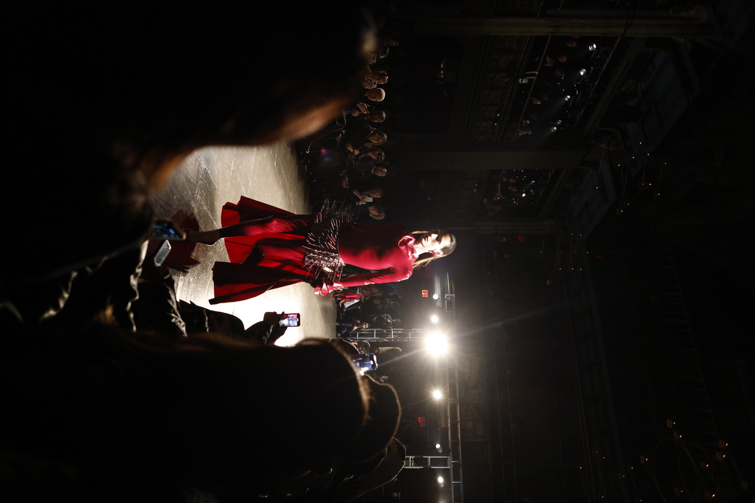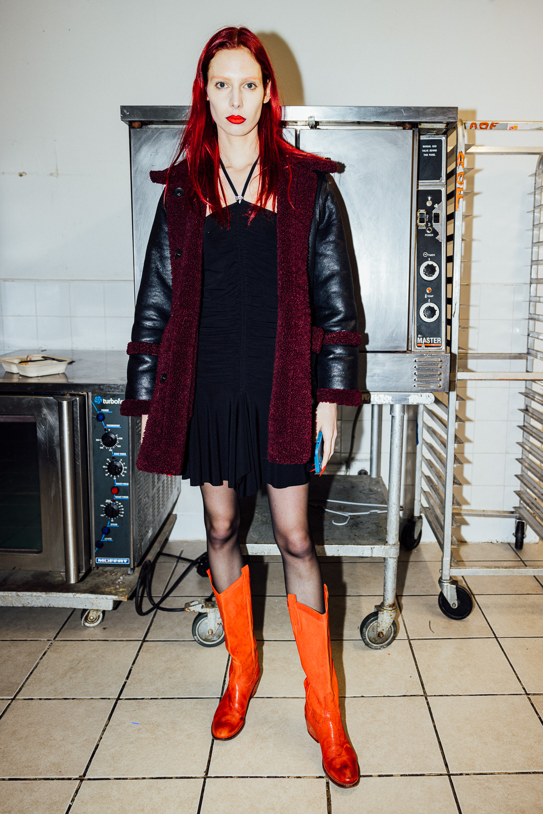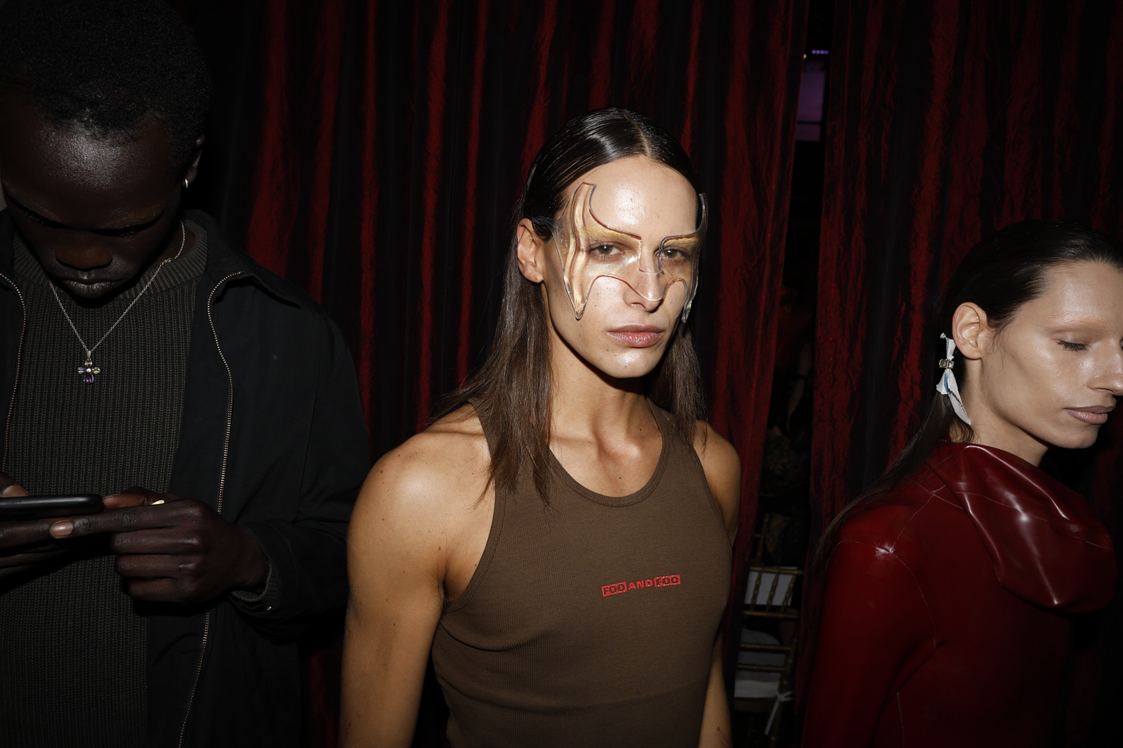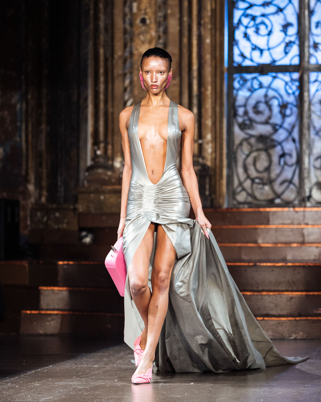 Le latex et le cuir sont présents tout au long de la collection avec des épaules pointues, de la corseterie et des traînes, avec de nombreux ourlets exagérés, dans une palette de couleurs de prune, d’argent métallique, de rouge sang et de noir profond. Le cuir gris dramatique et en détresse est imprimé sur du cuir végétal, en collaboration avec Kornit.