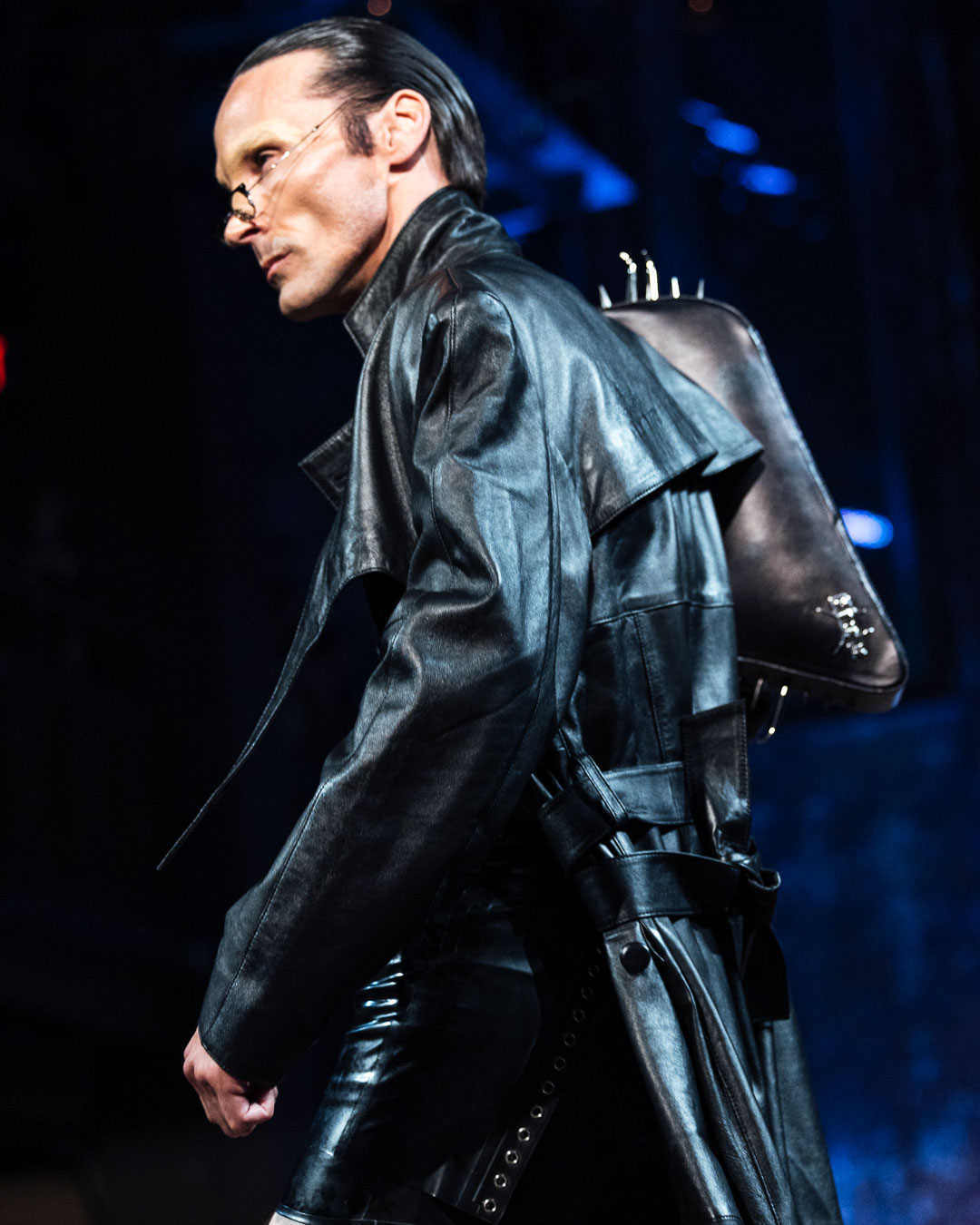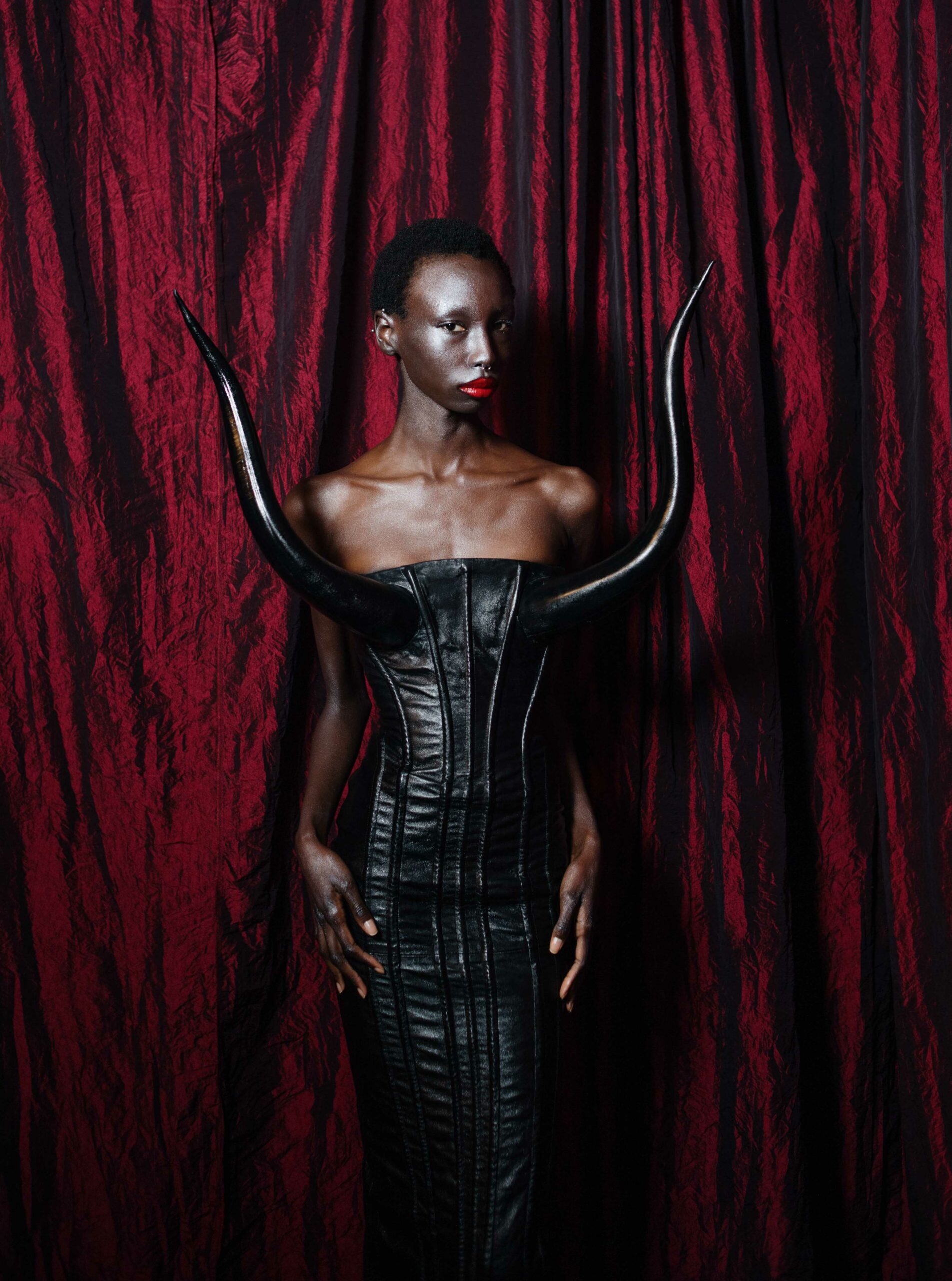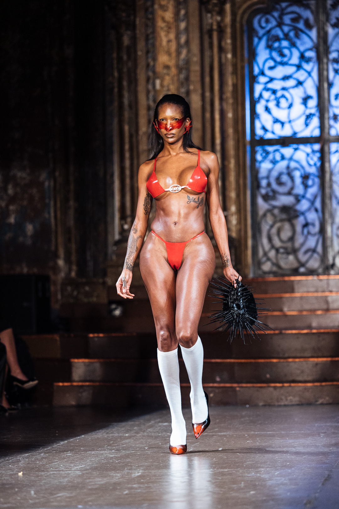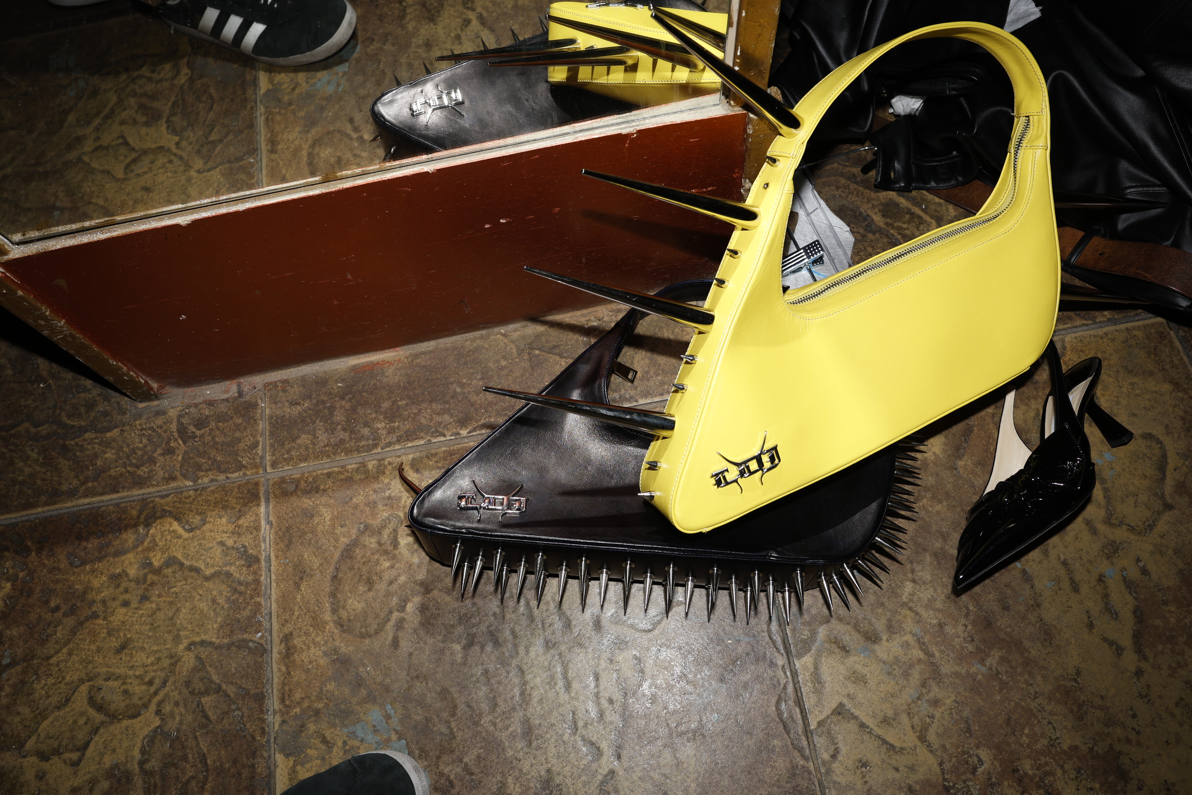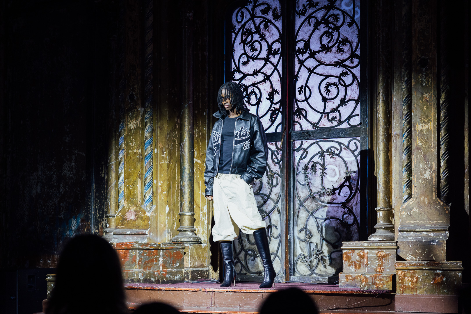 Le latex et le cuir sont présents tout au long de la collection avec des épaules pointues, de la corseterie et des traînes, avec de nombreux ourlets exagérés, dans une palette de couleurs de prune, d’argent métallique, de rouge sang et de noir profond. Le cuir gris dramatique et en détresse est imprimé sur du cuir végétal, en collaboration avec Kornit.