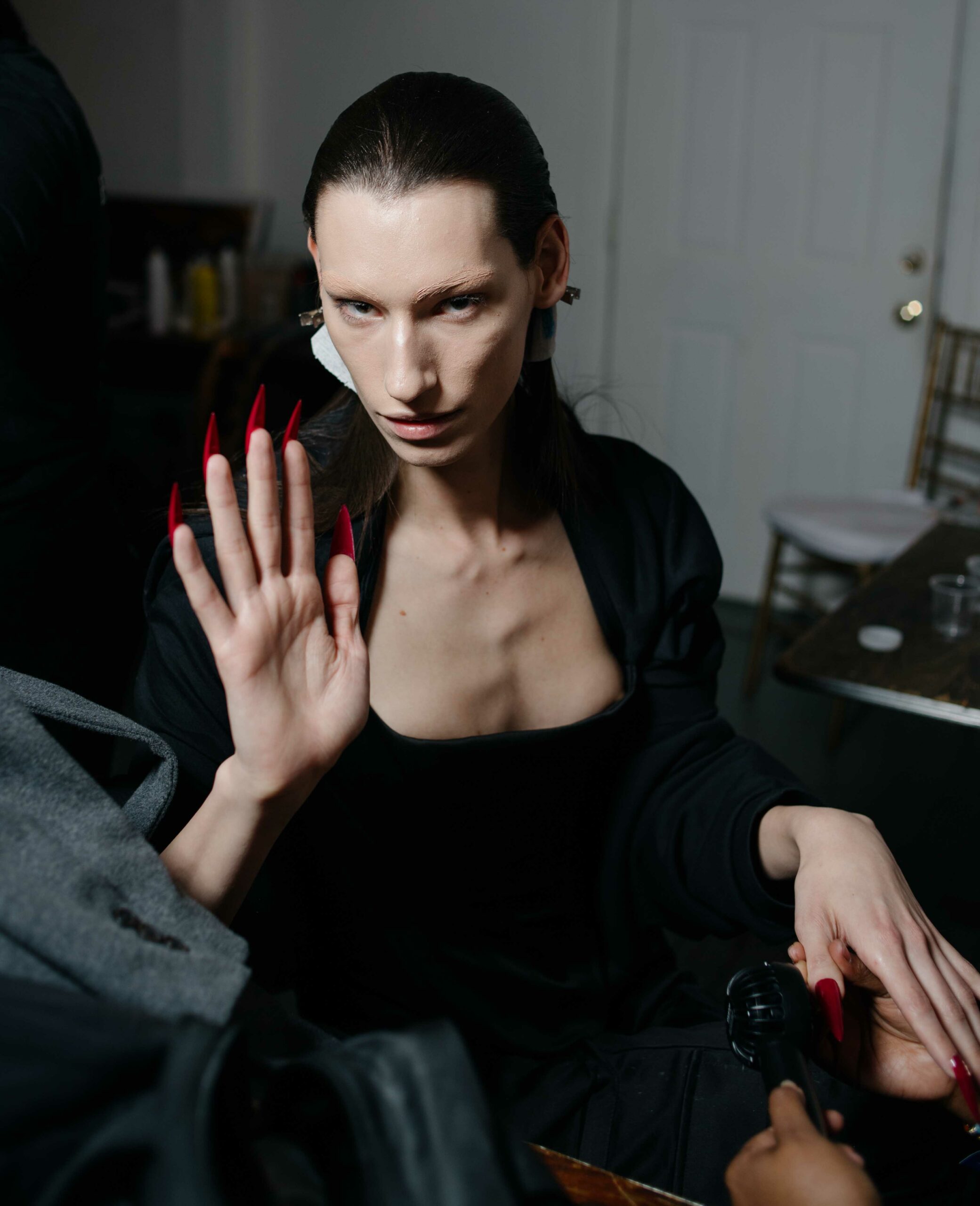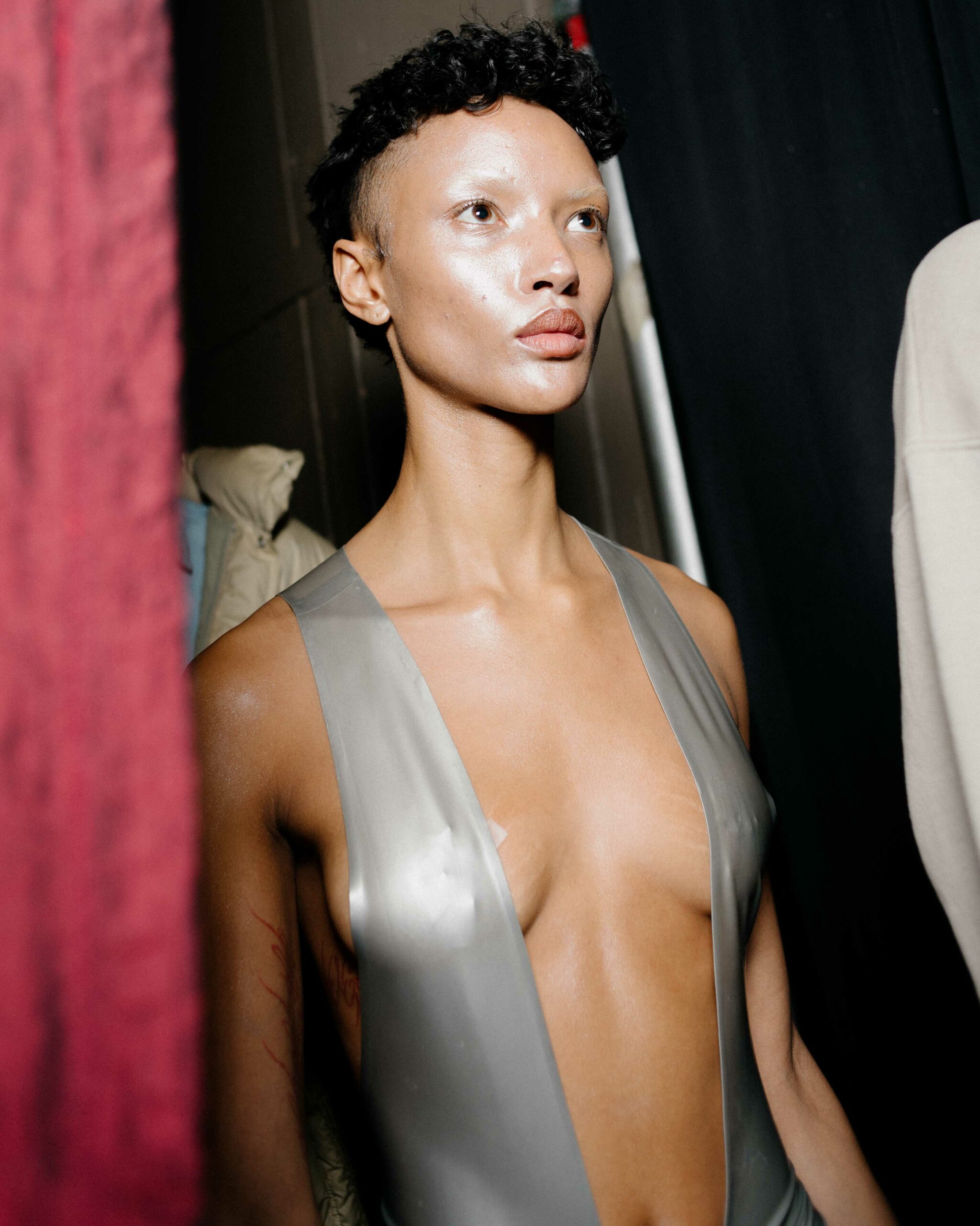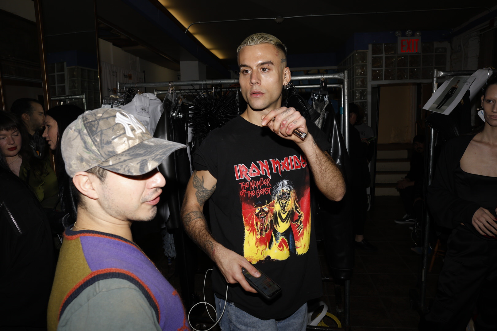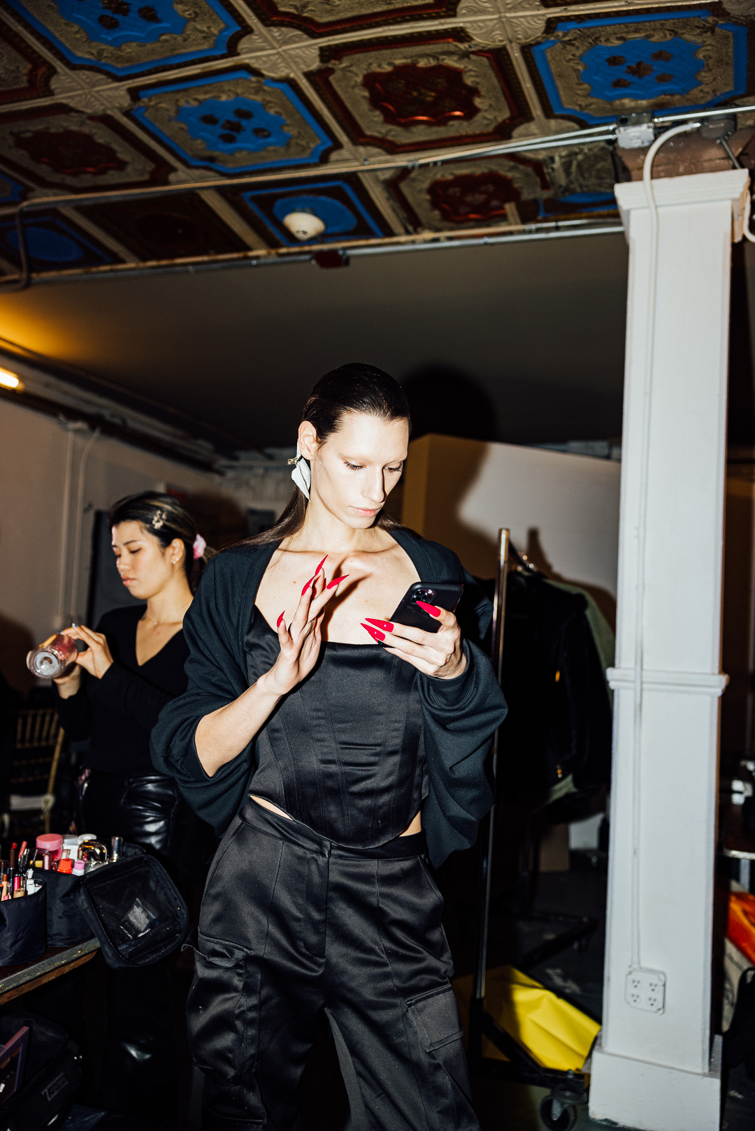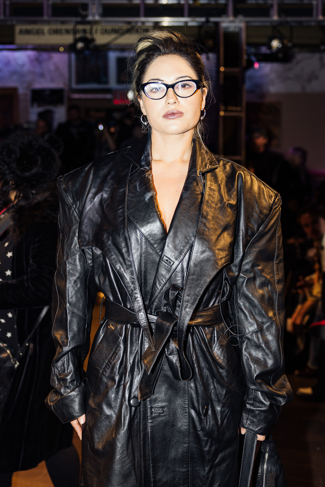 Le latex et le cuir sont présents tout au long de la collection avec des épaules pointues, de la corseterie et des traînes, avec de nombreux ourlets exagérés, dans une palette de couleurs de prune, d’argent métallique, de rouge sang et de noir profond. Le cuir gris dramatique et en détresse est imprimé sur du cuir végétal, en collaboration avec Kornit.