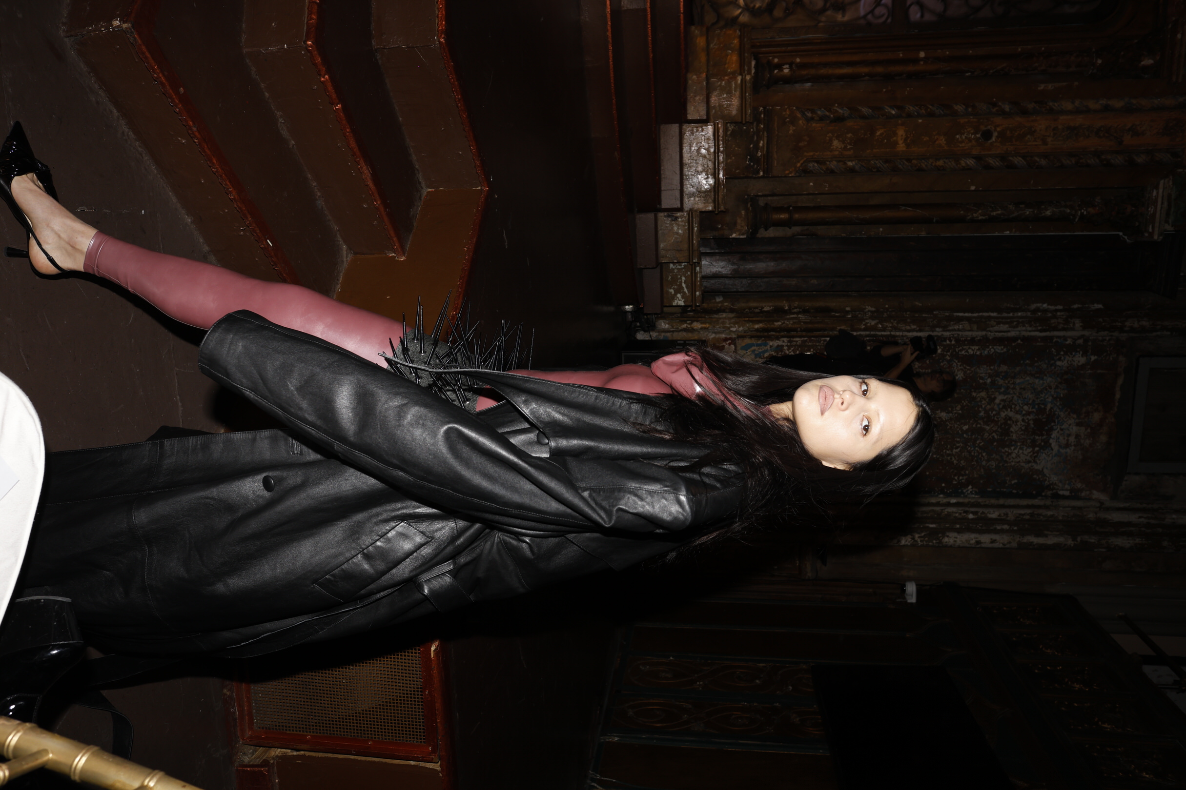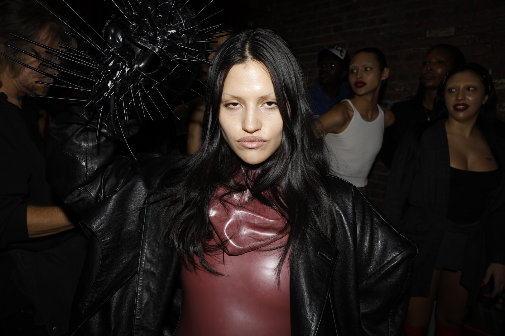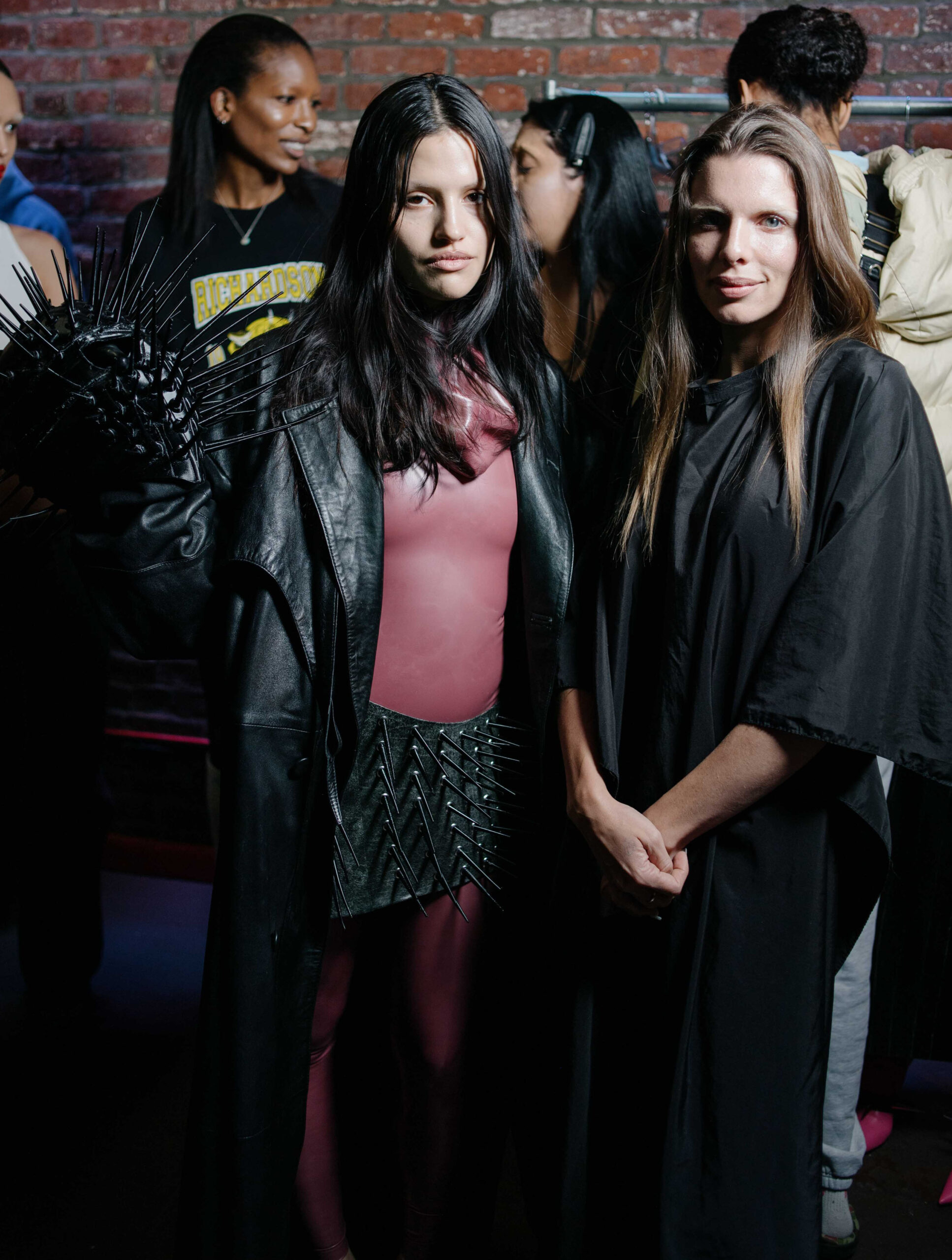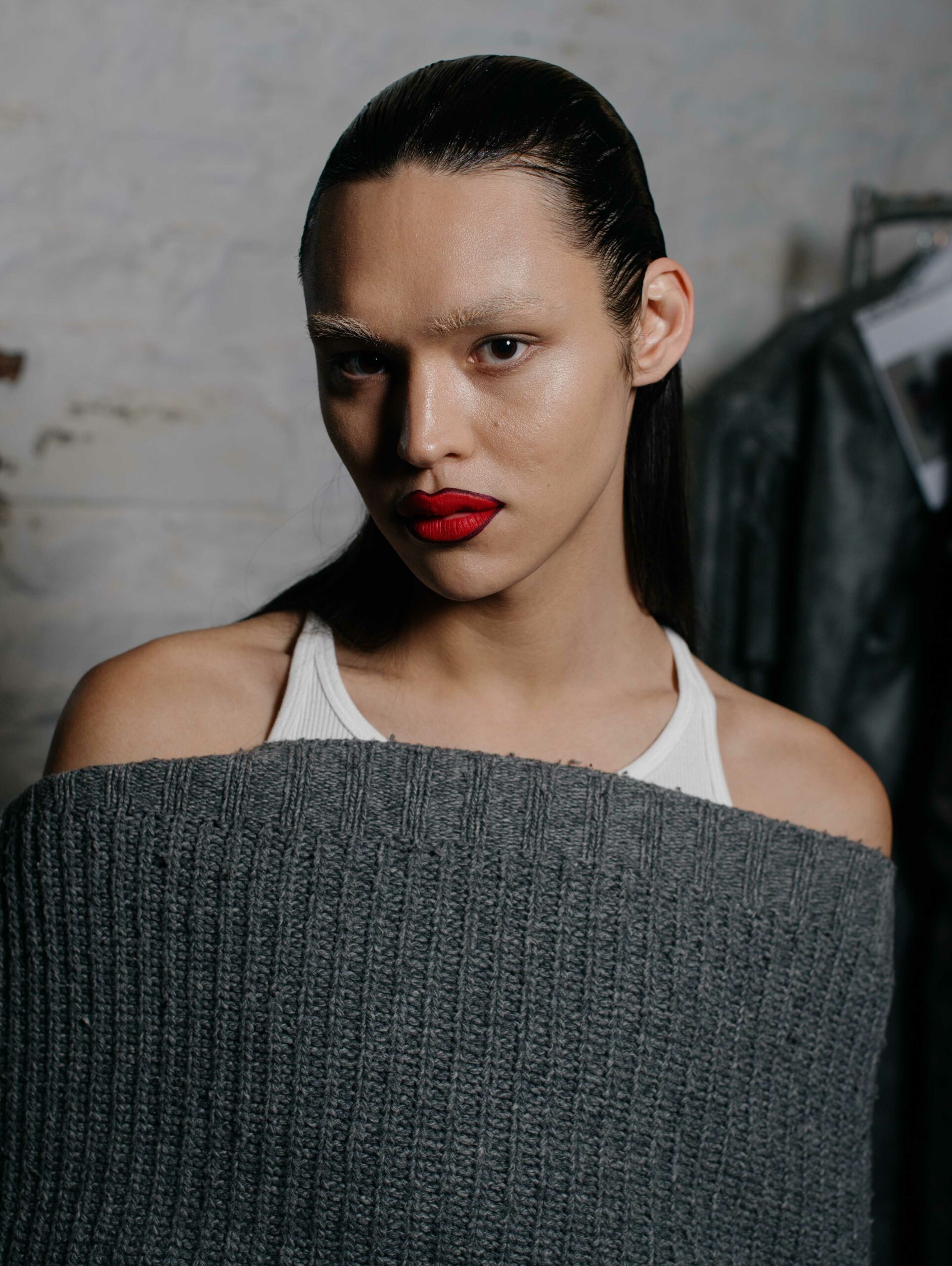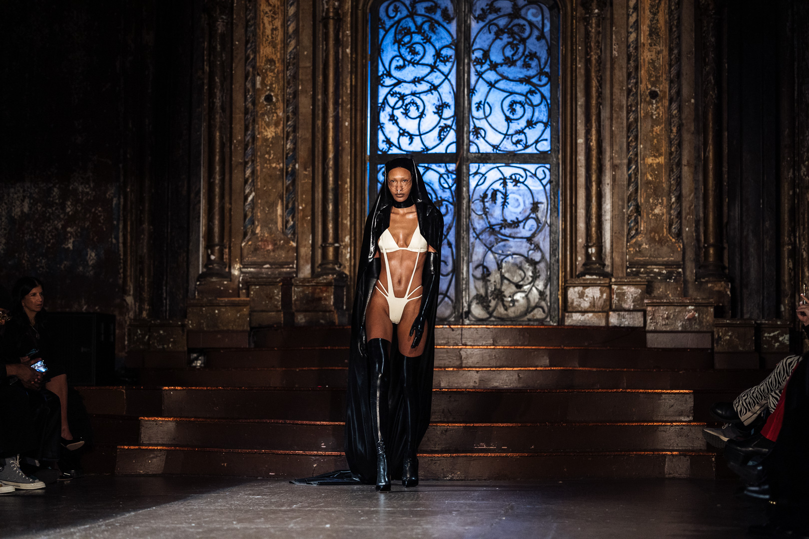 Le latex et le cuir sont présents tout au long de la collection avec des épaules pointues, de la corseterie et des traînes, avec de nombreux ourlets exagérés, dans une palette de couleurs de prune, d’argent métallique, de rouge sang et de noir profond. Le cuir gris dramatique et en détresse est imprimé sur du cuir végétal, en collaboration avec Kornit.