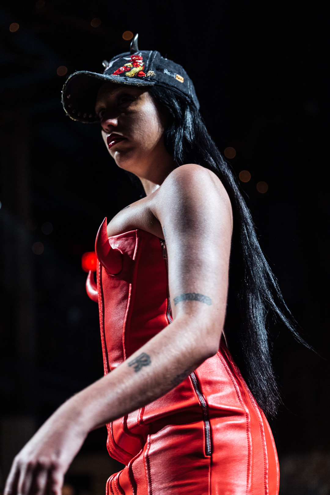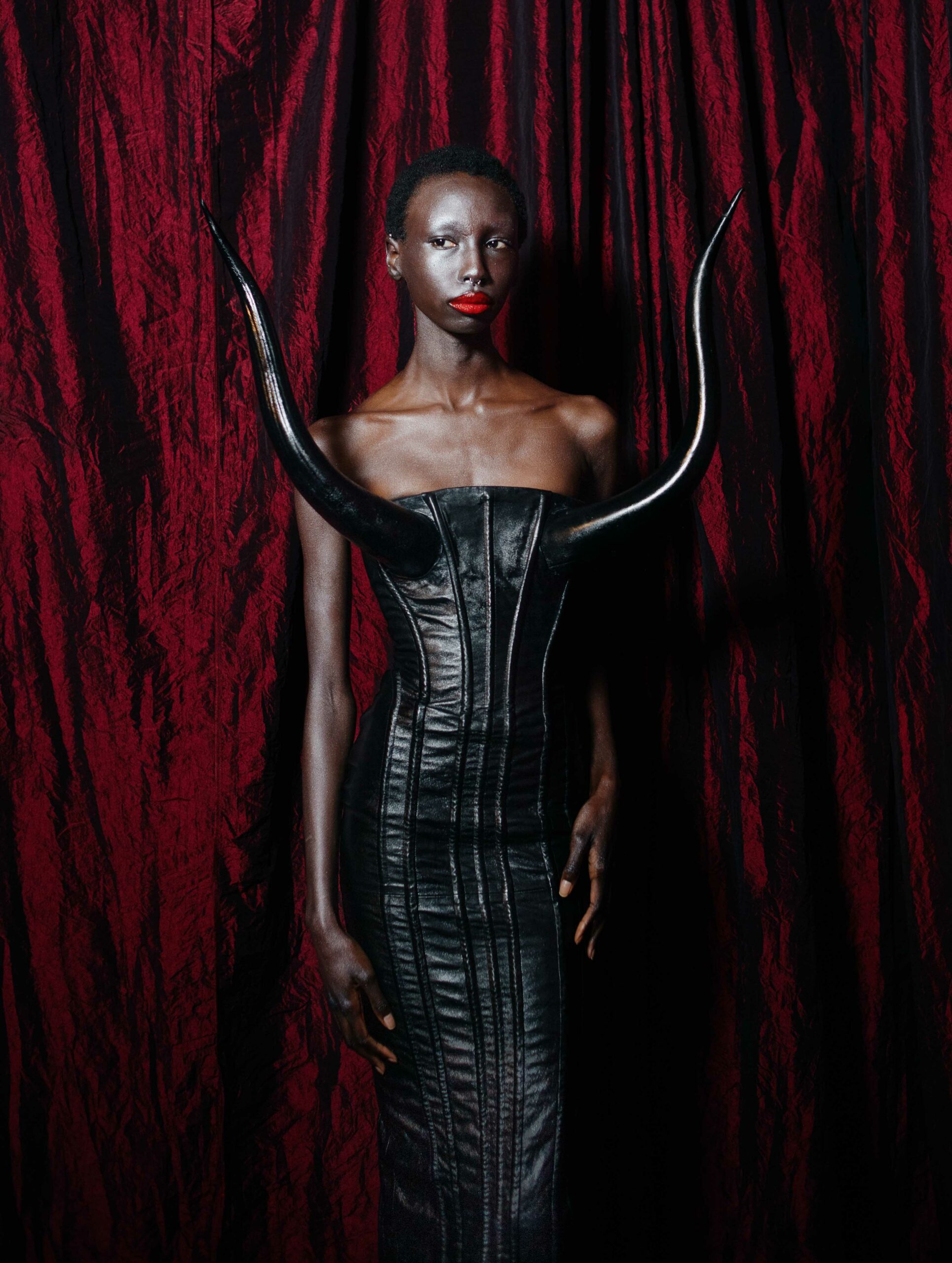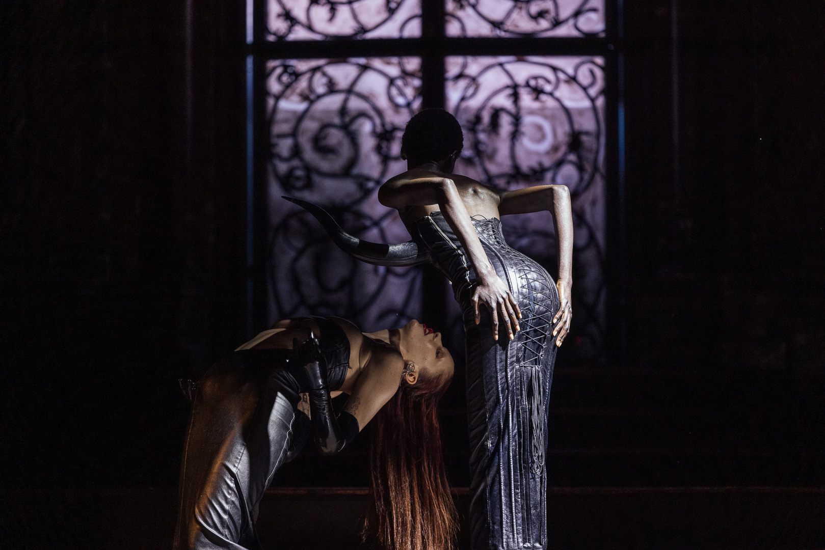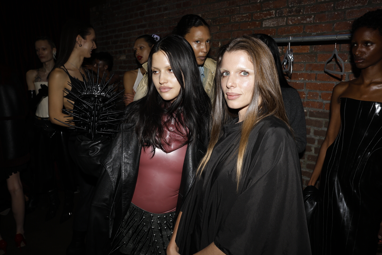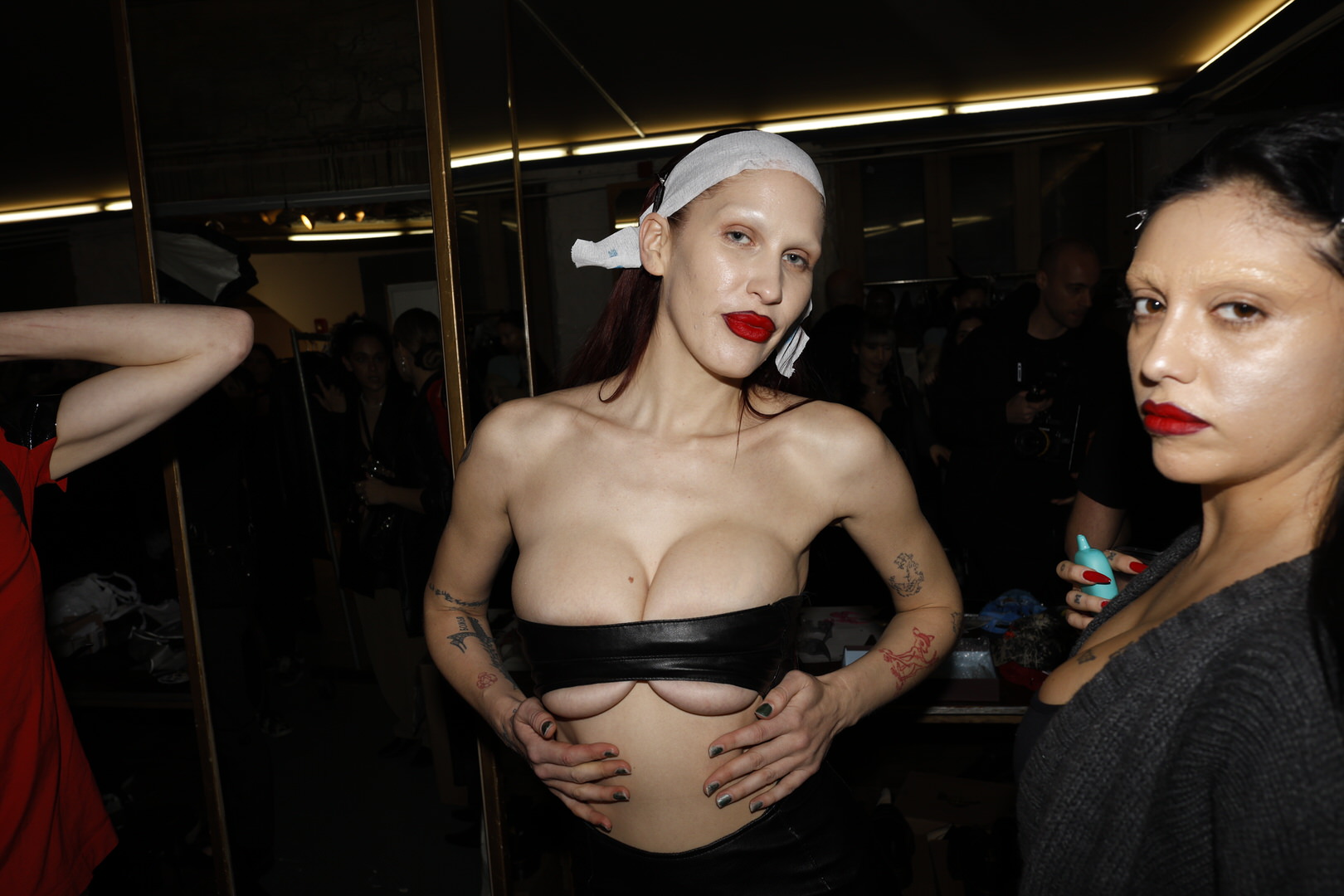 Le latex et le cuir sont présents tout au long de la collection avec des épaules pointues, de la corseterie et des traînes, avec de nombreux ourlets exagérés, dans une palette de couleurs de prune, d’argent métallique, de rouge sang et de noir profond. Le cuir gris dramatique et en détresse est imprimé sur du cuir végétal, en collaboration avec Kornit.