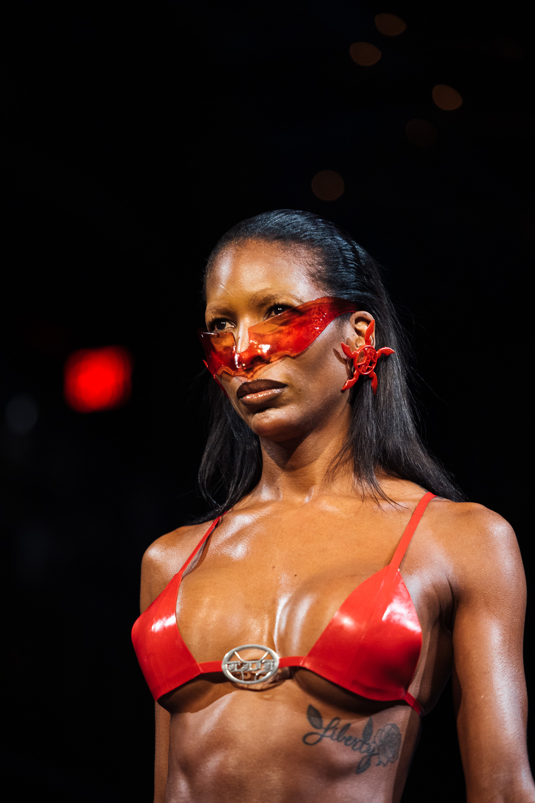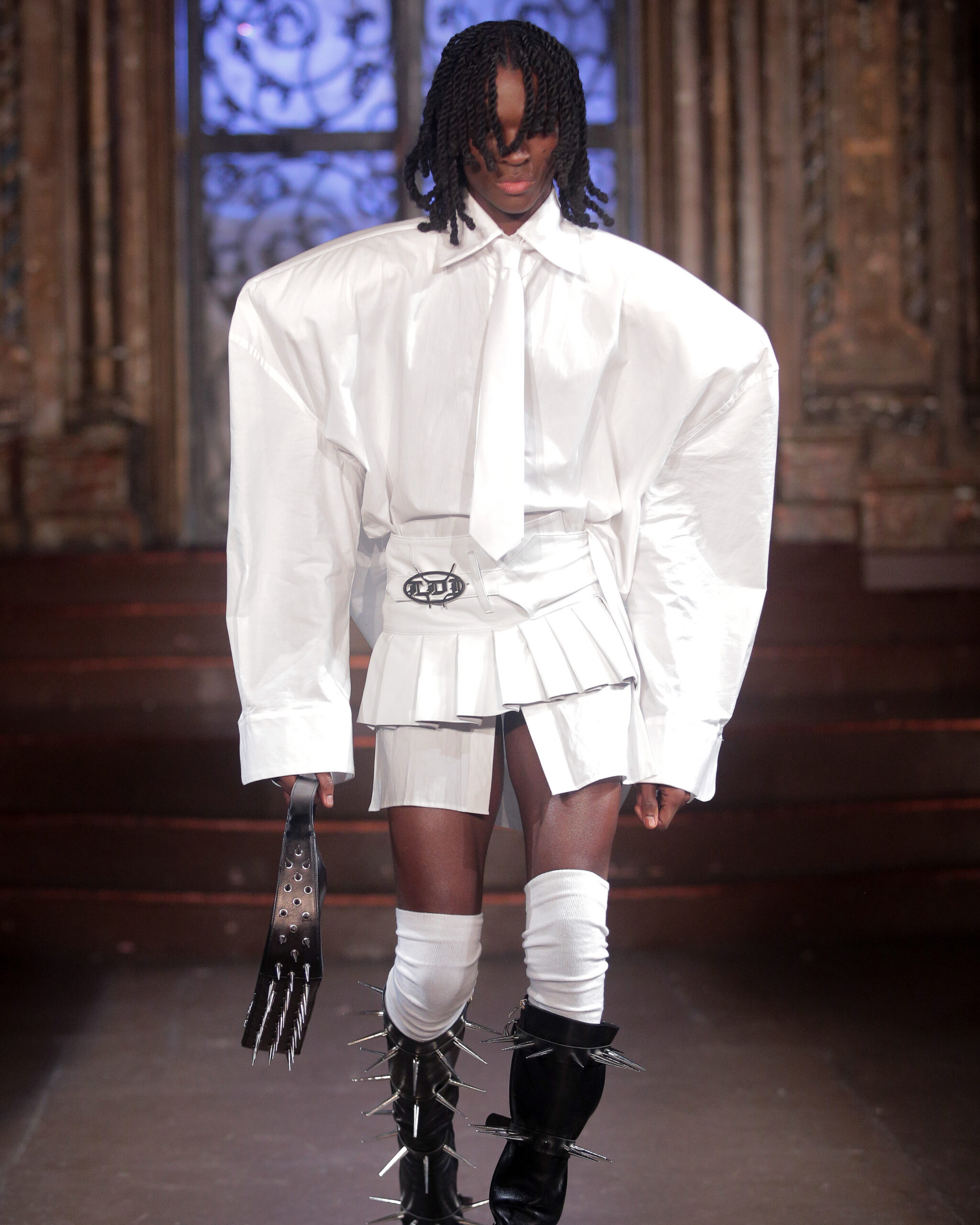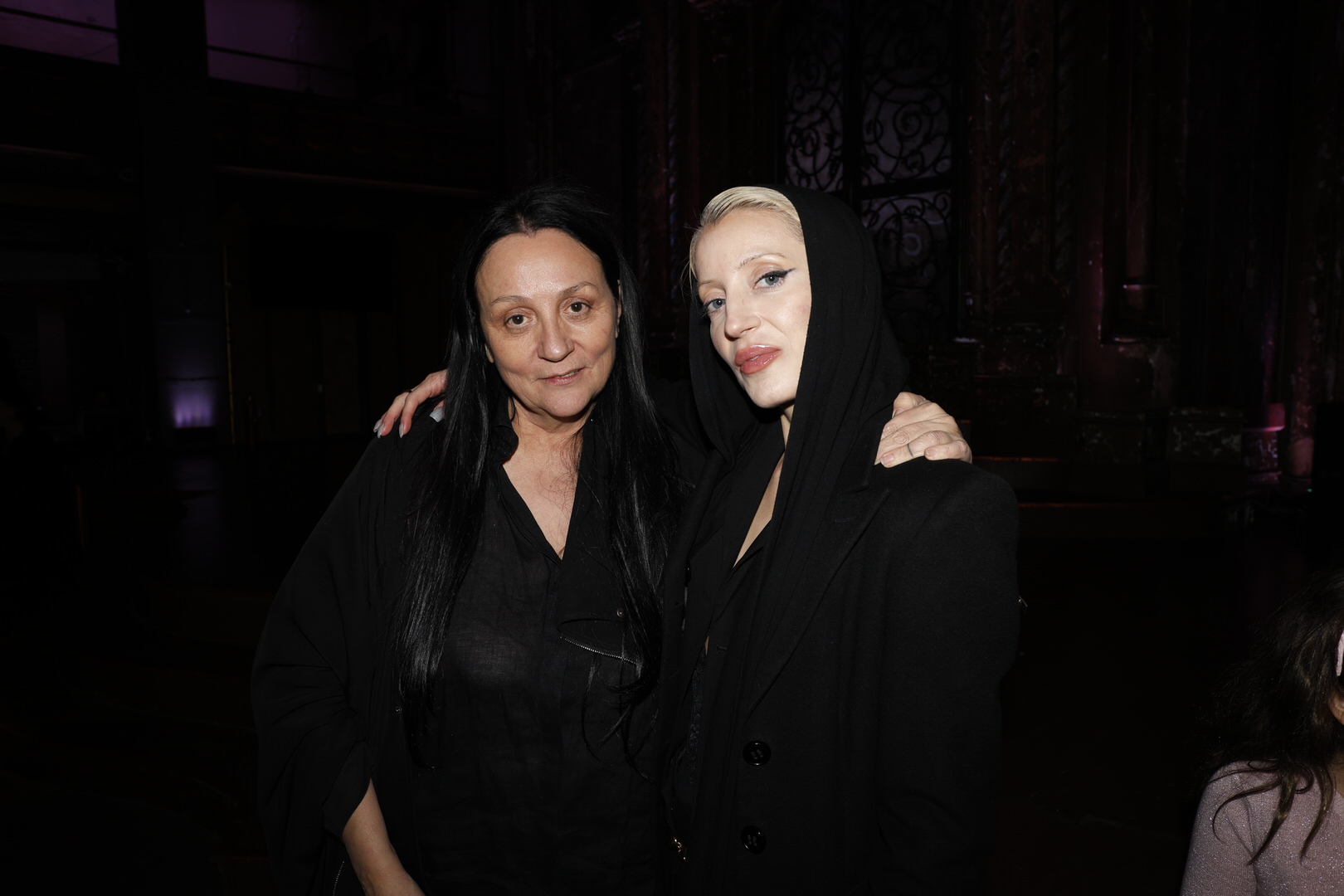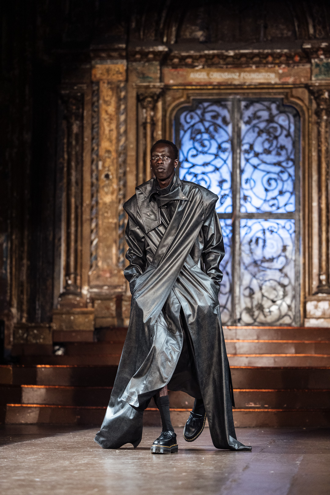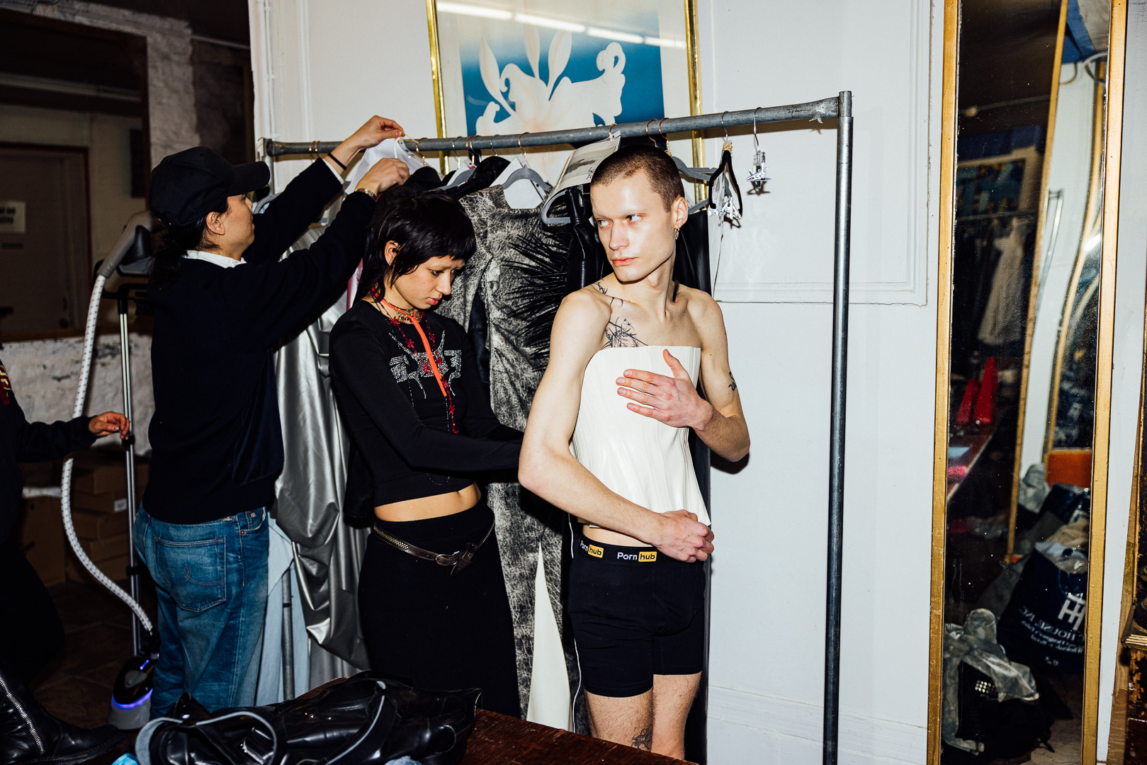 Le latex et le cuir sont présents tout au long de la collection avec des épaules pointues, de la corseterie et des traînes, avec de nombreux ourlets exagérés, dans une palette de couleurs de prune, d’argent métallique, de rouge sang et de noir profond. Le cuir gris dramatique et en détresse est imprimé sur du cuir végétal, en collaboration avec Kornit.