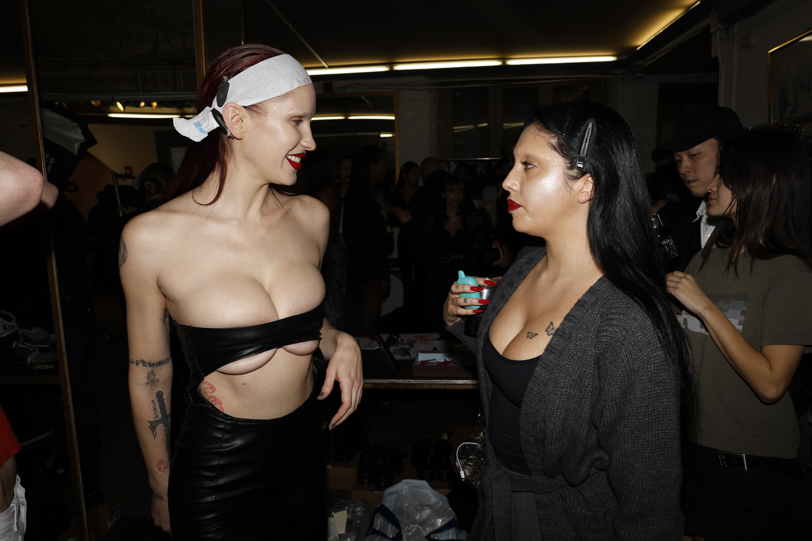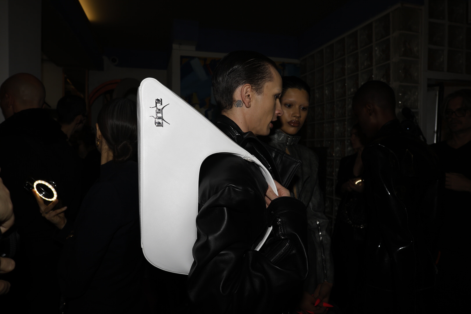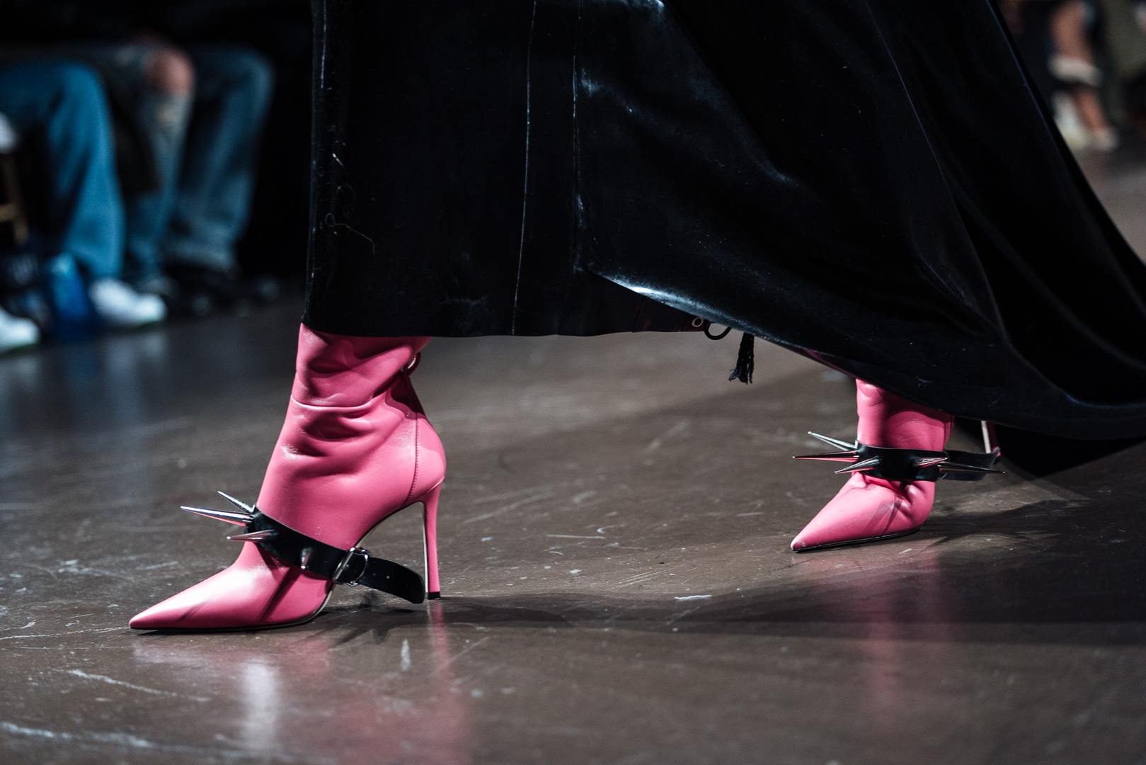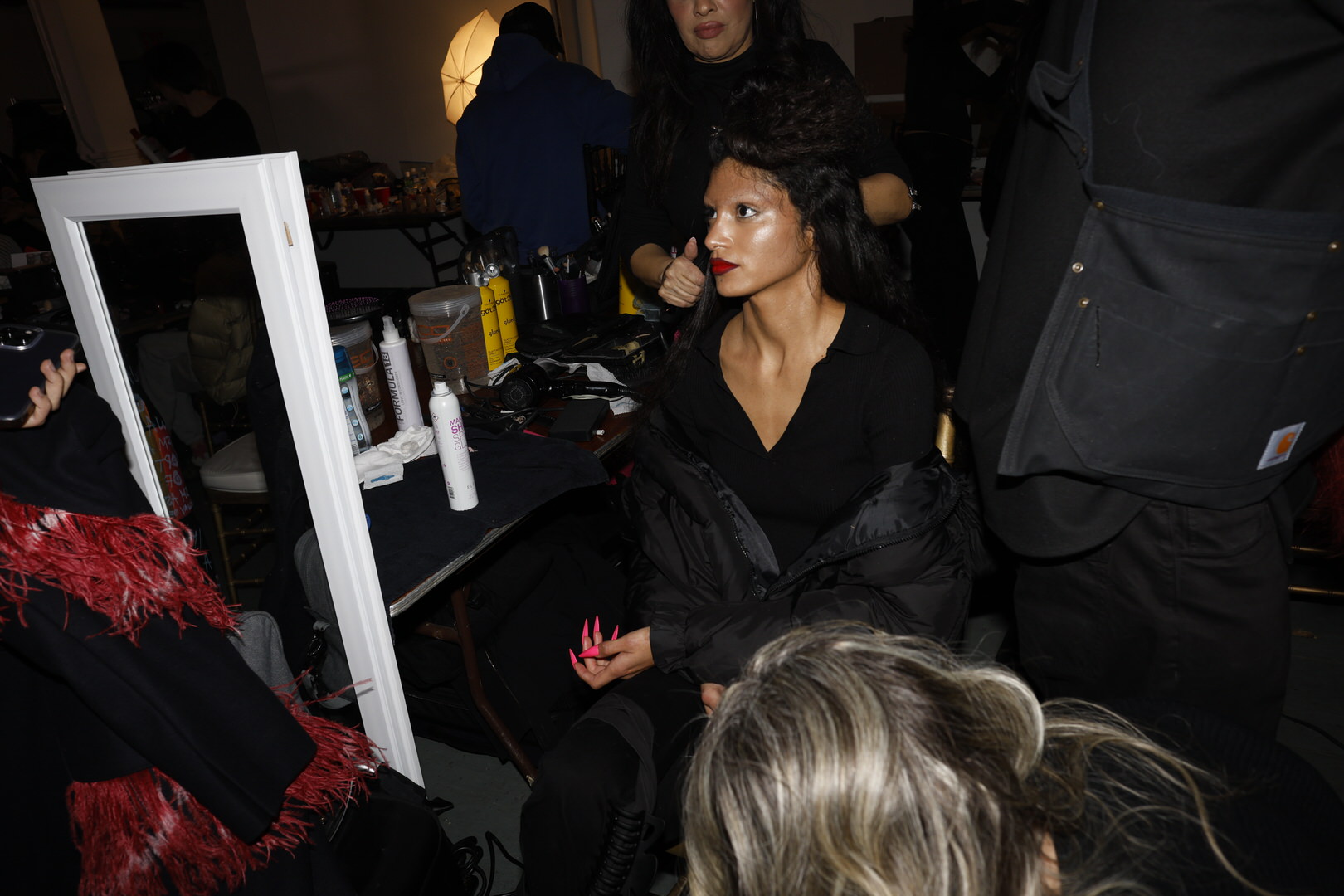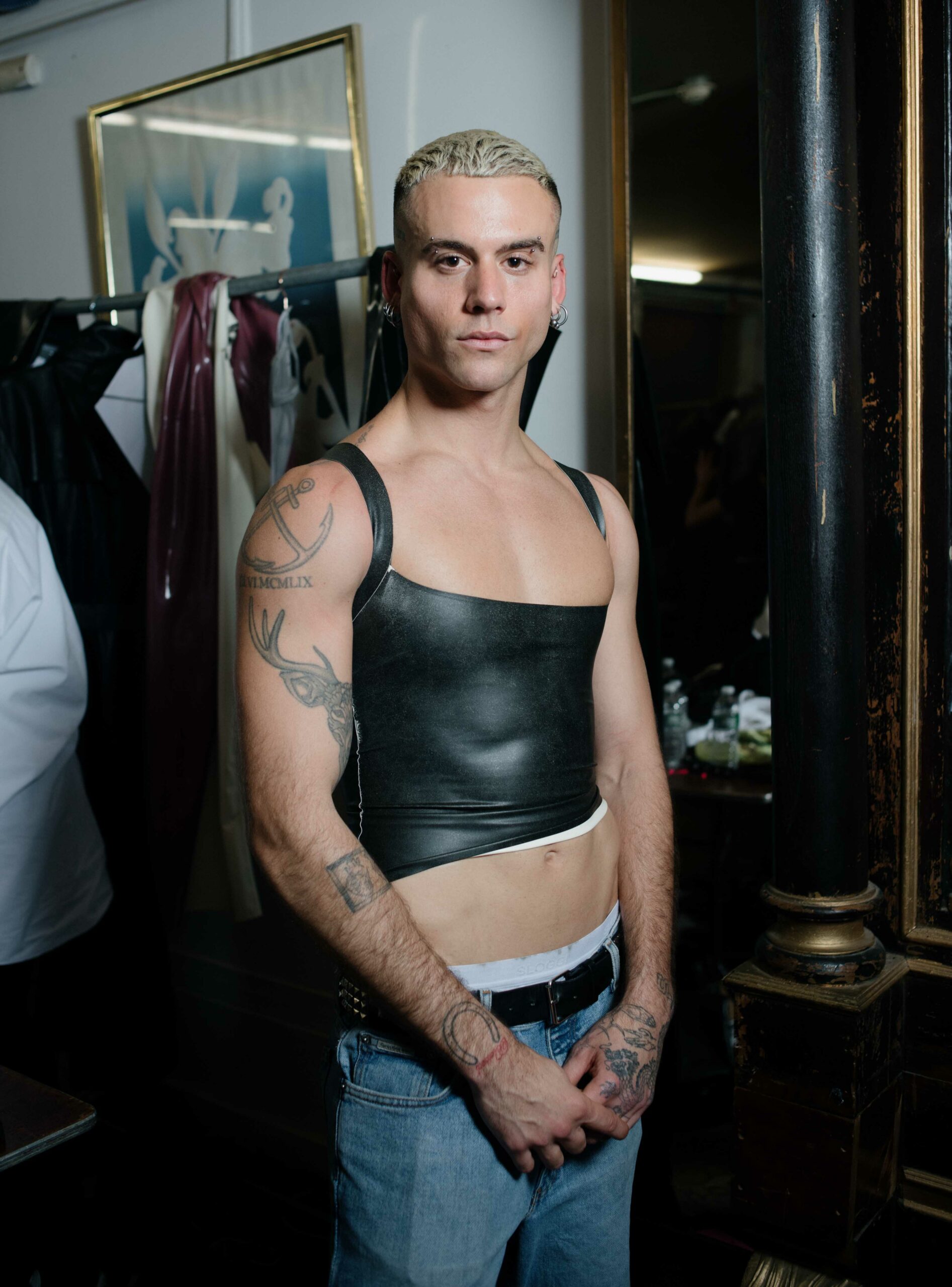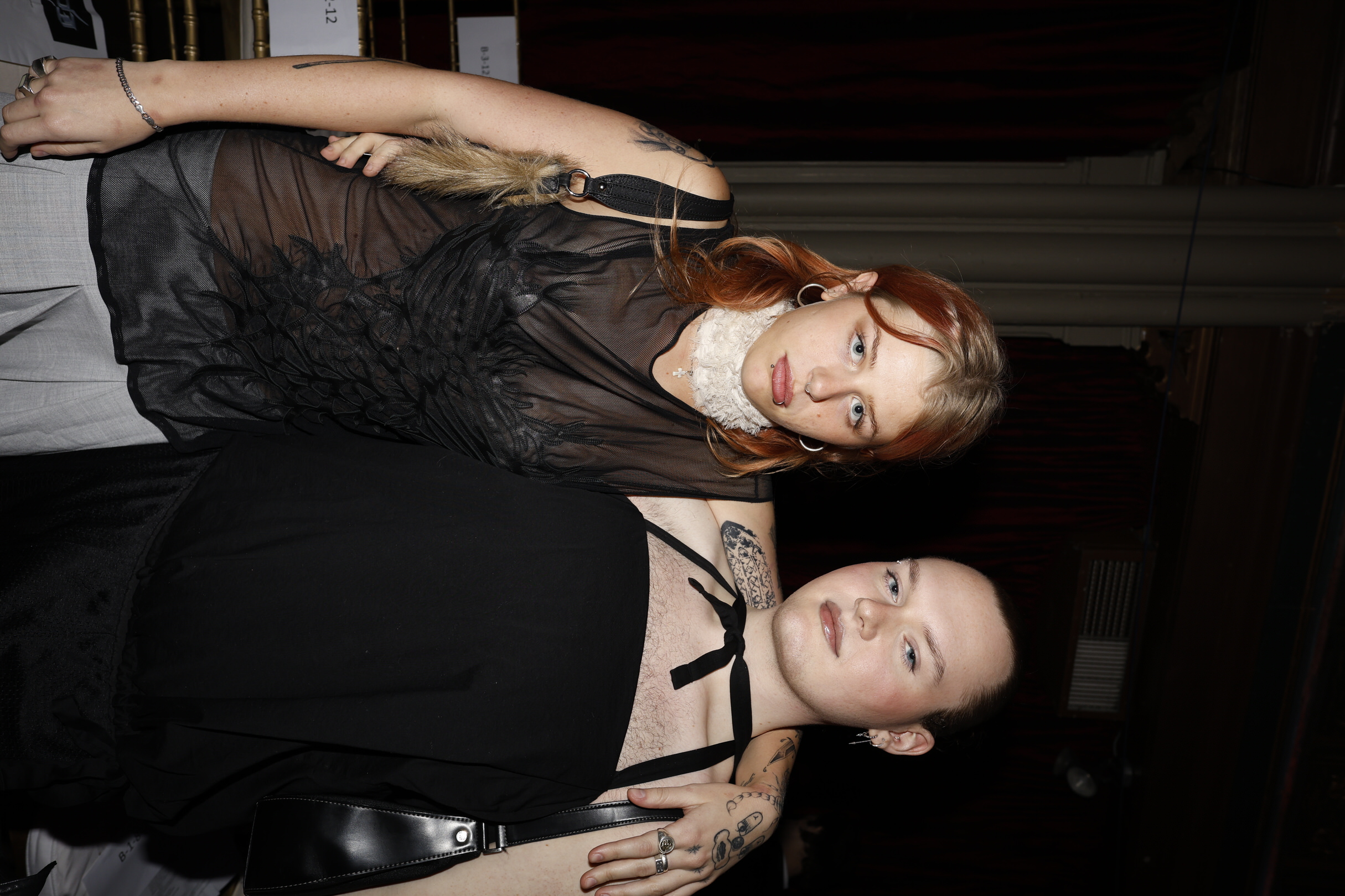 Le latex et le cuir sont présents tout au long de la collection avec des épaules pointues, de la corseterie et des traînes, avec de nombreux ourlets exagérés, dans une palette de couleurs de prune, d’argent métallique, de rouge sang et de noir profond. Le cuir gris dramatique et en détresse est imprimé sur du cuir végétal, en collaboration avec Kornit.