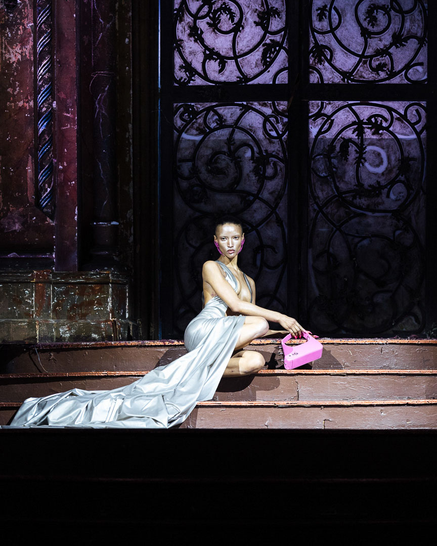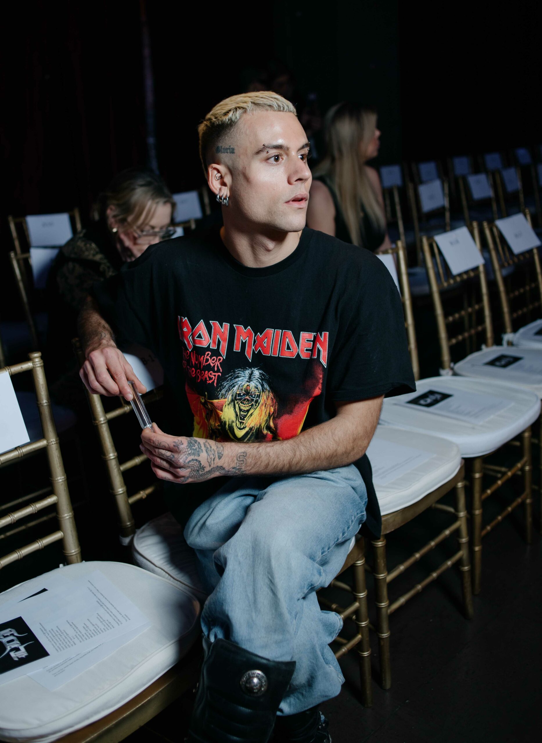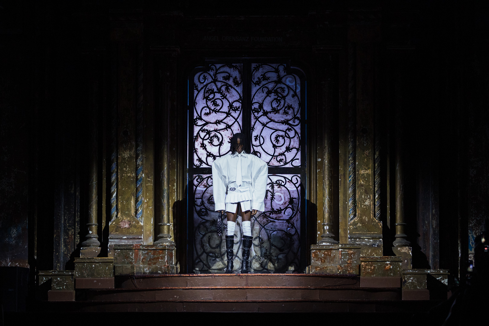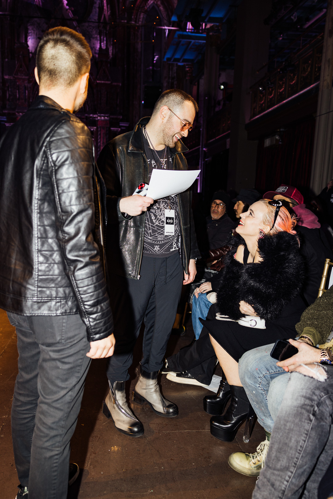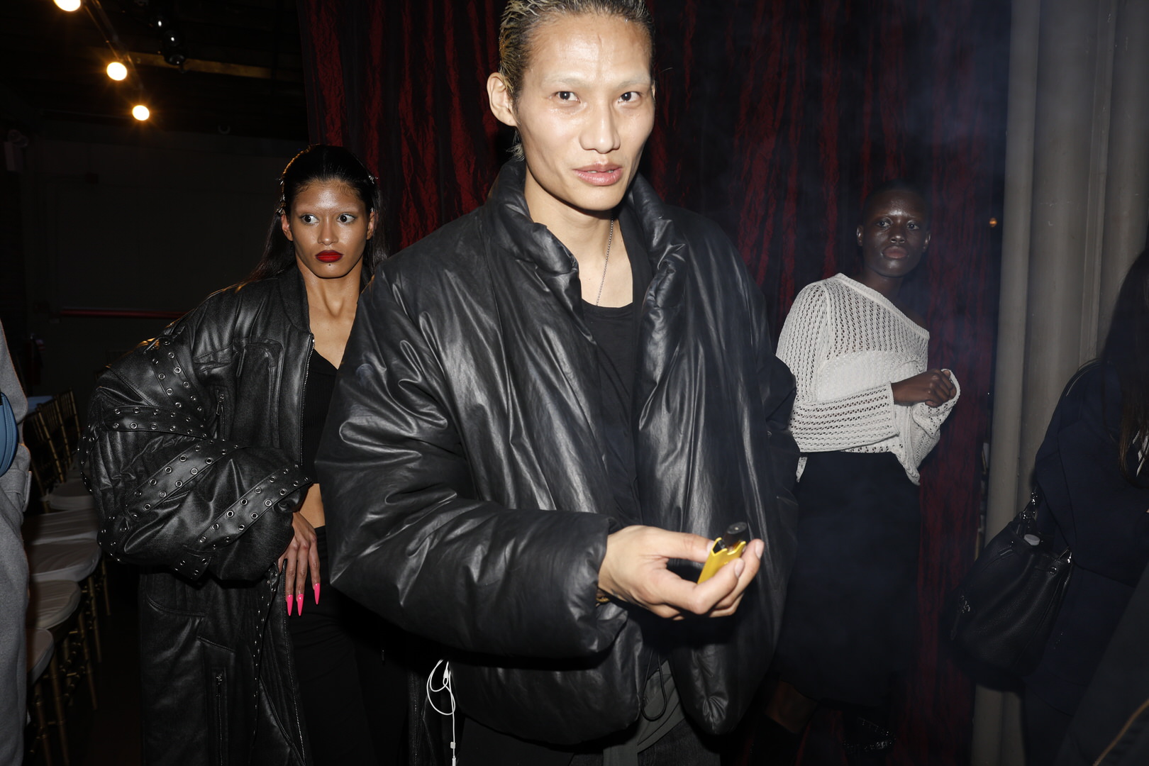 Le latex et le cuir sont présents tout au long de la collection avec des épaules pointues, de la corseterie et des traînes, avec de nombreux ourlets exagérés, dans une palette de couleurs de prune, d’argent métallique, de rouge sang et de noir profond. Le cuir gris dramatique et en détresse est imprimé sur du cuir végétal, en collaboration avec Kornit.