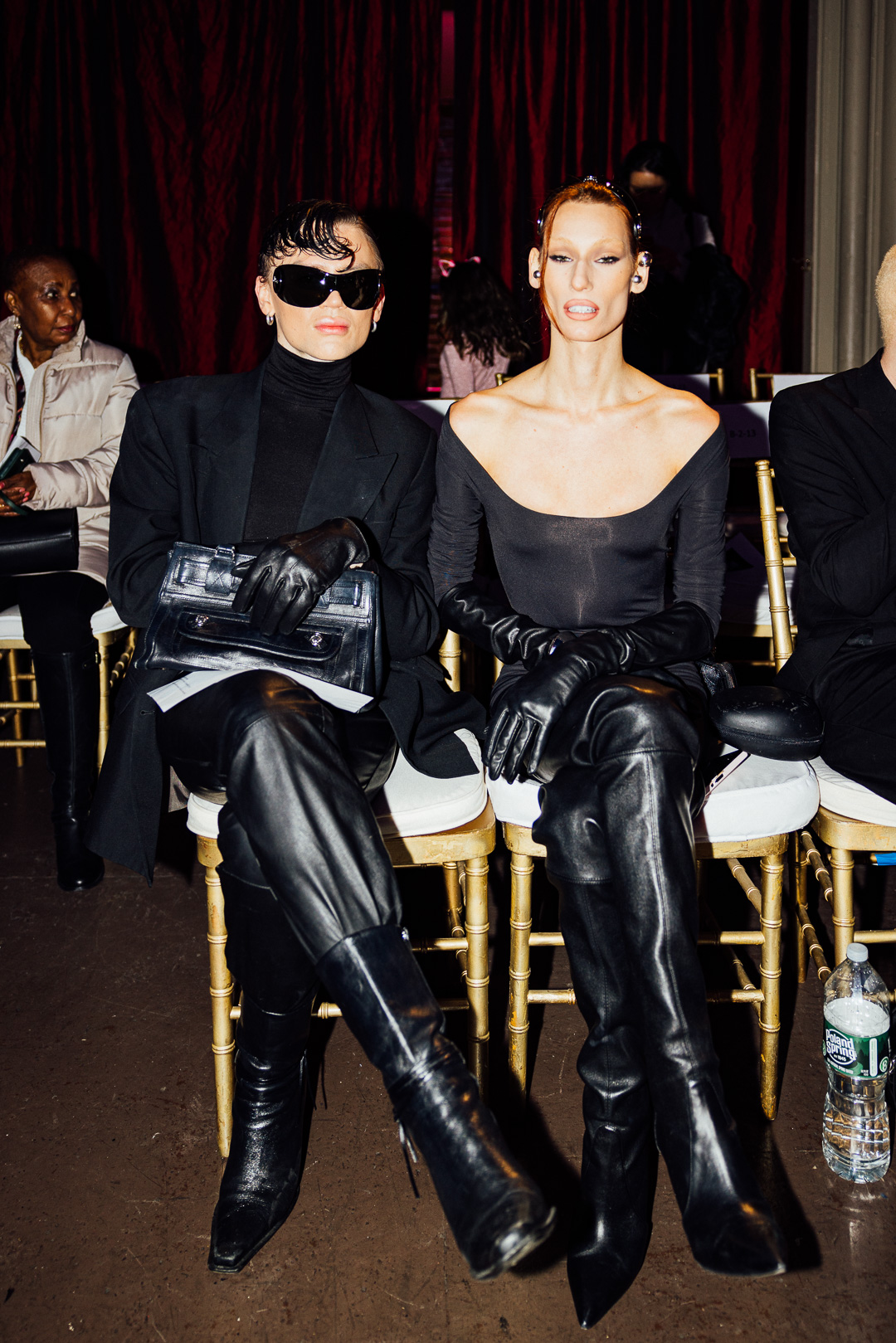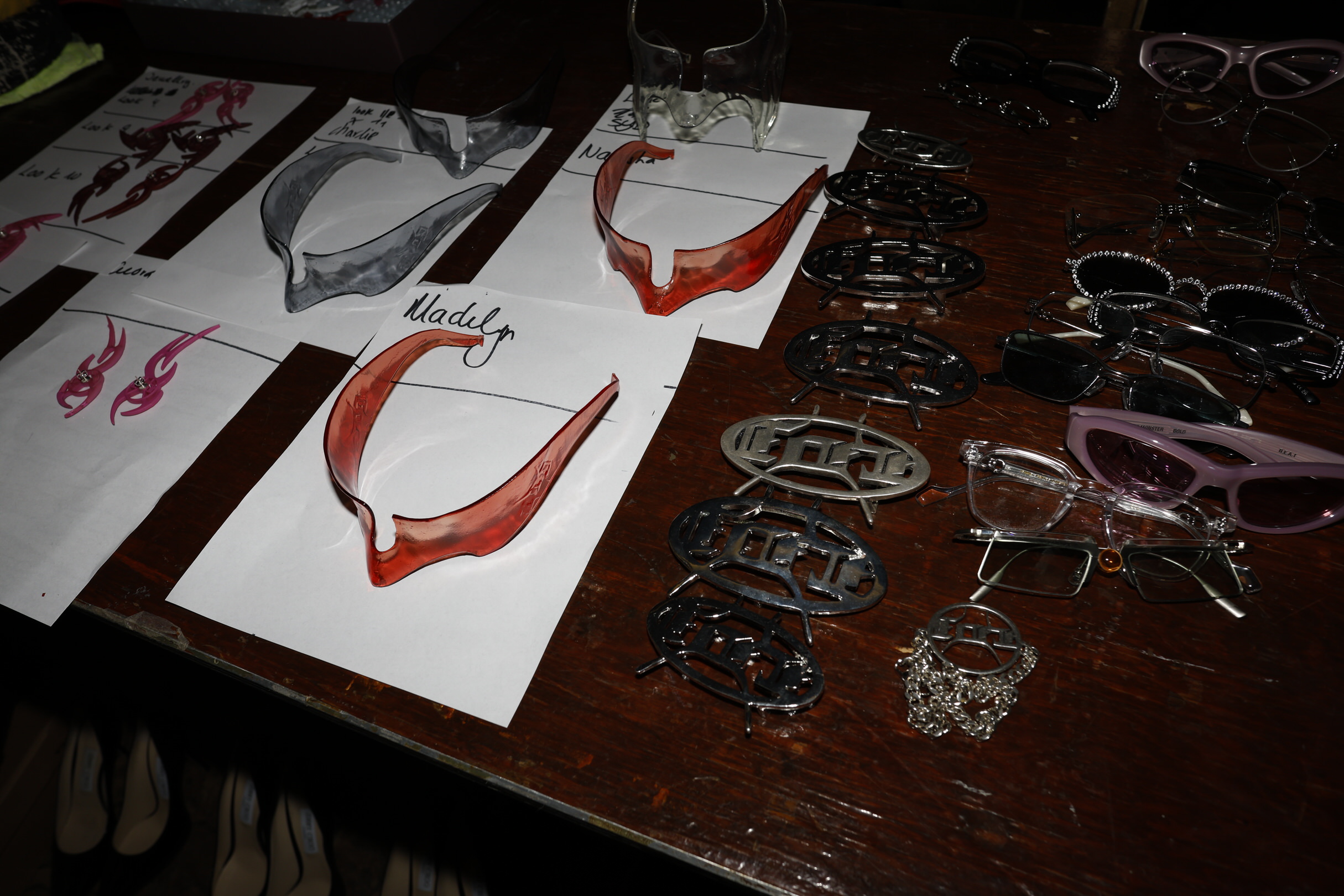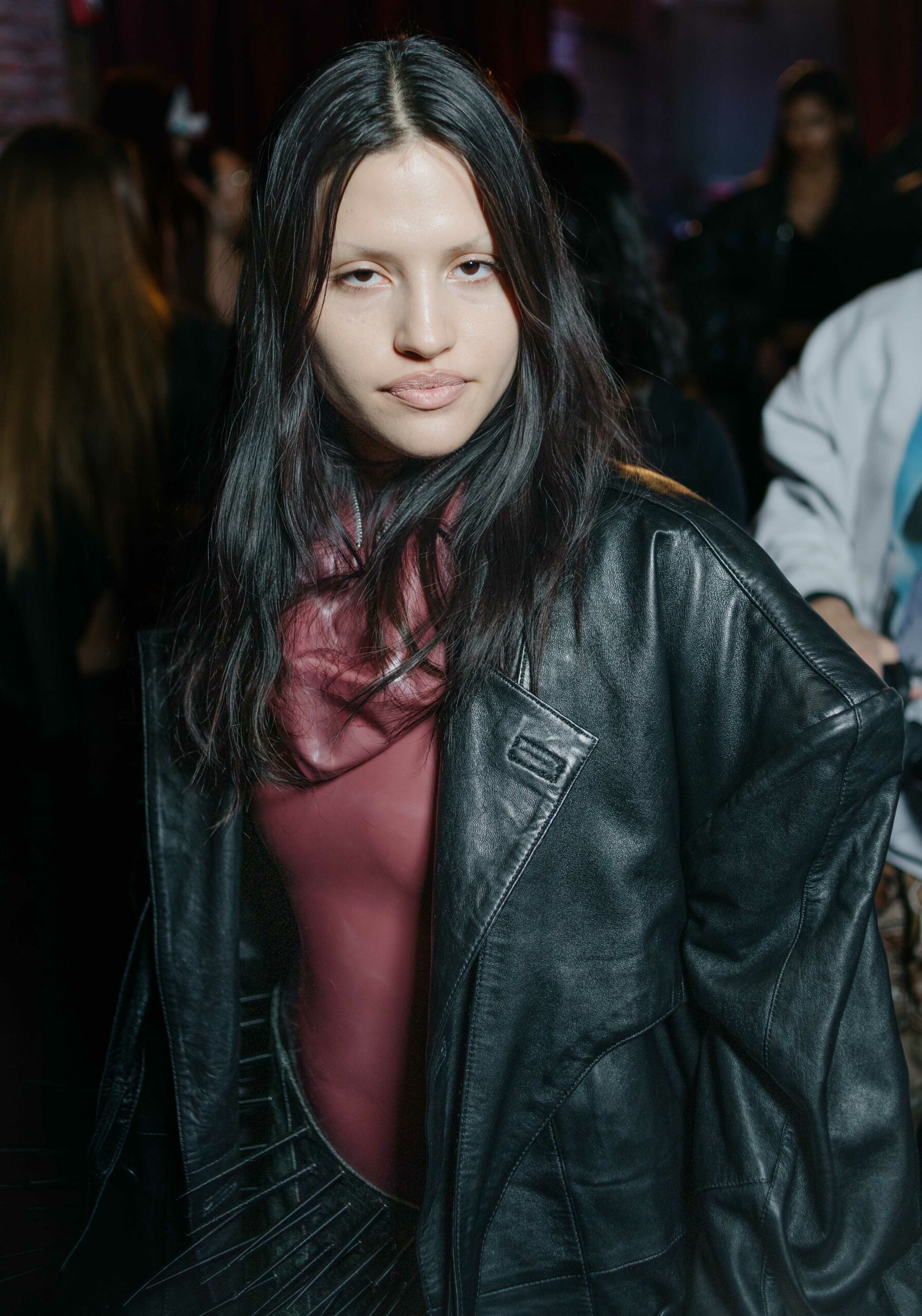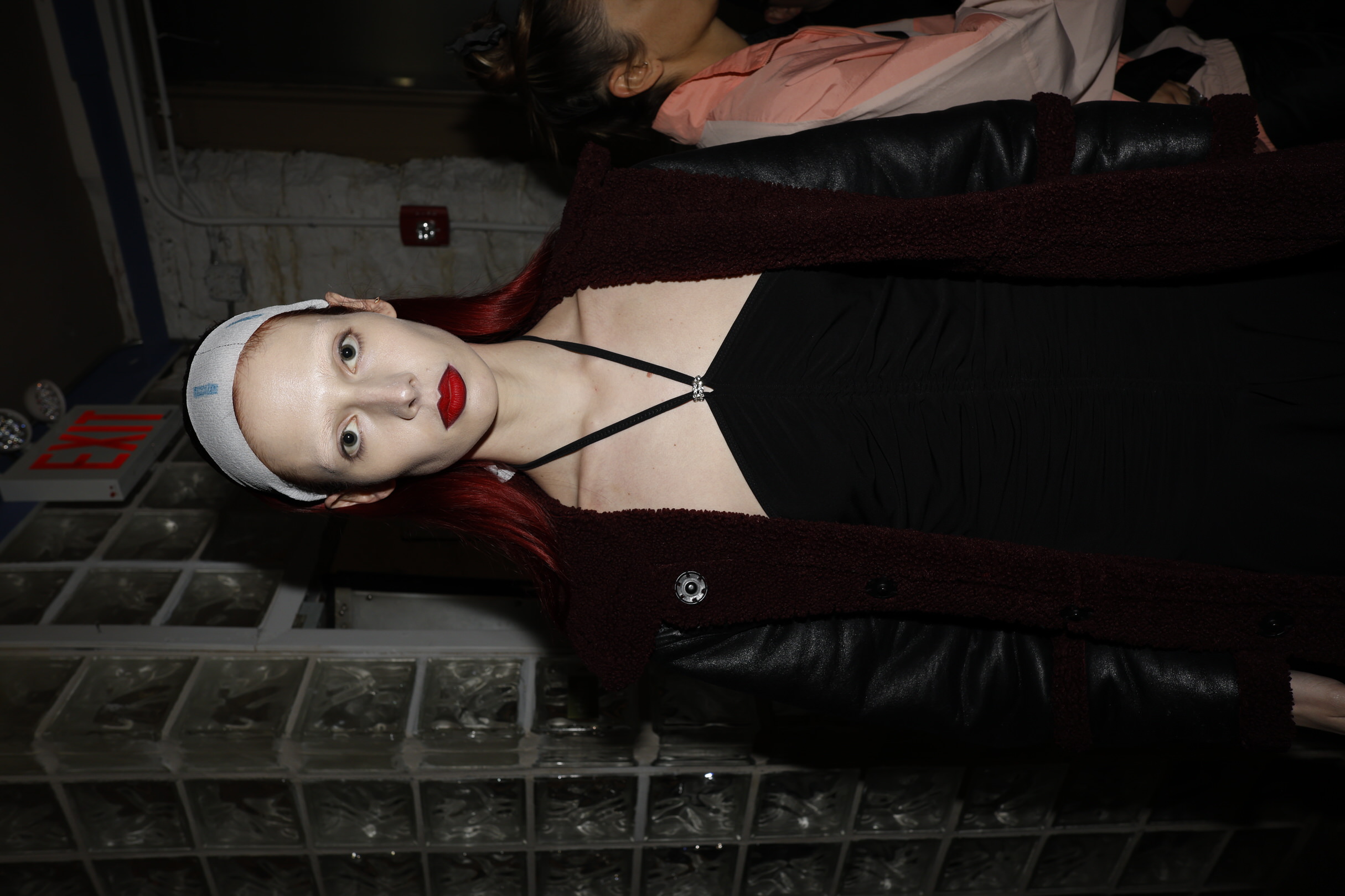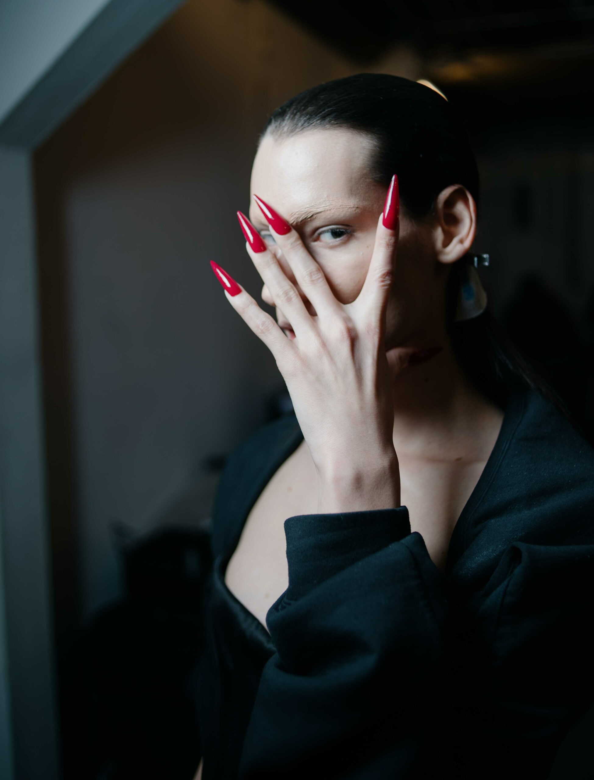 Le latex et le cuir sont présents tout au long de la collection avec des épaules pointues, de la corseterie et des traînes, avec de nombreux ourlets exagérés, dans une palette de couleurs de prune, d’argent métallique, de rouge sang et de noir profond. Le cuir gris dramatique et en détresse est imprimé sur du cuir végétal, en collaboration avec Kornit.