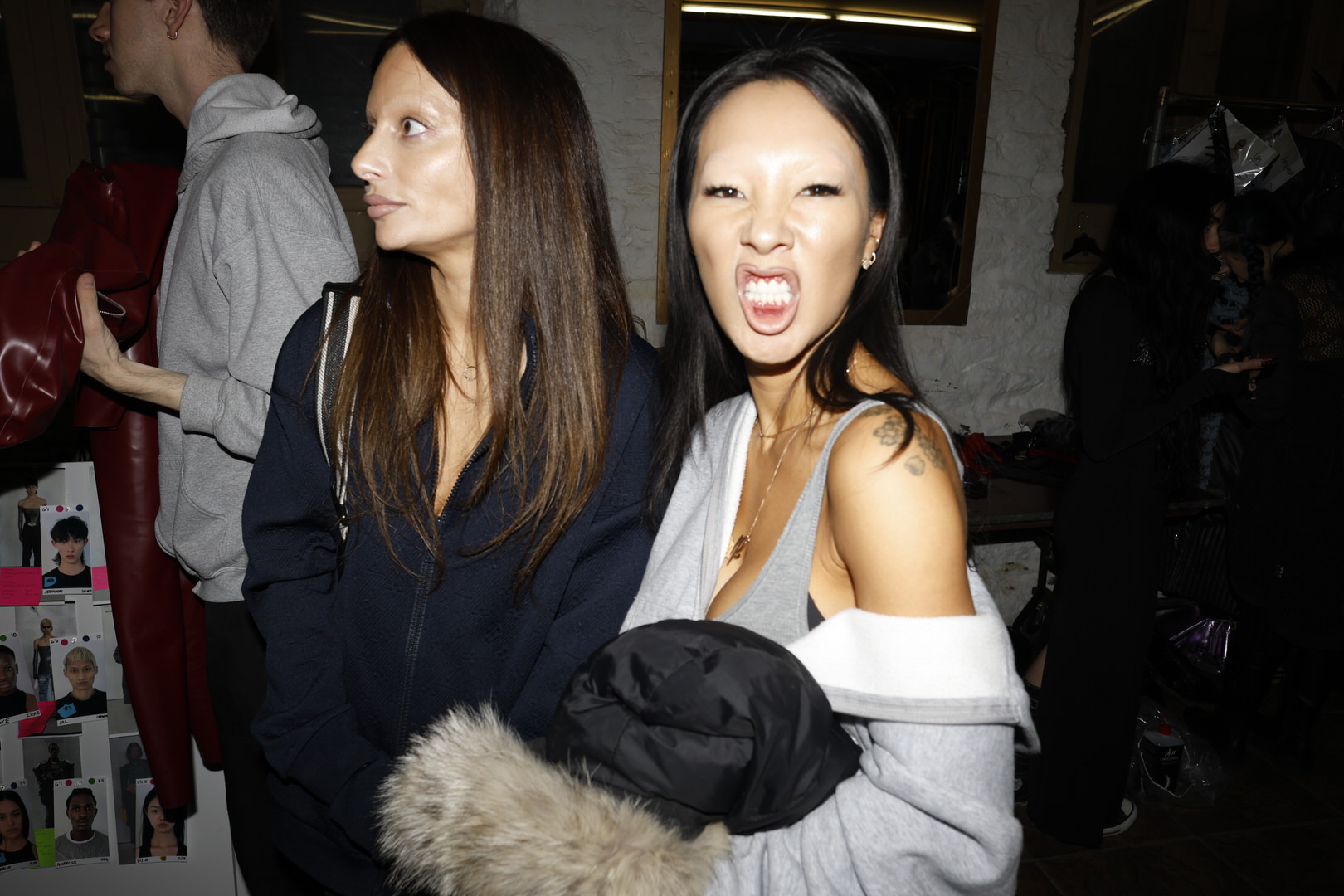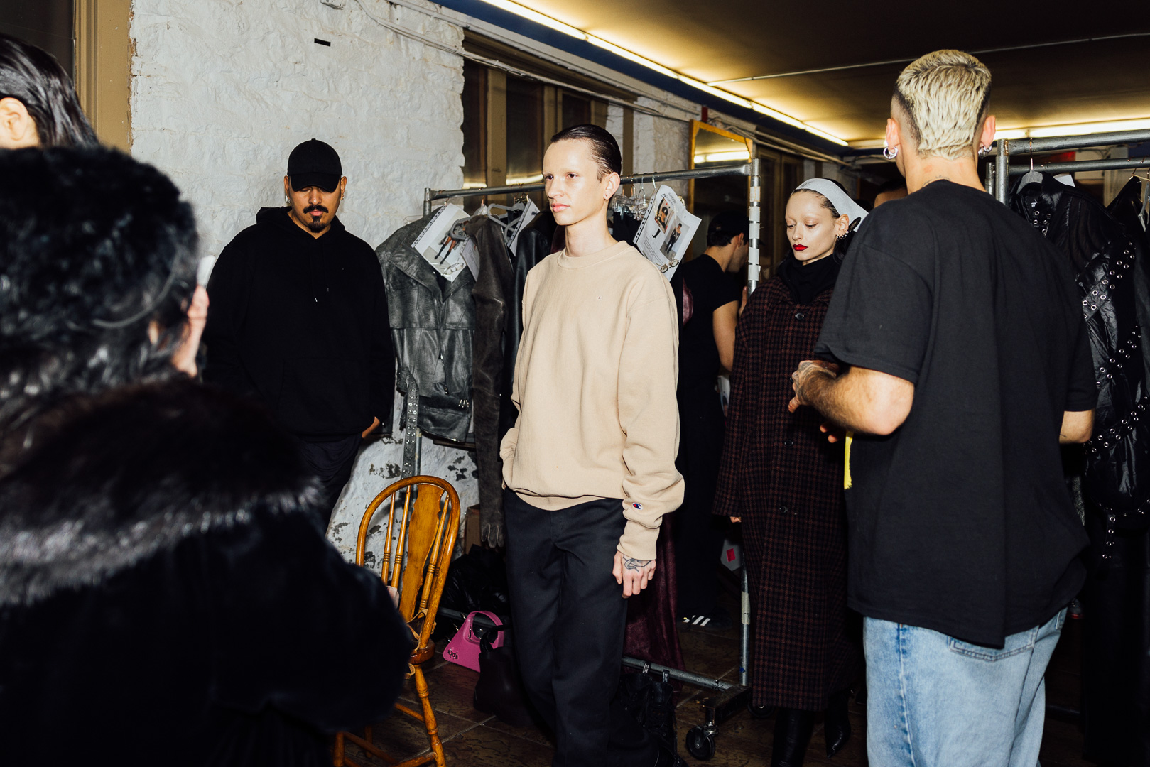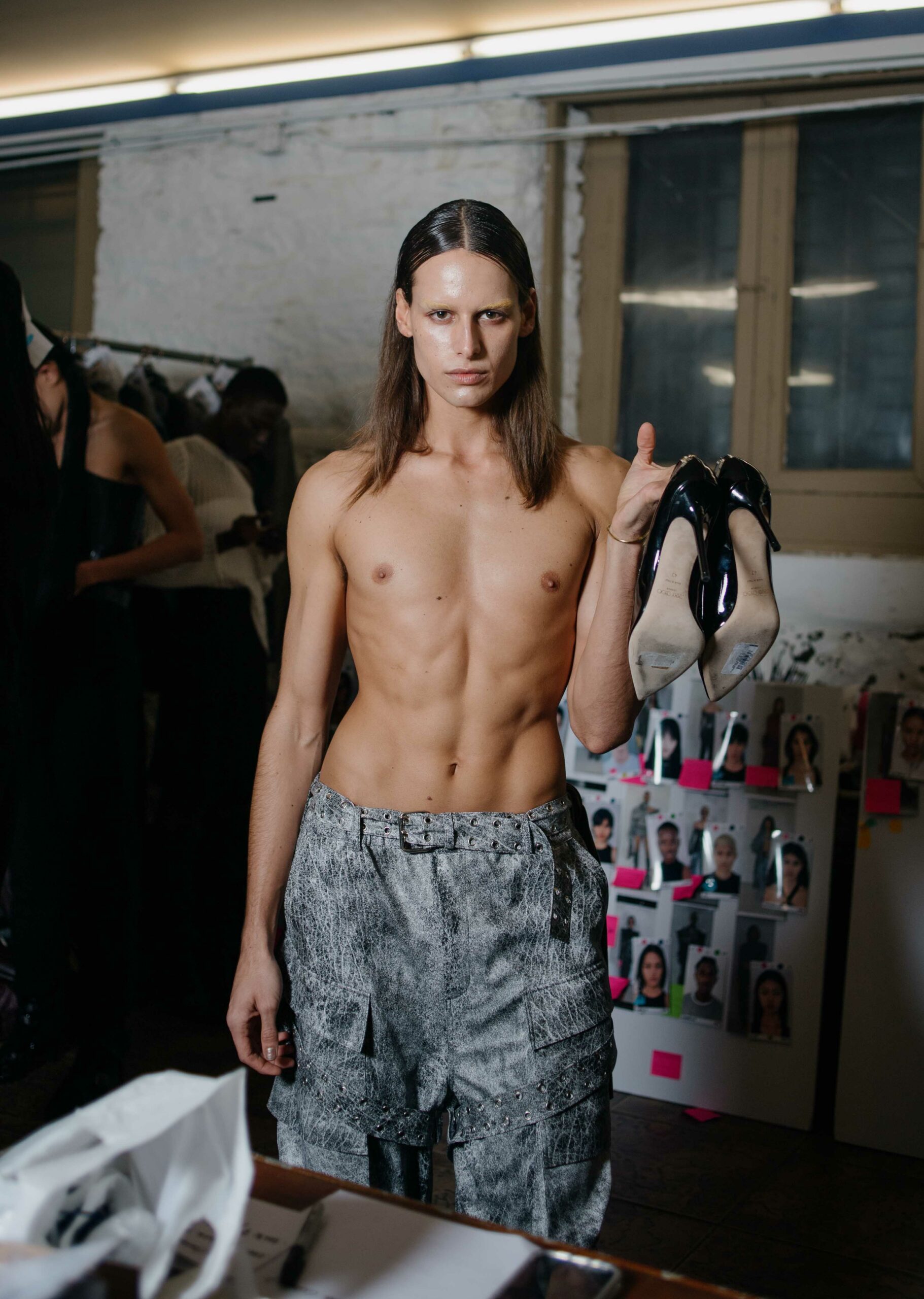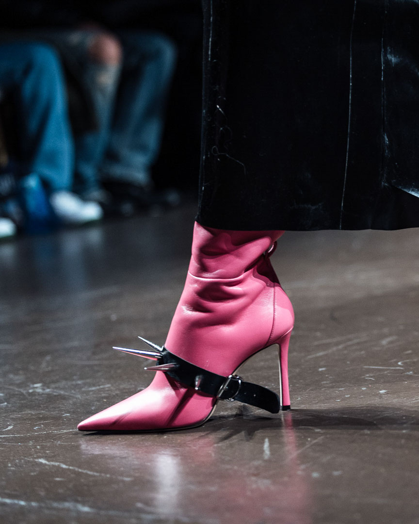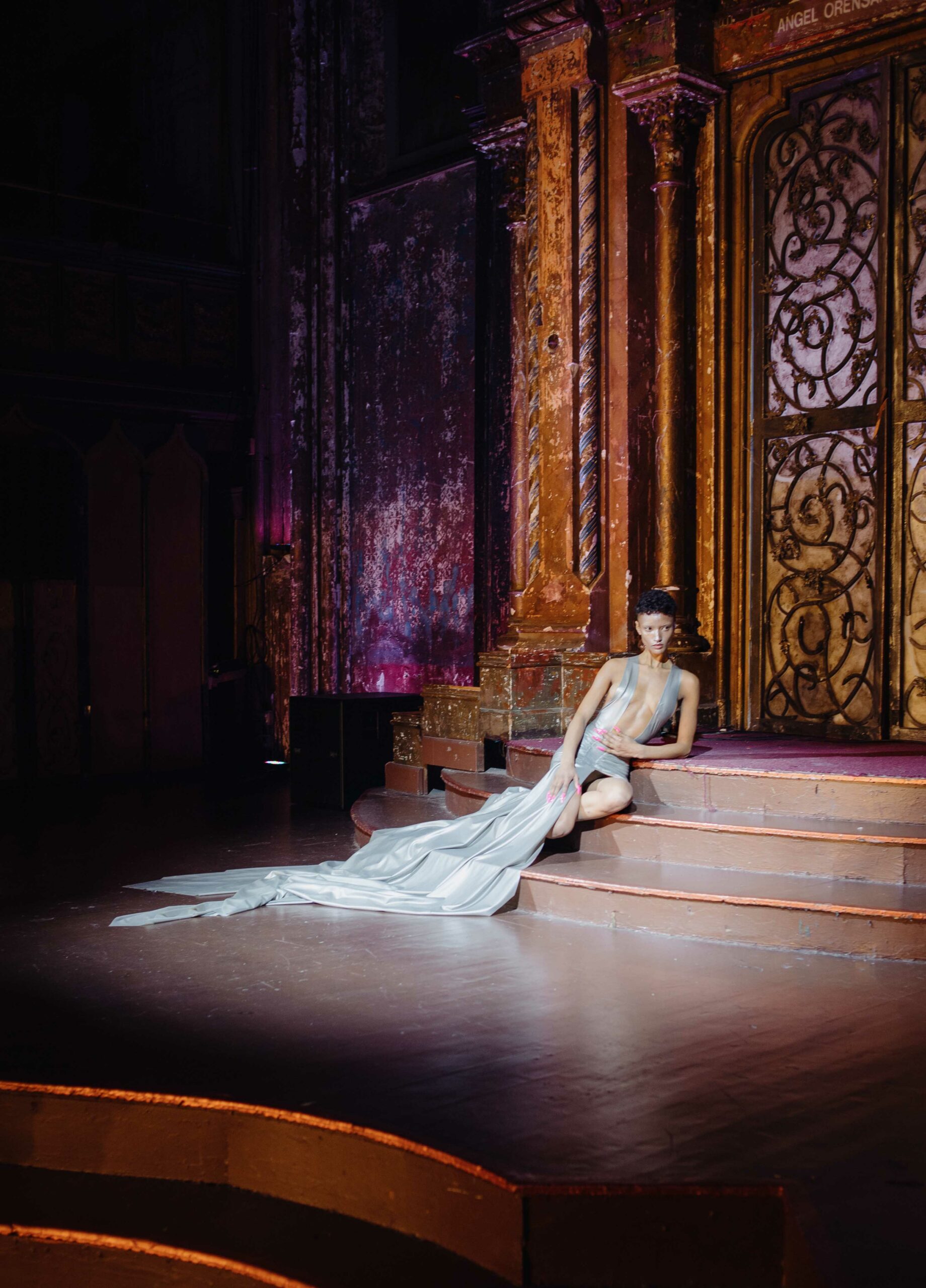 Le latex et le cuir sont présents tout au long de la collection avec des épaules pointues, de la corseterie et des traînes, avec de nombreux ourlets exagérés, dans une palette de couleurs de prune, d’argent métallique, de rouge sang et de noir profond. Le cuir gris dramatique et en détresse est imprimé sur du cuir végétal, en collaboration avec Kornit.
