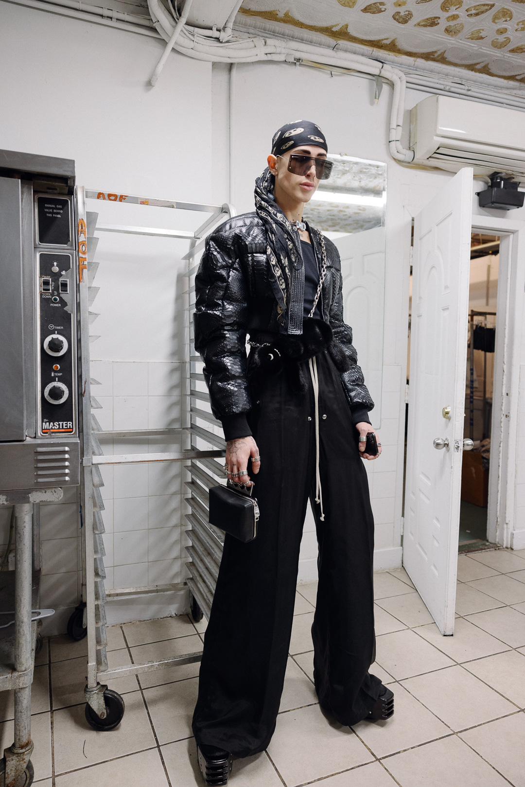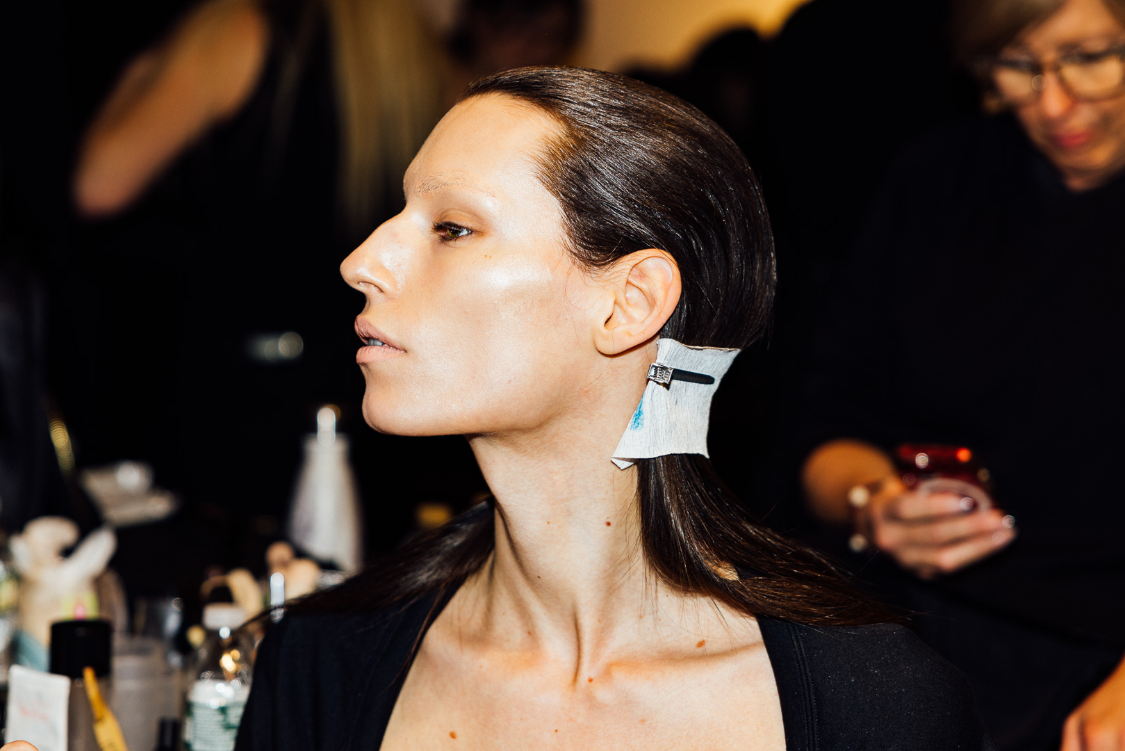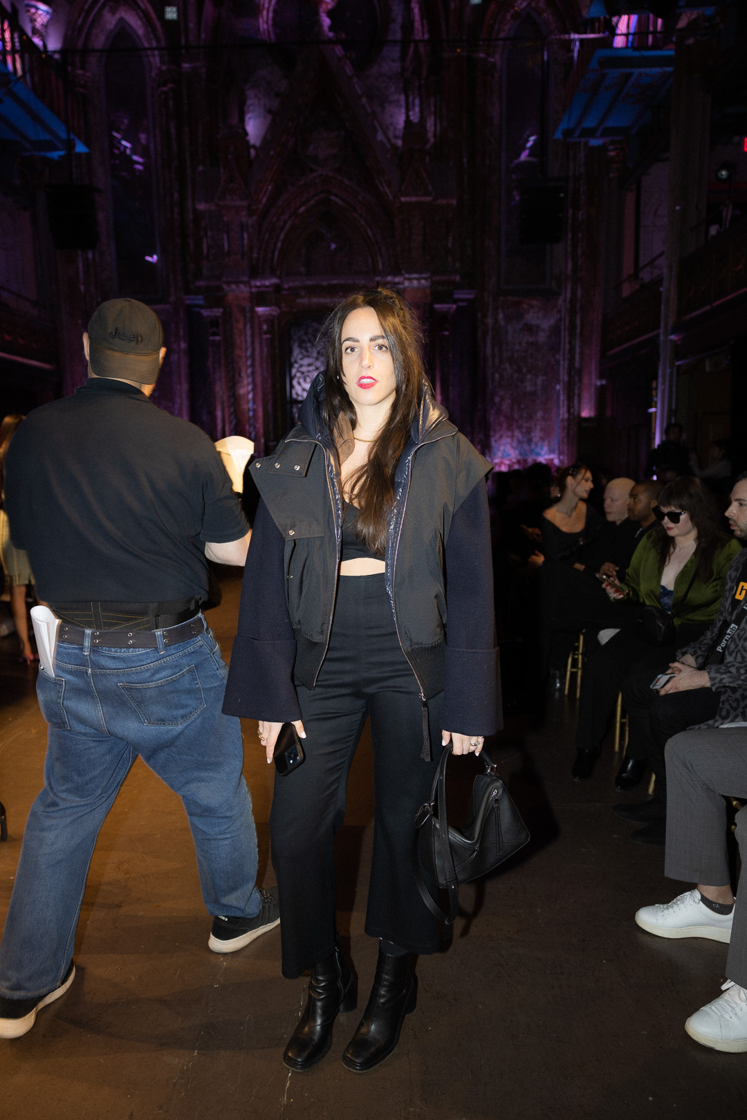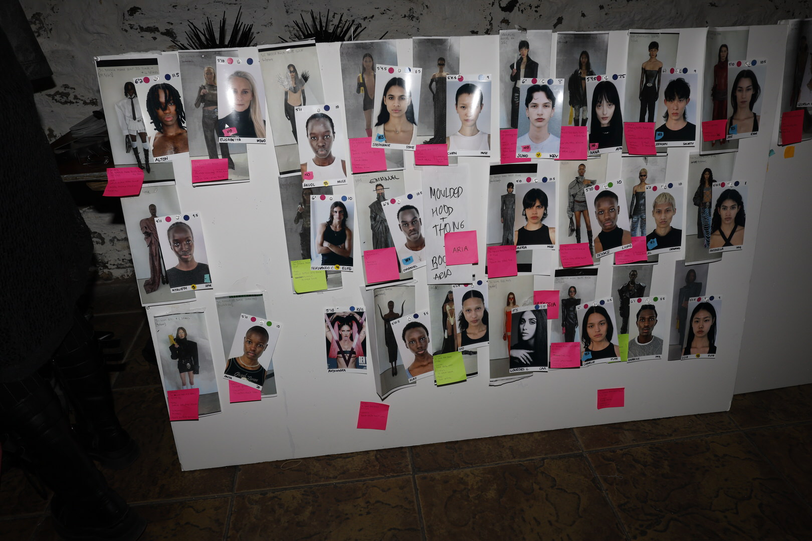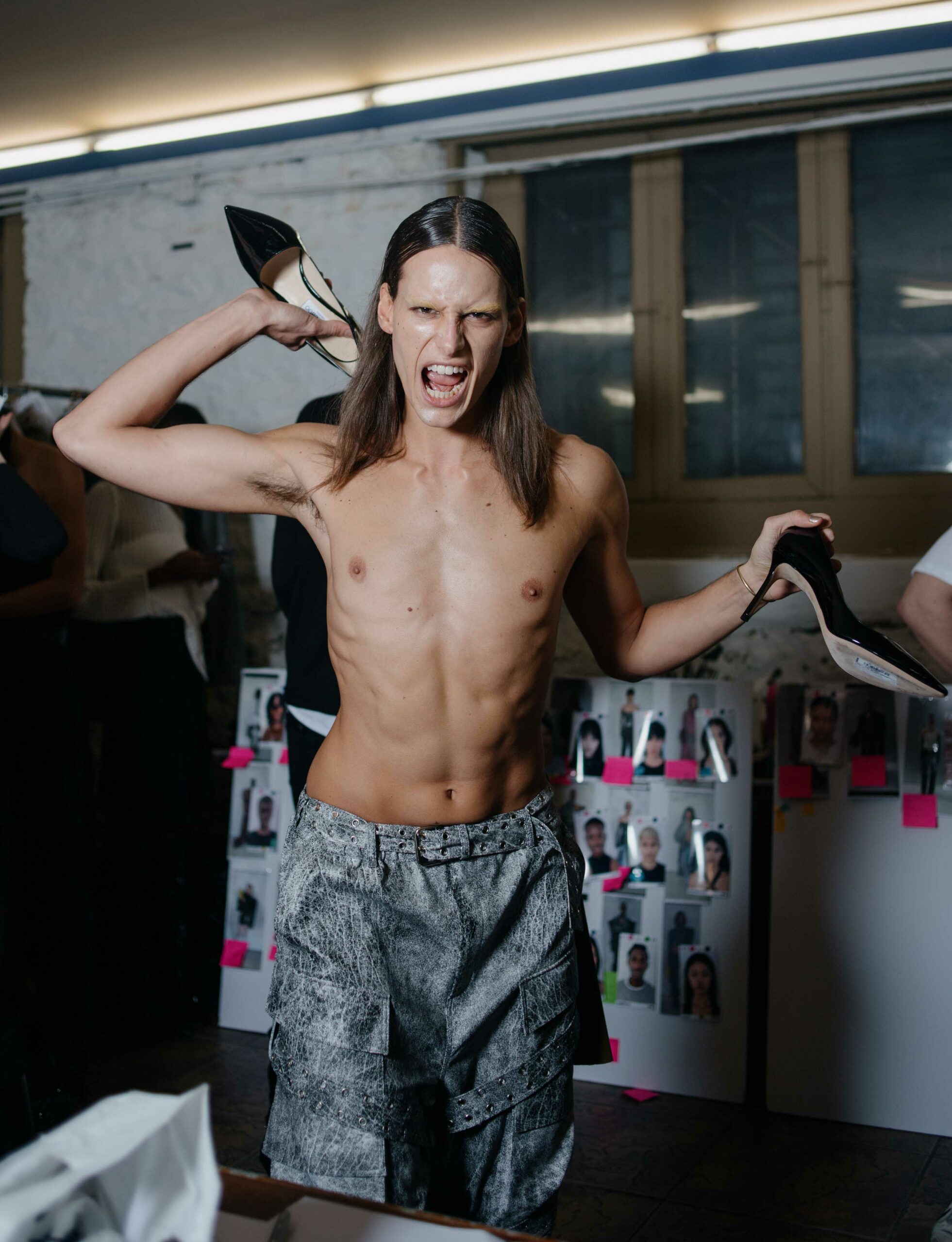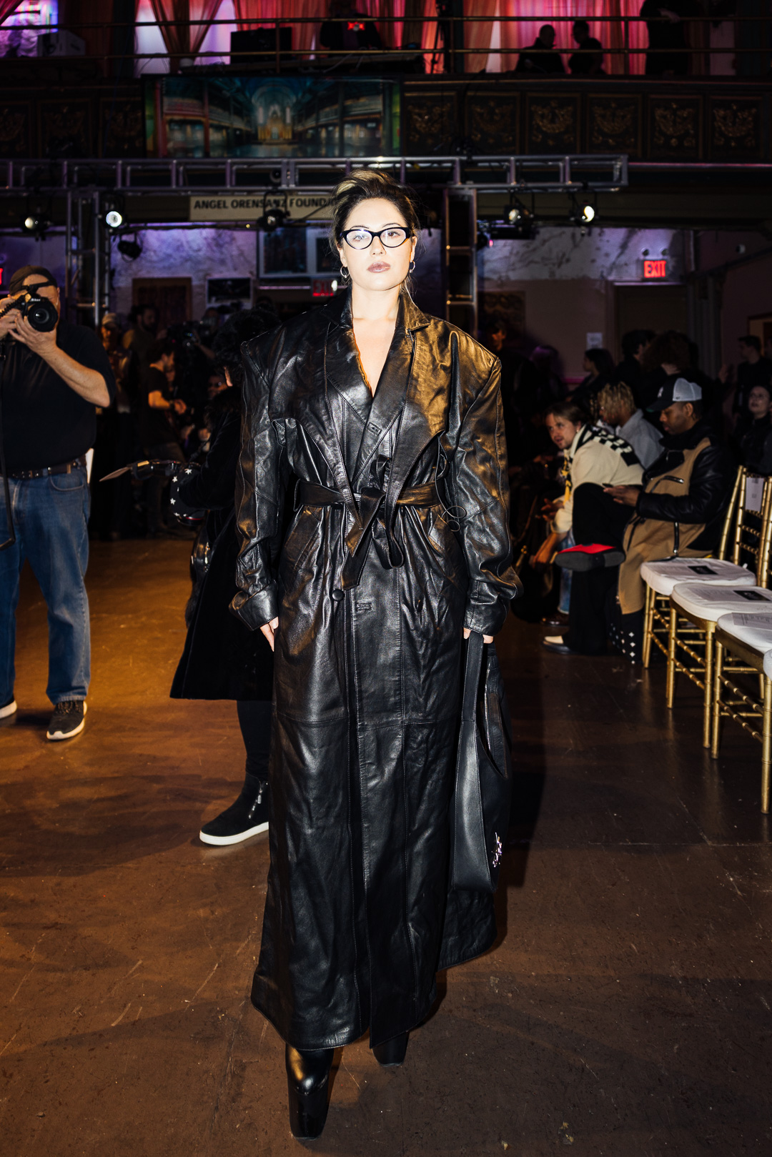 Le latex et le cuir sont présents tout au long de la collection avec des épaules pointues, de la corseterie et des traînes, avec de nombreux ourlets exagérés, dans une palette de couleurs de prune, d’argent métallique, de rouge sang et de noir profond. Le cuir gris dramatique et en détresse est imprimé sur du cuir végétal, en collaboration avec Kornit.