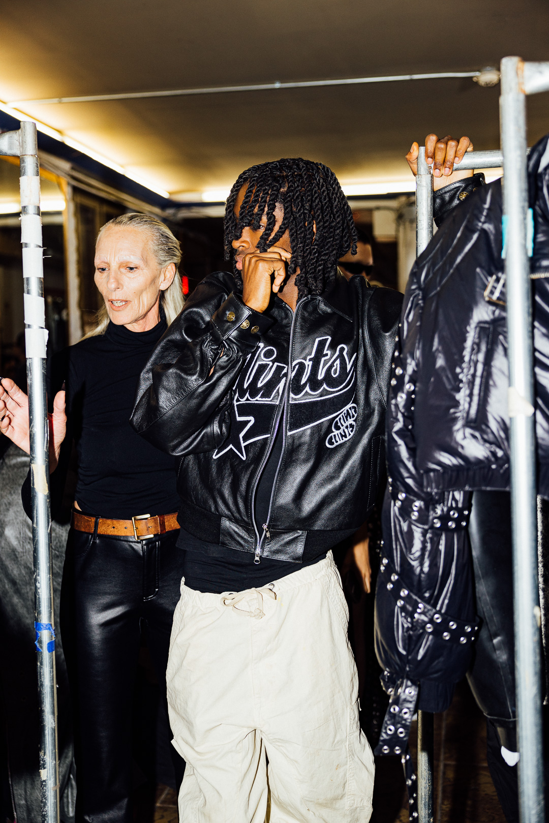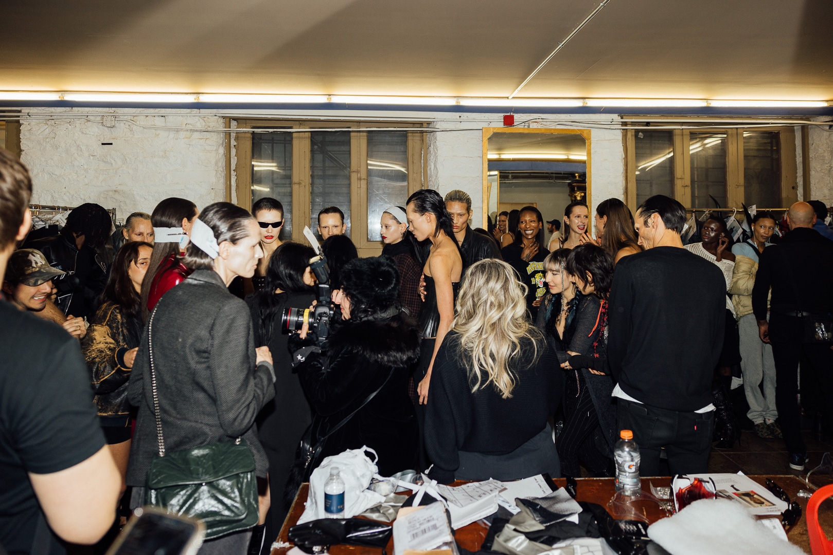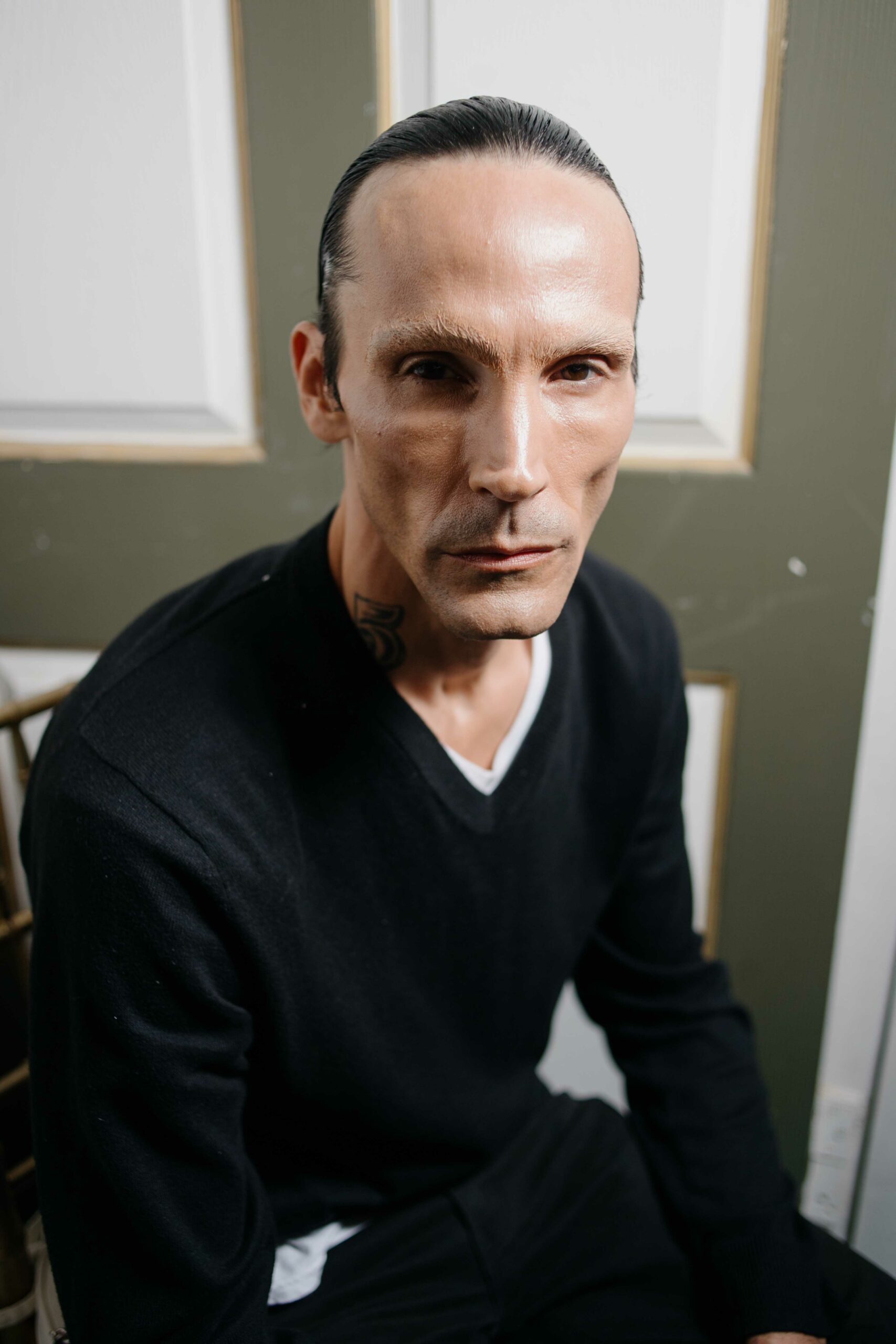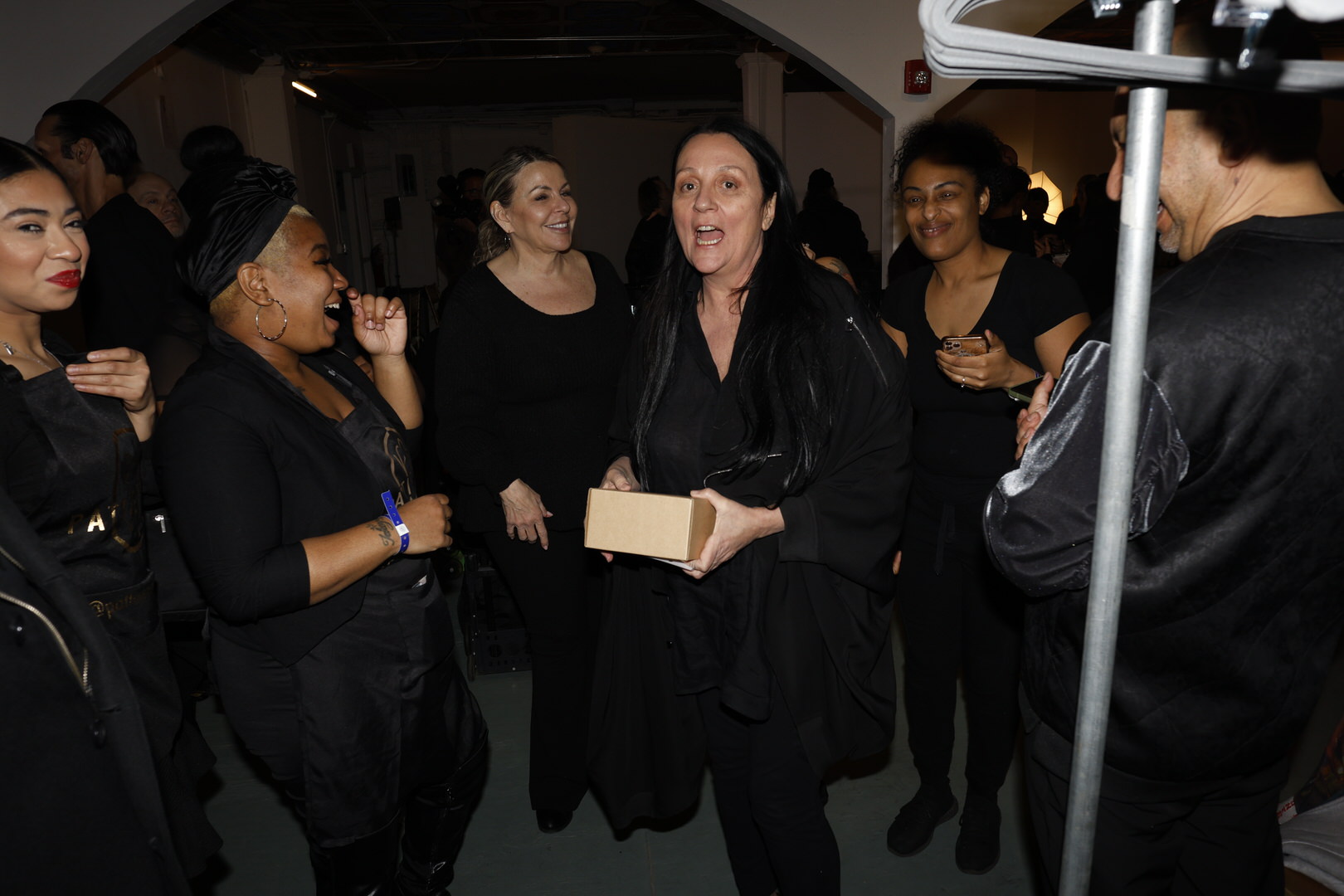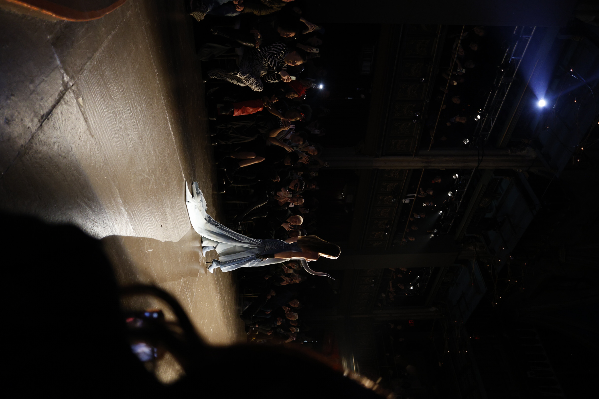 Le latex et le cuir sont présents tout au long de la collection avec des épaules pointues, de la corseterie et des traînes, avec de nombreux ourlets exagérés, dans une palette de couleurs de prune, d’argent métallique, de rouge sang et de noir profond. Le cuir gris dramatique et en détresse est imprimé sur du cuir végétal, en collaboration avec Kornit.