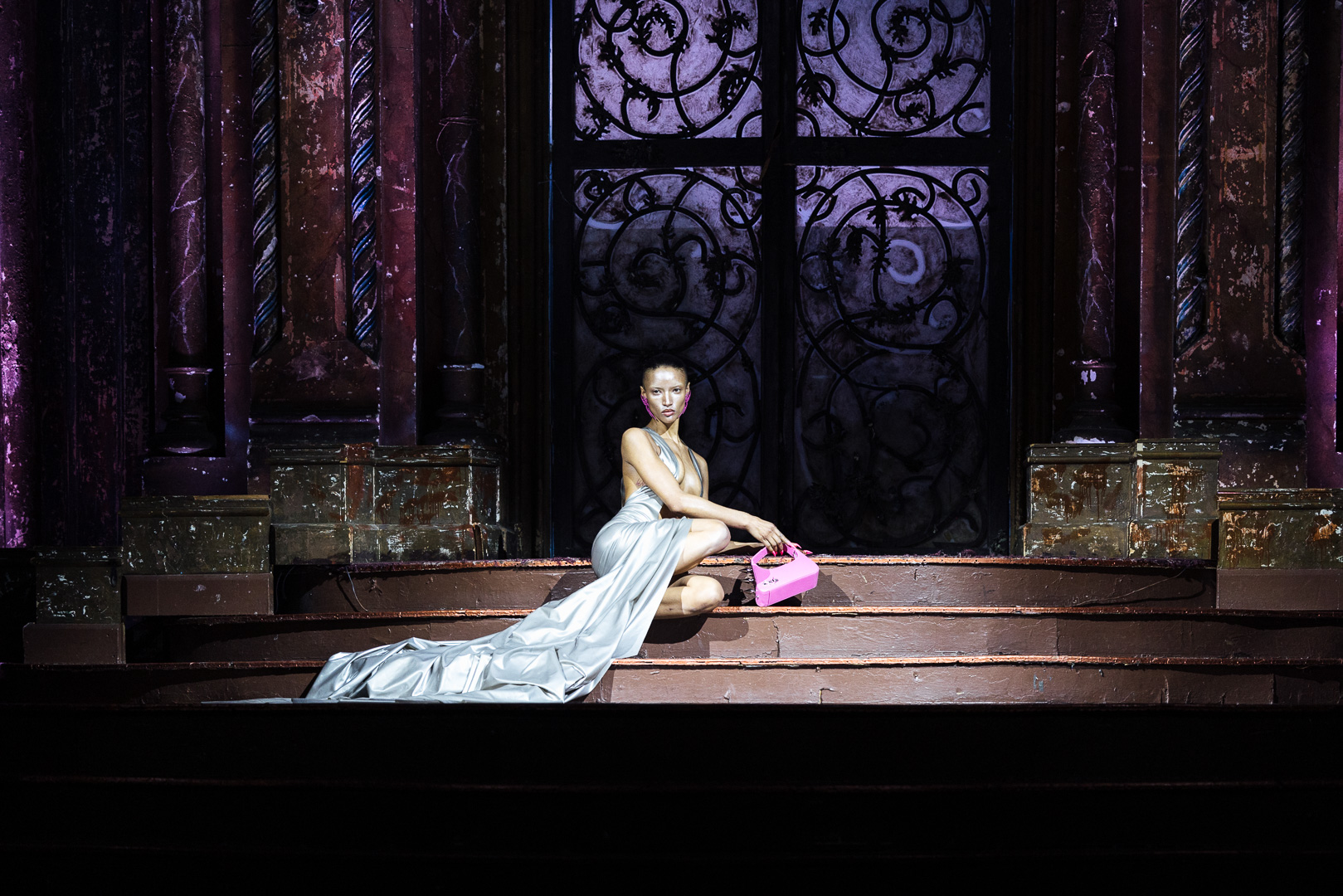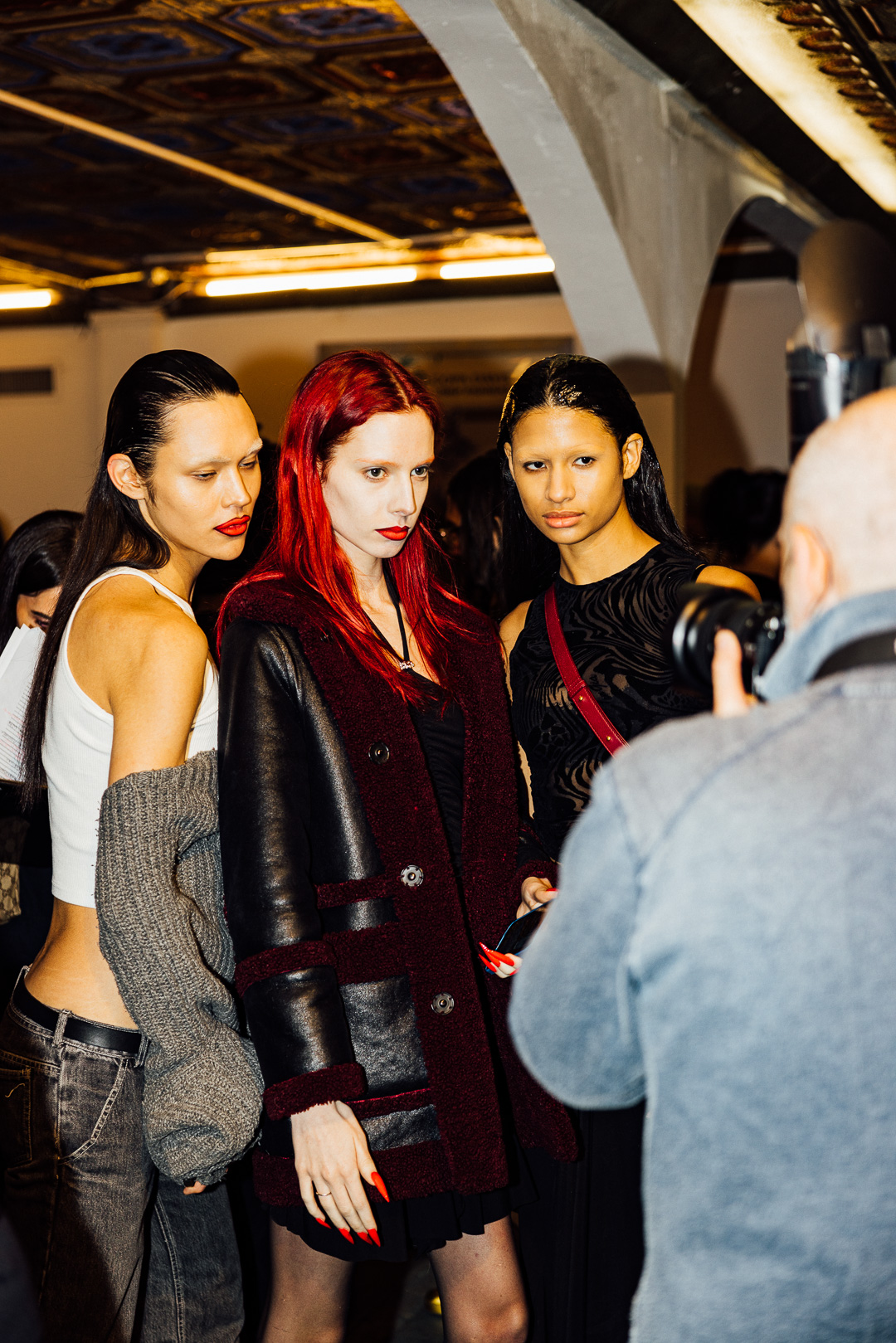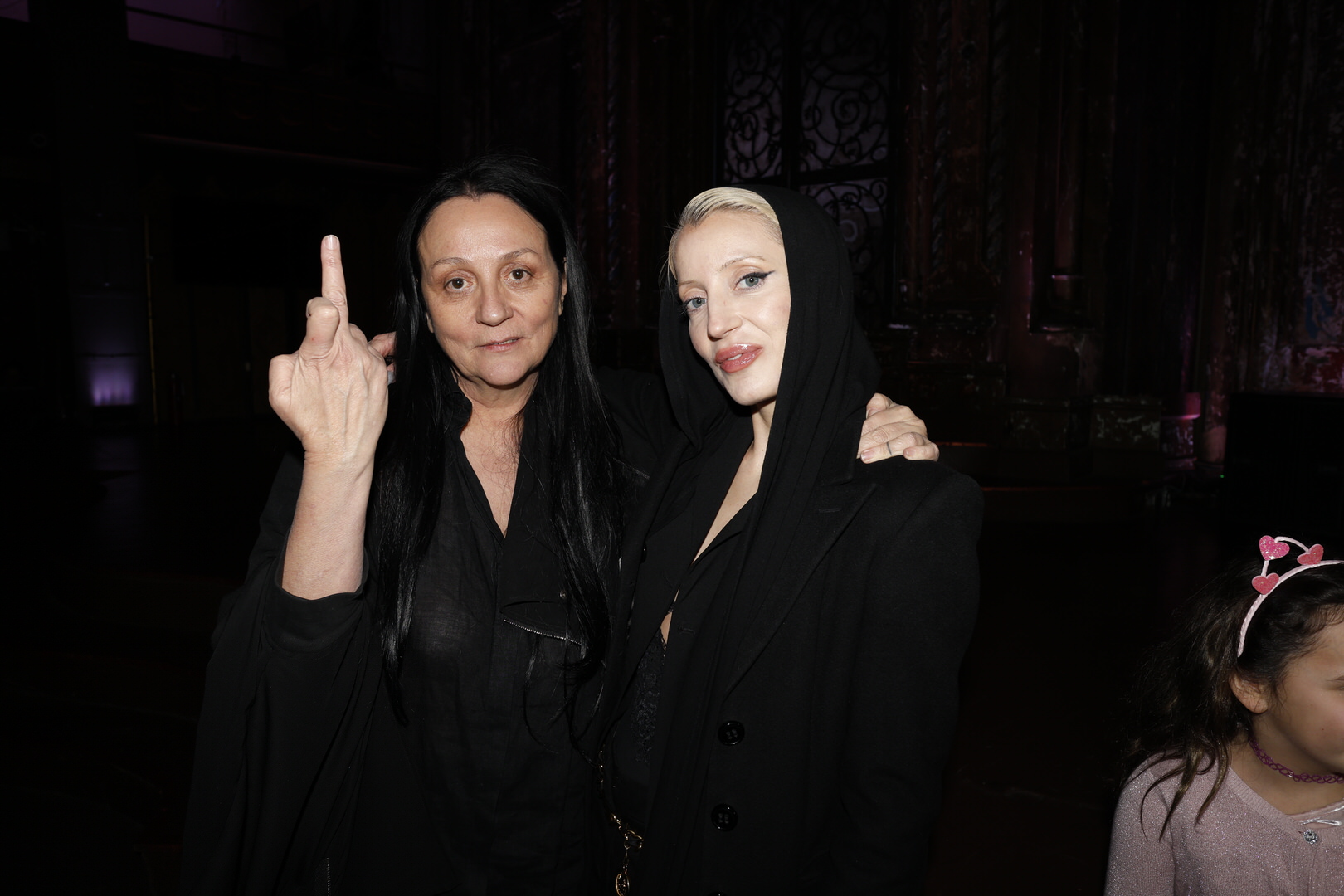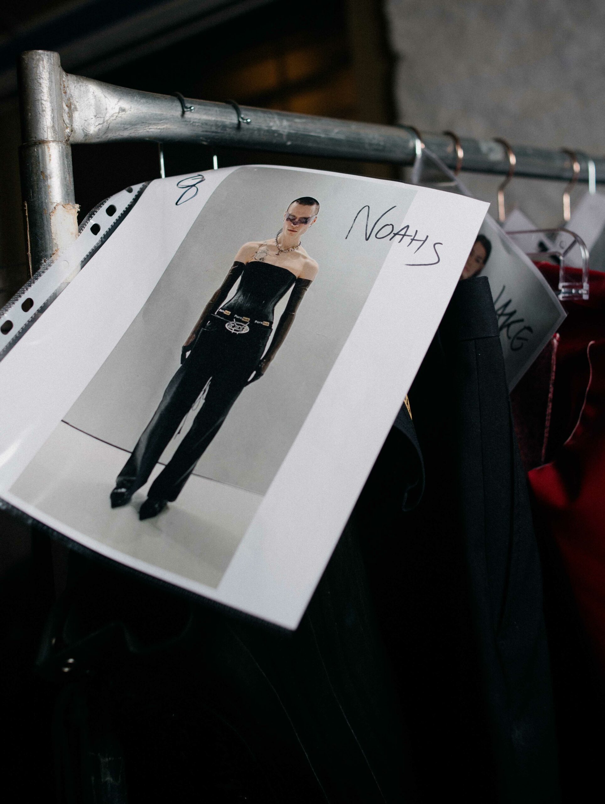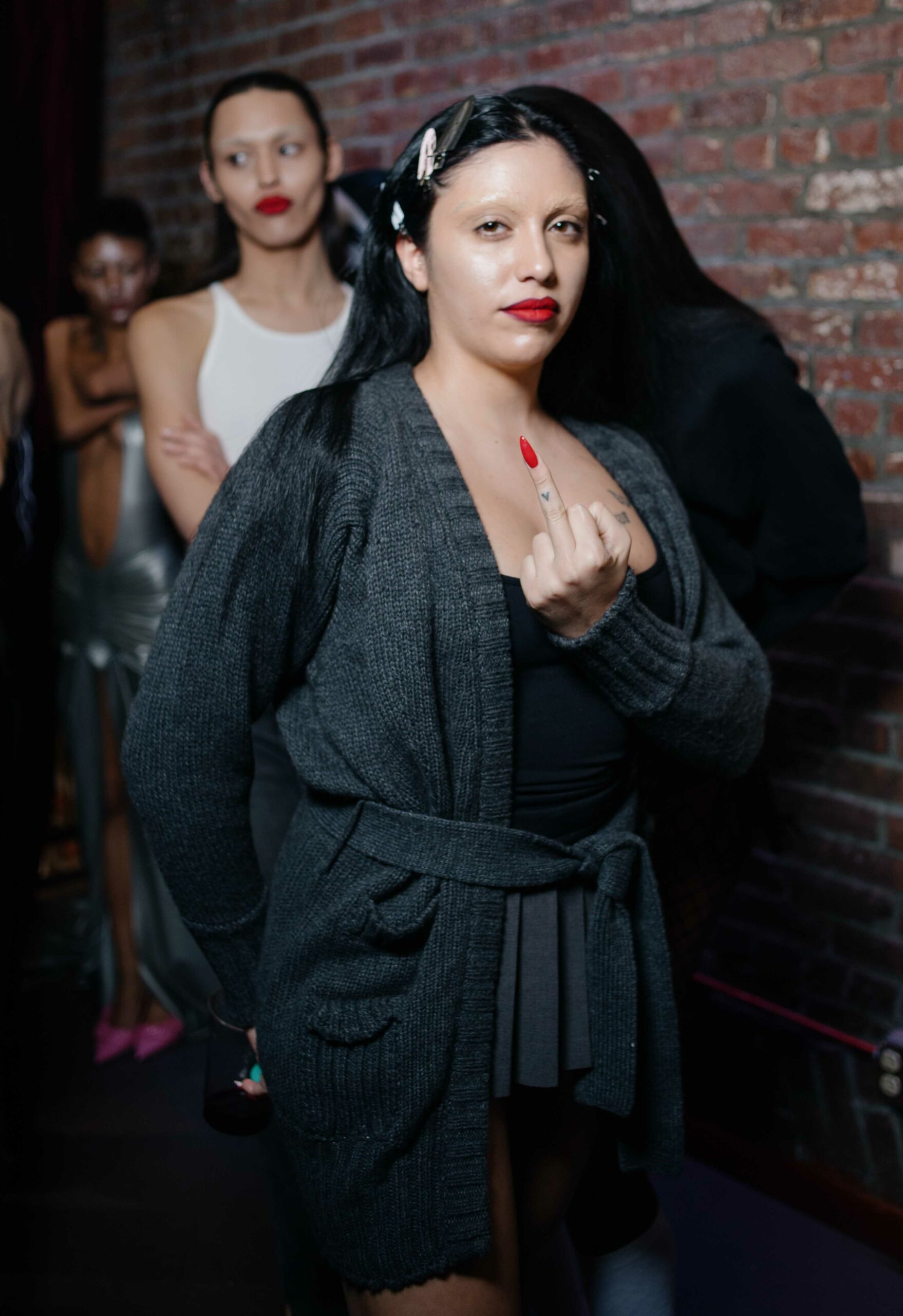 Le latex et le cuir sont présents tout au long de la collection avec des épaules pointues, de la corseterie et des traînes, avec de nombreux ourlets exagérés, dans une palette de couleurs de prune, d’argent métallique, de rouge sang et de noir profond. Le cuir gris dramatique et en détresse est imprimé sur du cuir végétal, en collaboration avec Kornit.