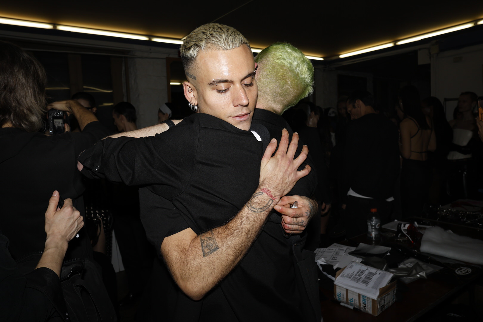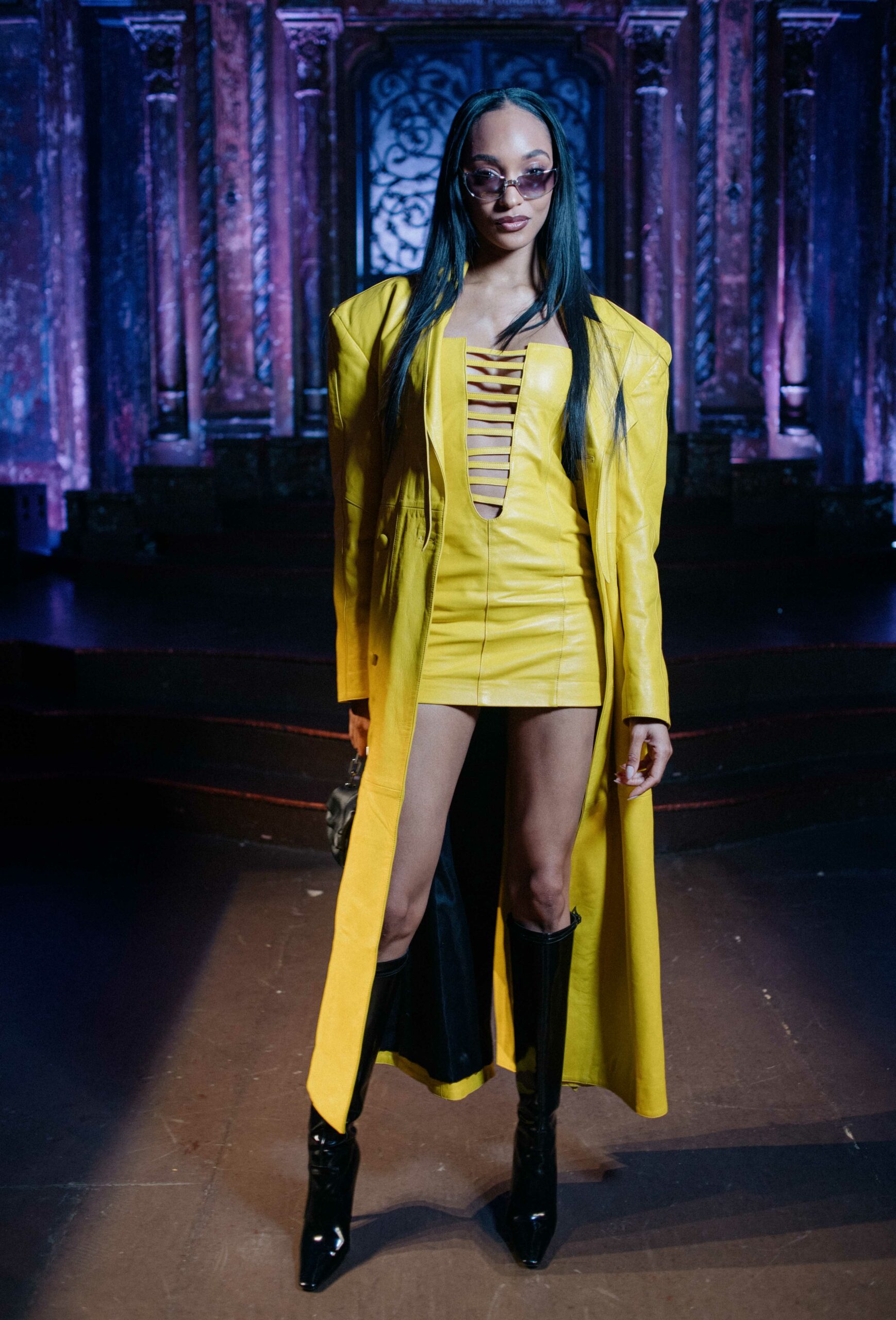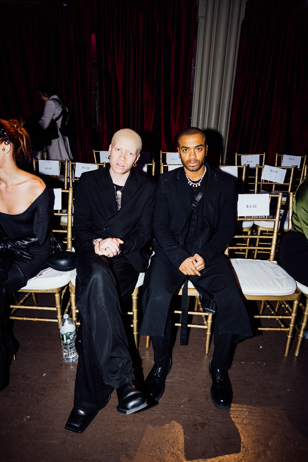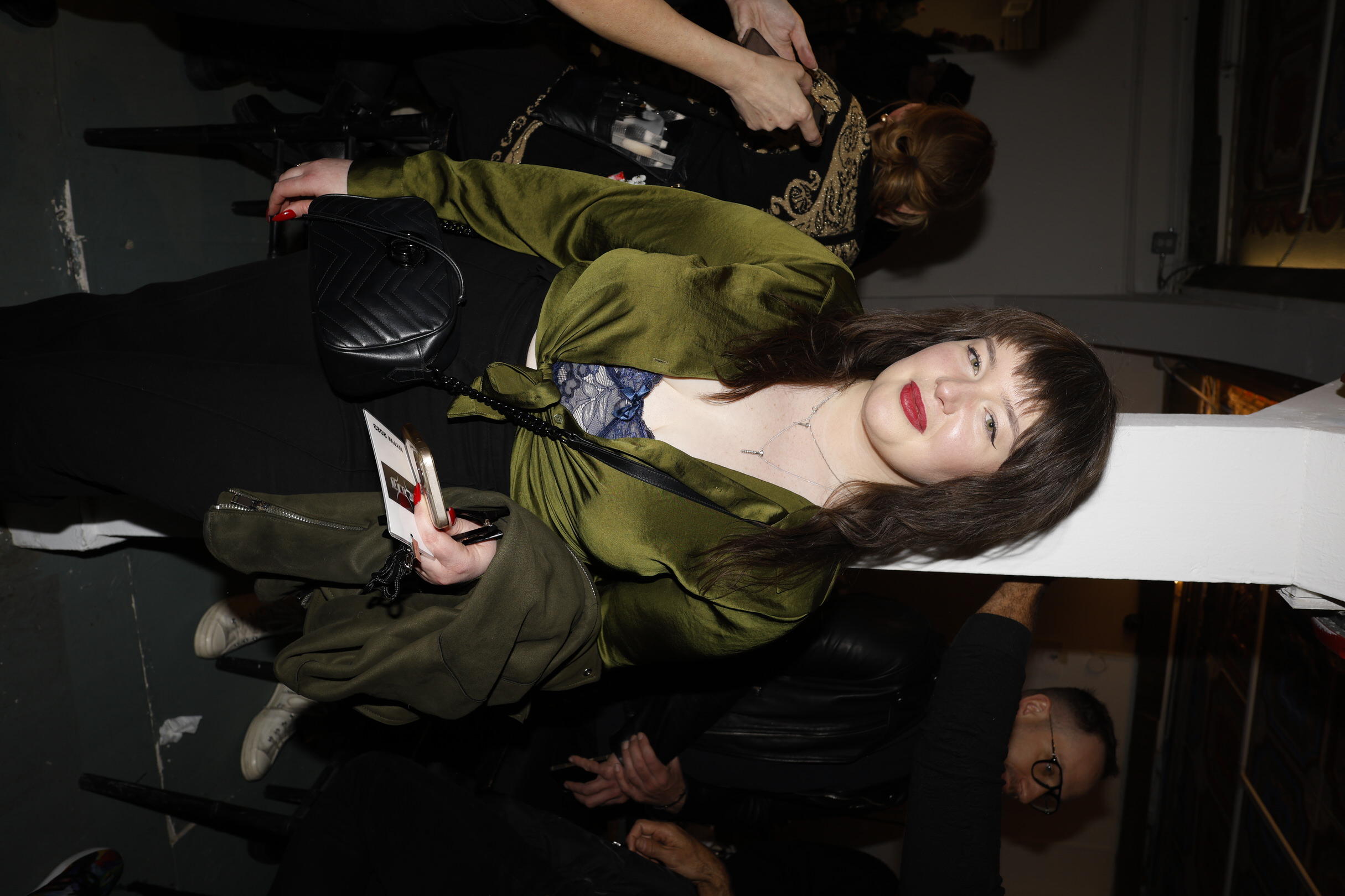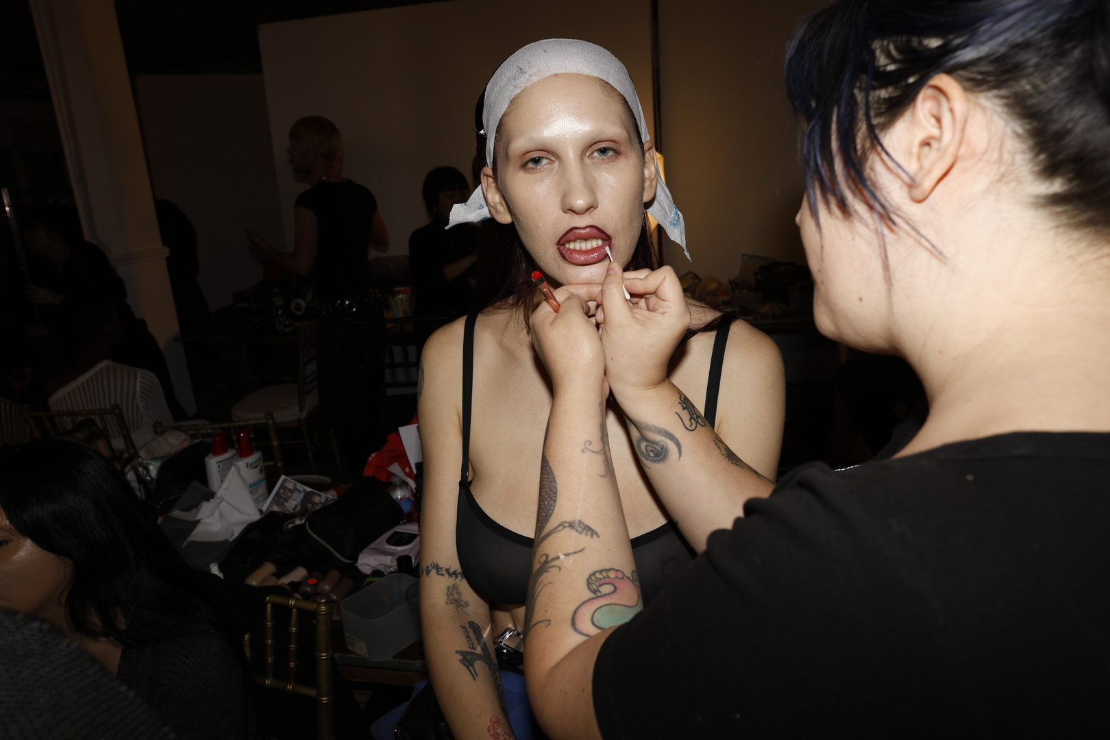 Le latex et le cuir sont présents tout au long de la collection avec des épaules pointues, de la corseterie et des traînes, avec de nombreux ourlets exagérés, dans une palette de couleurs de prune, d’argent métallique, de rouge sang et de noir profond. Le cuir gris dramatique et en détresse est imprimé sur du cuir végétal, en collaboration avec Kornit.